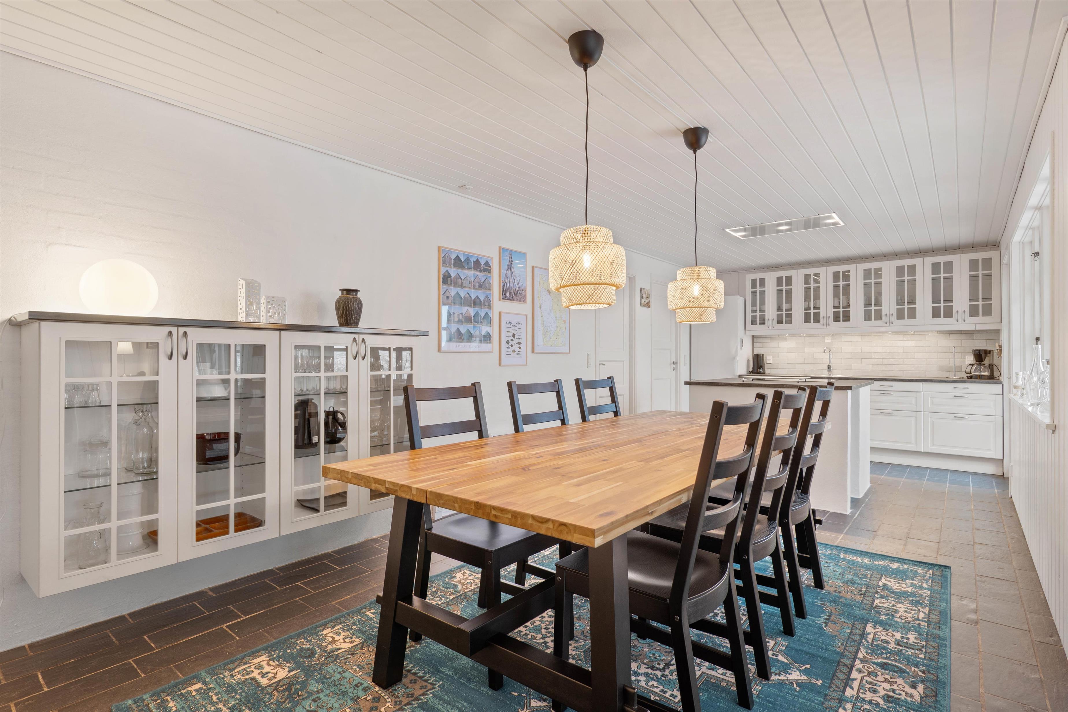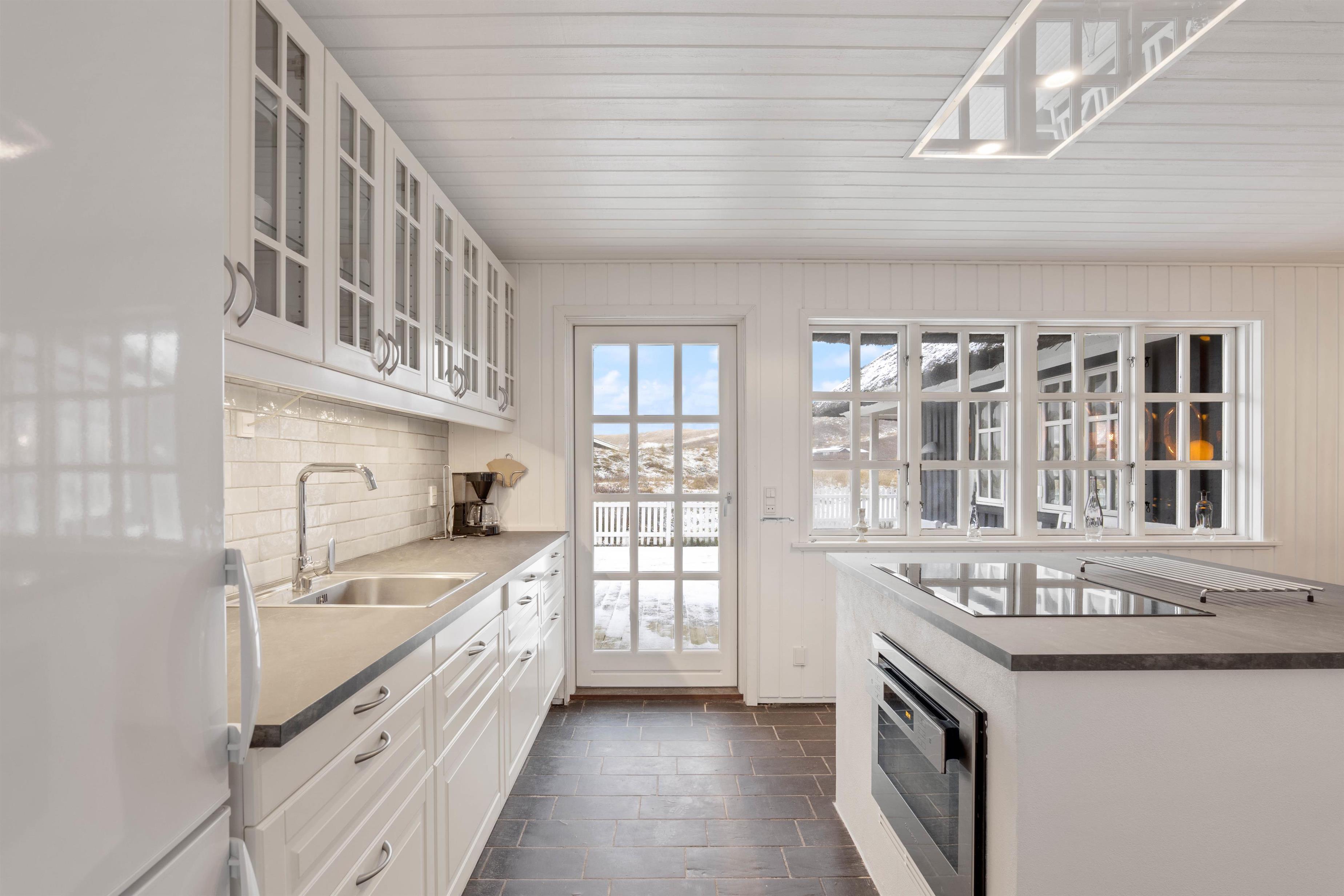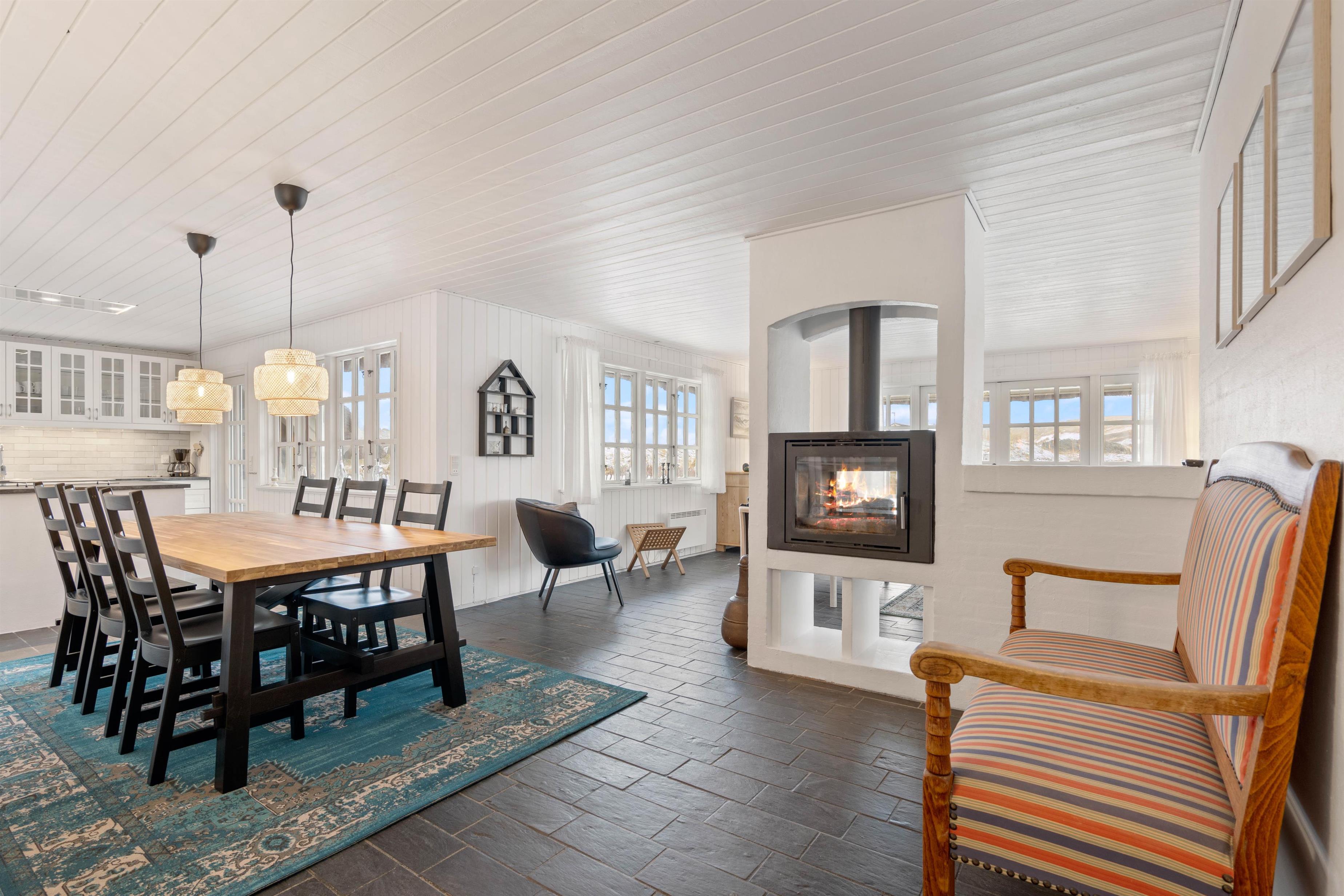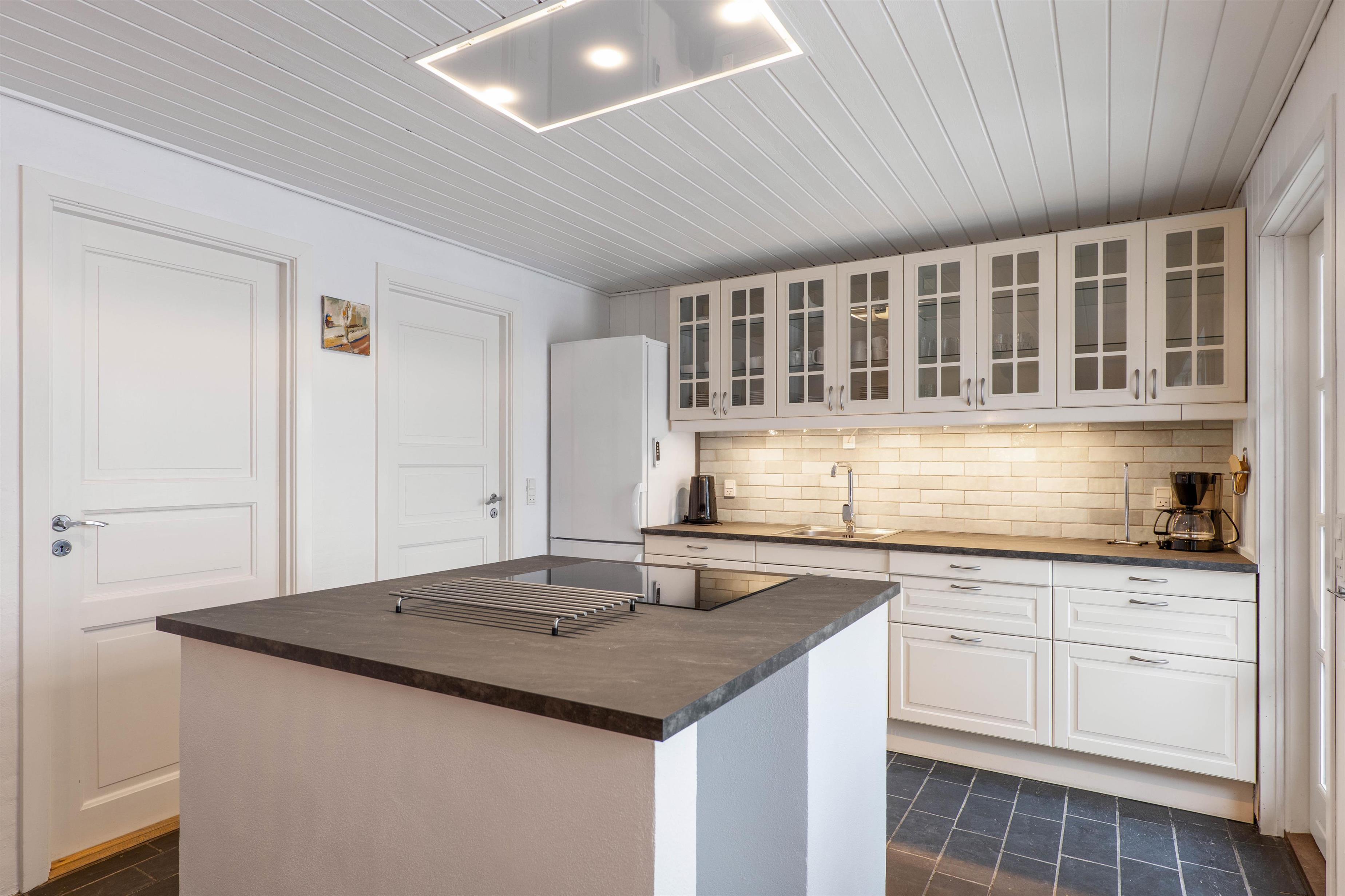 Køkkenalrummet byder på et funktionelt køkken med køkken-ø og med alt det nødvendige til at lave et lækkert måltid. Her kan i lave forskellige aktiviteter både sammen og hver for sig. Sæt dig foran tv-et og se en god film, eller læs en spændende bog foran den knitrende brændeovn.