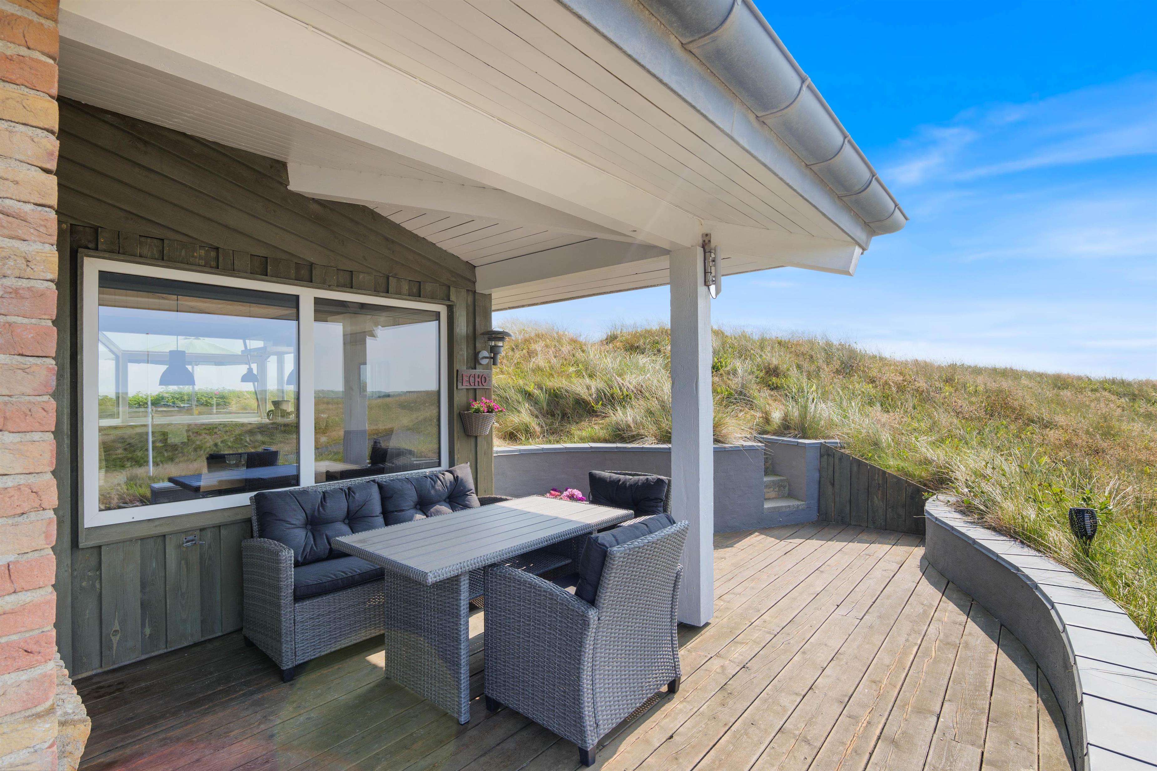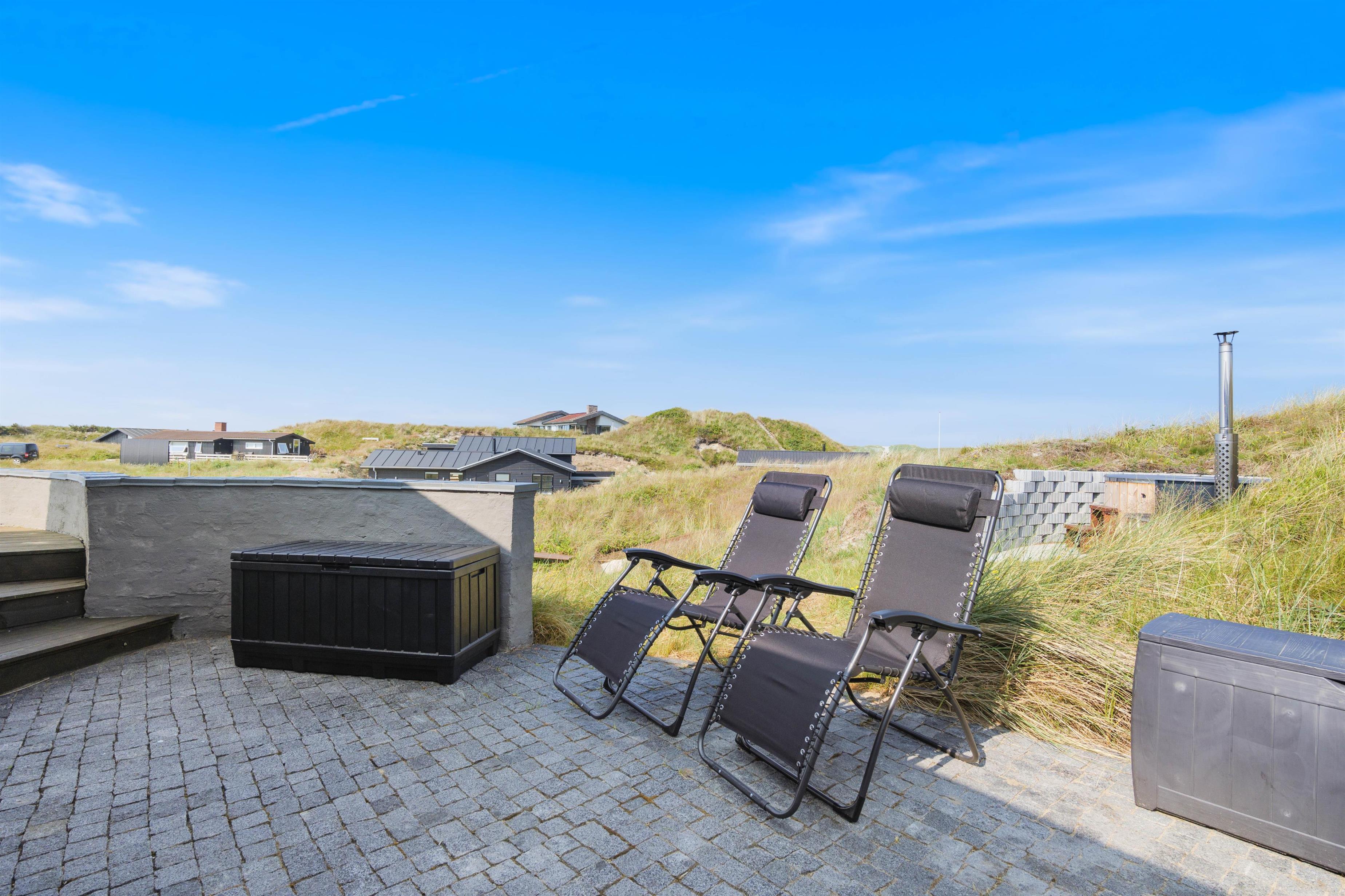 Sommerhuset befinder sig på toppen af Tingodden, og den flotte beliggenhed gør ikke huset mindre attraktivt. Med både øst- og vestvendt terrasse kan de morgenfriske få et glimt af den fantastiske solopgang på fjordsiden, og hele familien kan sidde sammen og følge solnedgangen, mens dagens eventyr og nye oplevelser bliver vendt. Efter en dejlig varm dag på terrassen er der mulighed for at tage et dejligt skyl under udebruseren, som er tilgængelig fra april til november.