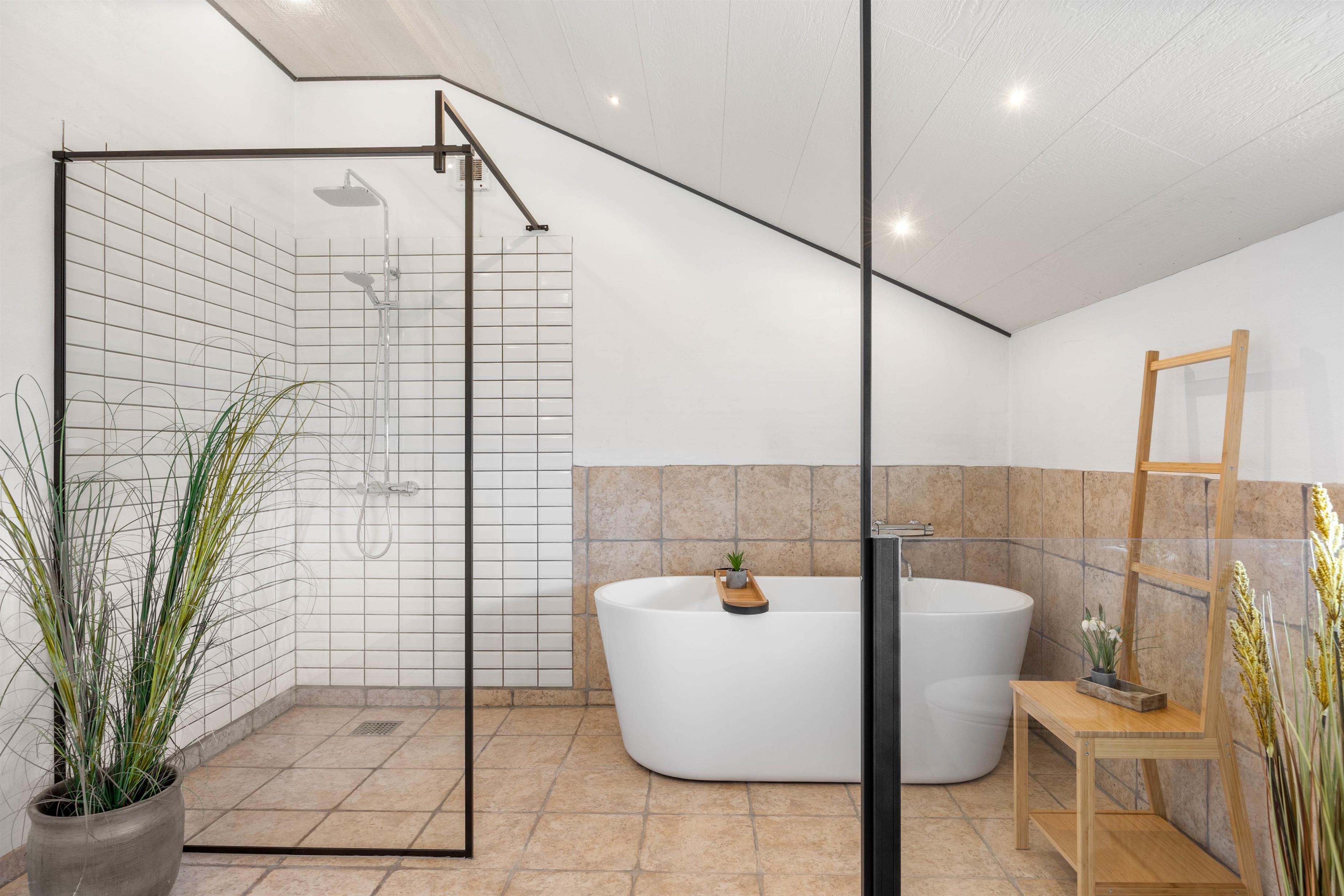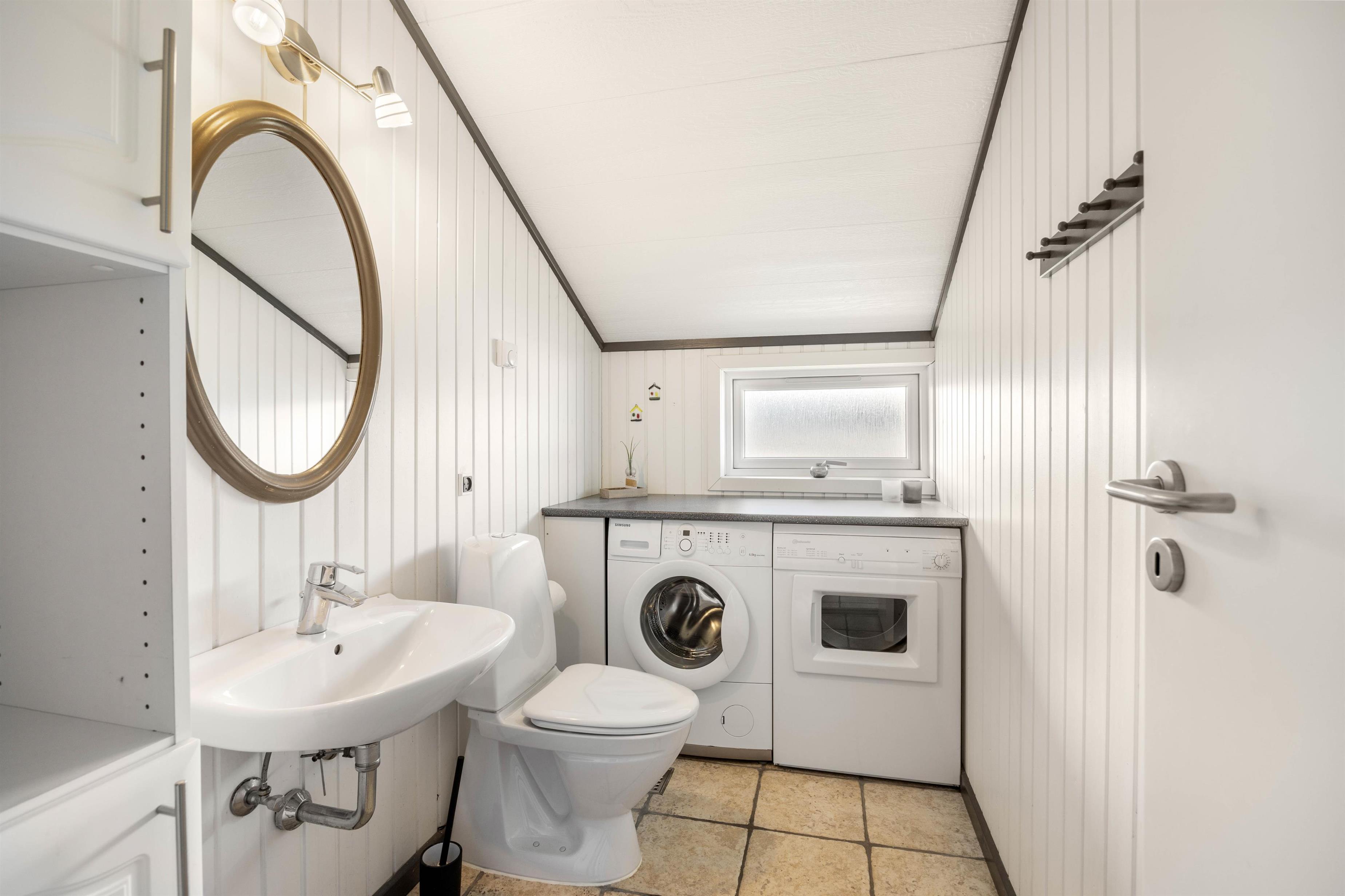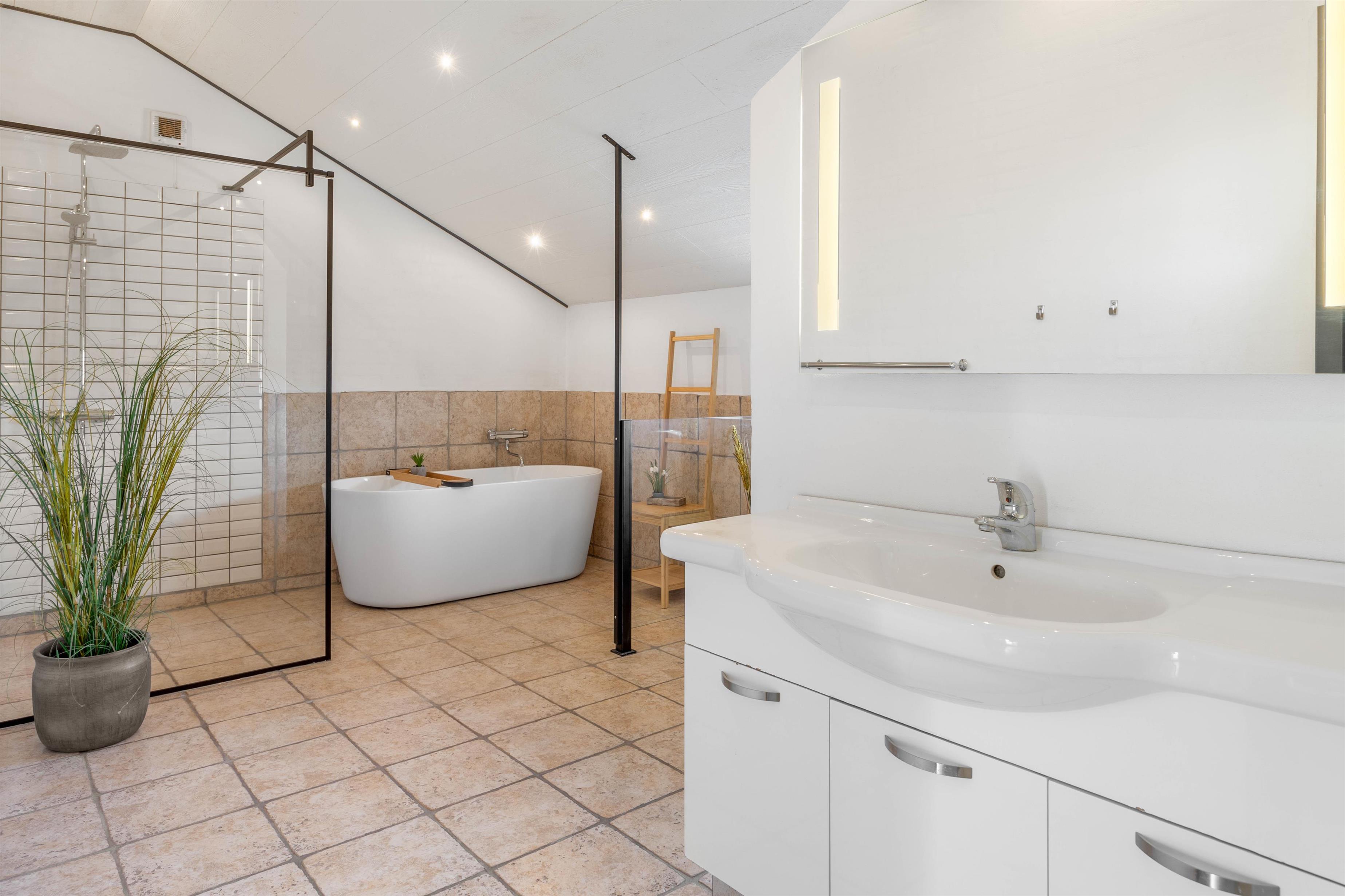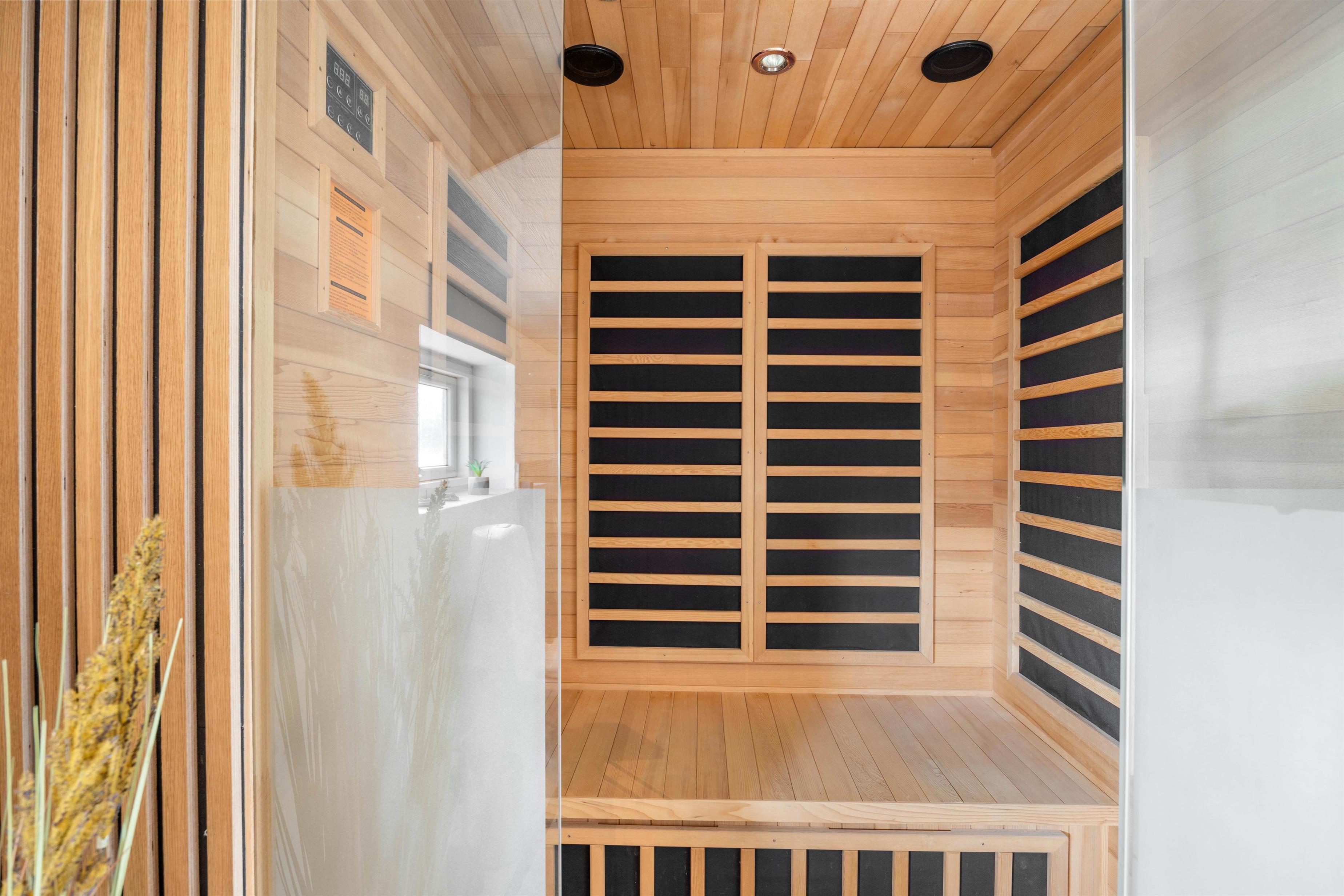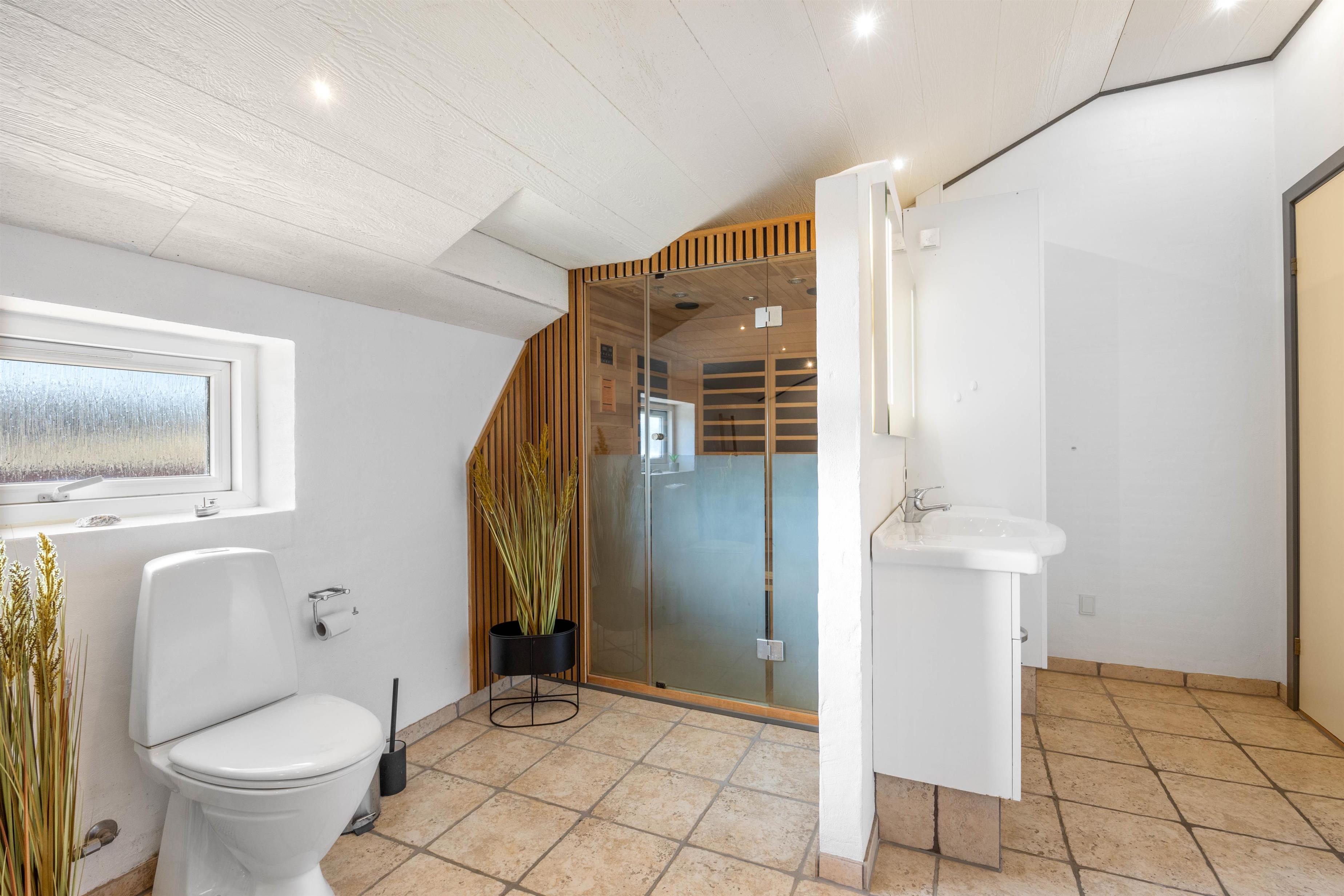 På sommerhusets badeværelse er der en sauna, som er perfekt til et par afslappende stunder efter en lang gåtur ved vandet.
