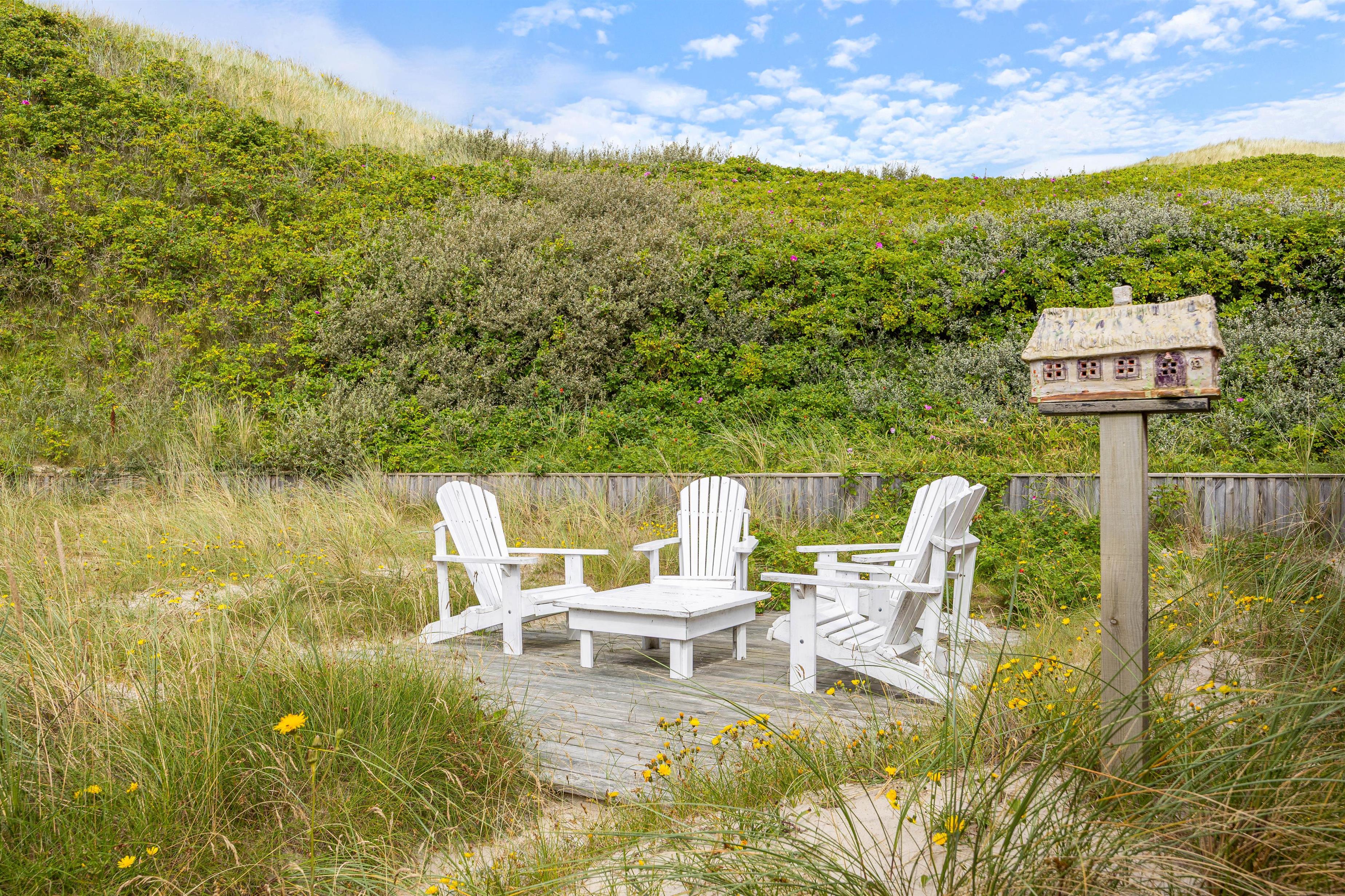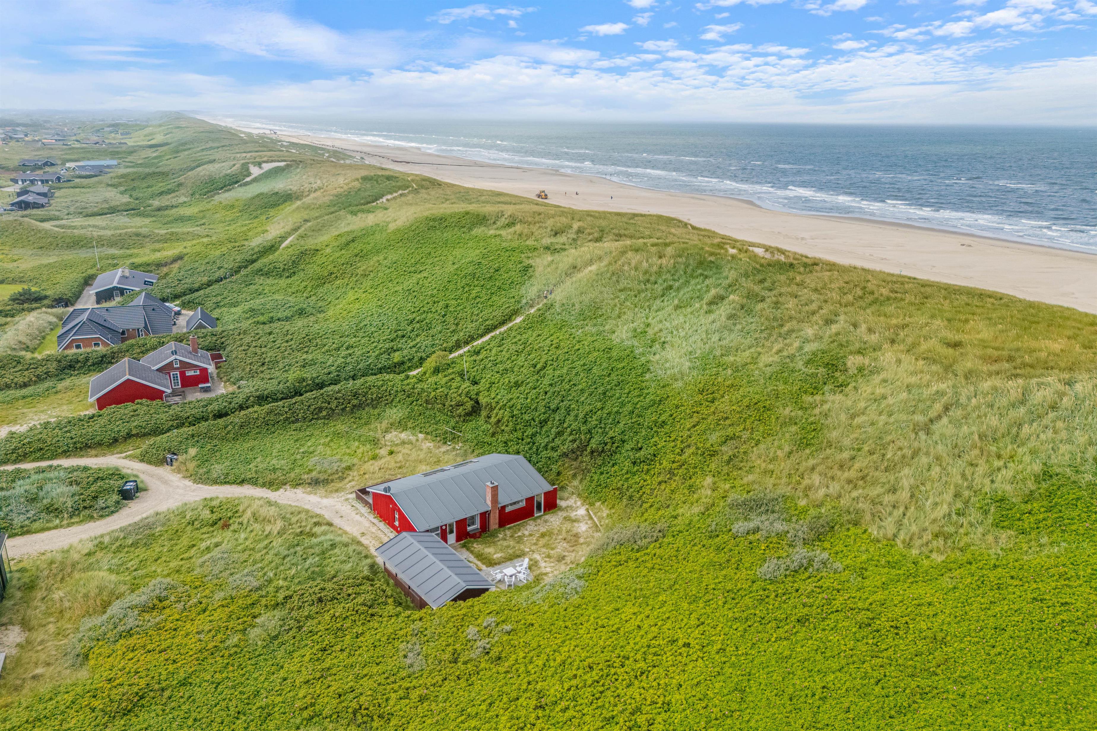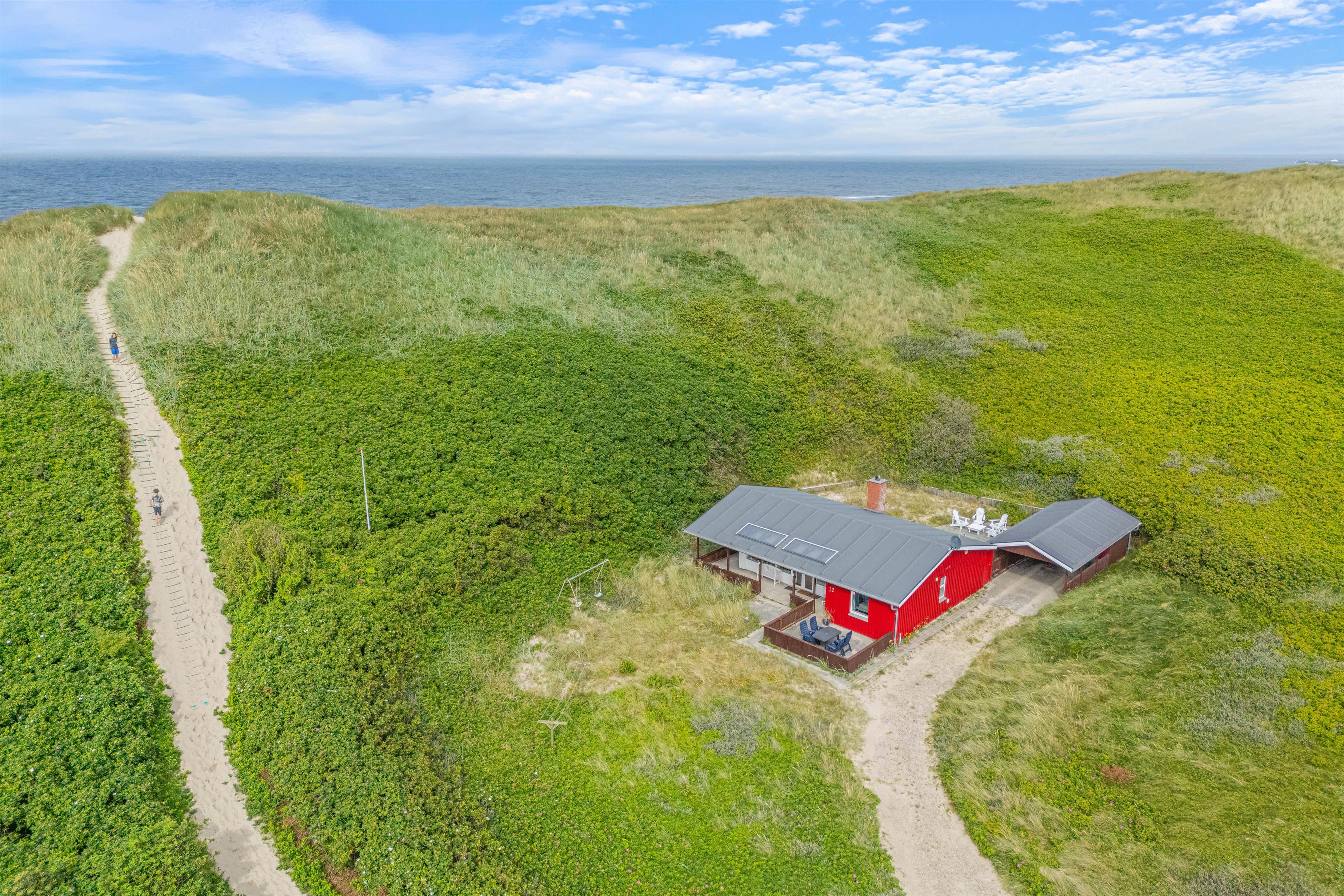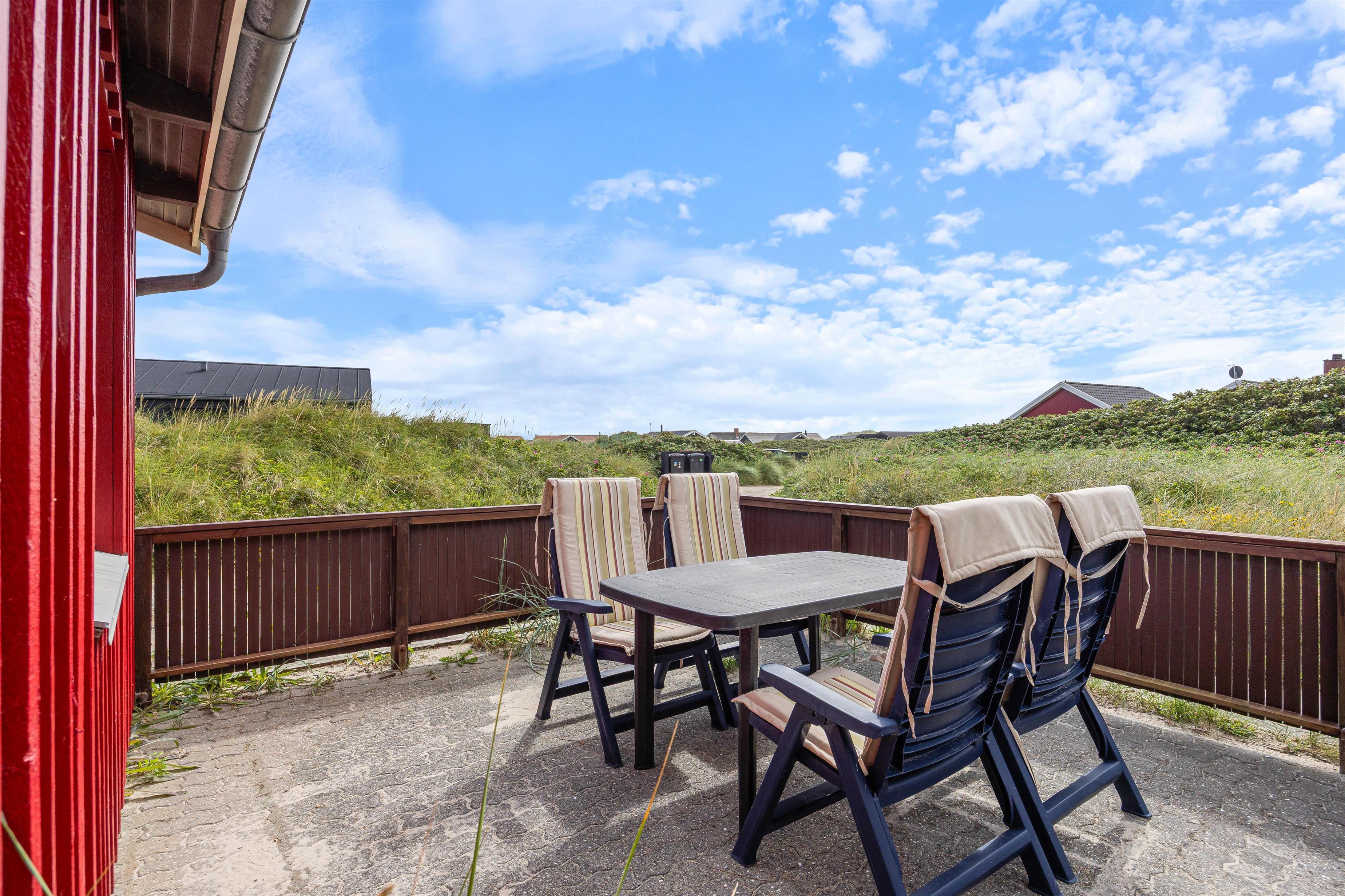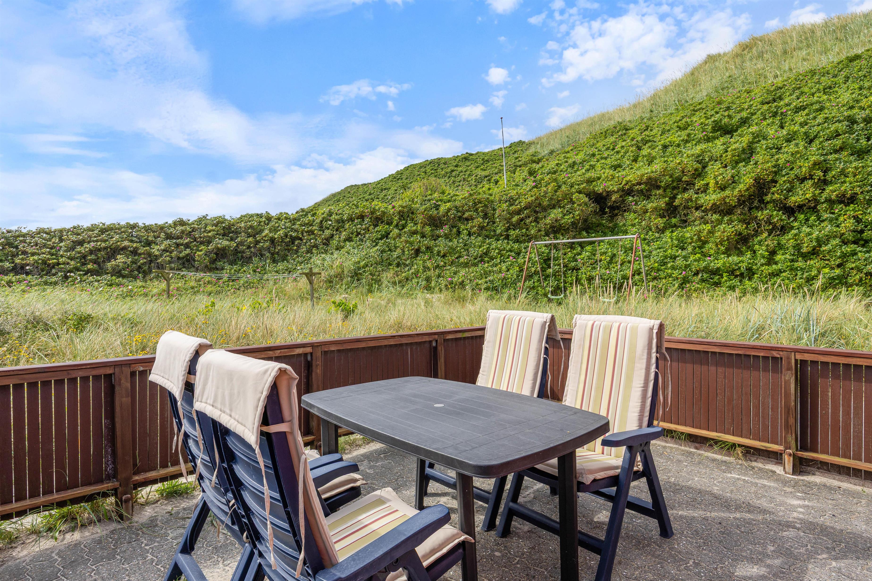 Sommerhuset ligger på en skøn naturgrund omgivet af klitter, hvor I kan nyde ferien og den rolige stemning. Her er terrassen både åben og delvist overdækket, så I altid kan finde en plads i solen eller i læ for vinden. Havemøbler og en grill står klar, så I kan nyde lange grillaftener i den skønne vesterhavsluft. Der er også god plads til at lade hunden udforske omgivelserne, da op til to hunde er velkomne i sommerhuset. Terrassen er omgivet af klitter, og I skal derfor være opmærksomme på, at der kan være sand på terrassen.