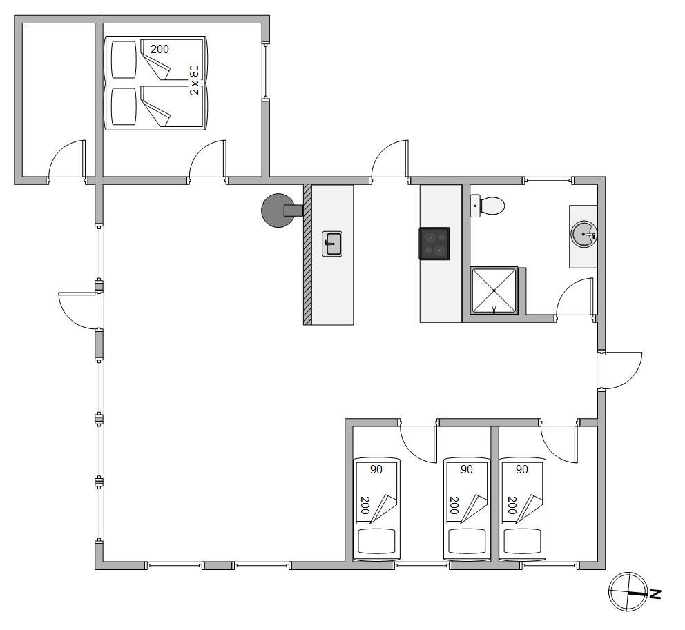 Vægge, lofter og gulve er holdt i lyse nuancer og skaber en rigtig dejlig stemning i feriehuset. Den store terrassedørsåbning i sommerhusets alrum lukker samtidig en masse lys og luft ind i indretningen. Køkkenet ligger i åben forbindelse med stuen. Det betyder, at I hele tiden har en følelse af at være samlet som familie – også selvom I laver forskellige ting. Og det er netop følelsen af nærvær og fællesskab, som kendetegner en rigtig sommerhusferie.