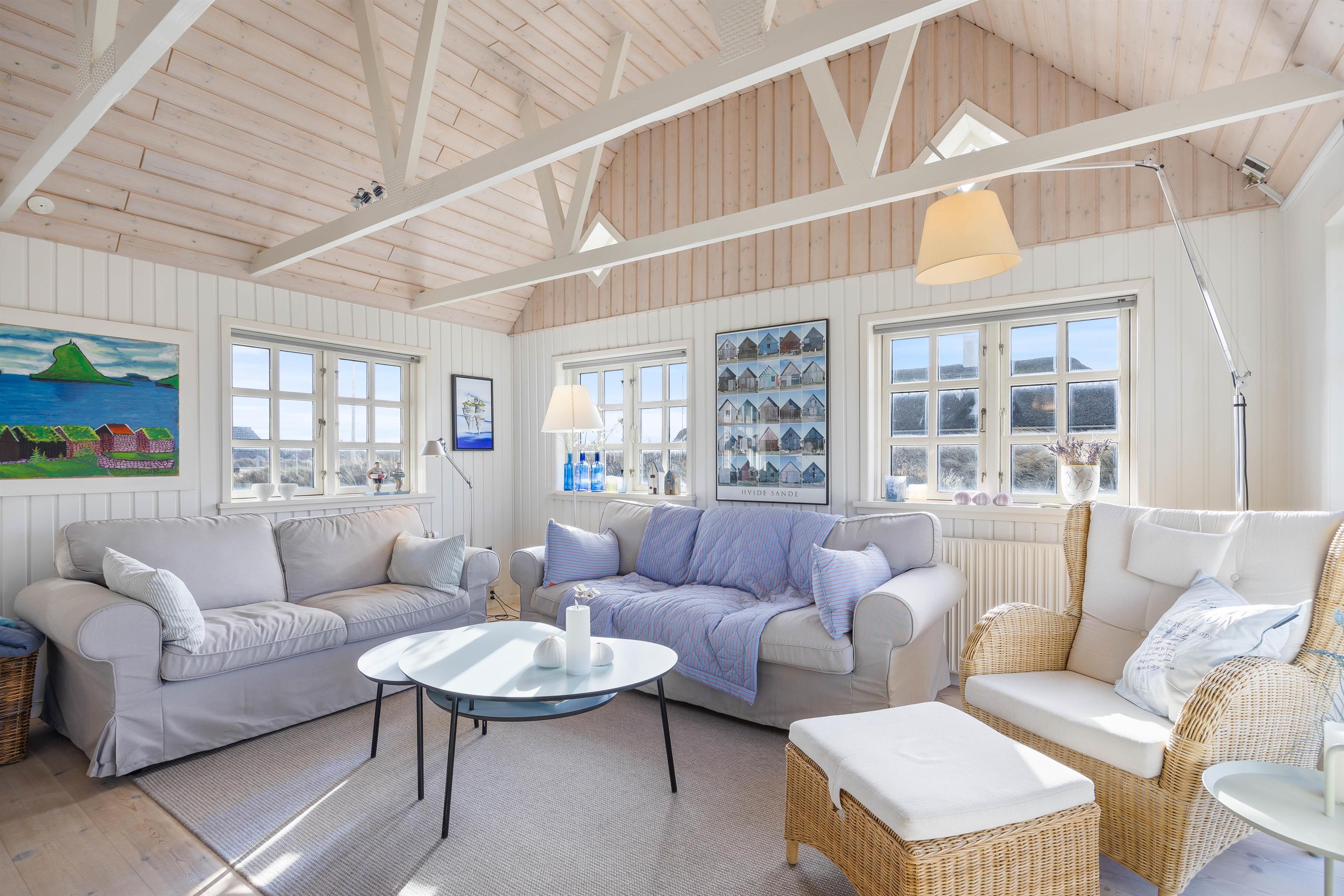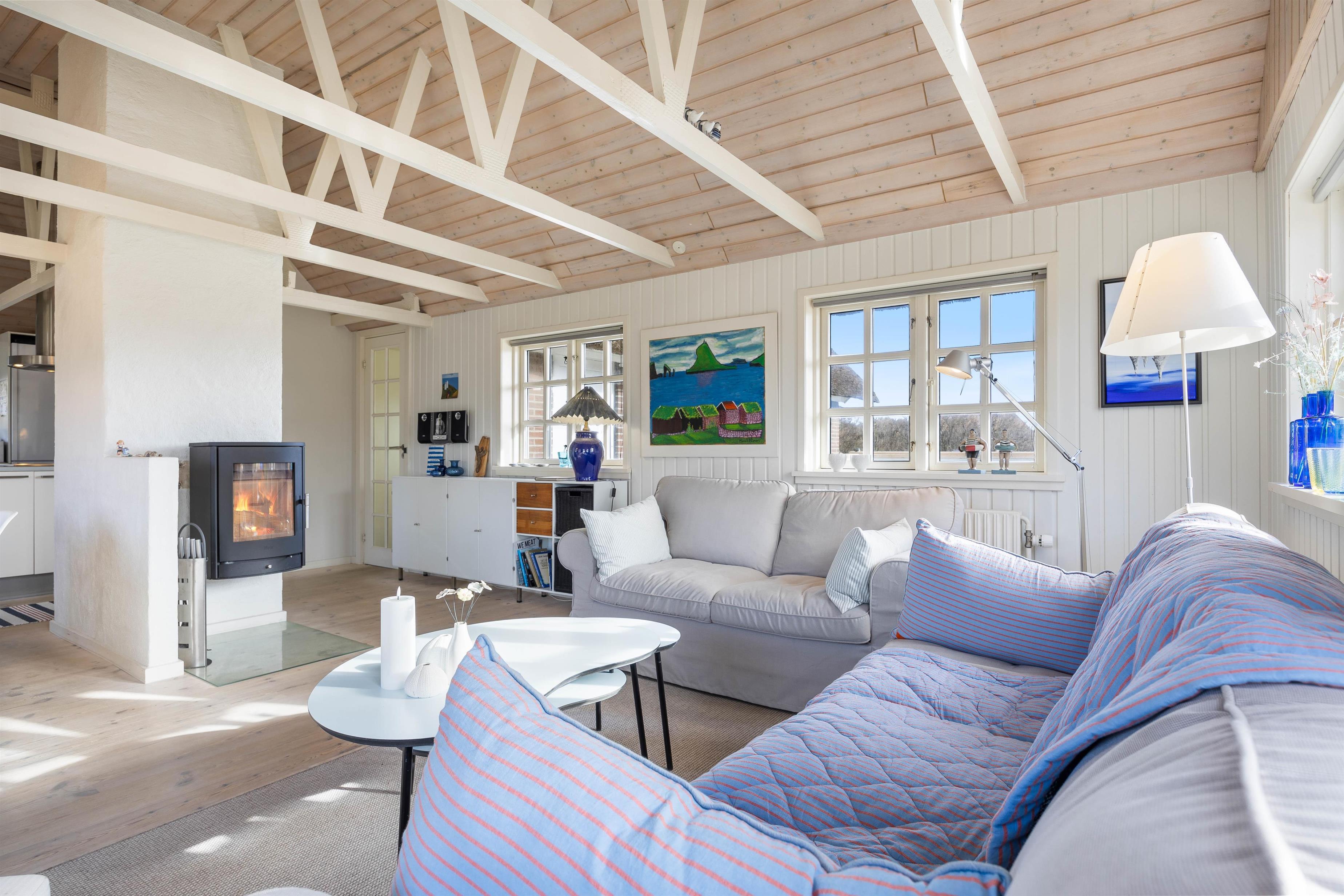 Når I træder ind i dette hyggelige sommerhus, bliver I med det samme mødt af en dejlig atmosfære. De flotte hvide træbjælker er i sammenspil med træloftet med til at skabe en dejlig atmosfære i sommerhuset. Den dejlige atmosfære lægger op til afslapning i sofaen foran brændeovnen. Brændeovnen sørger for, at I har en dejlig temperatur i sommerhuset. Der er også en varmepumpe I sommerhuset, som I kan bruge til at holde den dejlige temperatur.