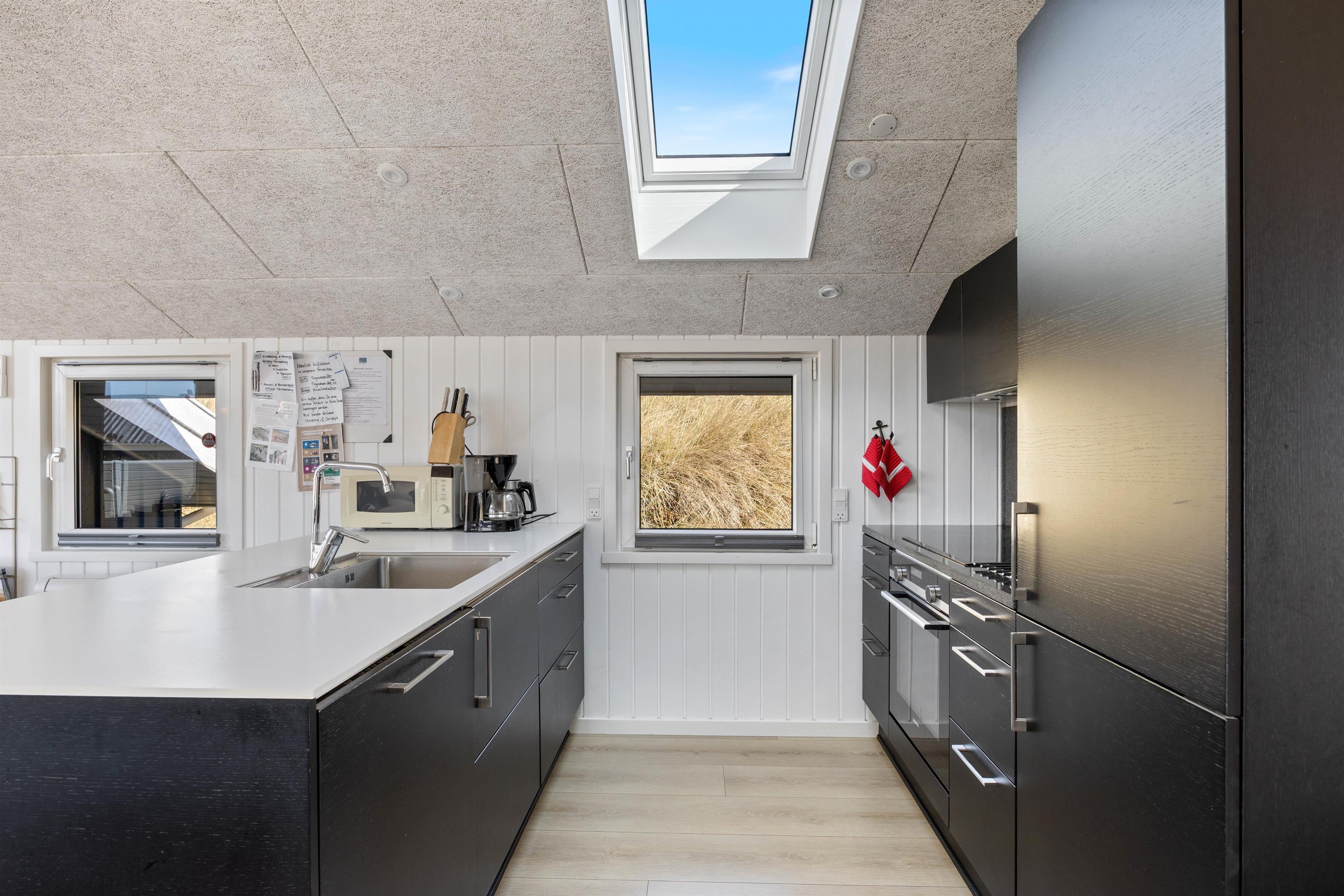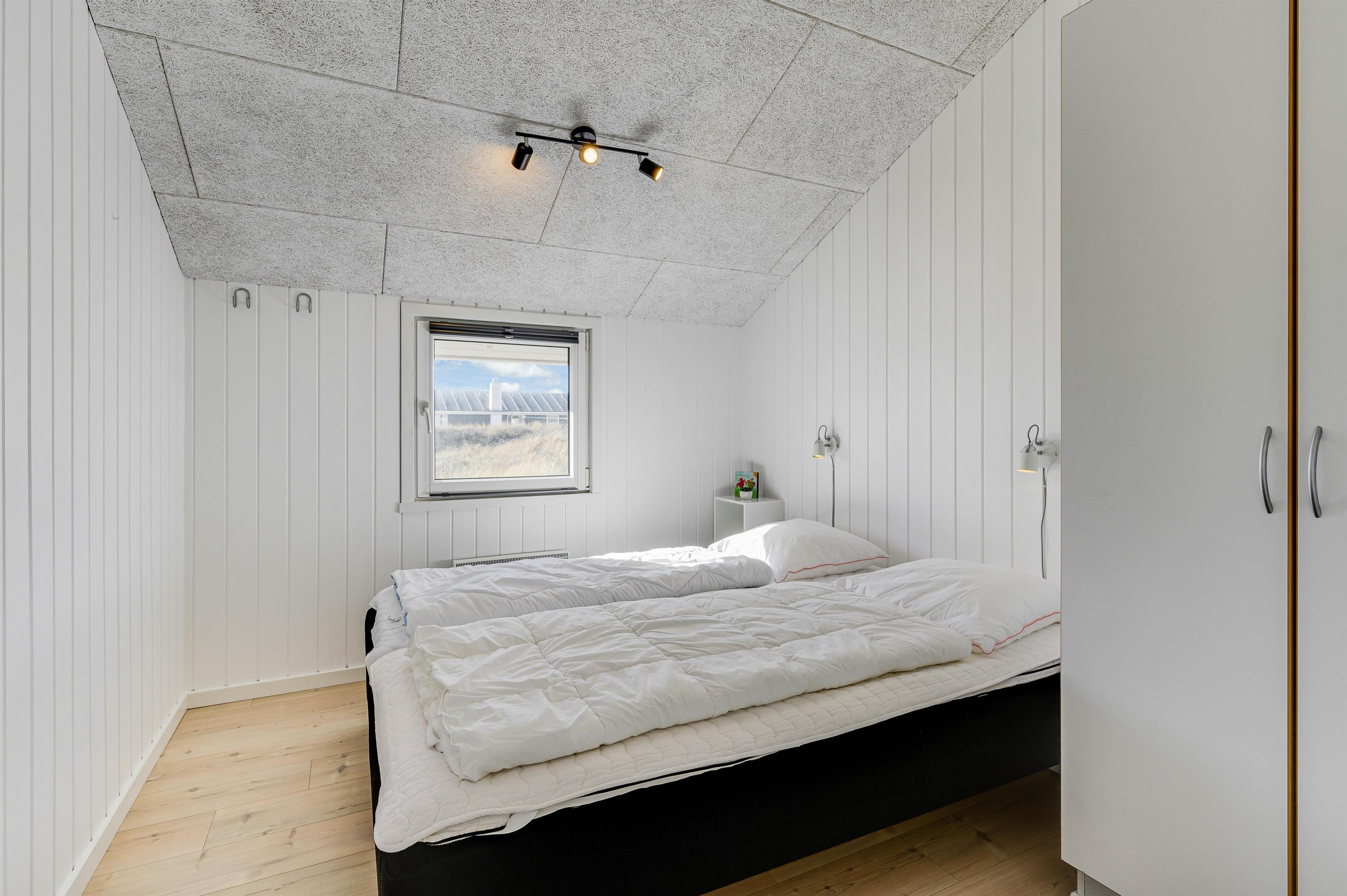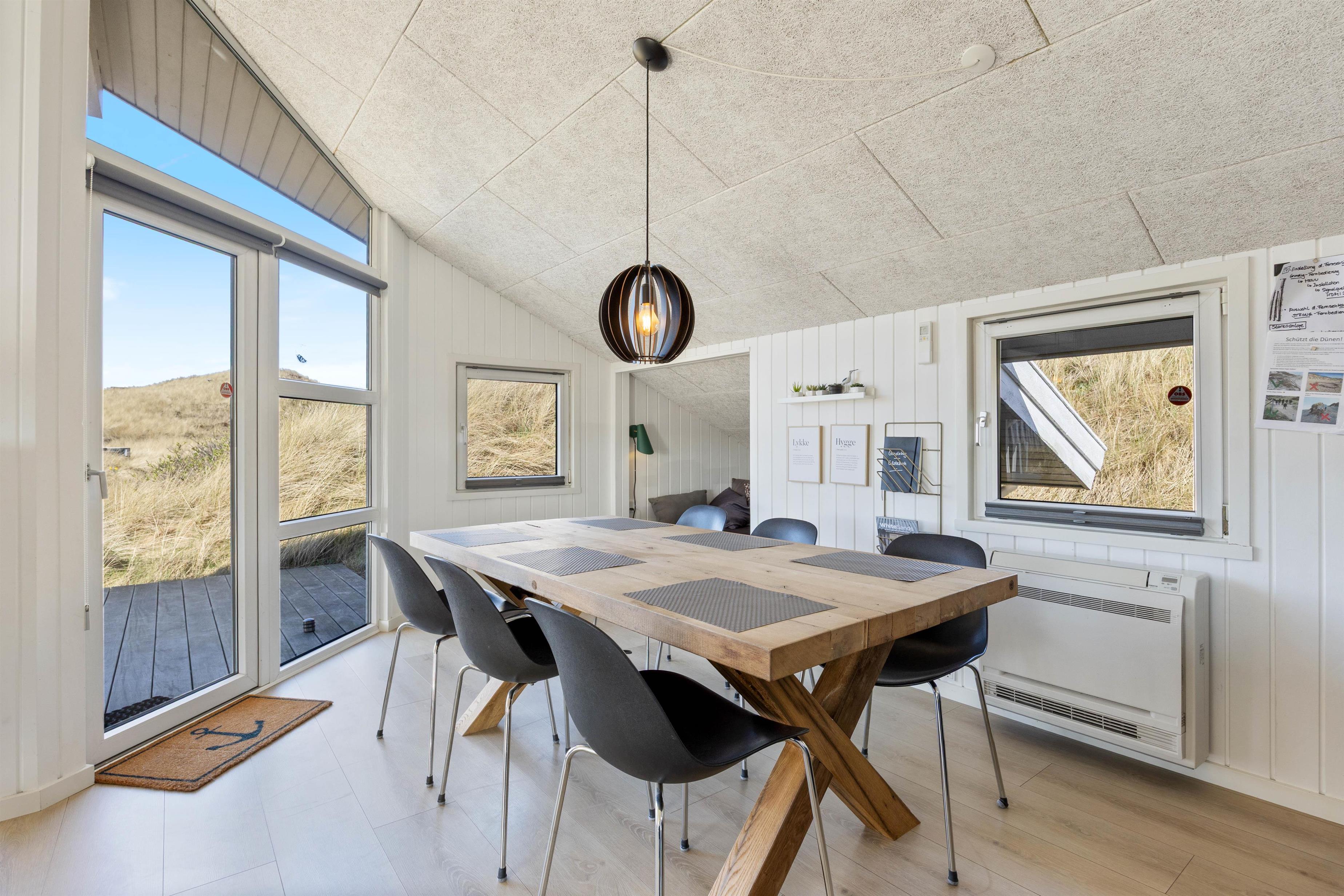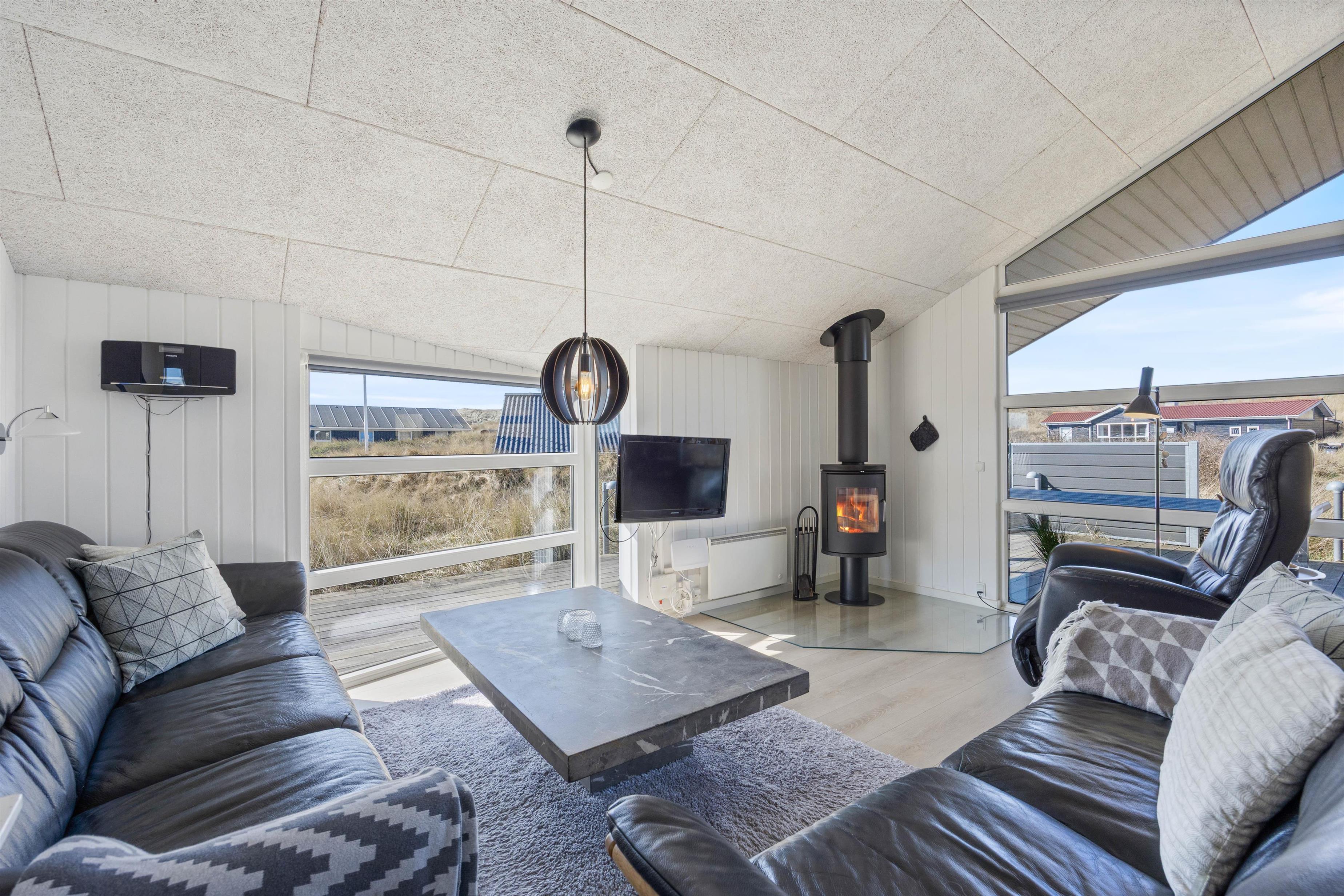 Den hyggelige stue har loft til kip og er indrettet med gode møbler, en flot brændeovn og energibesparende varmepumpe. Der er en stor fladskærm, så familien kan nyde en afslappende film efter en frisk travetur langs Vesterhavet. Alkoven i stuen er velegnet til læsning eller til hygge med en PC. Der er gode værelser og velindrettede badeværelser, hvor der også er spa og sauna.