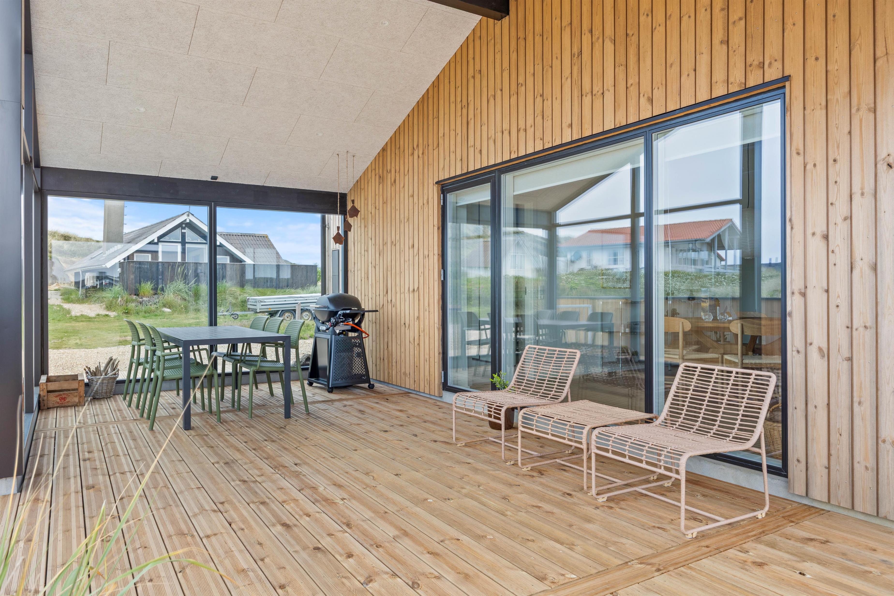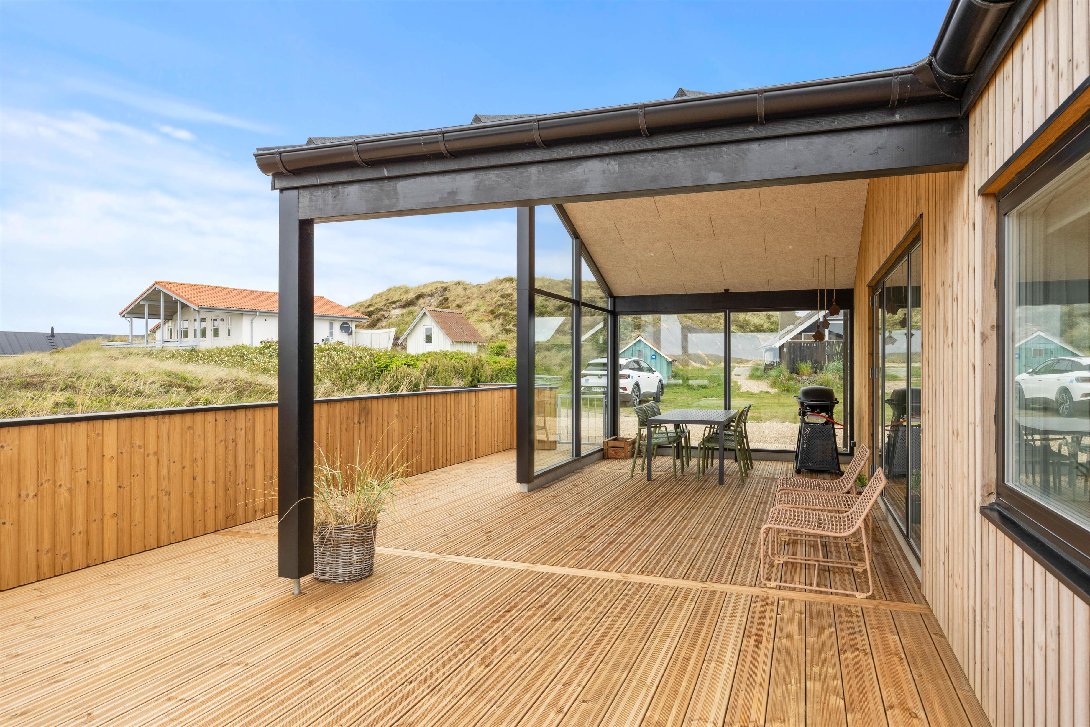 Sommerhuset byder på en skøn terrasse, som er delvist overdækkede – den overdækkede terrasse er perfekt til lange sommeraftener med grill og hyggesnak, uanset vejret.