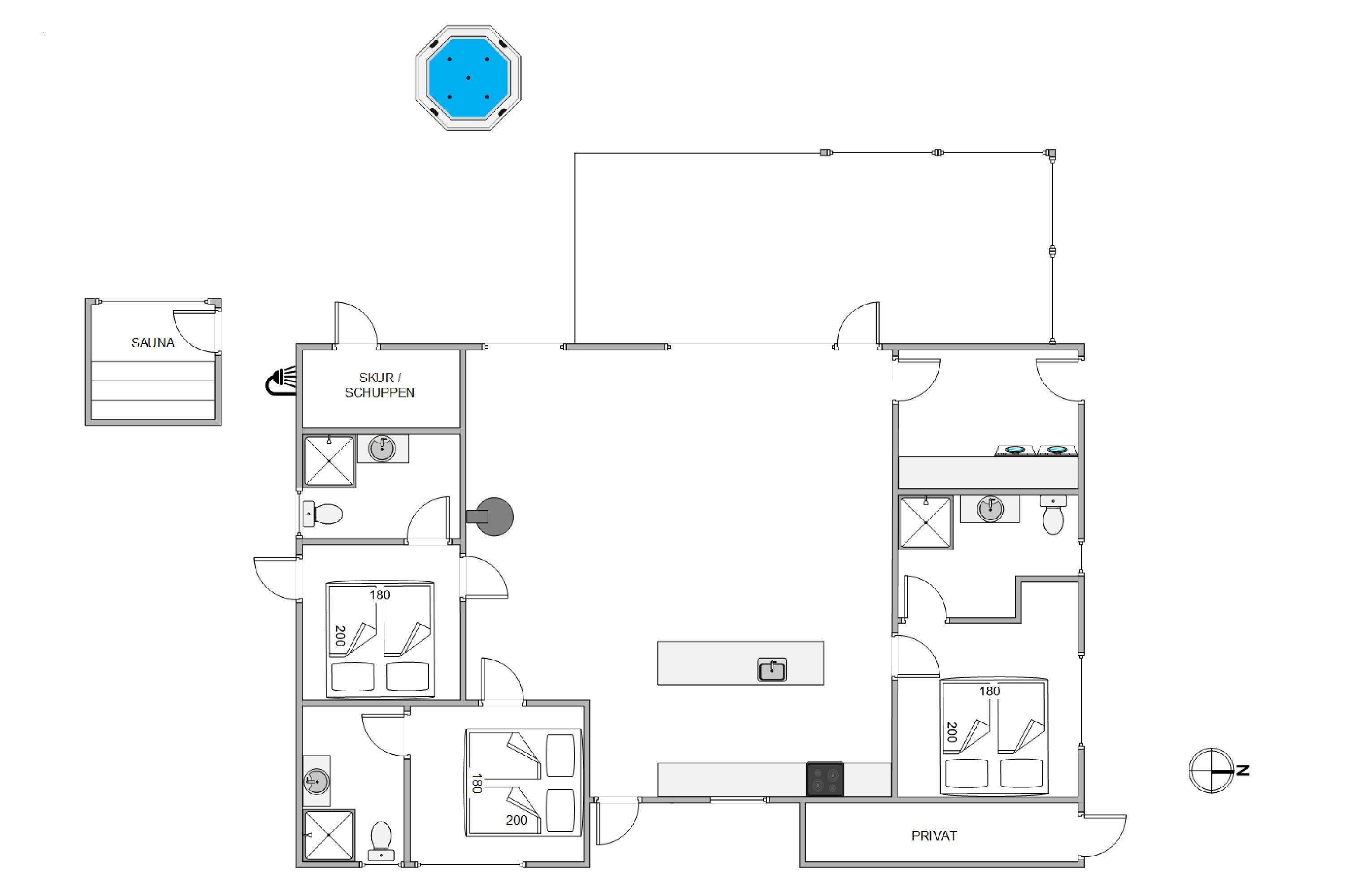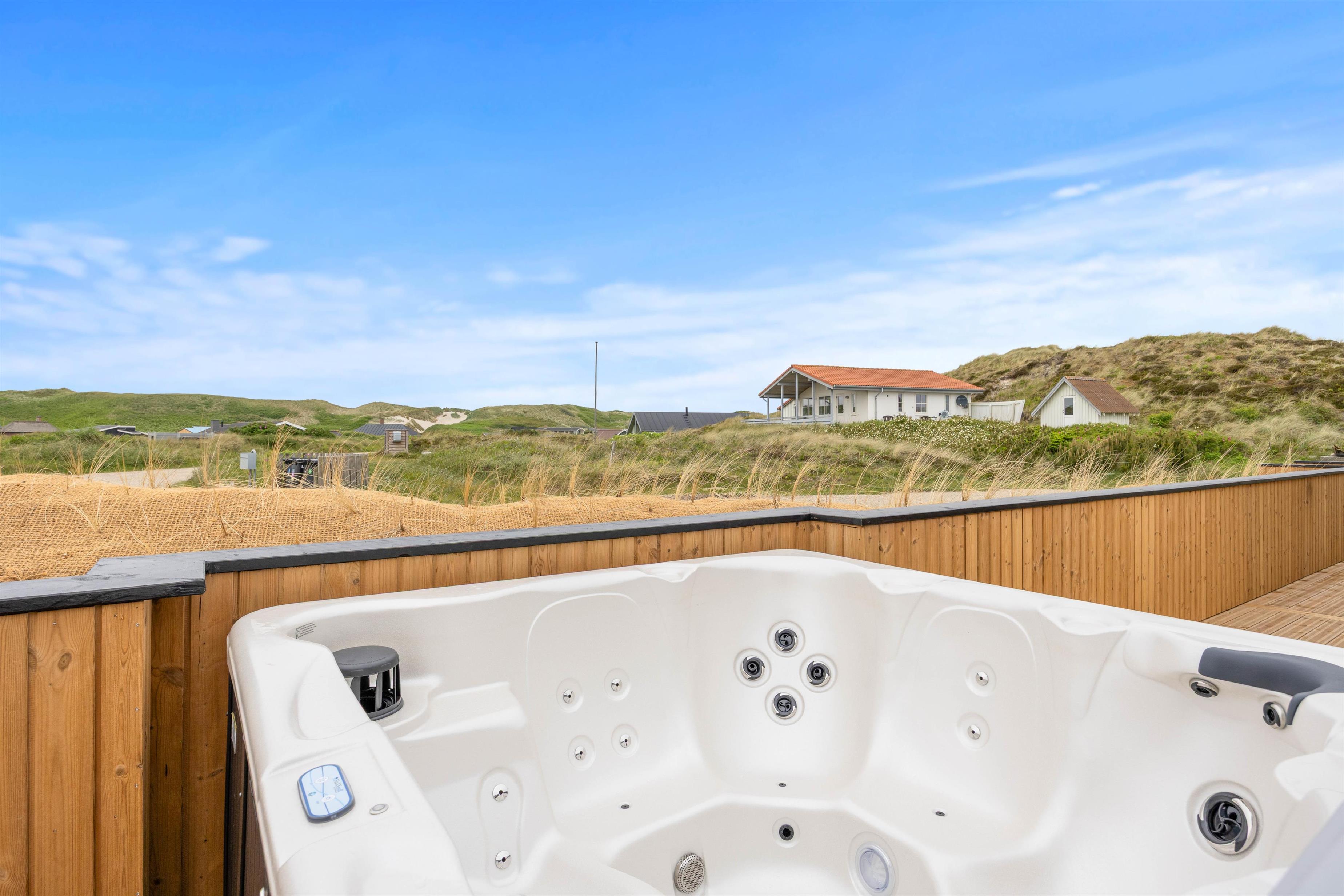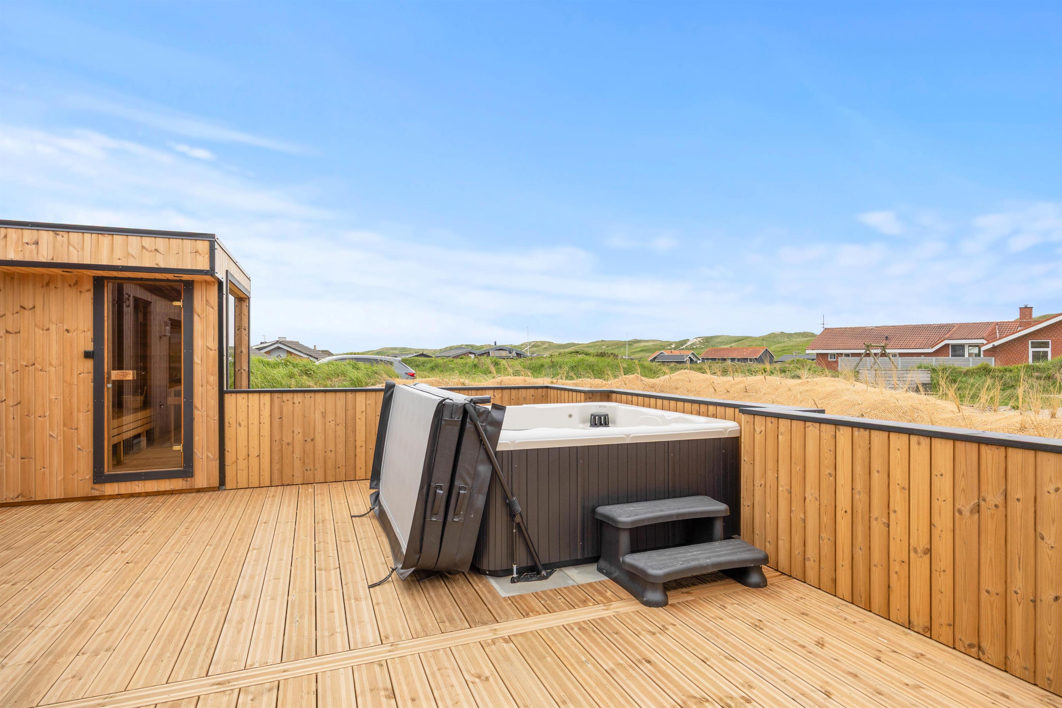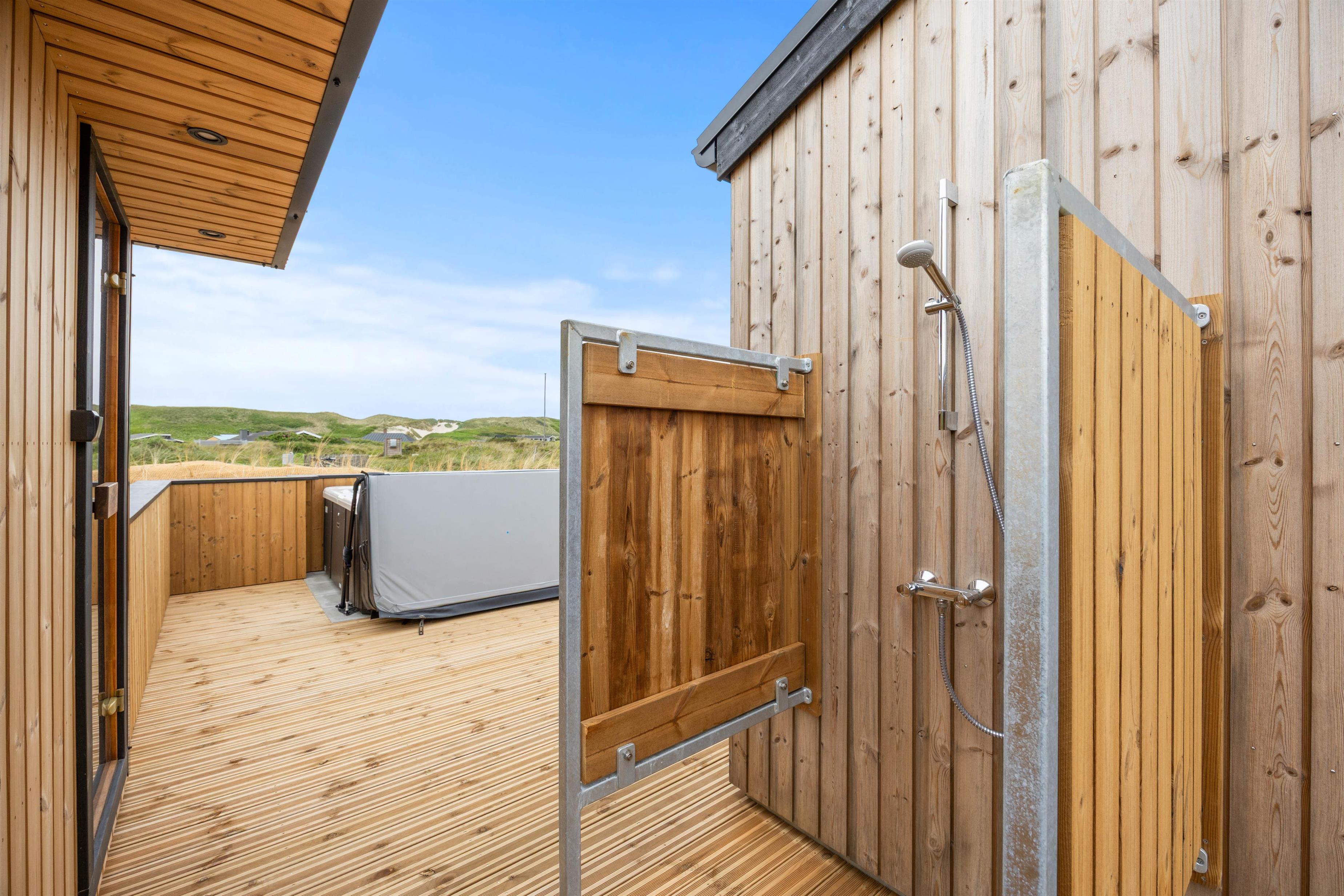 Når I trænger til at komme helt ned i gear, kan I sætte jer ud i udespaen, som I finder på terrassen. Her er der også mulighed for at sætte jer ind i saunaen og få varmen igen efter en kold tur ved havet. Hvis I trænger til et forfriskende brusebad, kan I tage en skyl under udebruseren, som er tilgængelig fra april til november.