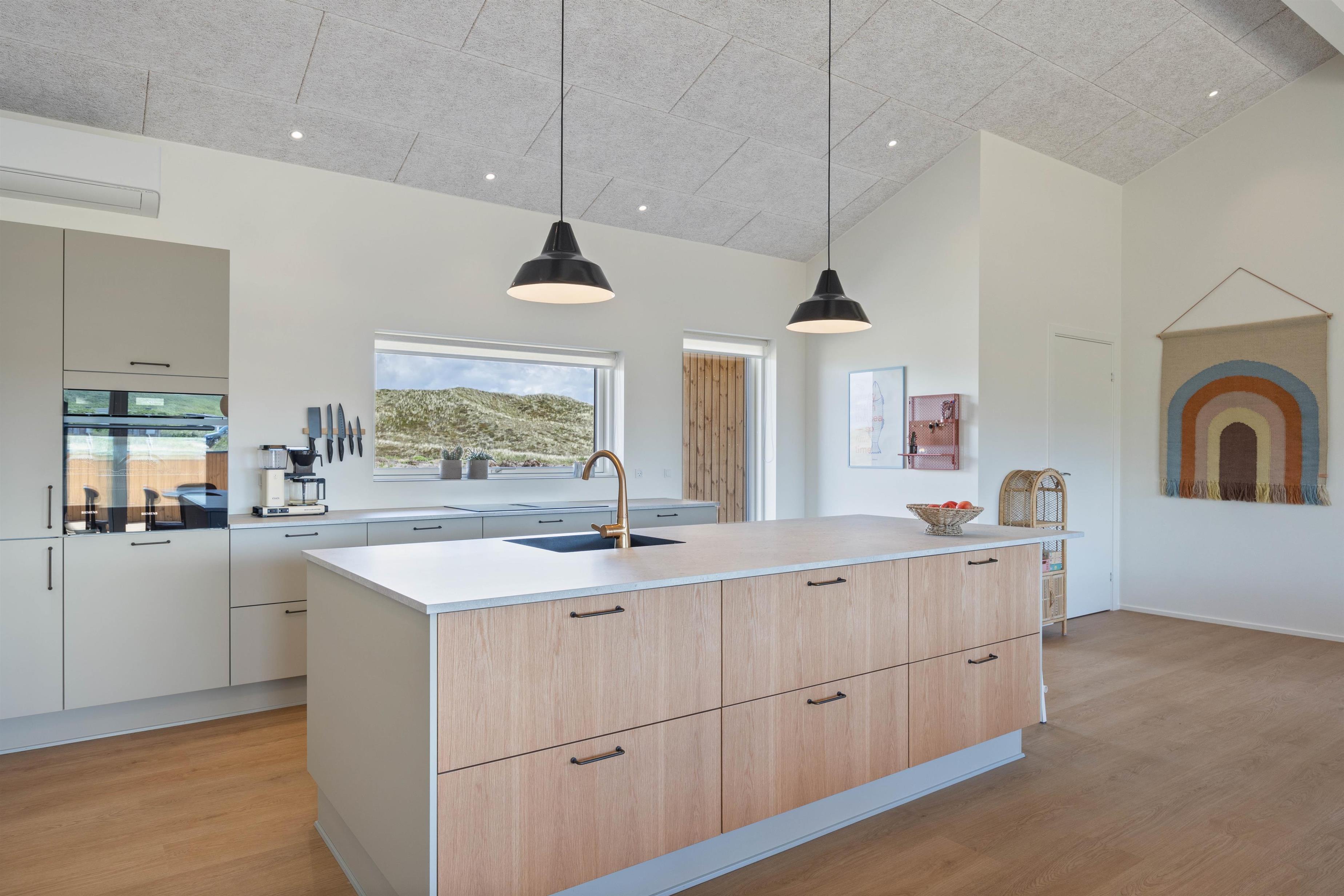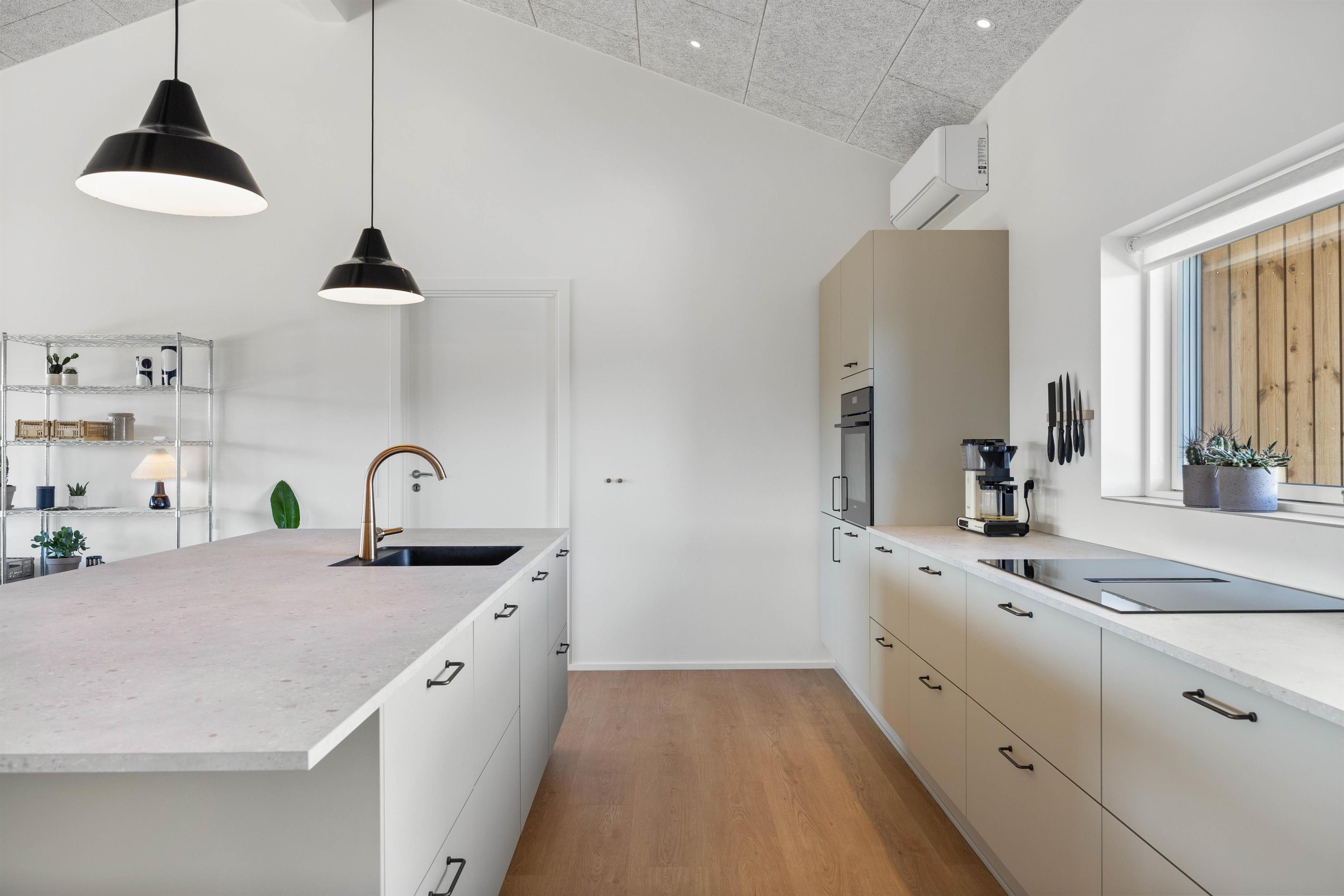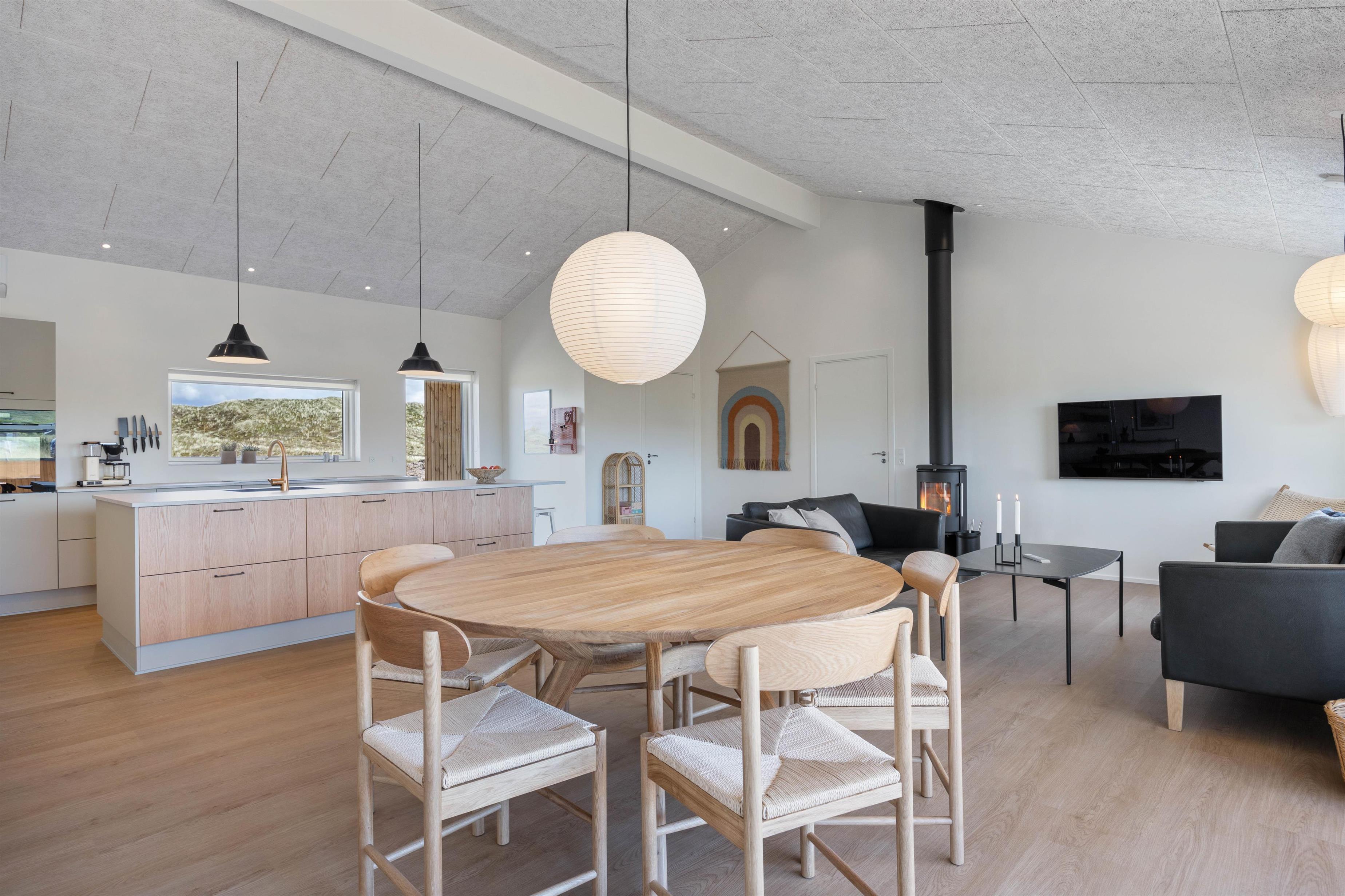 Sommerhuset byder på en dejlig atmosfære, som I mærker med det samme I træder ind. I det åbne køkken-alrum finder I en veludstyret køkkenafdeling med opvaskemaskine, så I ikke skal bekymre jer om opvasken. Udover opvaskemaskine er der også en vaskemaskine og tørretumbler i sommerhuset. Den hyggelige stue byder på en brændeovn, der spreder varme og hygge, imens varmepumpen sørger for et behagelig temperatur året rundt.