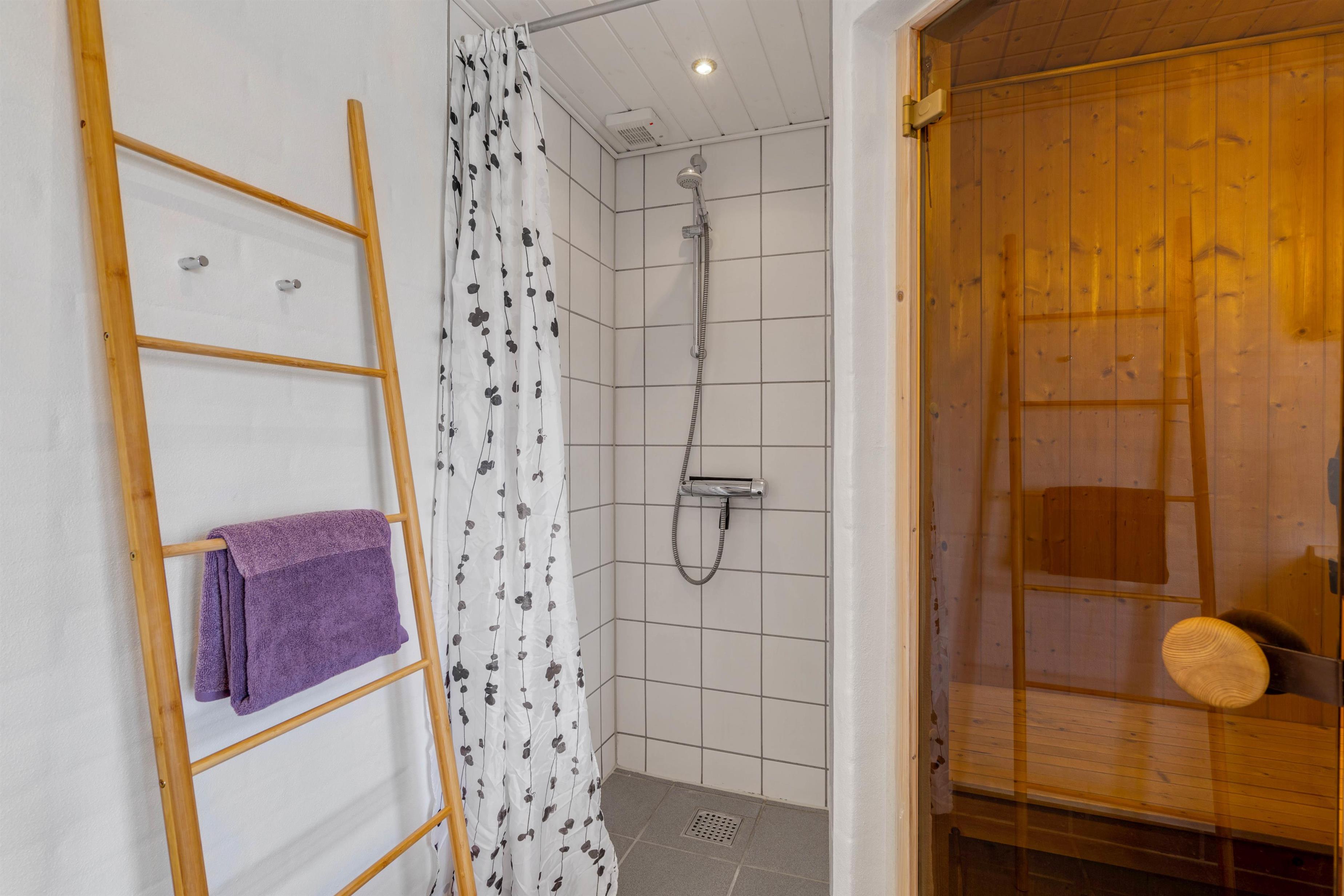Et æstetisk sommerhus med lys og stilfuld indretning, der giver den helt rette ferieatmosfære. Køkkenet med mikroovn, opvaskemaskine, køleskab og fryser er i åben forbindelse med spiseafdelingen, og her giver loftet til kip med synlige bjælker en dejlig følelse af rummelighed. I stuen er der god plads til hele familien i de behagelige møbler. Så her bliver der med sikkerhed hygget foran brændeovnen og det store fladskærms-TV. Sommerhuset har to badeværelser med gulvvarme og bruseniche. I det store badeværelse er der også spa og sauna, så er man til wellness og forkælelse, er dette hus et oplagt valg.