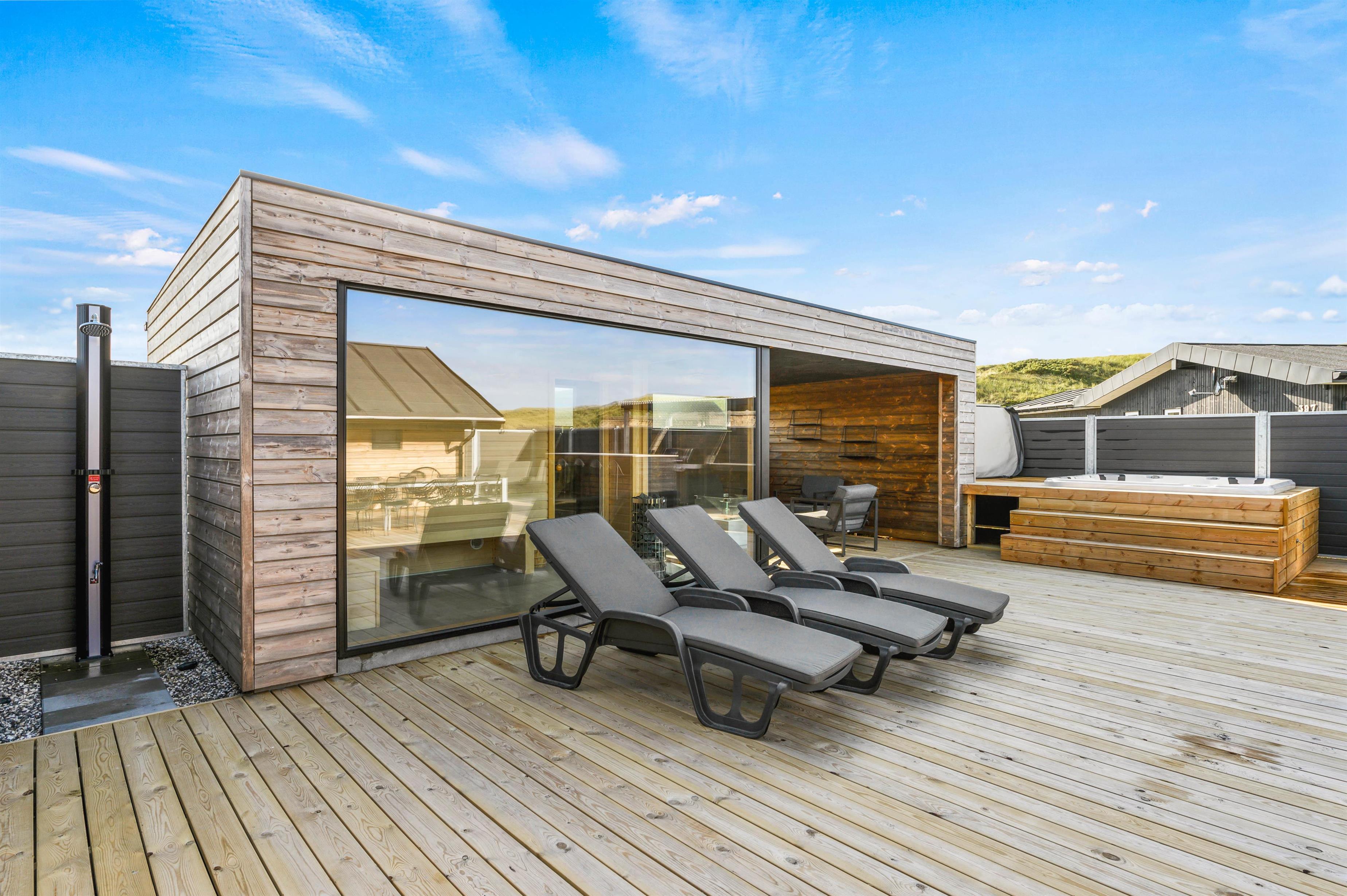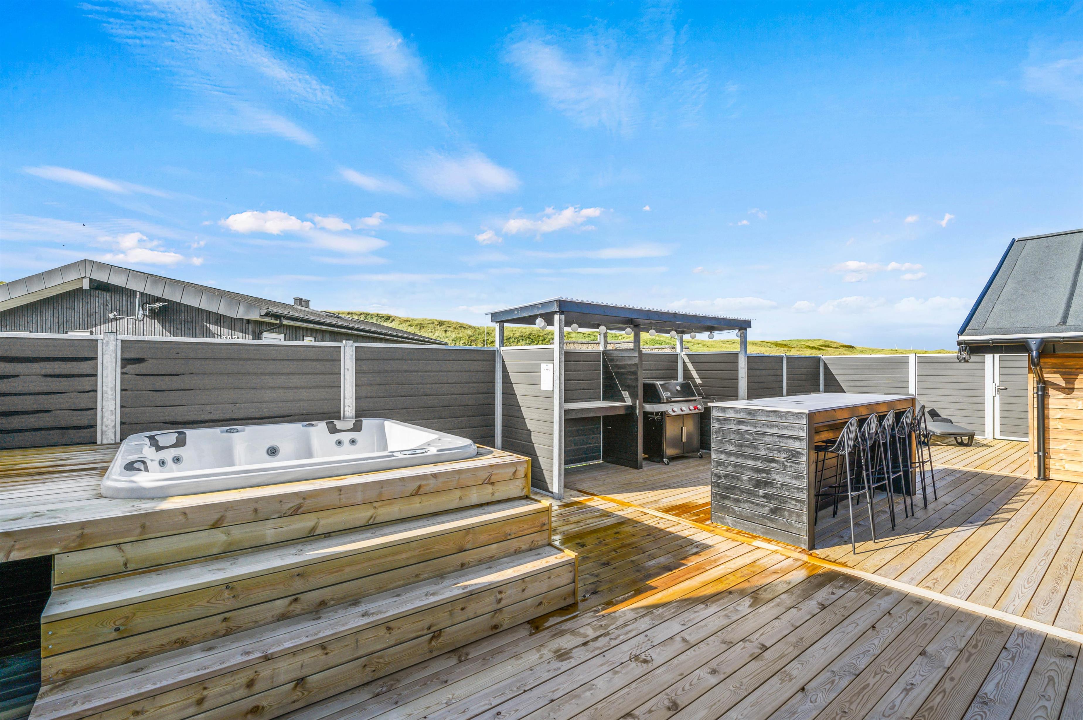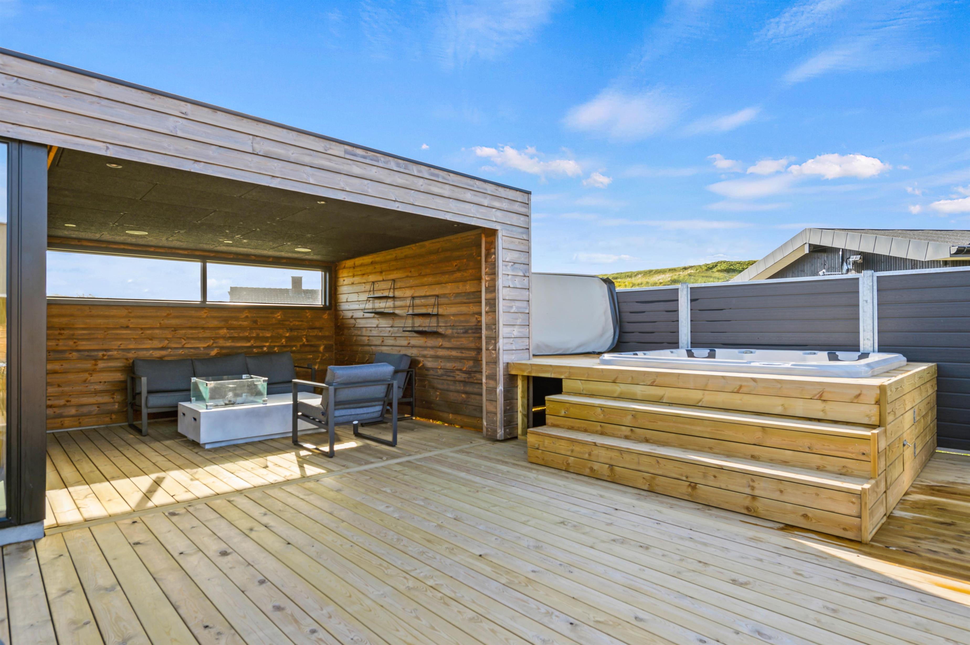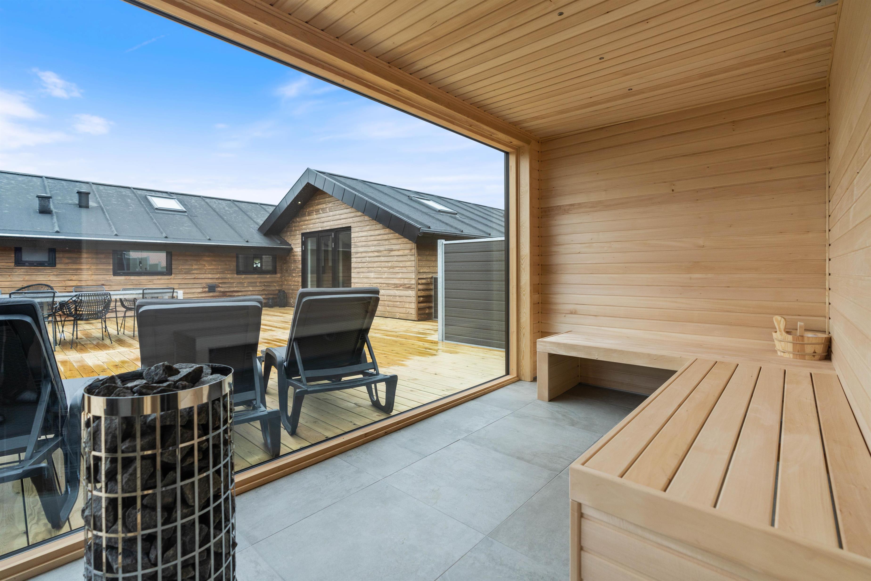 Når aftenen er ved at være omme, kan I hoppe en tur i det udendørs spabad efterfulgt af en tur i den varme sauna på terrassen.