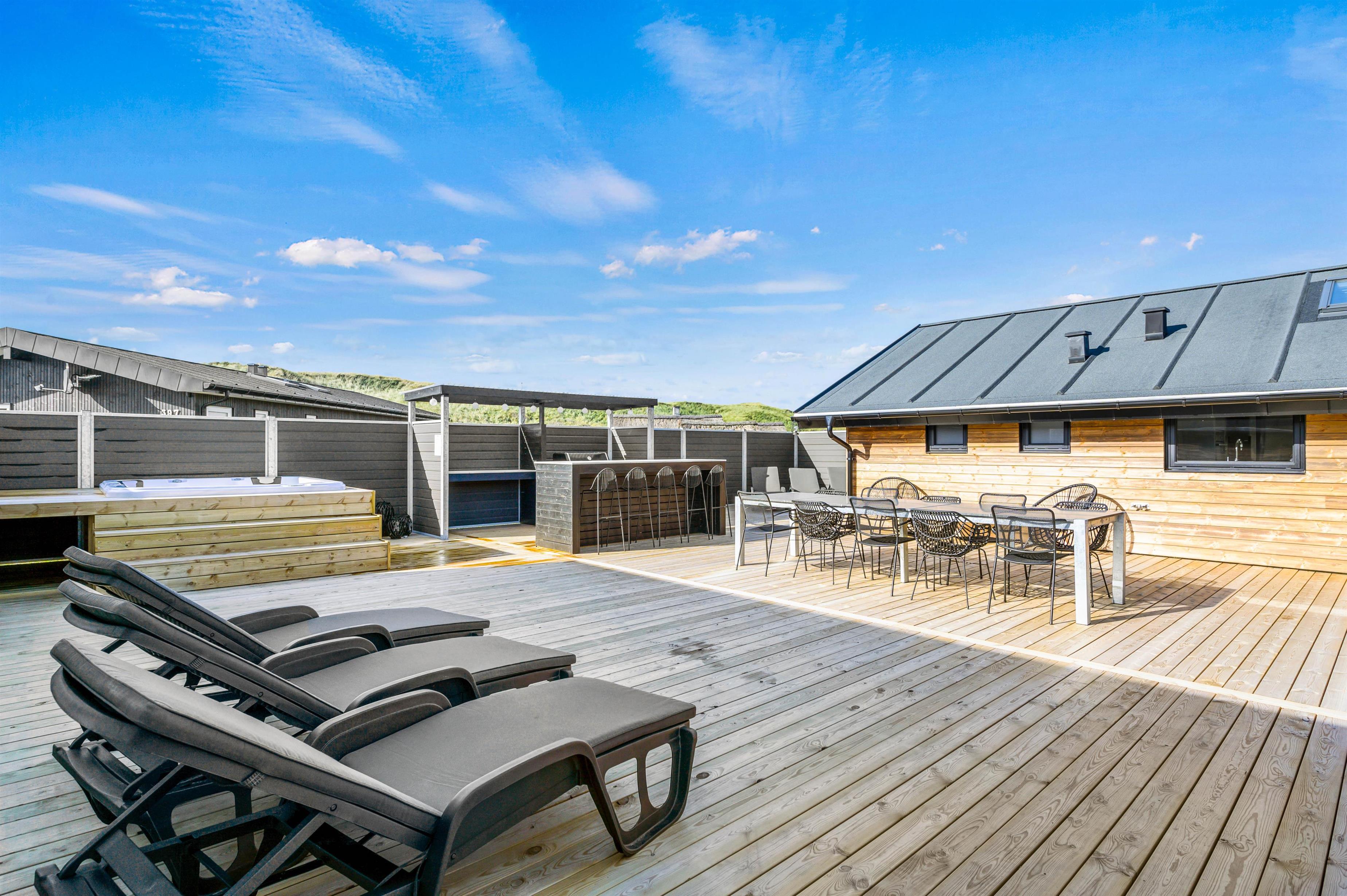 Stor lukket terrasse med udesauna og spabad og gratis vand