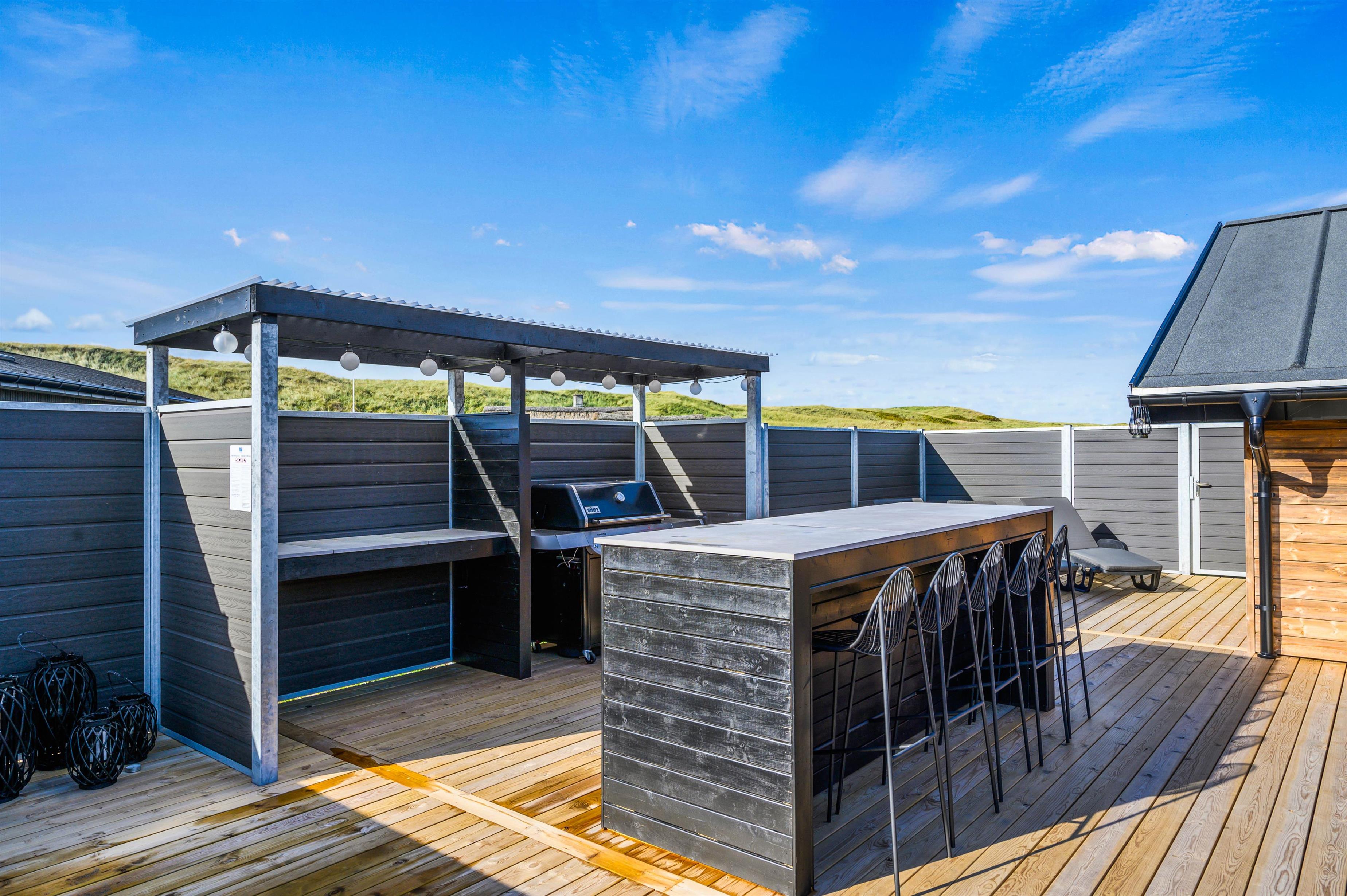 En oase til afslapning venter på jer i det udendørs område ved sommerhuset. Terrassen på naturgrunden inviterer jer til at nyde solen på liggestolene, mens Vesterhavet bruser lige rundt om hjørnet. Komfortable havemøbler og grill står klar til jer, så I kan holde en hyggelig grillaften i familiens selskab.