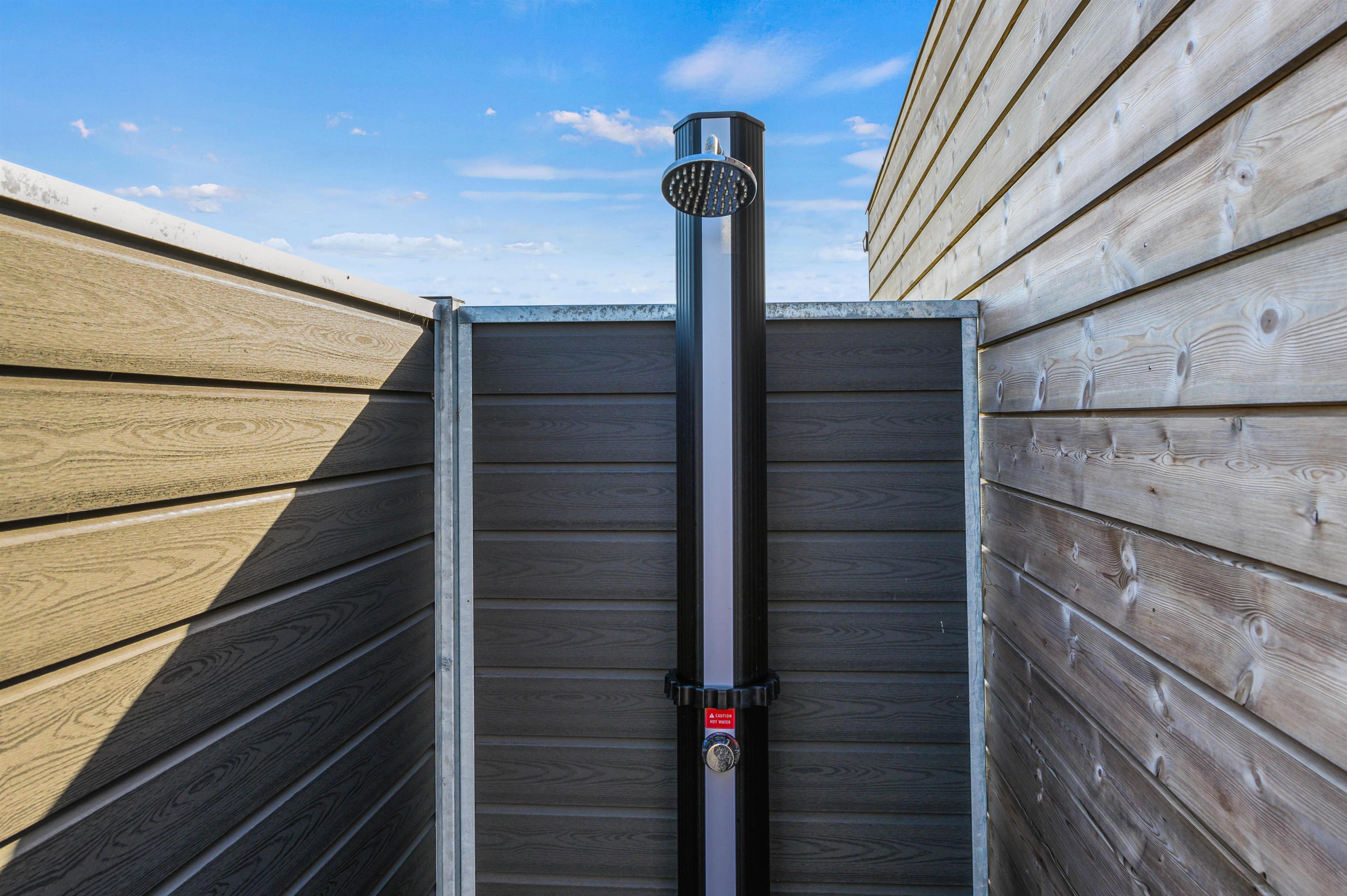 Terrassen er lukket samt delvist overdækket og afskærmet, så I kan sidde i læ for vinden, og hundene kan gå frit rundt. Desuden er der på terrassen en udebruser, dog opvarmes vandet til bruseren af vejret, og vandtemperaturen afhænger derfor af vejrforholdene. Udebruseren er derfor også kun tilgængelig fra april til november.