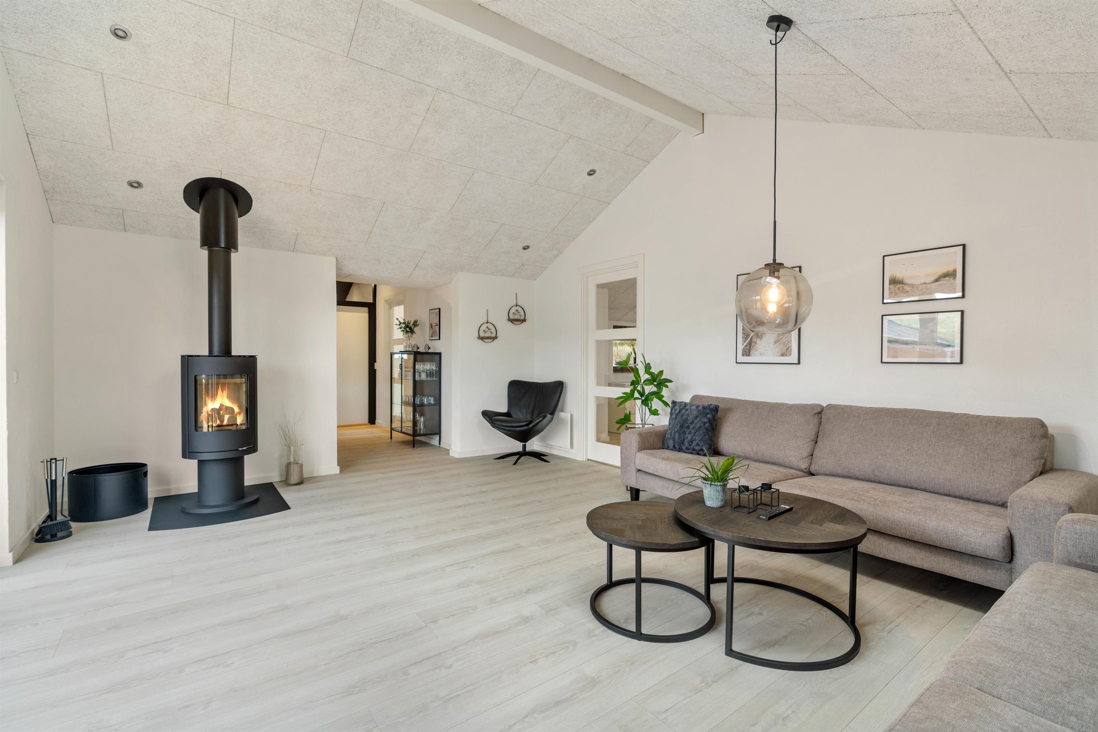I det lyse og indbydende opholdsrum er der plads til hele familien, som kan hygge sig på en kold sommeraften. Her kan I tænde op i brændeovnen, mens I ser en god film. Der er desuden en energibesparende varmepumpe, som I med fordel kan benytte til opvarmningen eller til at køle feriehuset ned på de varmere sommerdage.