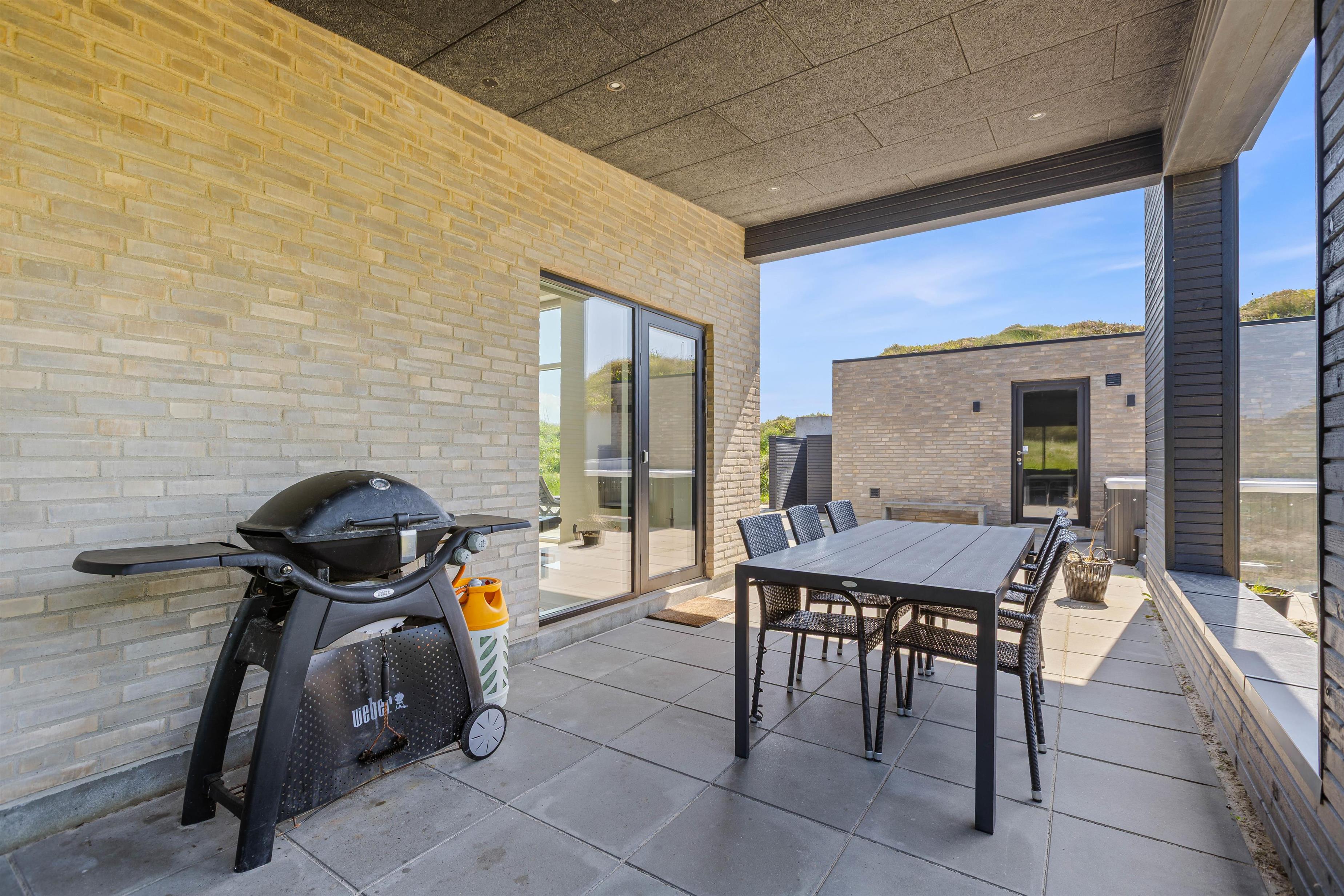 Sommerhuset har en skøn, overdækket terrasse, hvor I kan nyde mange hyggelige timer med hele familien. En god feriedag kan afsluttes på bedste vis med en god grillmiddag lavet på feriehusets gasgrill.