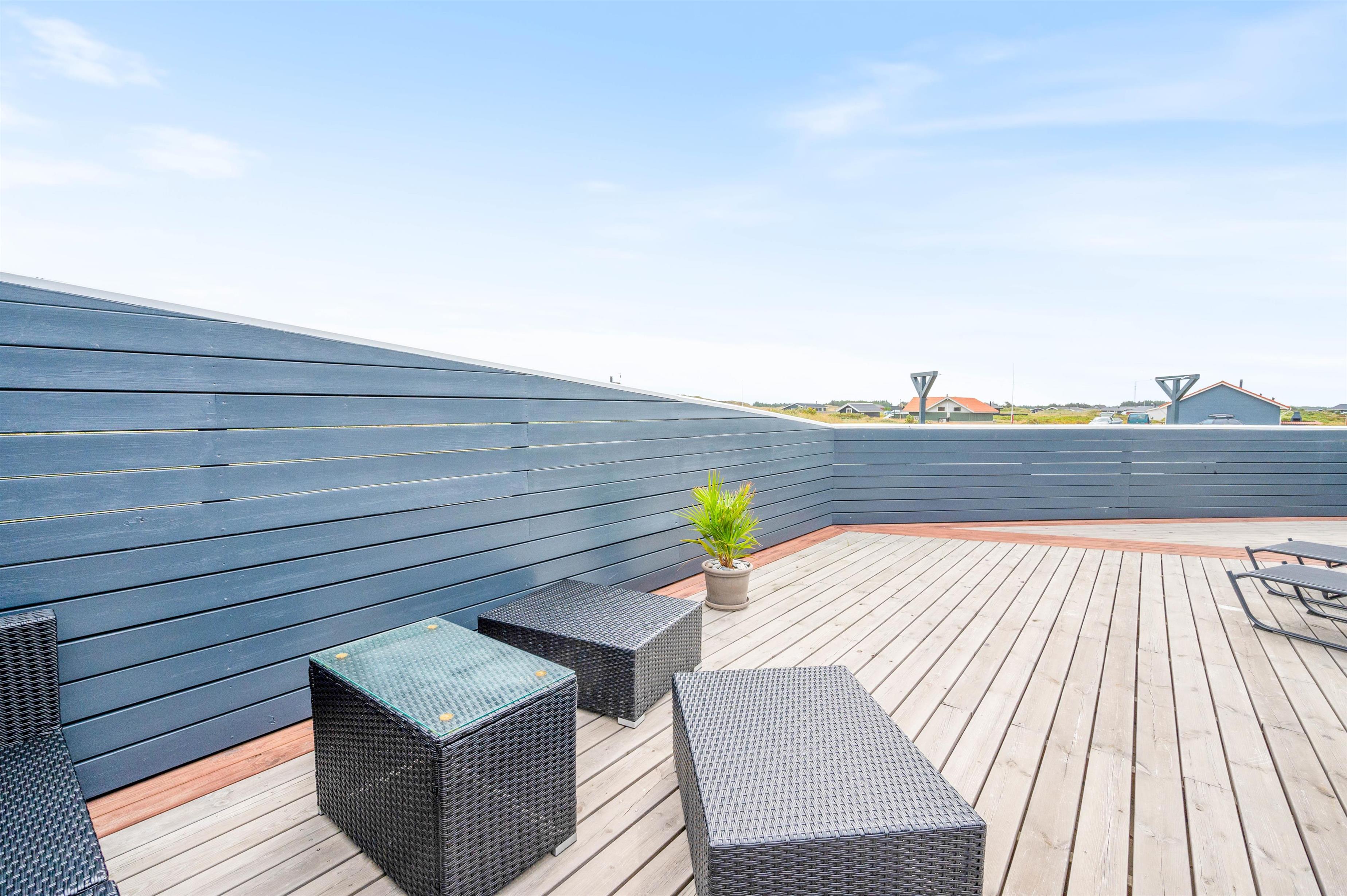 Feriehuset byder på en skøn lukket terrasse, som er ideel for familier med børn og hund. Fra terrassen, som går næsten hele vejen rundt om feriehuset, har I den mest fantastiske panoramaudsigt over klitlandskabet. Fra ferieadressen er der blot 250 meter til stranden, og fra terrassen kan havets brusen og den skønne friske duft tydeligt høres og fornemmes.