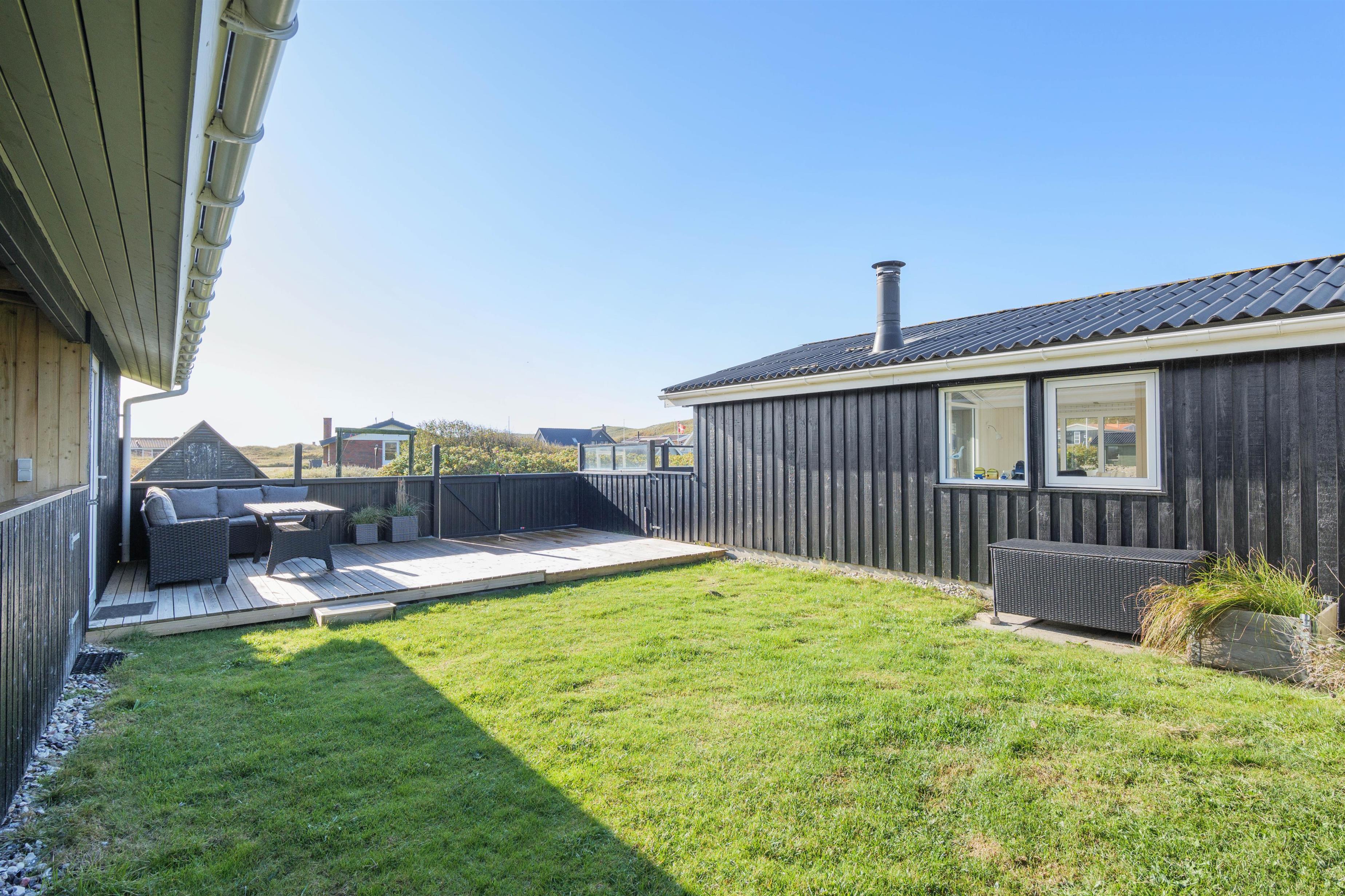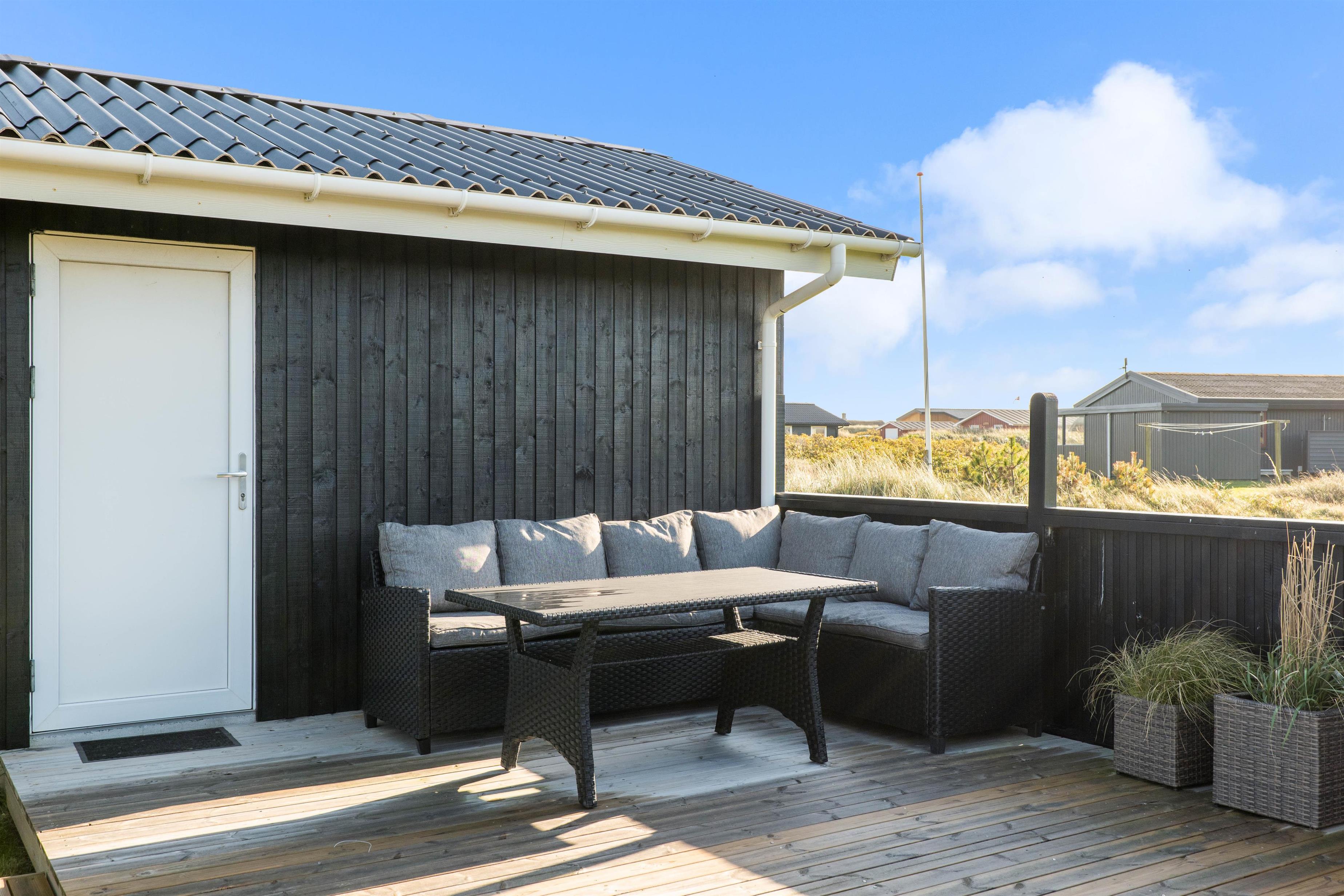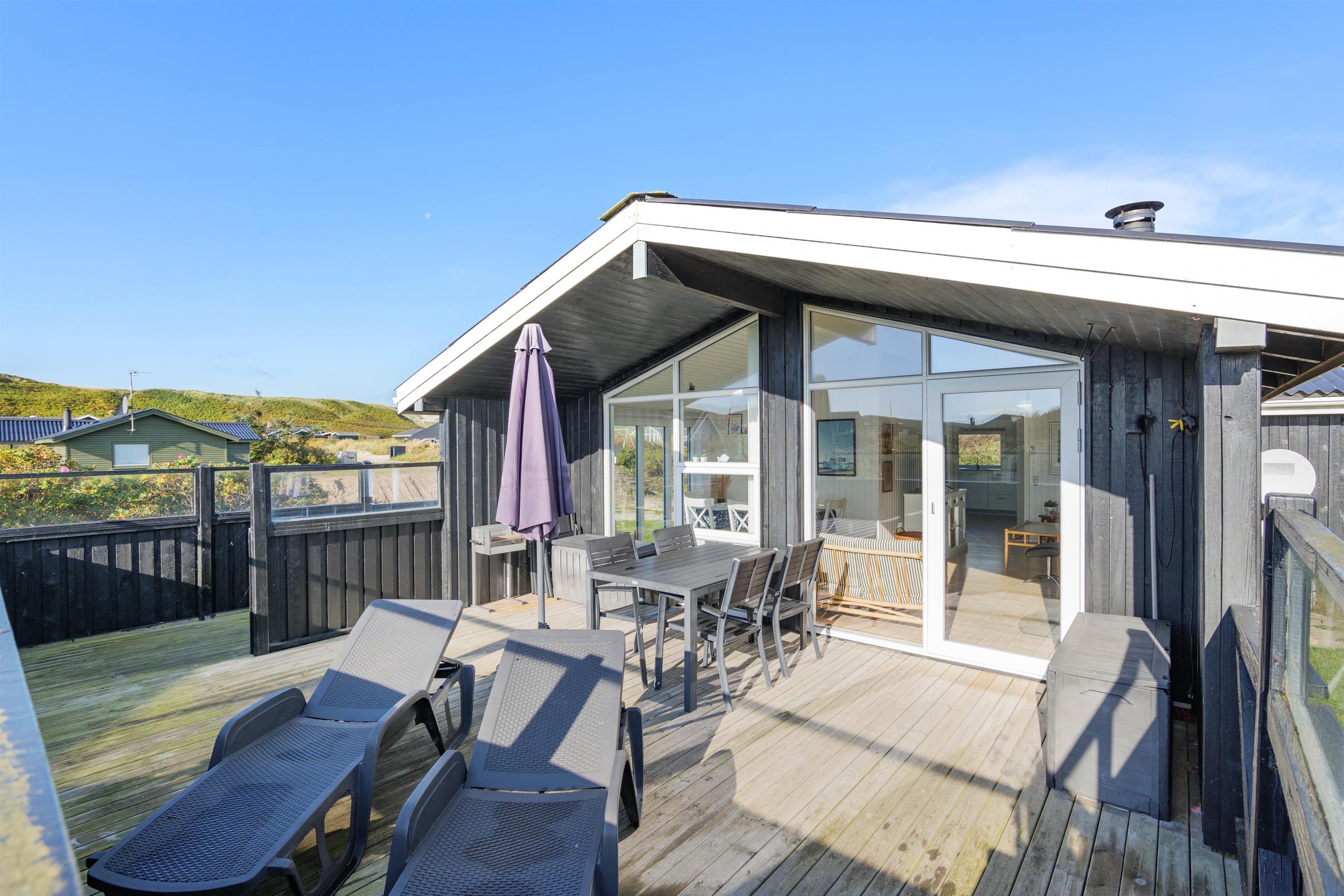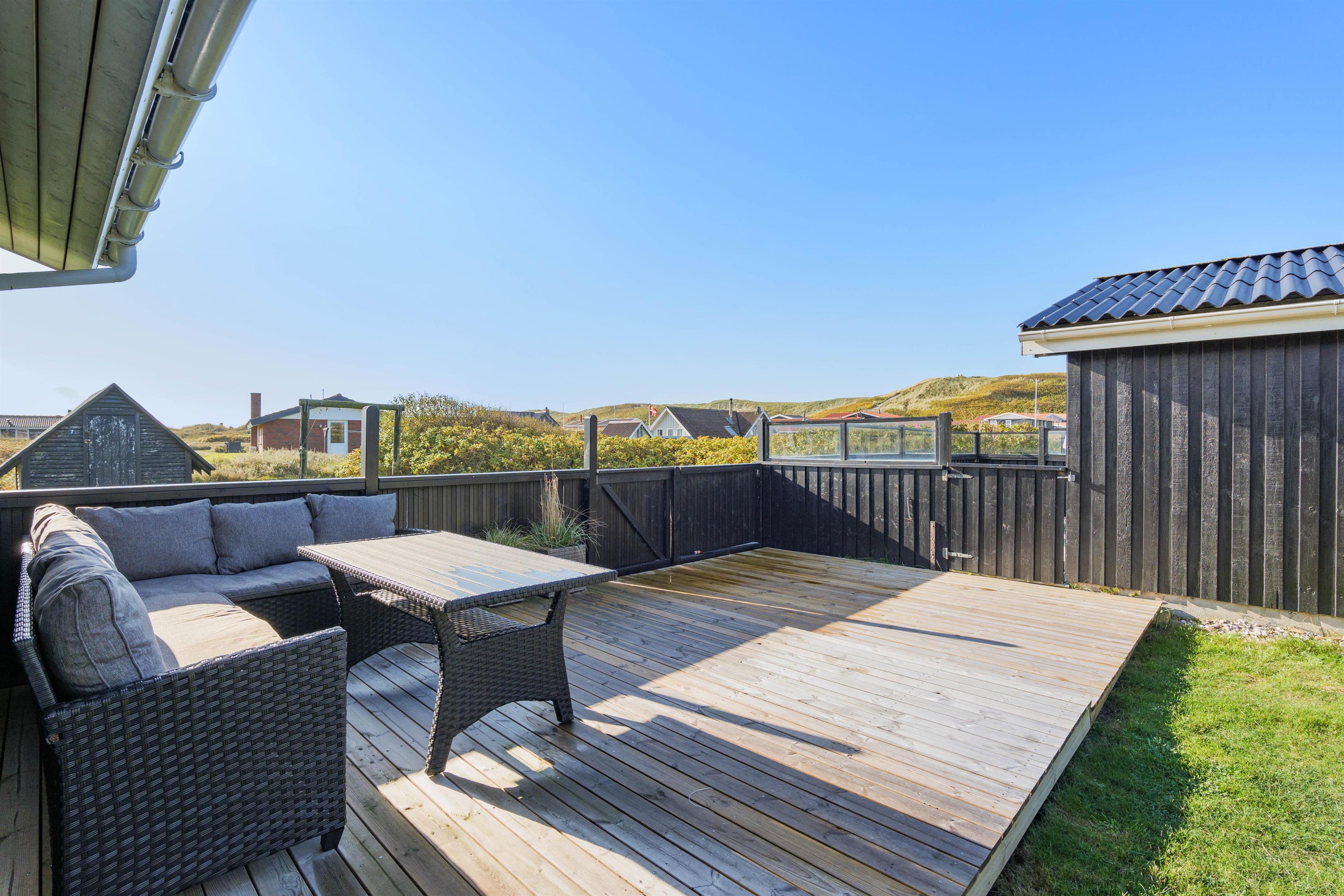 Sommerhuset har en rigtig god, lukket terrasse, hvor du kan sidde med din avis og kaffe i timevis. Her er der ingen dagsorden eller stress. Her kan du trække stikket ud for en stund og nyde omgivelserne og ferien, mens hunden nyder den lille gård eller den store græsplæne. Til terrassen hører gode havemøbler, liggestole og gynge. En veltilberedt middag, tilberedt på gasgrillen og en aftendrink, med solnedgangen over klitterne og havets beroligende brusen i baggrunden, må være den ultimative afslapning.