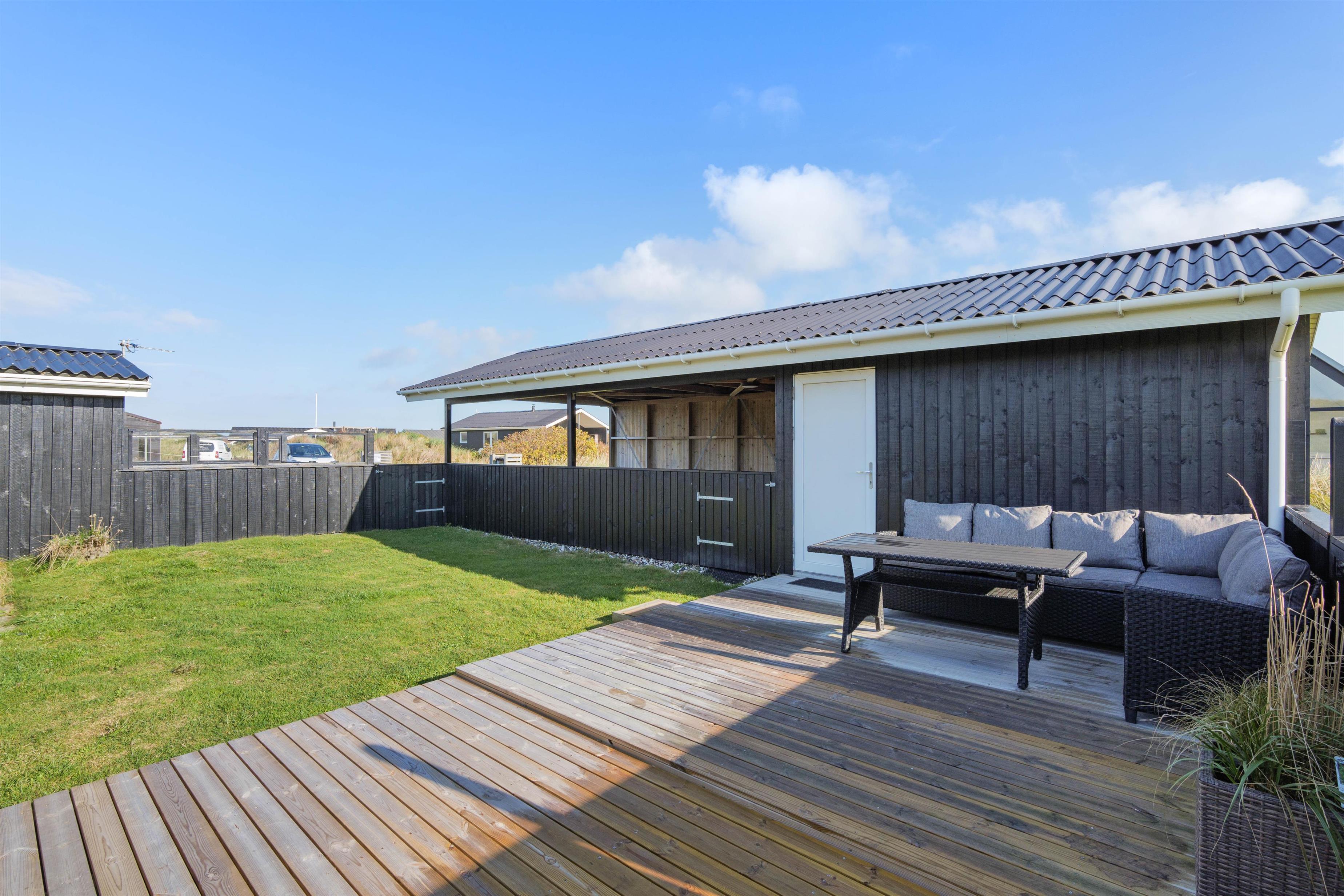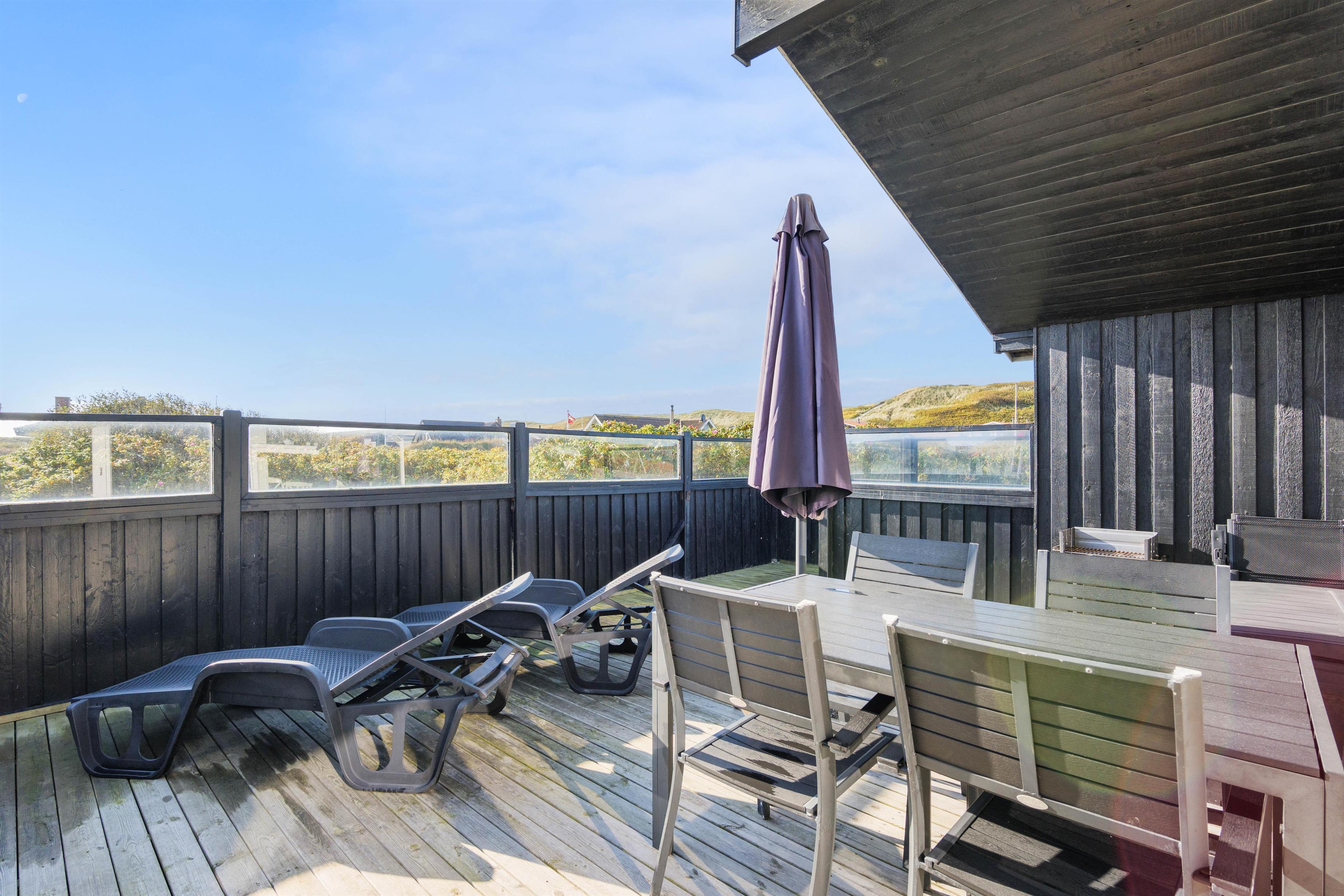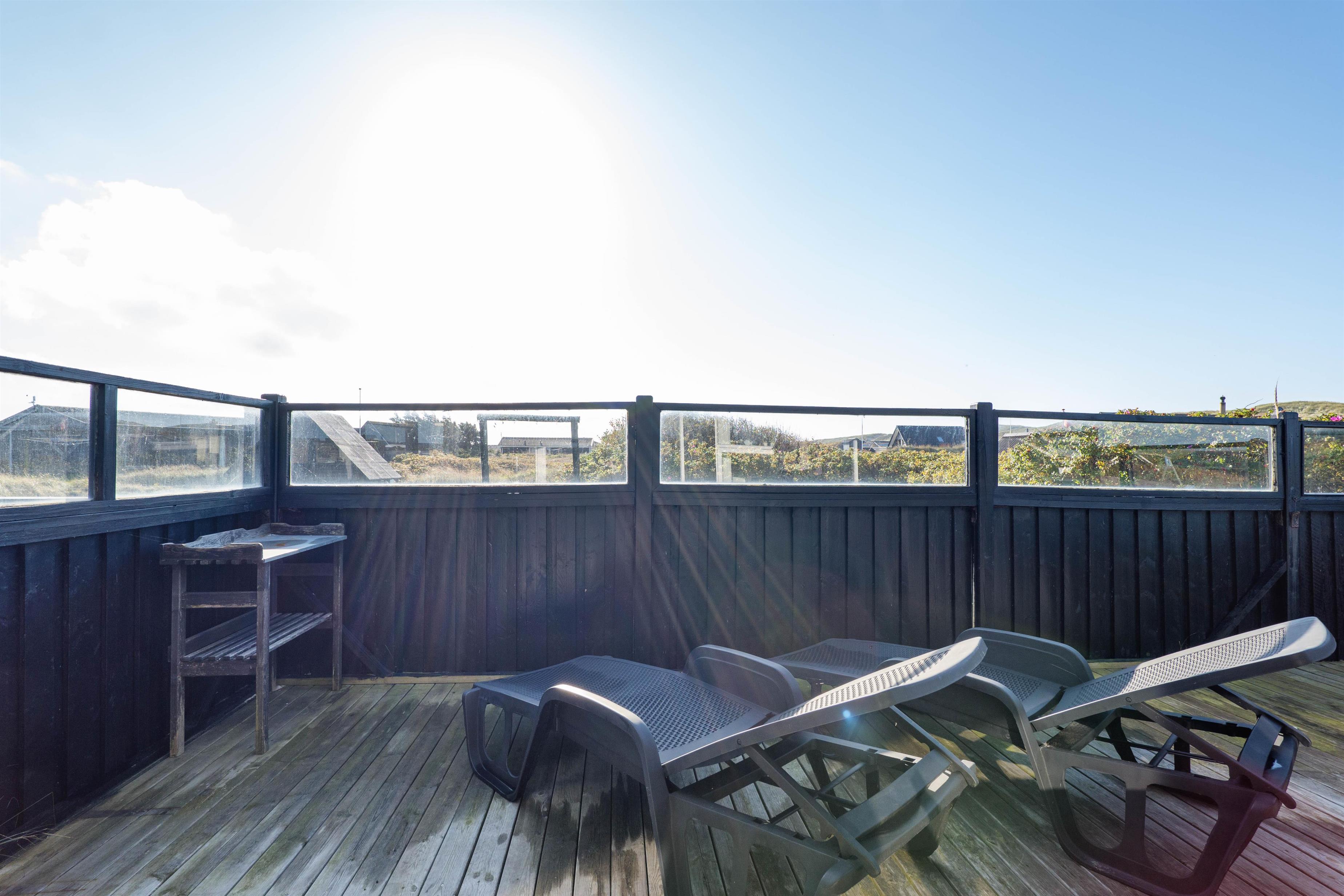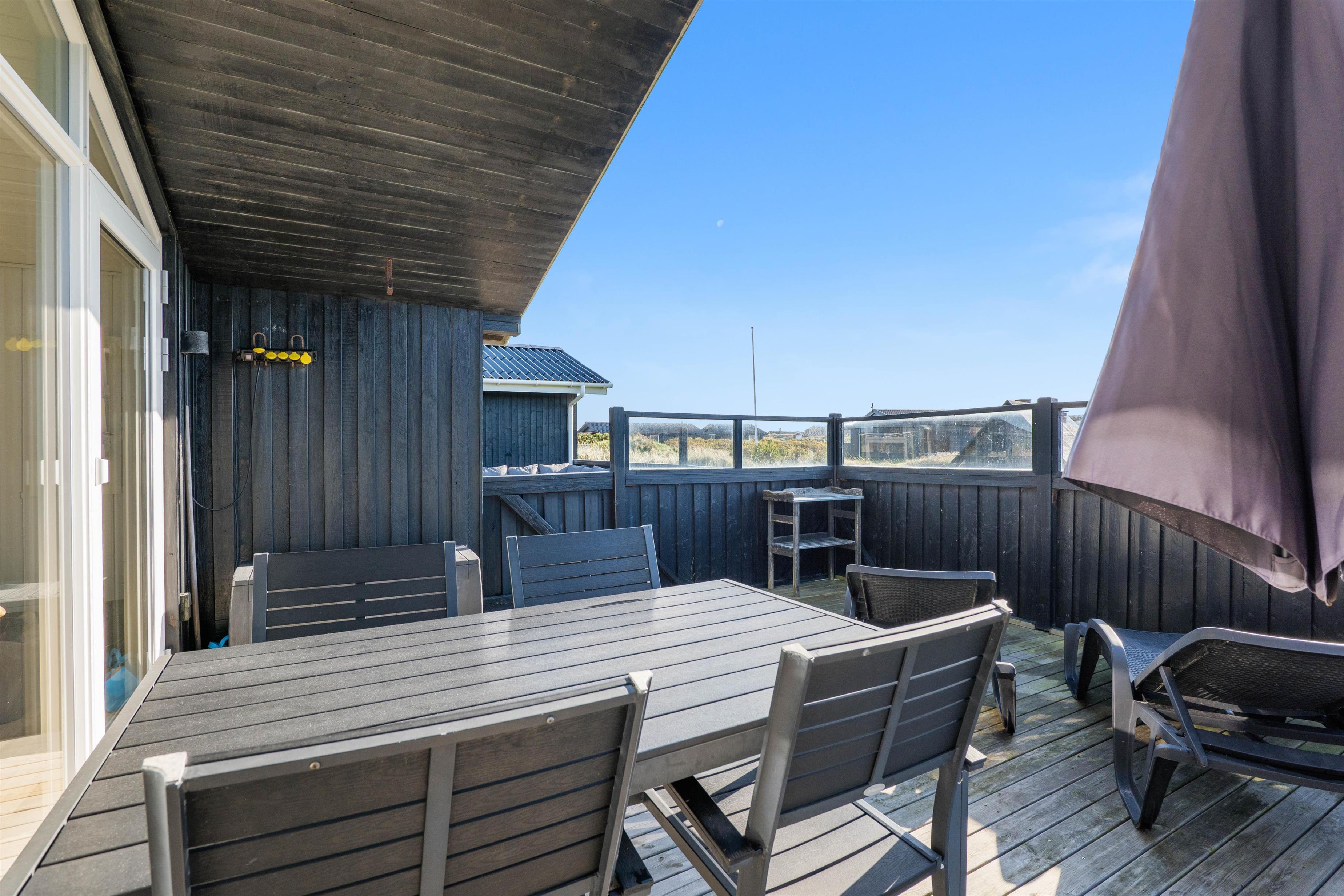 Sommerhuset har en rigtig god, lukket terrasse, hvor du kan sidde med din avis og kaffe i timevis. Her er der ingen dagsorden eller stress. Her kan du trække stikket ud for en stund og nyde omgivelserne og ferien, mens hunden nyder den lille gård eller den store græsplæne. Til terrassen hører gode havemøbler, liggestole og gynge. En veltilberedt middag, tilberedt på gasgrillen og en aftendrink, med solnedgangen over klitterne og havets beroligende brusen i baggrunden, må være den ultimative afslapning.