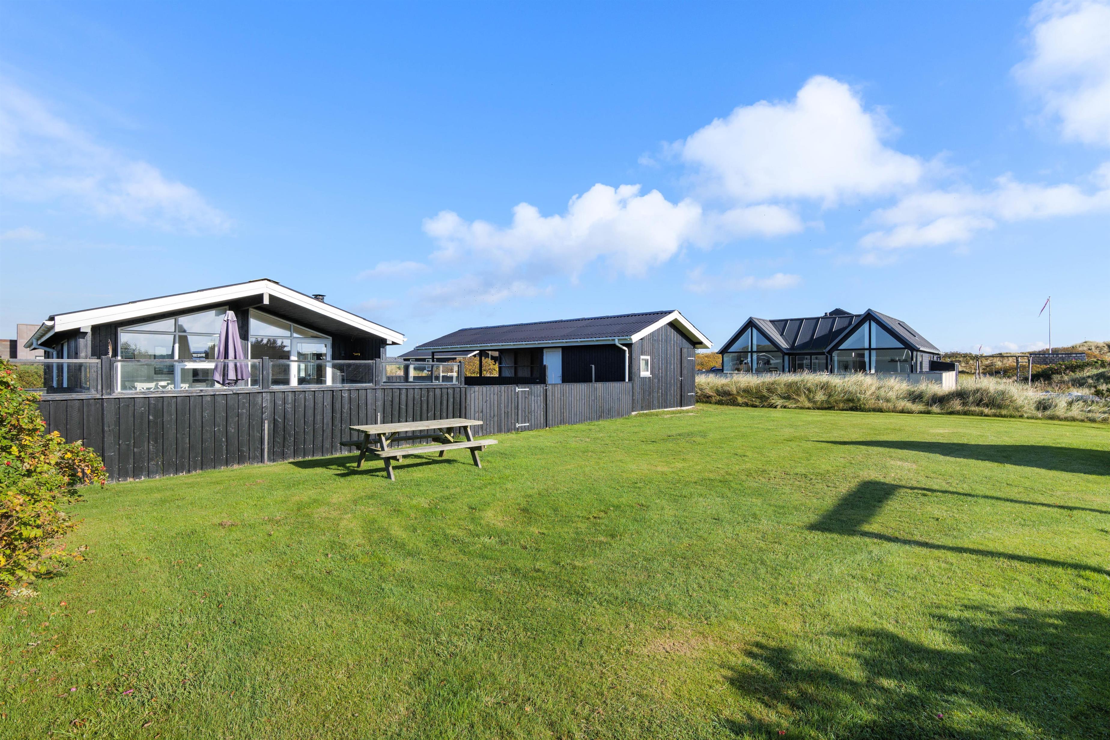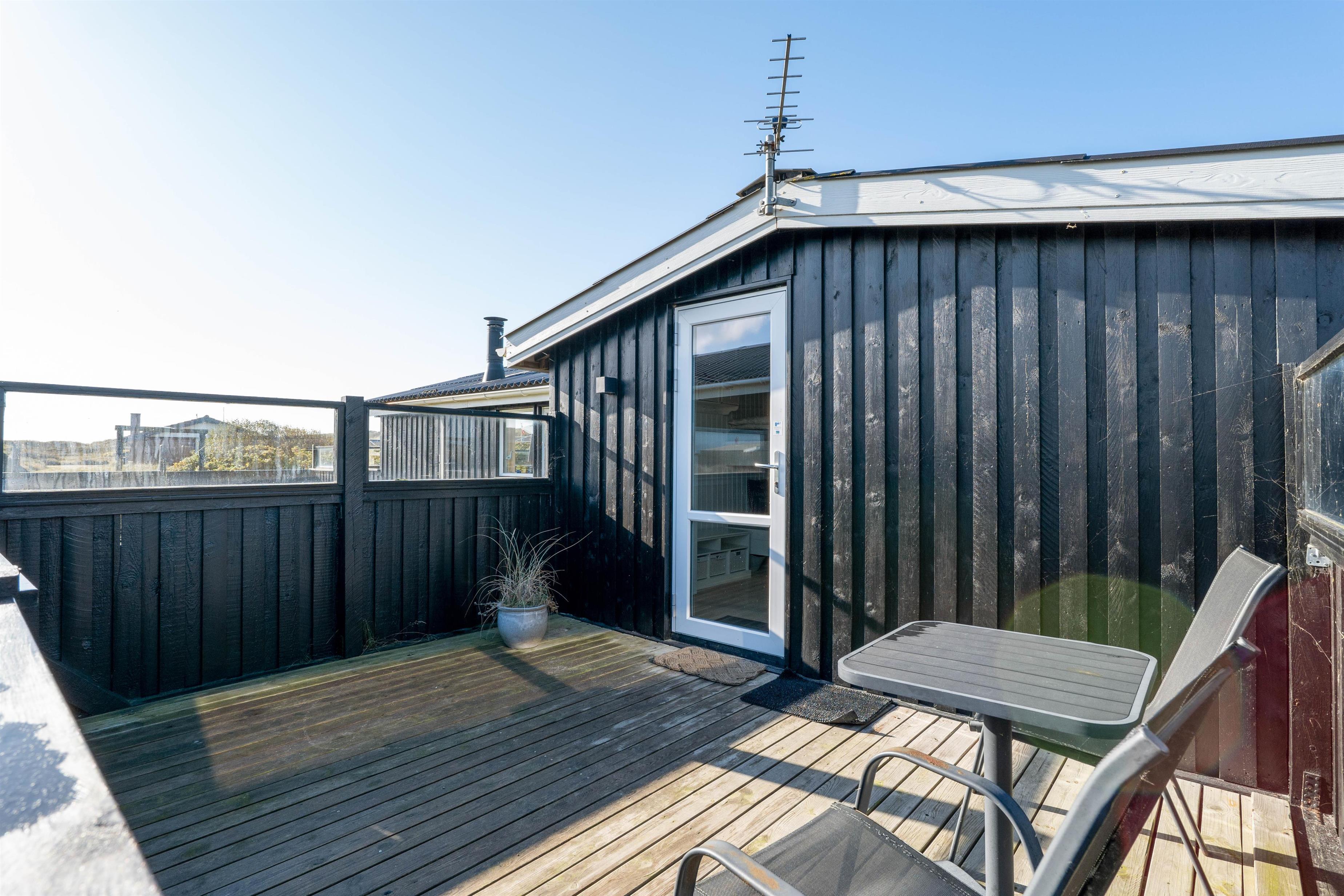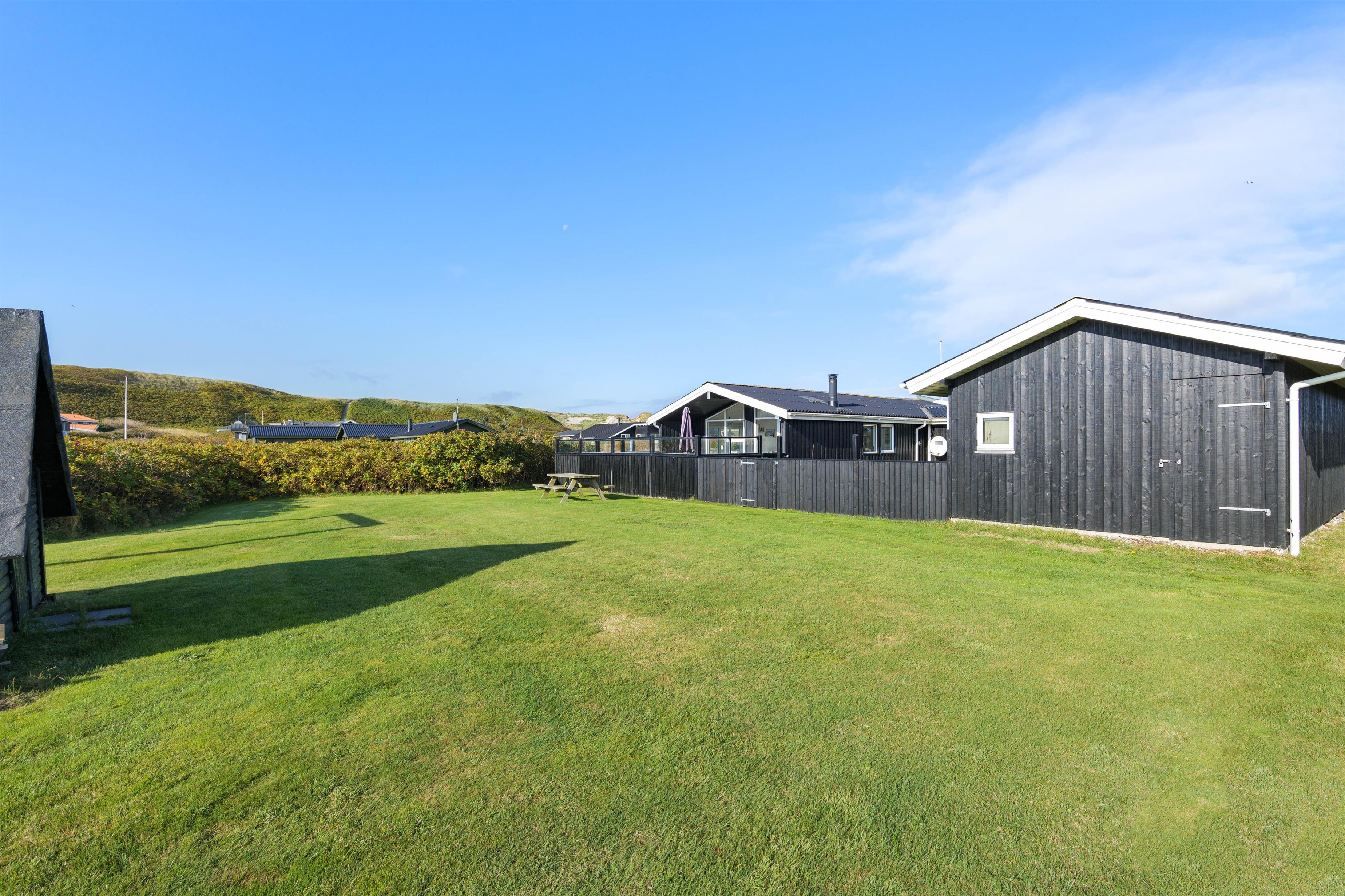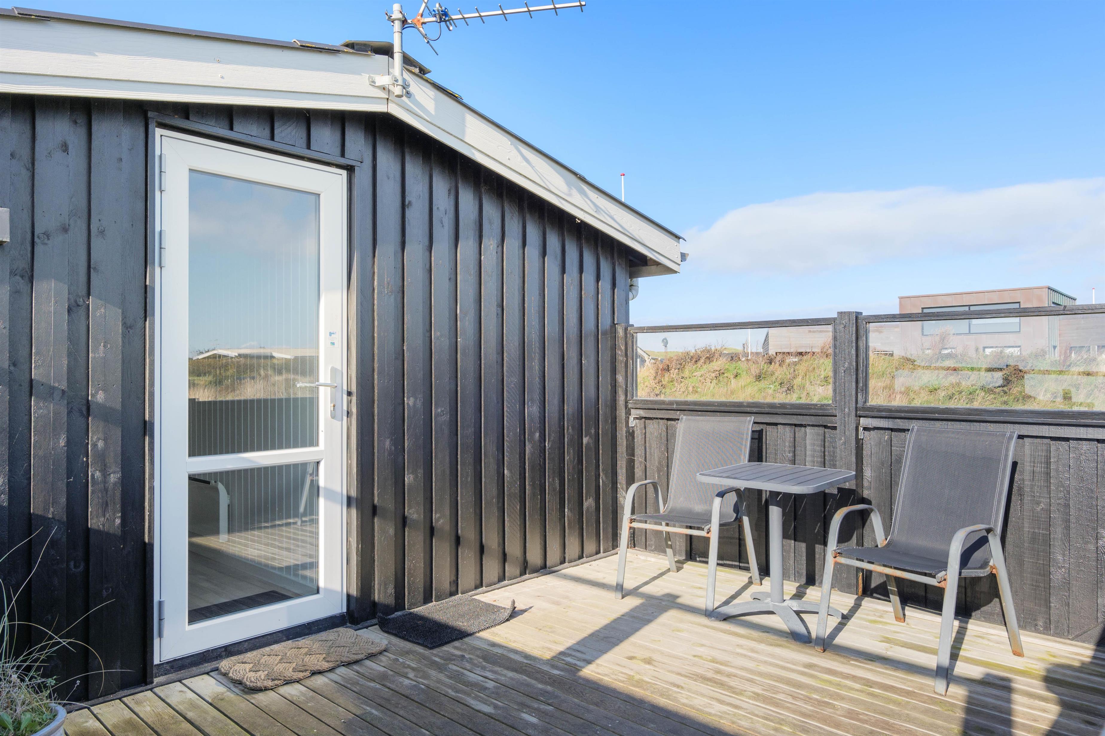 Sommerhuset har en rigtig god, lukket terrasse, hvor du kan sidde med din avis og kaffe i timevis. Her er der ingen dagsorden eller stress. Her kan du trække stikket ud for en stund og nyde omgivelserne og ferien, mens hunden nyder den lille gård eller den store græsplæne. Til terrassen hører gode havemøbler, liggestole og gynge. En veltilberedt middag, tilberedt på gasgrillen og en aftendrink, med solnedgangen over klitterne og havets beroligende brusen i baggrunden, må være den ultimative afslapning.