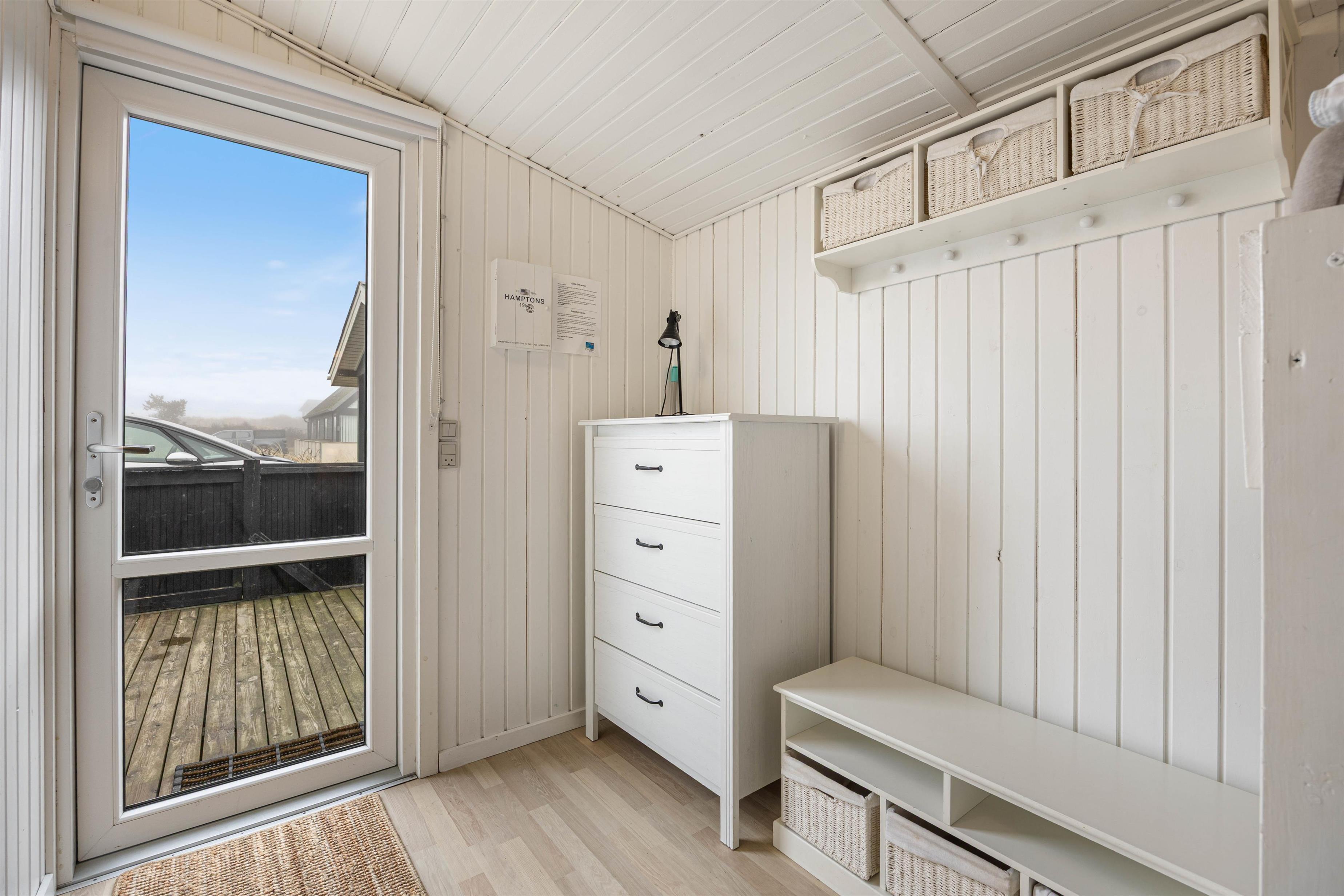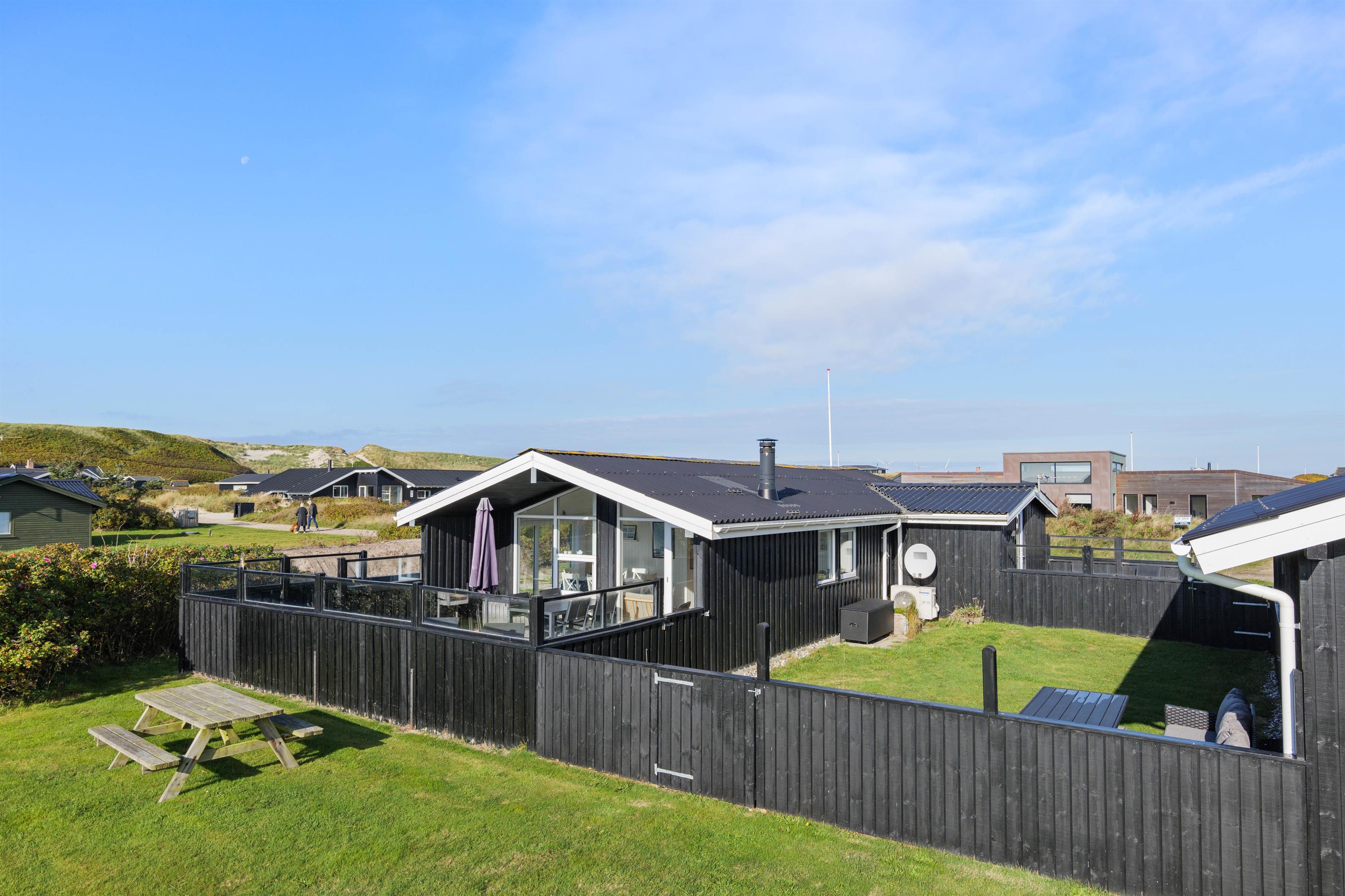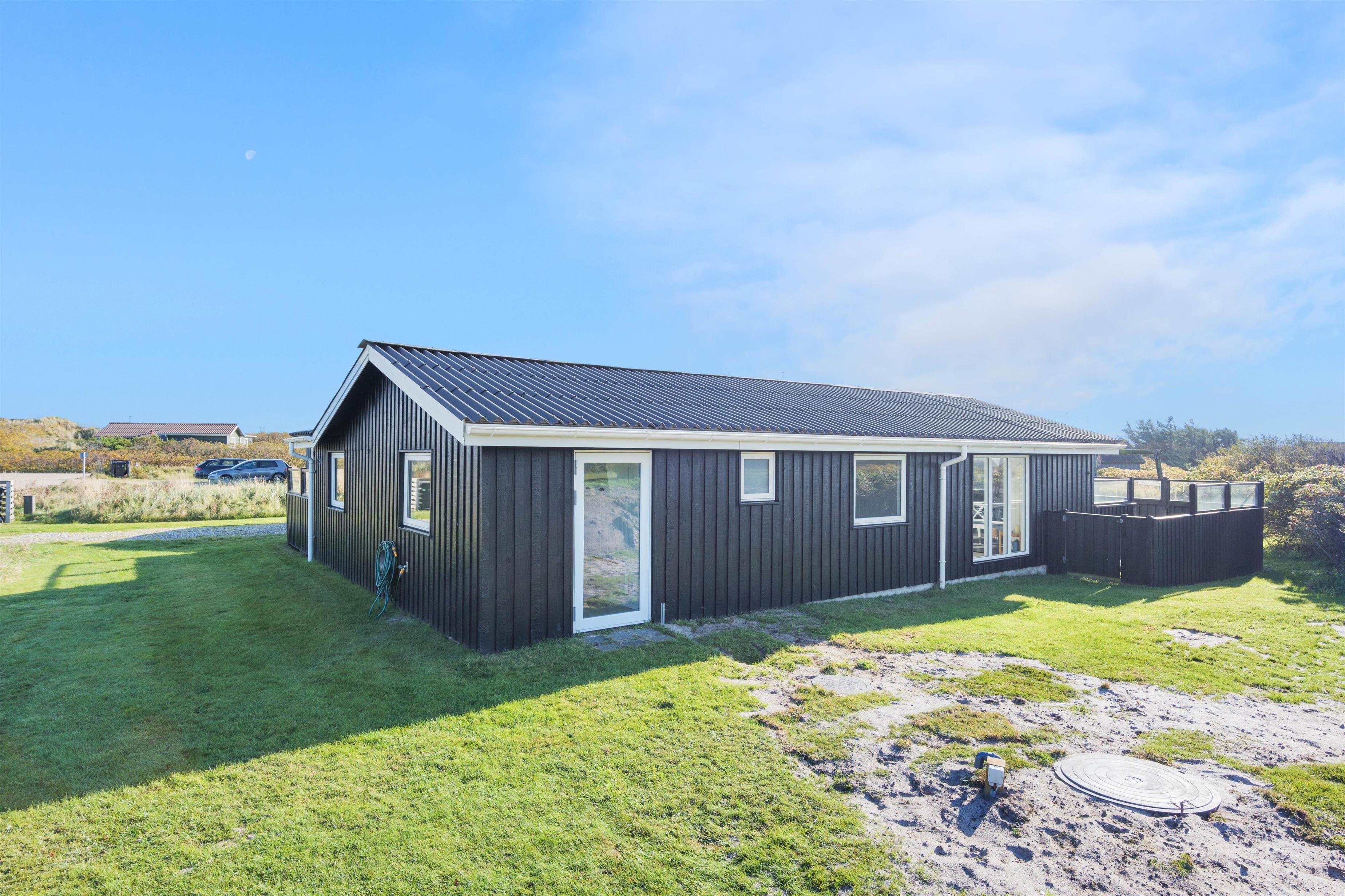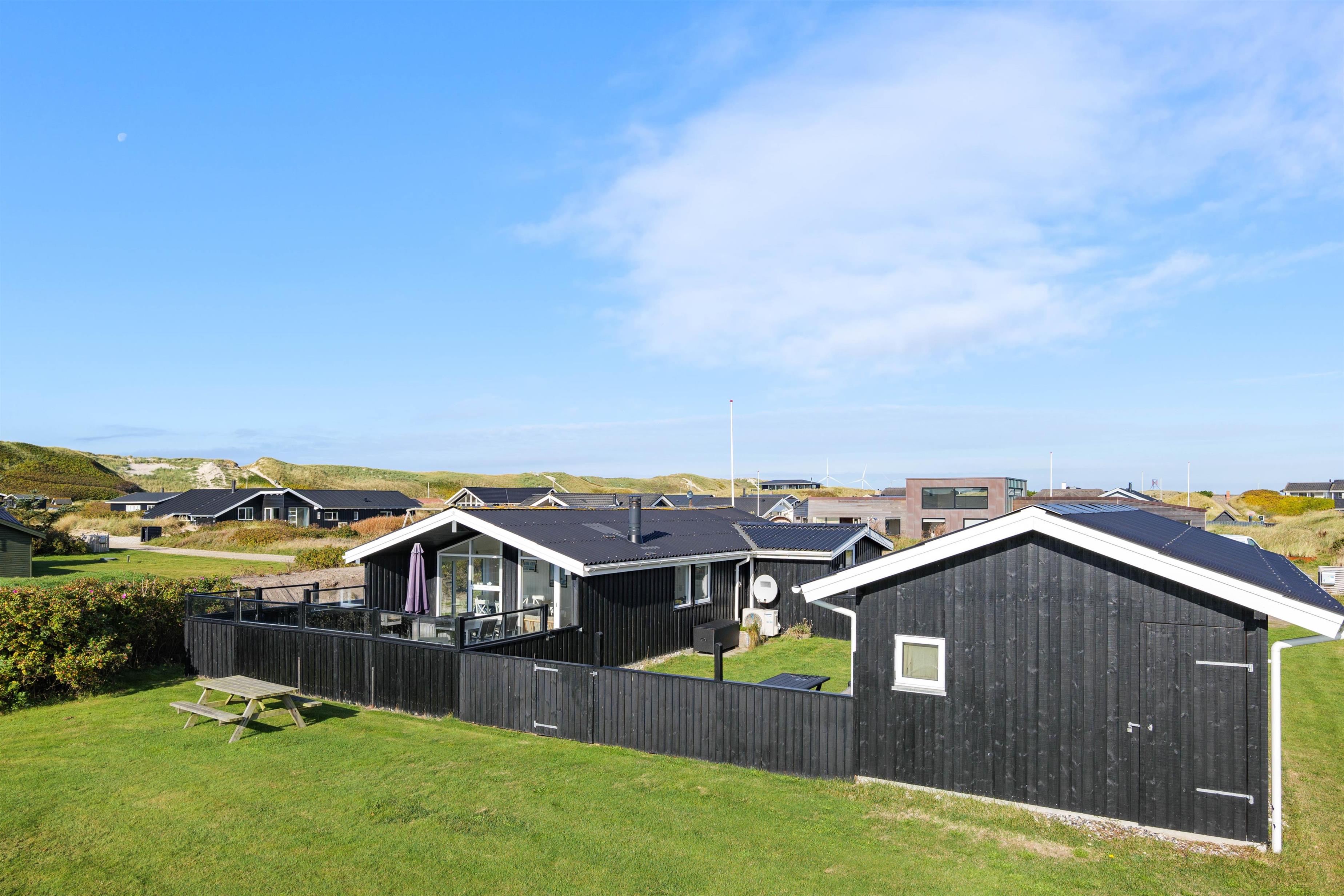 Sommerhuset har en rigtig god, lukket terrasse, hvor du kan sidde med din avis og kaffe i timevis. Her er der ingen dagsorden eller stress. Her kan du trække stikket ud for en stund og nyde omgivelserne og ferien, mens hunden nyder den lille gård eller den store græsplæne. Til terrassen hører gode havemøbler, liggestole og gynge. En veltilberedt middag, tilberedt på gasgrillen og en aftendrink, med solnedgangen over klitterne og havets beroligende brusen i baggrunden, må være den ultimative afslapning.
