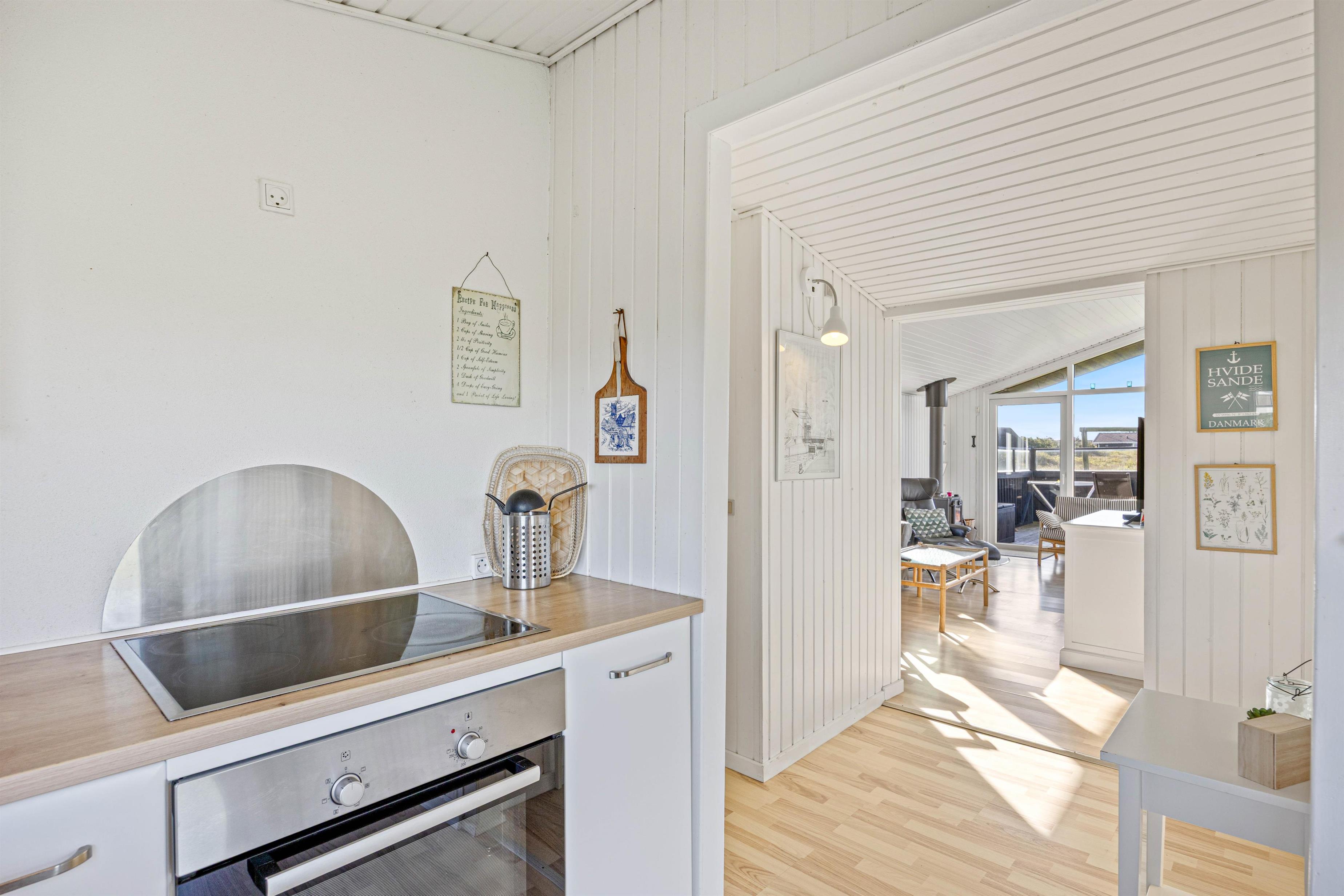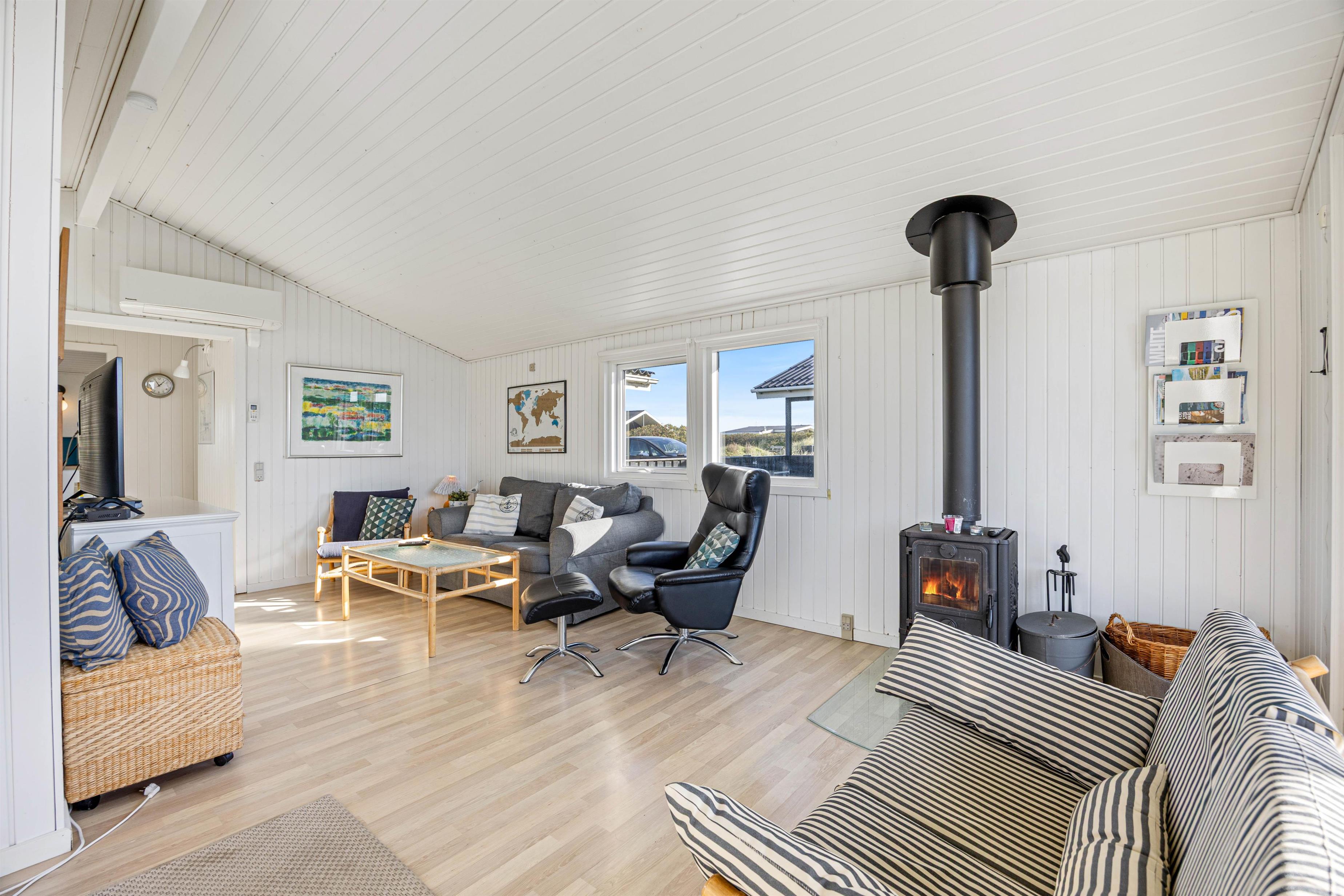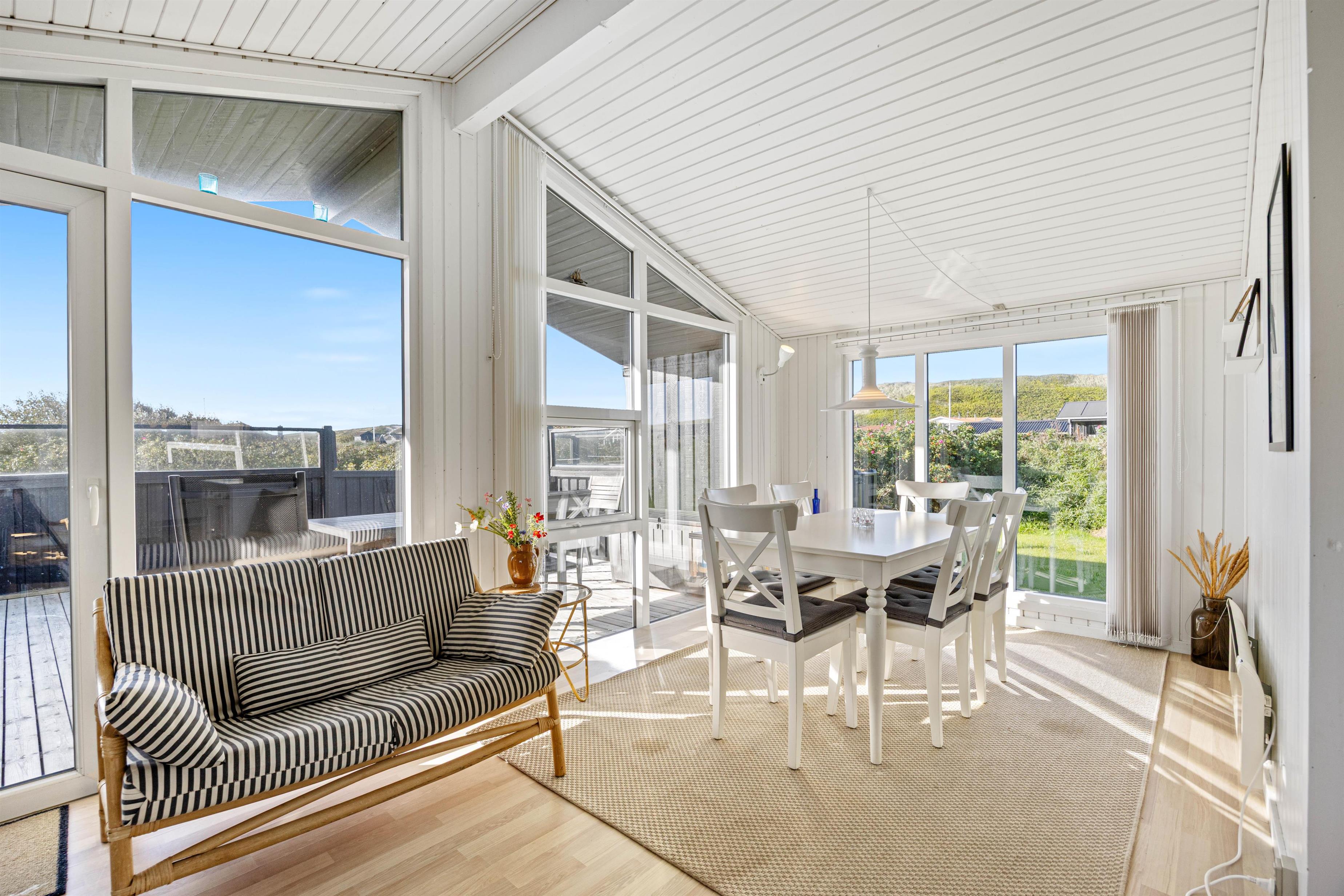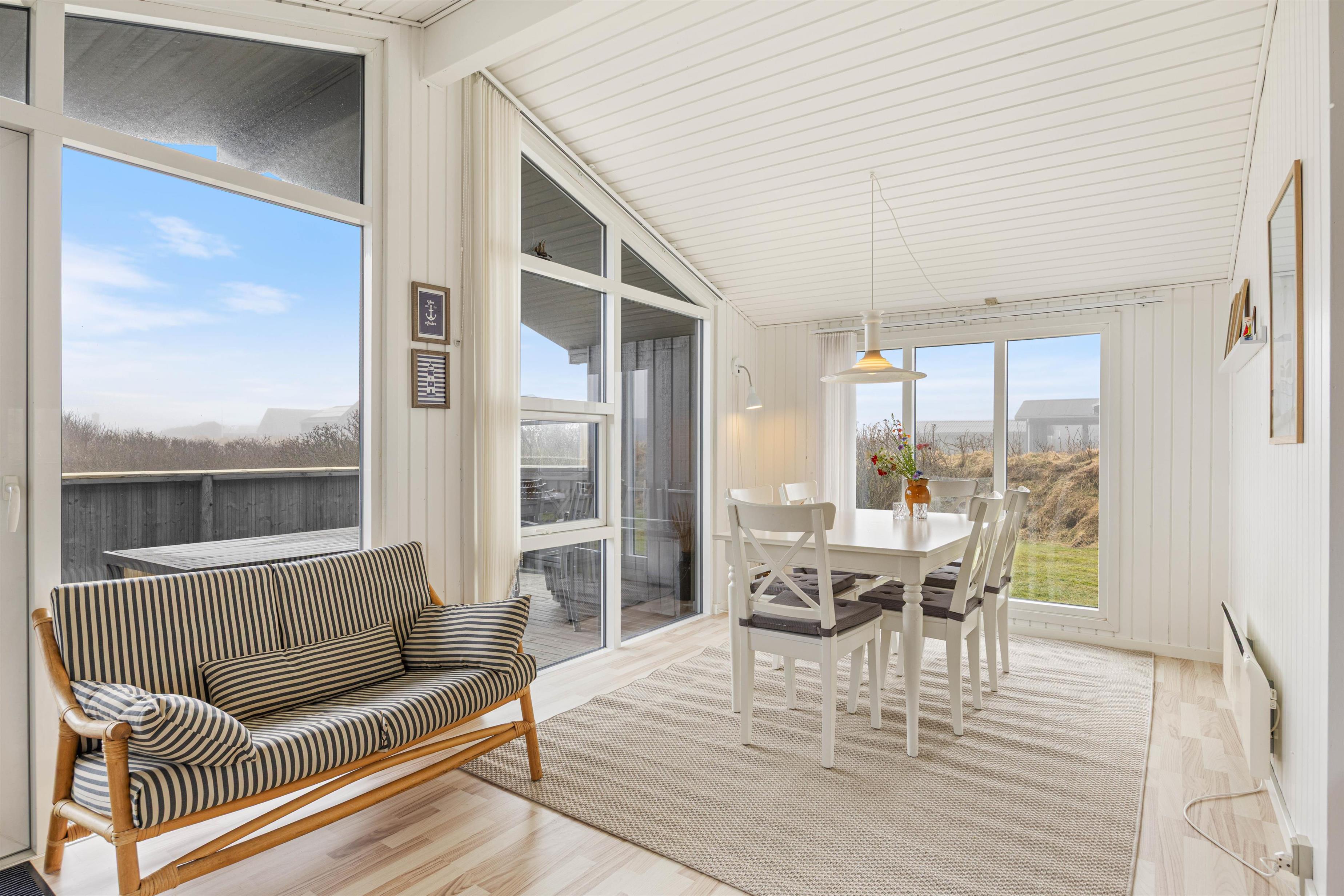 Træsommerhuset er opført i tradionel sommerhusstil med sortmalet træ og hvide vinduesrammer. Den enkle arkitektur smelter godt sammen med klitlandskabet. Indvendigt er huset holdt i lyse, neutale farvenuancer. Vægge og lofter i både opholdsrum og værelse er malet hvide, hvilket skaber en rar og imødekommende atmosfære i rummene. Spisepladsen er placeret ved det store glasparti, der også fører ud mod terrassen og den smukke klitudsigt. Den nære kontakt mellem husets inde- og ude-zoner og den omgivende natur opleves gennem det store vinduesparti. Du får dermed en følelse af at være i kontakt med naturen, selvom du sidder inde.