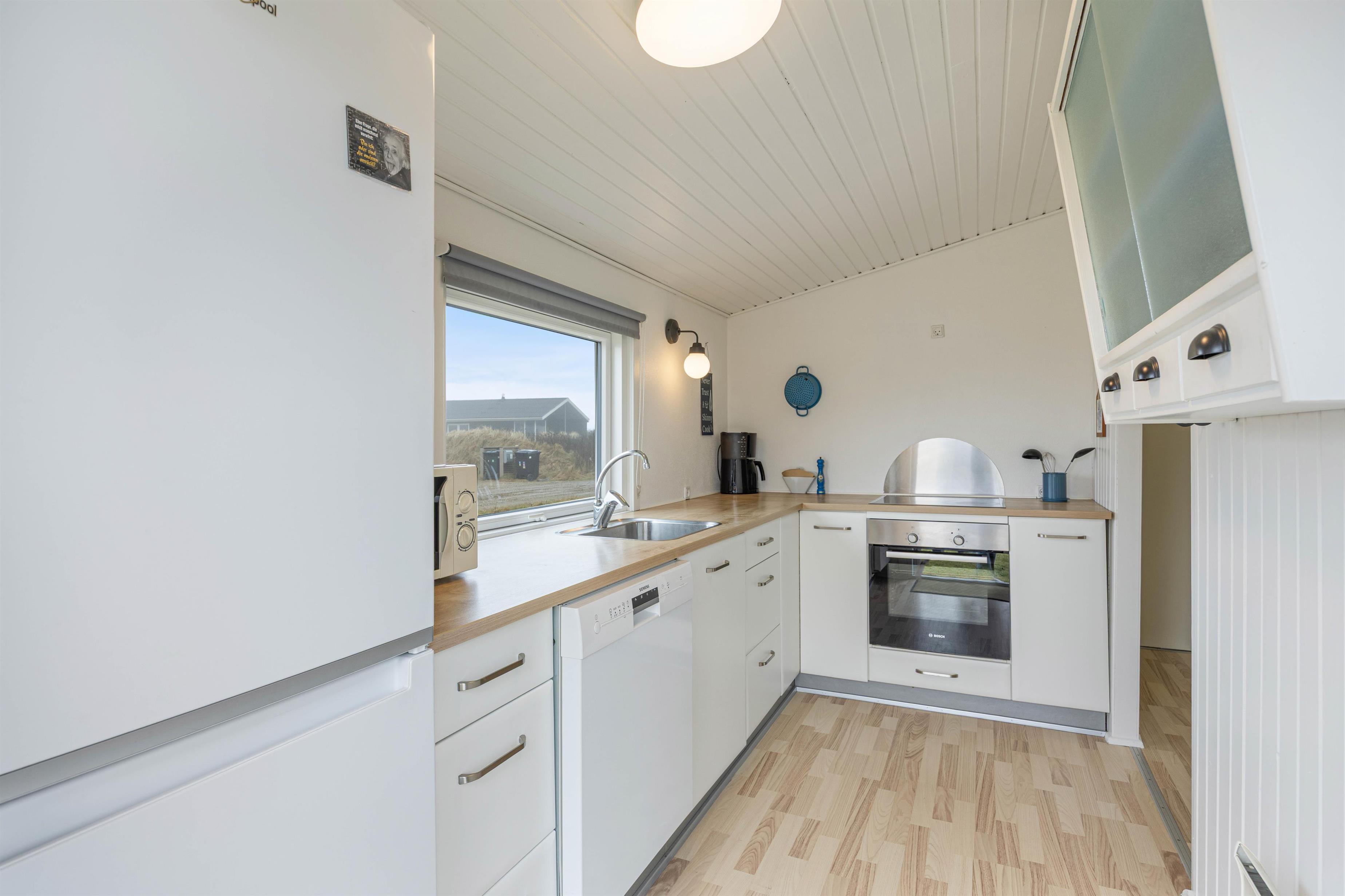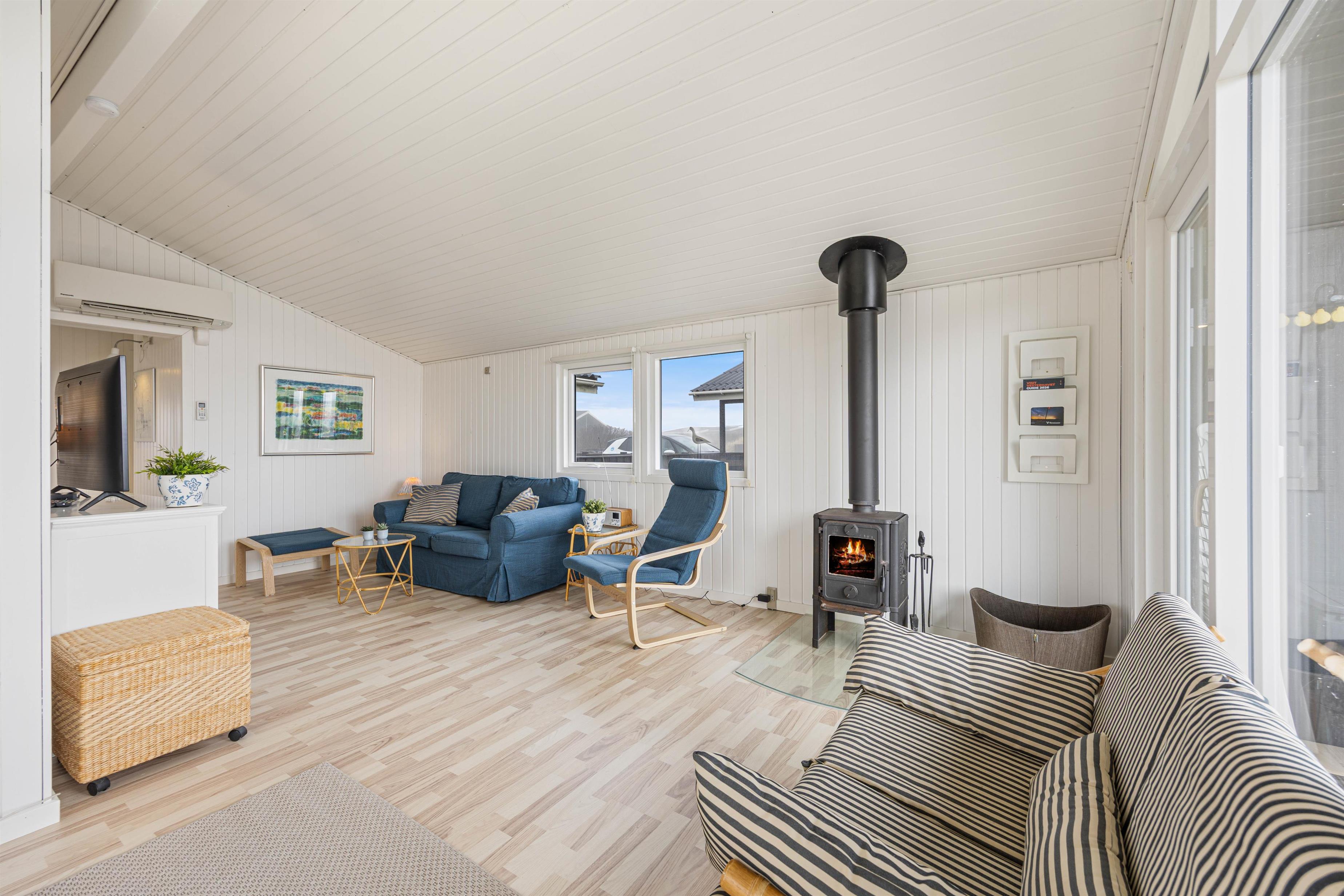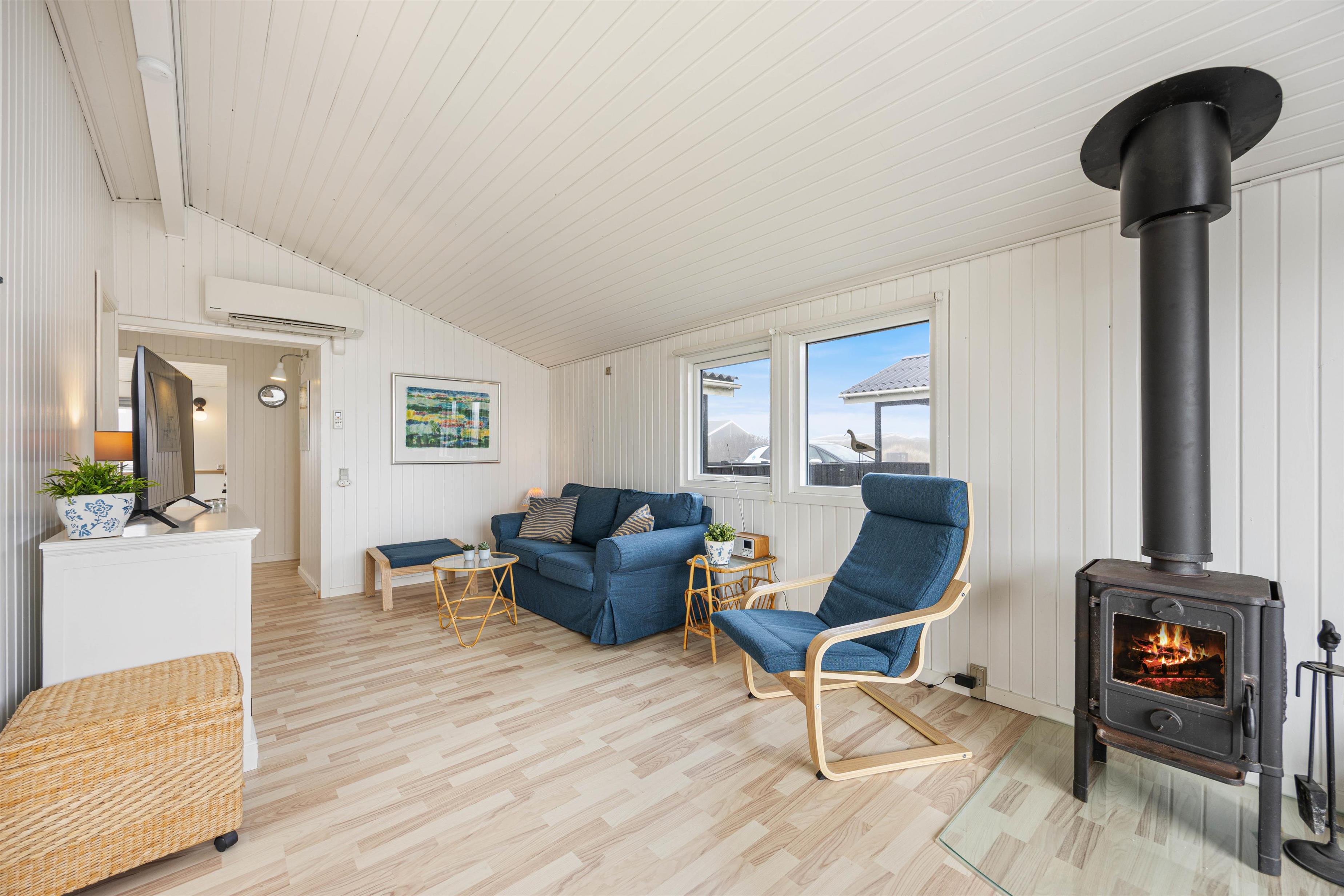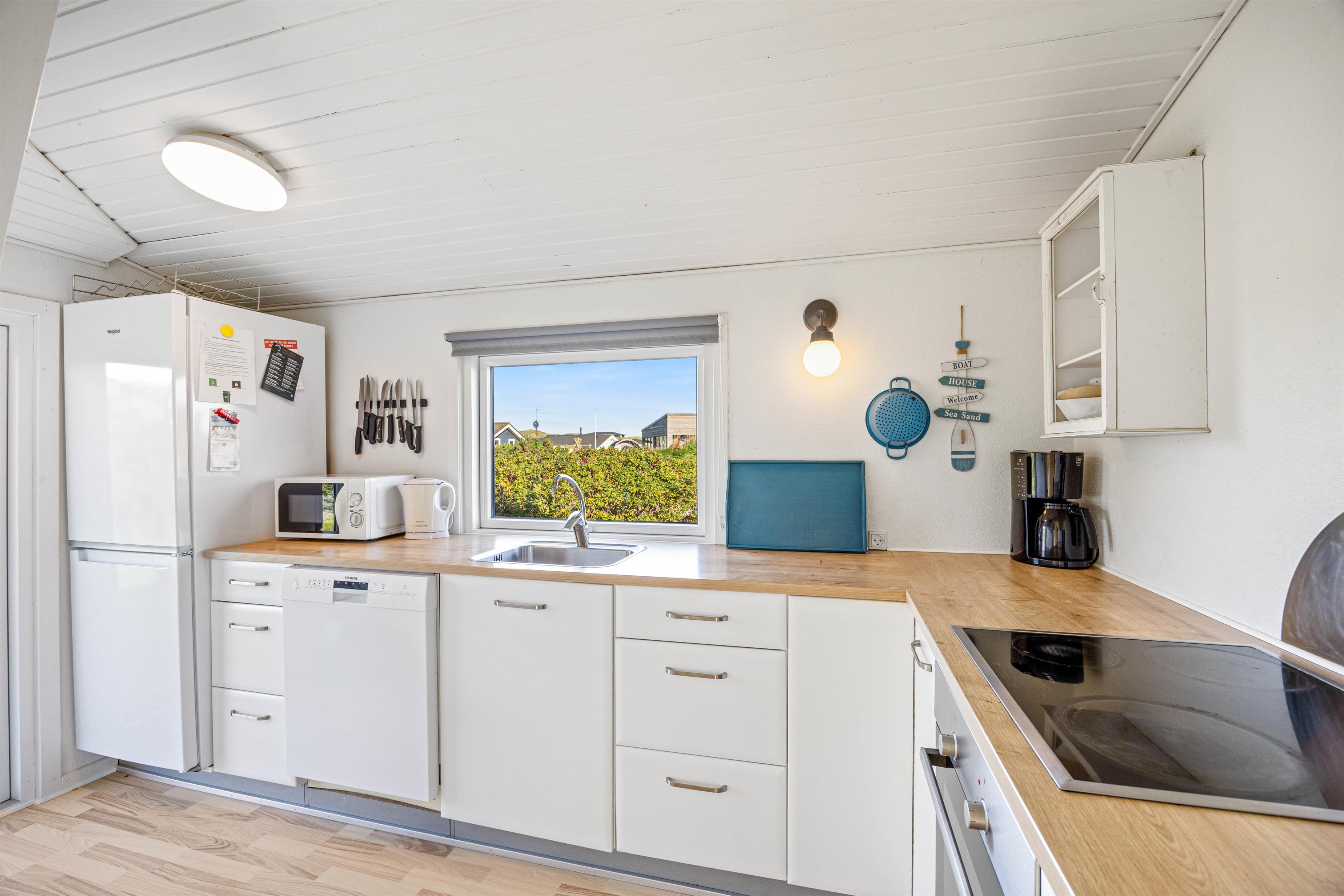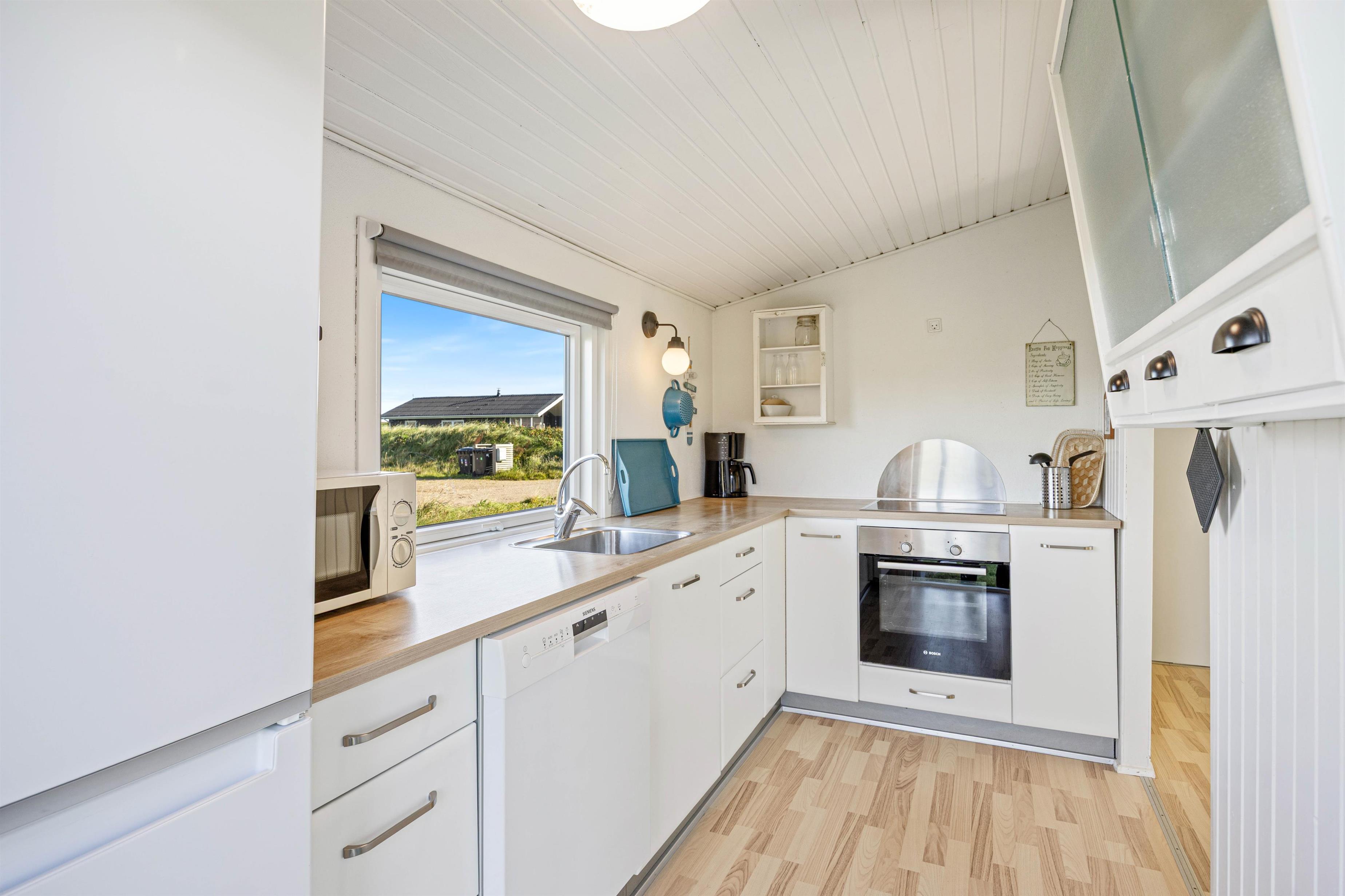 Træsommerhuset er opført i tradionel sommerhusstil med sortmalet træ og hvide vinduesrammer. Den enkle arkitektur smelter godt sammen med klitlandskabet. Indvendigt er huset holdt i lyse, neutale farvenuancer. Vægge og lofter i både opholdsrum og værelse er malet hvide, hvilket skaber en rar og imødekommende atmosfære i rummene. Spisepladsen er placeret ved det store glasparti, der også fører ud mod terrassen og den smukke klitudsigt. Den nære kontakt mellem husets inde- og ude-zoner og den omgivende natur opleves gennem det store vinduesparti. Du får dermed en følelse af at være i kontakt med naturen, selvom du sidder inde.