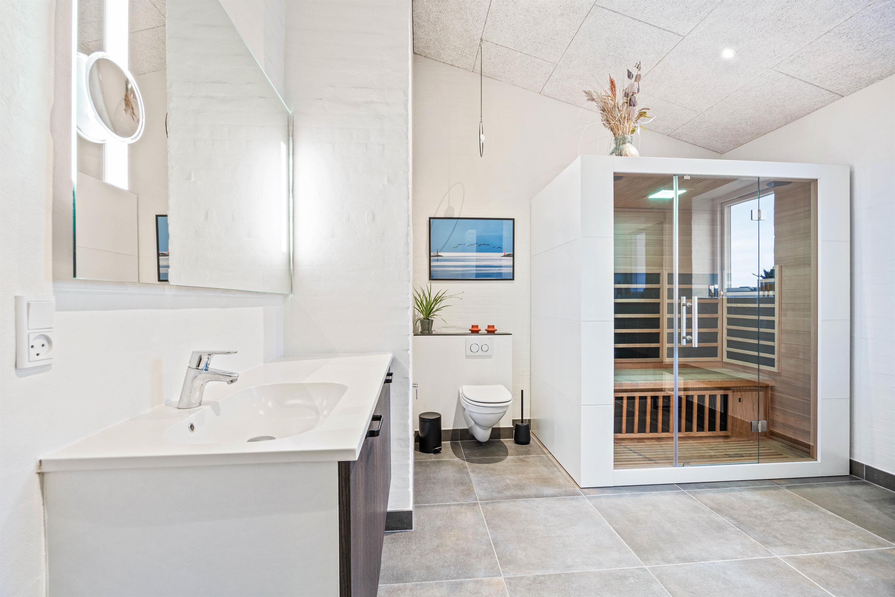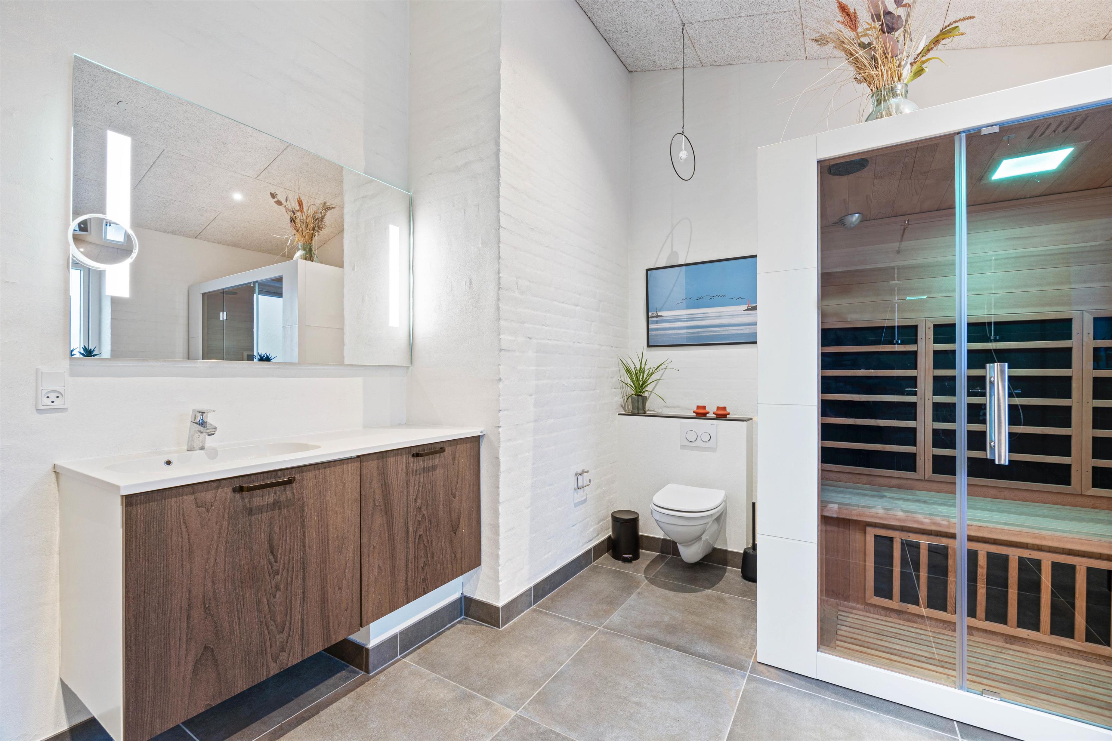 Badeværelserne er flotte og praktisk indrettede. Det største har, udover en lækker dobbeltbruser, også infrarød sauna, hvor man kan slappe af efter en lang dag i klitterne.
