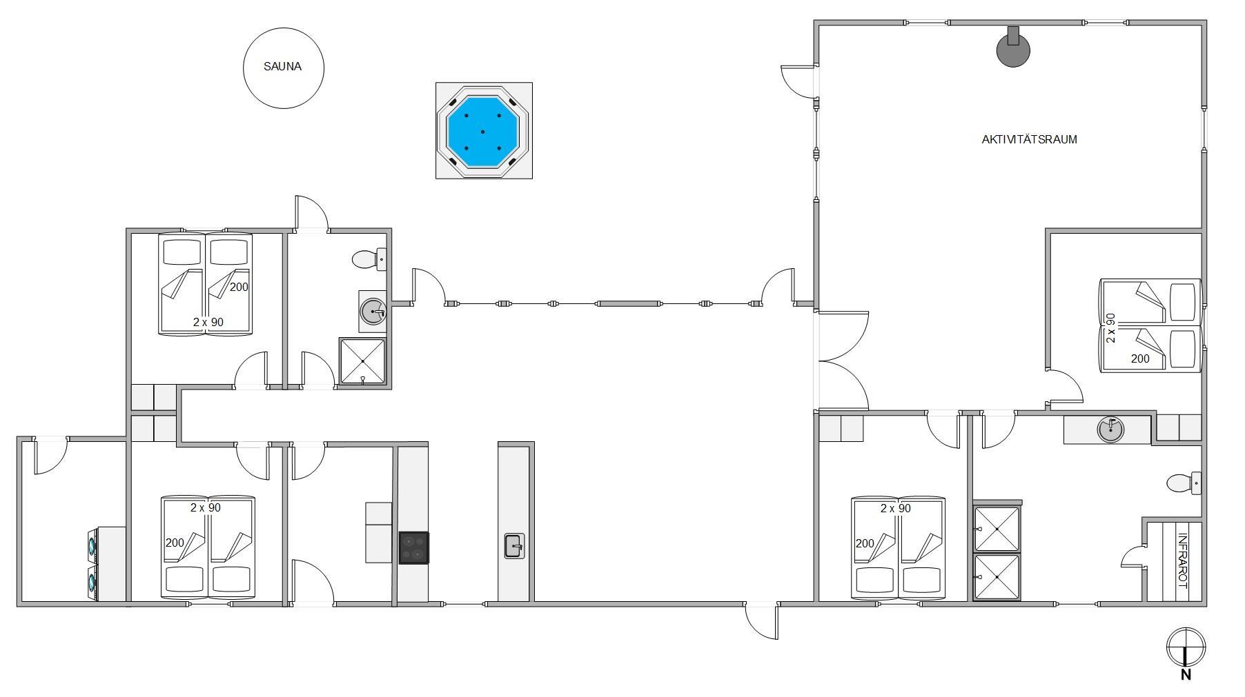 Feriehuset har 4 værelser og 2 badeværelser og kan derfor nemt opdeles i to afdelinger på hver sin side af opholdsrummet.