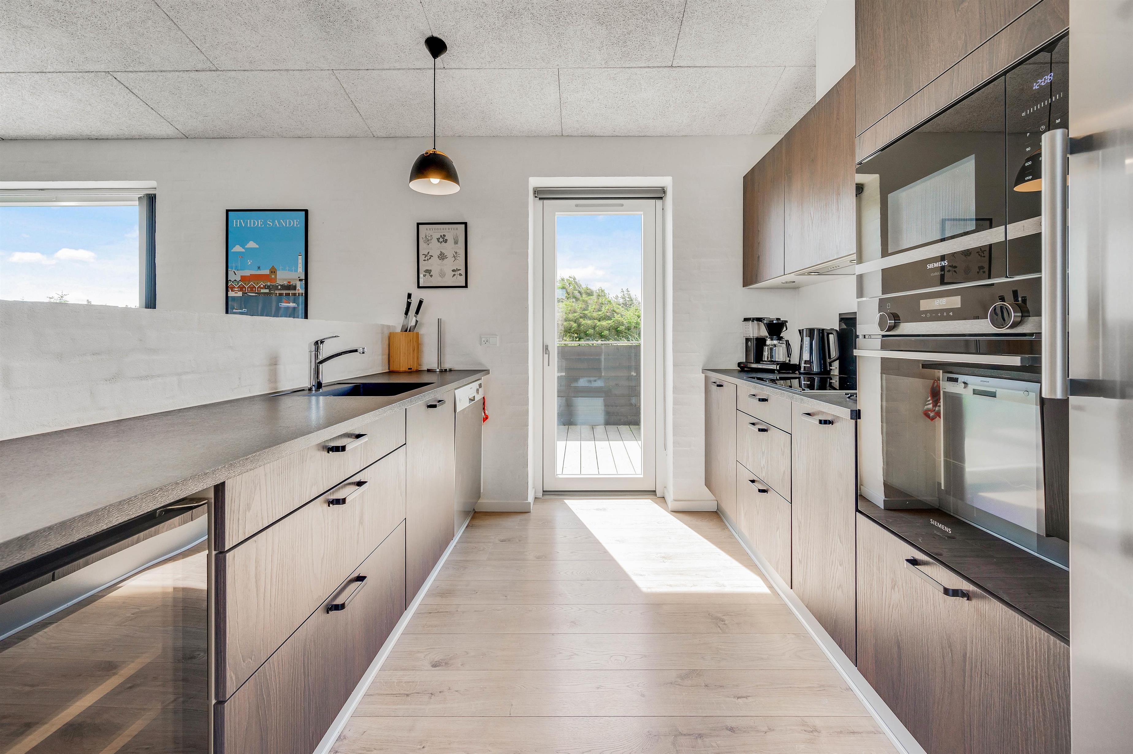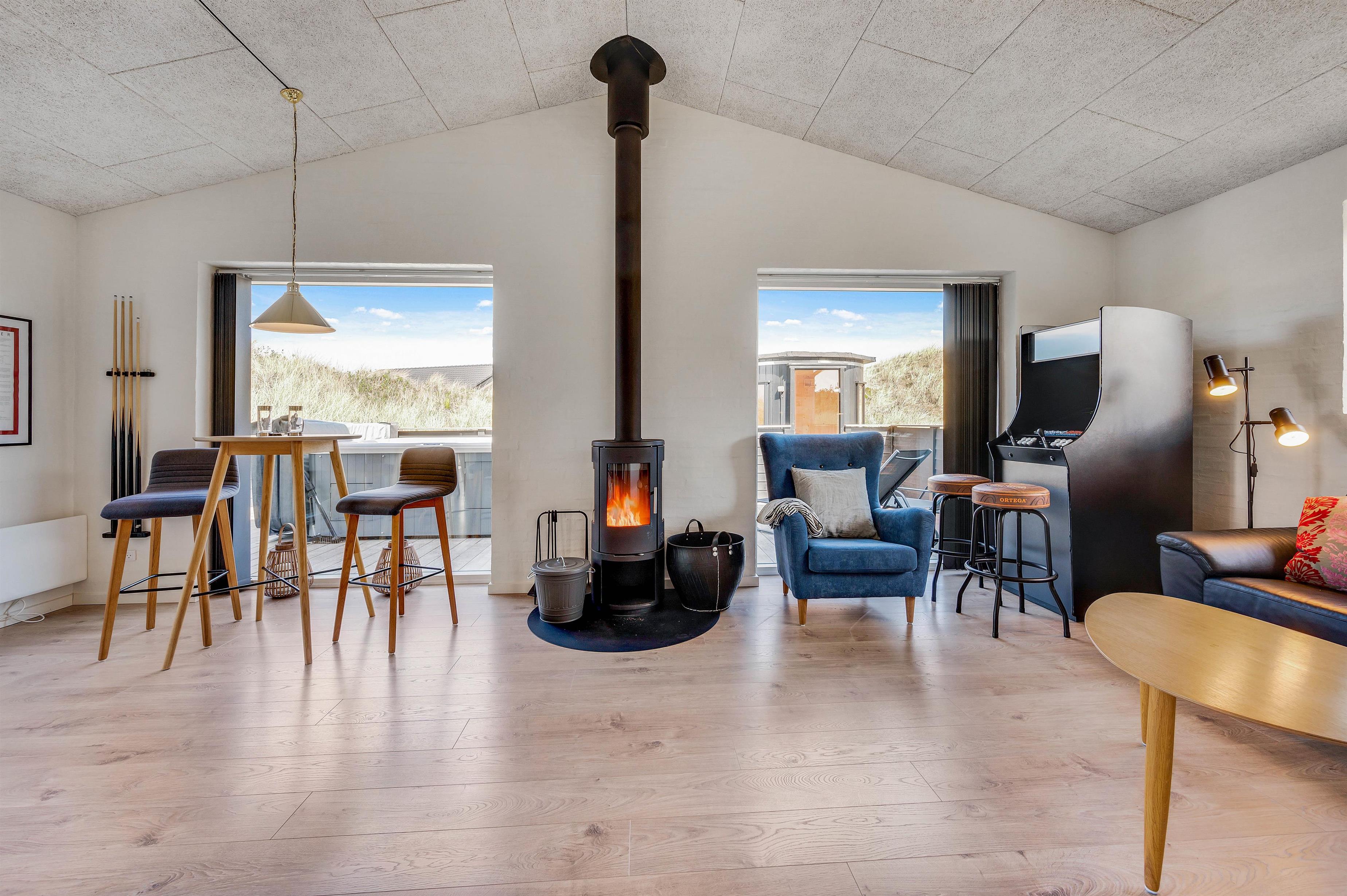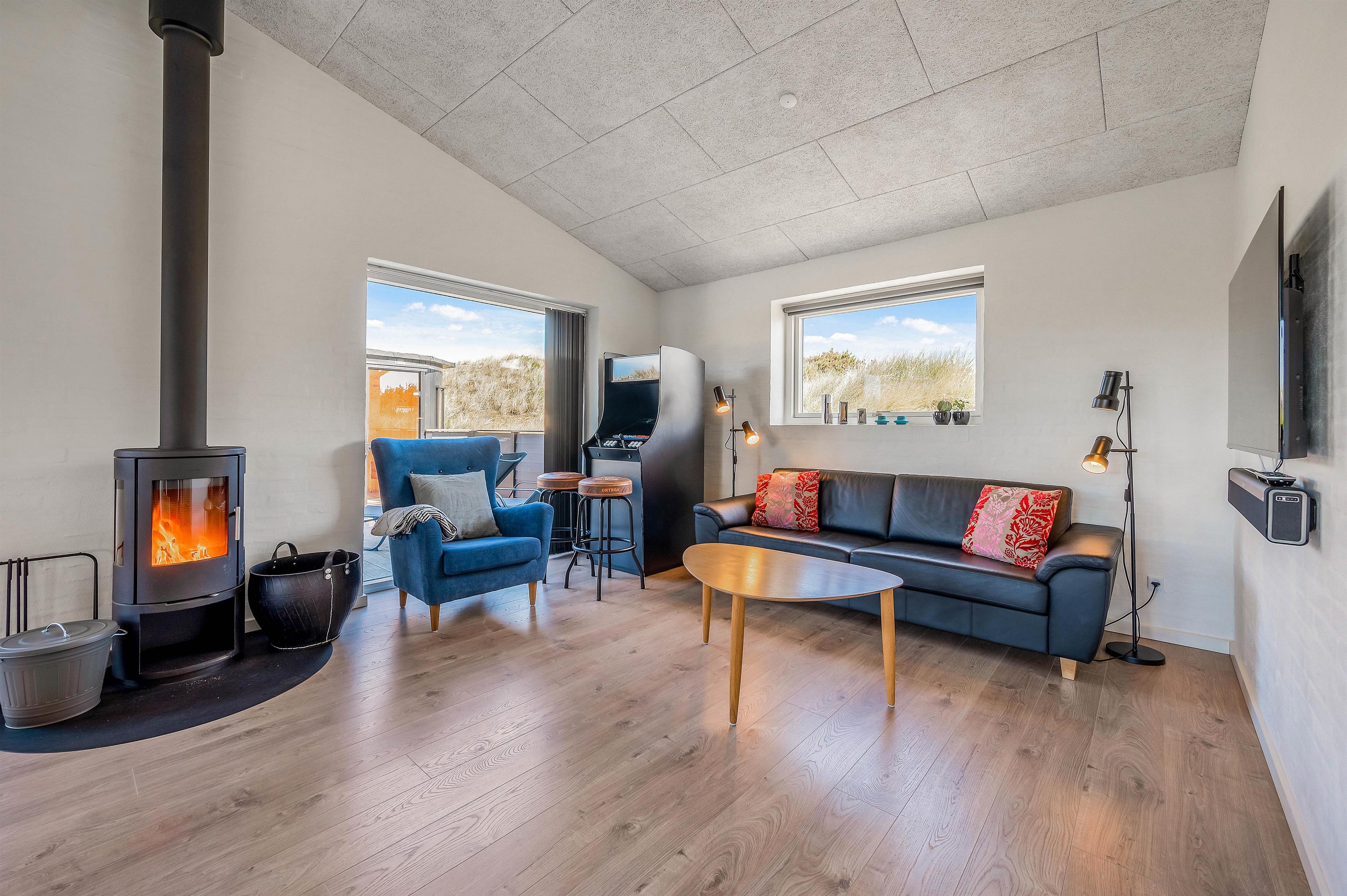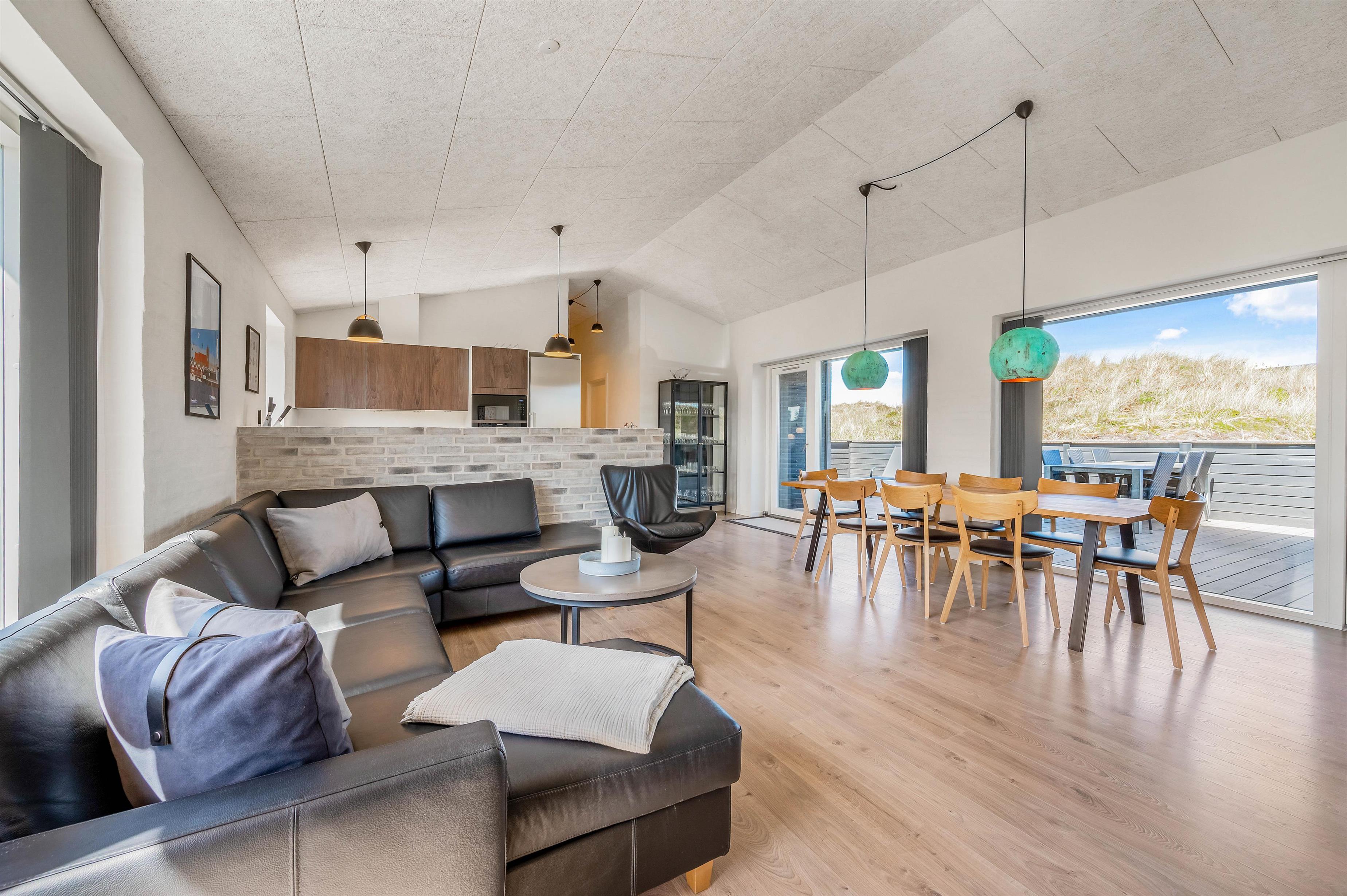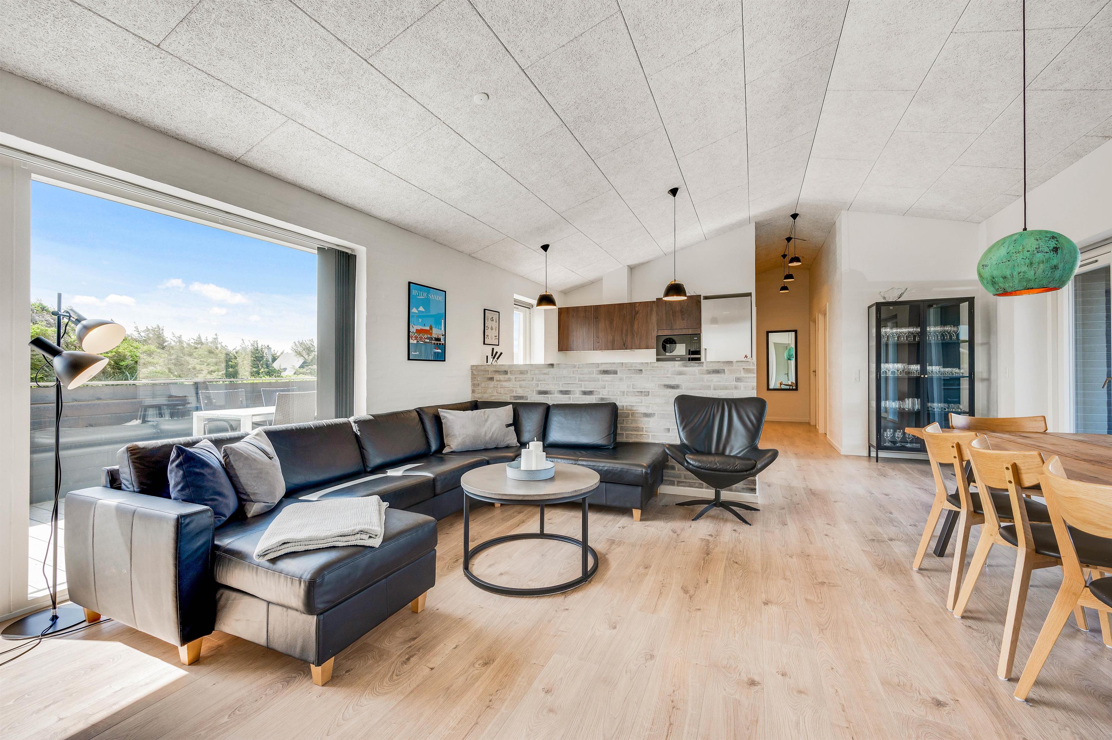 Hjertet i huset er det flotte opholdsrum med stue, spiseplads og køkken. – Køkkenafdelingen er veludrustet og har alt, hvad der skal til for at gøre husarbejdet let for jer under ferien. Fra spisepladsen har I et godt view udover sommerhusområdet og det flotte klitlandskab.