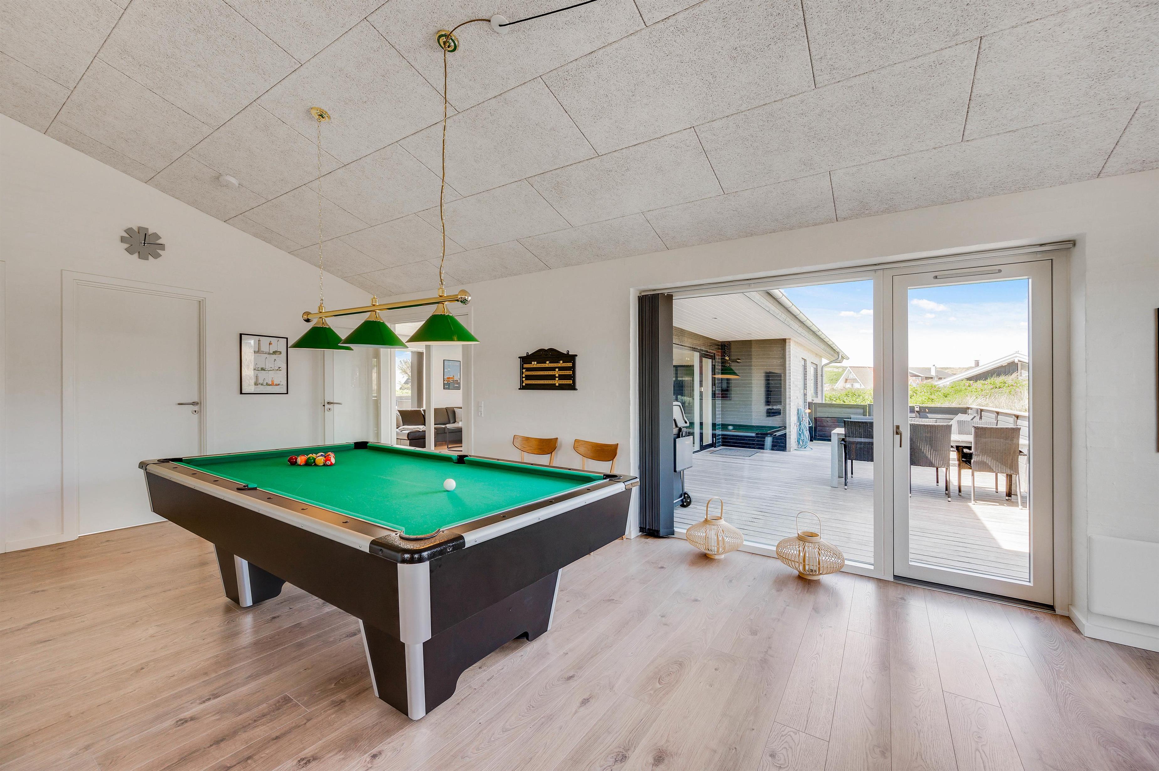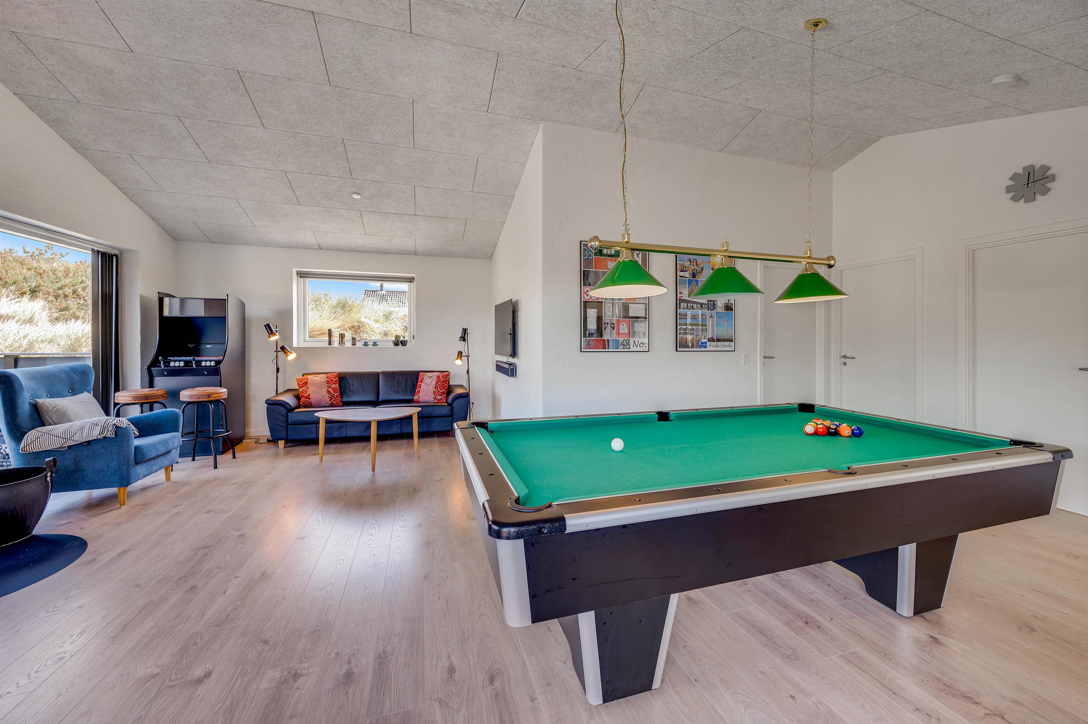Hvis vejret ikke er til udendørsaktiviteter, kan I hygge jer i det store aktivitetsrum, hvor I finder et billardbord og sofahjørne, hvor I kan nyde varm kakao og kortspil foran den knitrende ild i brændeovnen.