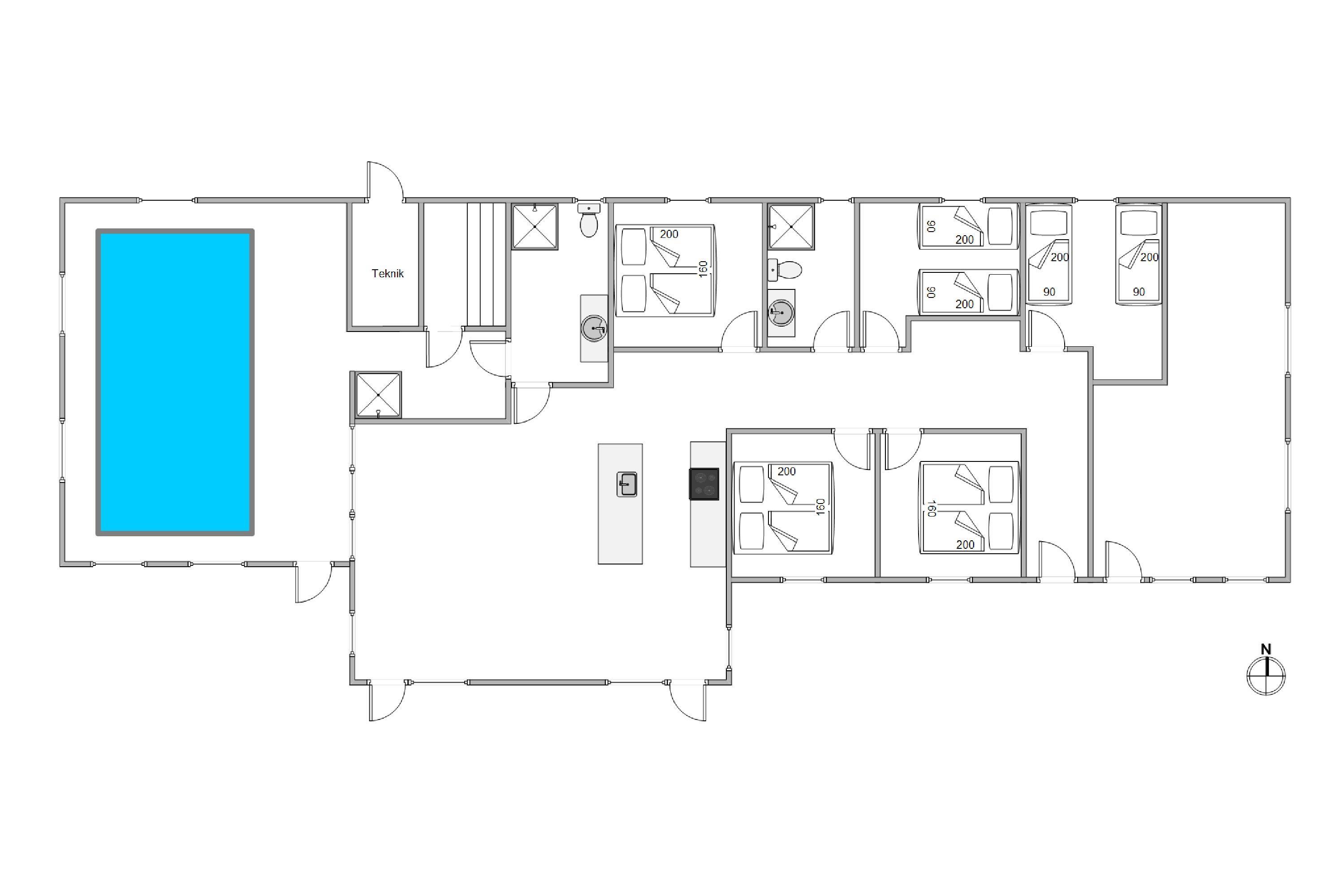 Sommerhuset rummer hele fem soveværelser, de tre af dem med behagelige dobbeltsenge 160 x 200. De fire enkeltsenge er 90 cm brede.