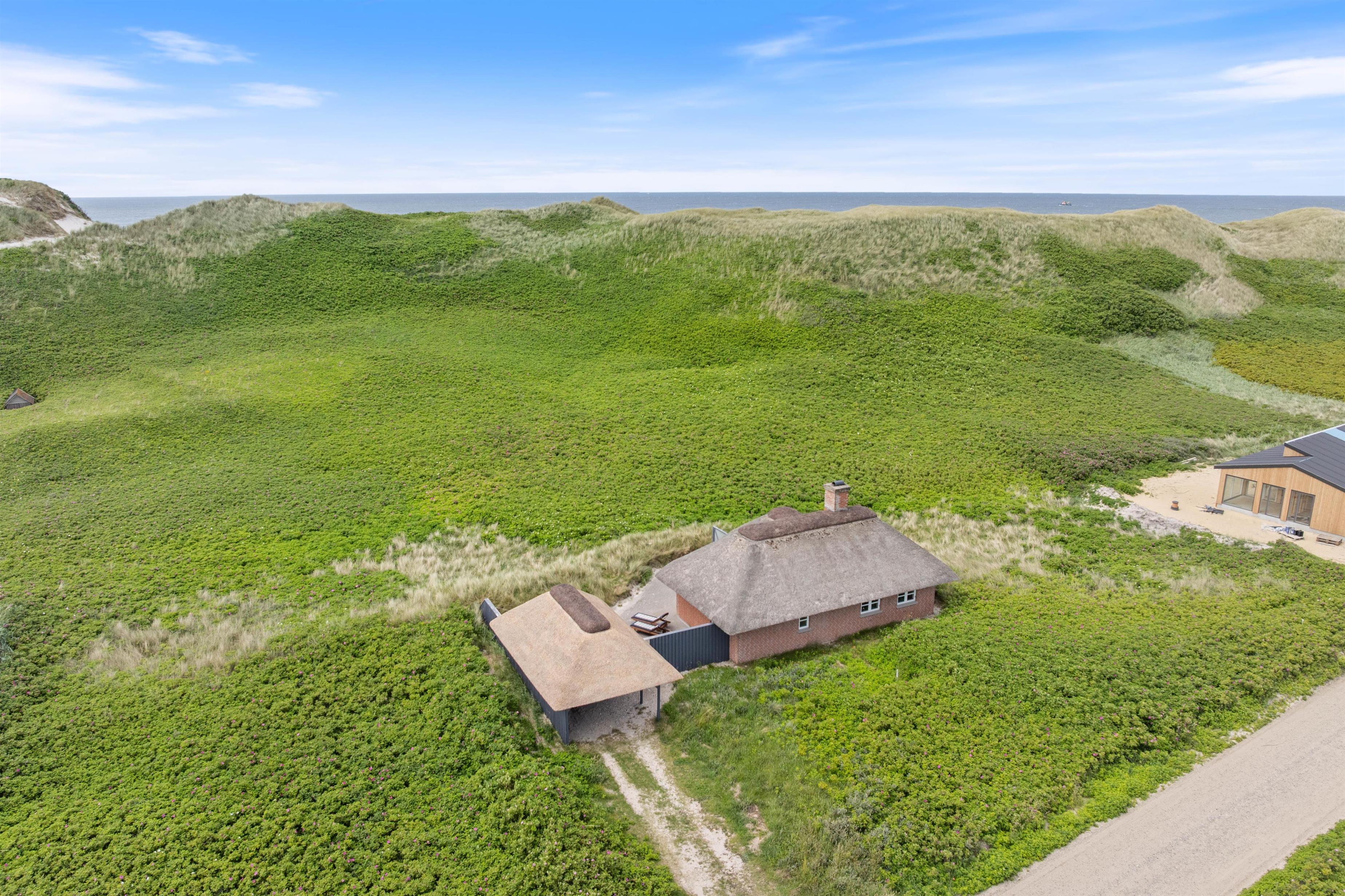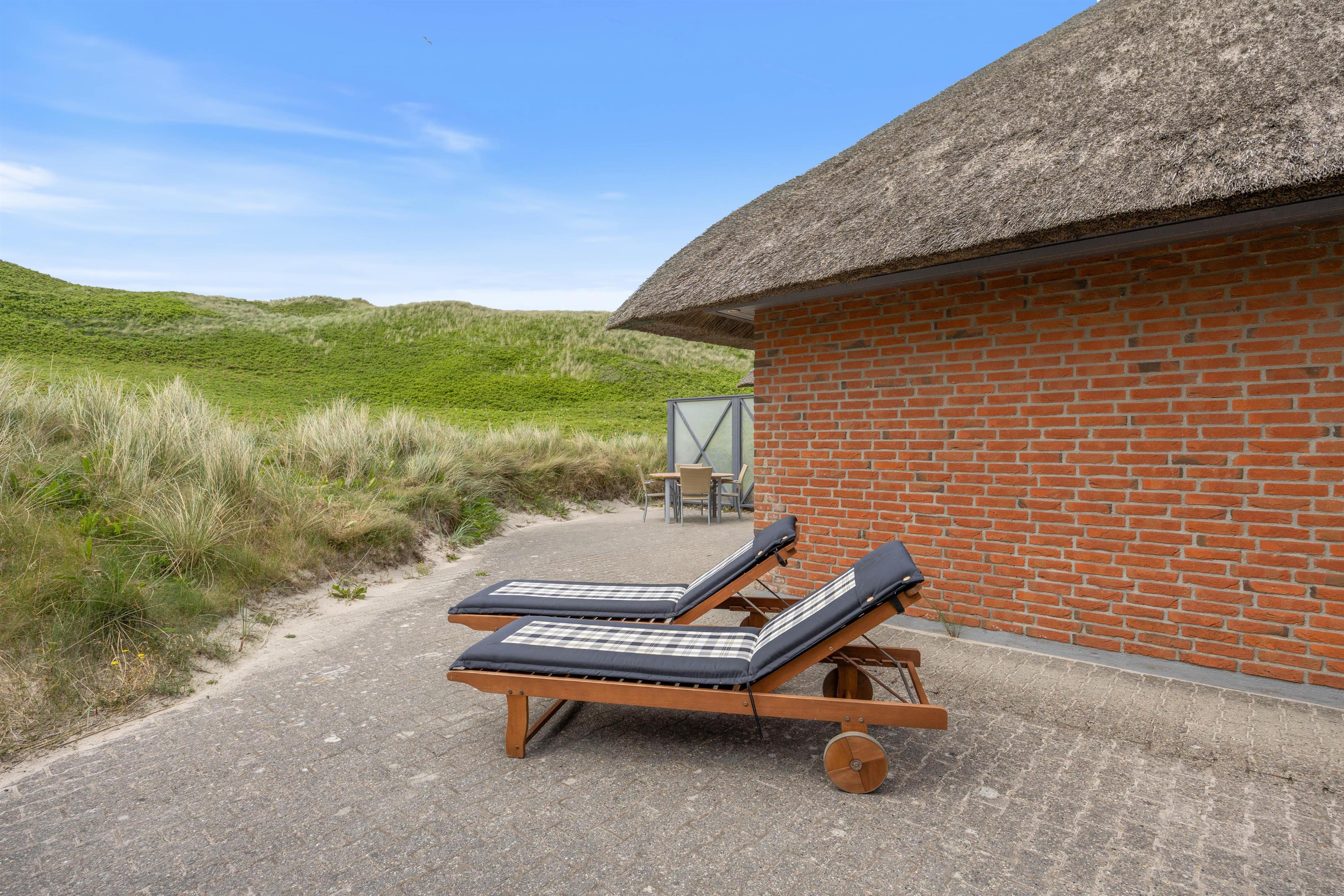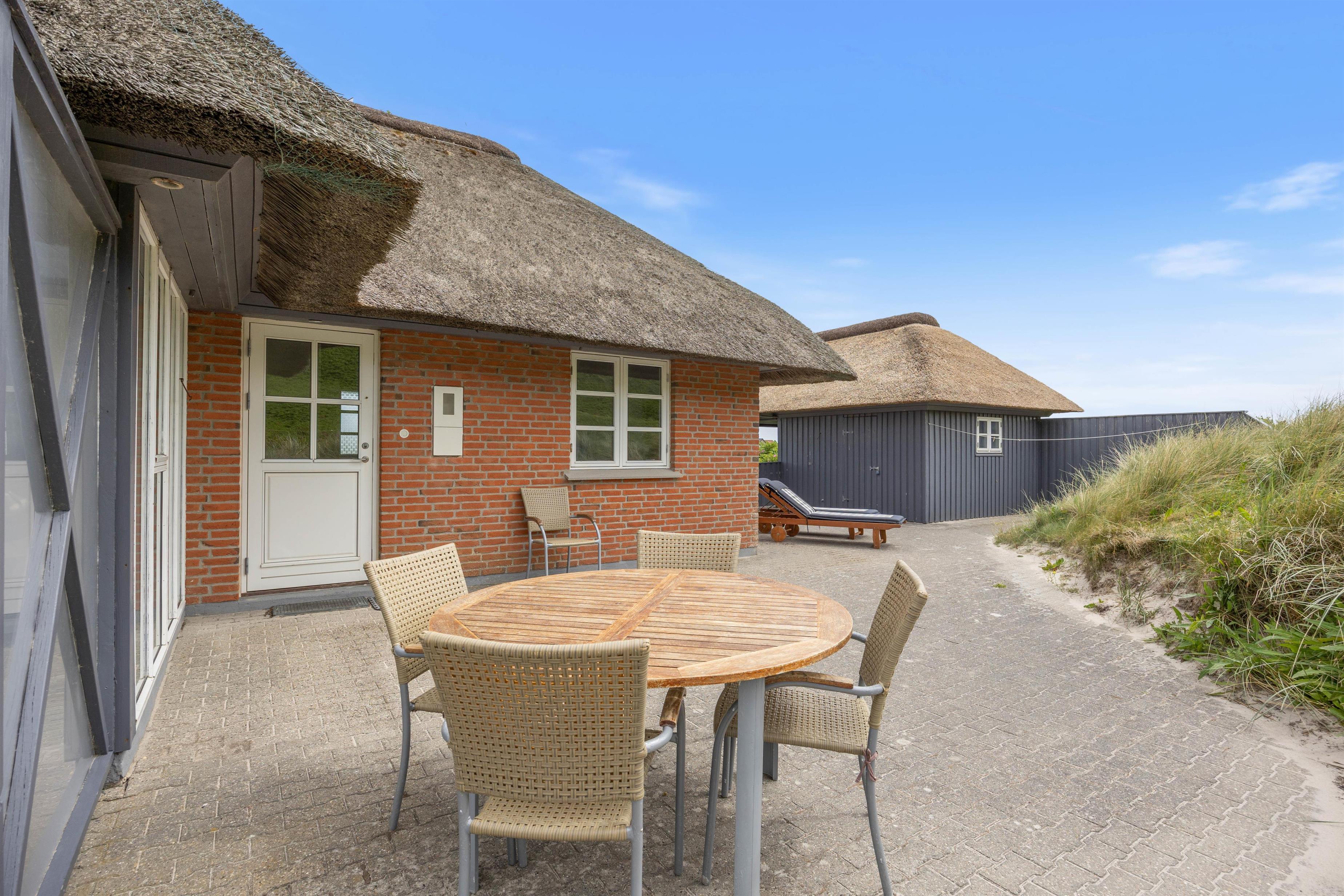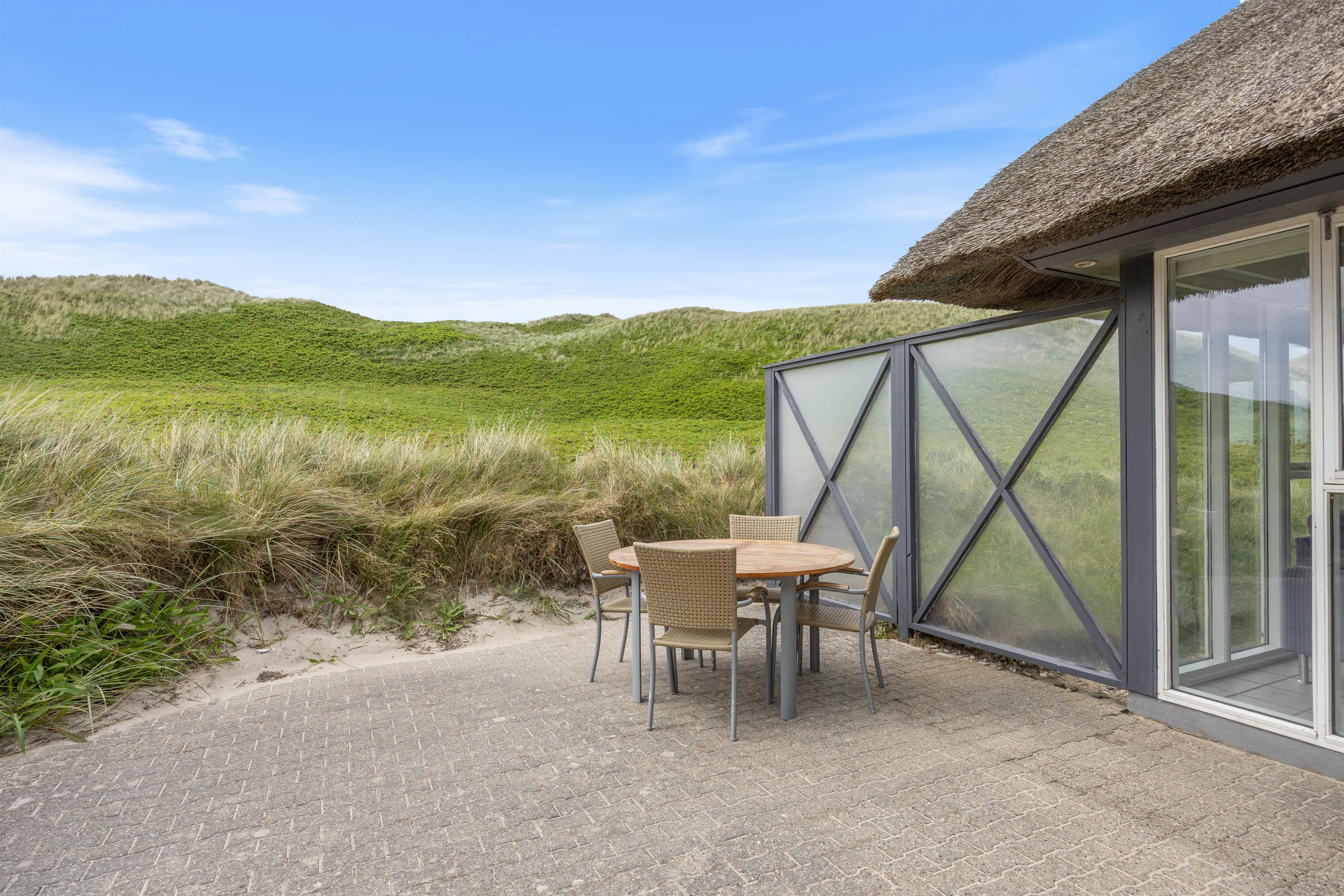 Udenfor venter en skøn naturgrund, hvor I kan nyde den friske vesterhavsluft på terrassen. På den afskærmet og åbne terrasse kan I også grille og nyde måltiderne i solen eller i læ for vinden. Terrassen er det ideelle sted til afslappende stunder med en god kop kaffe eller et glas vin, mens I lytter til havets brusende lyde i baggrunden.