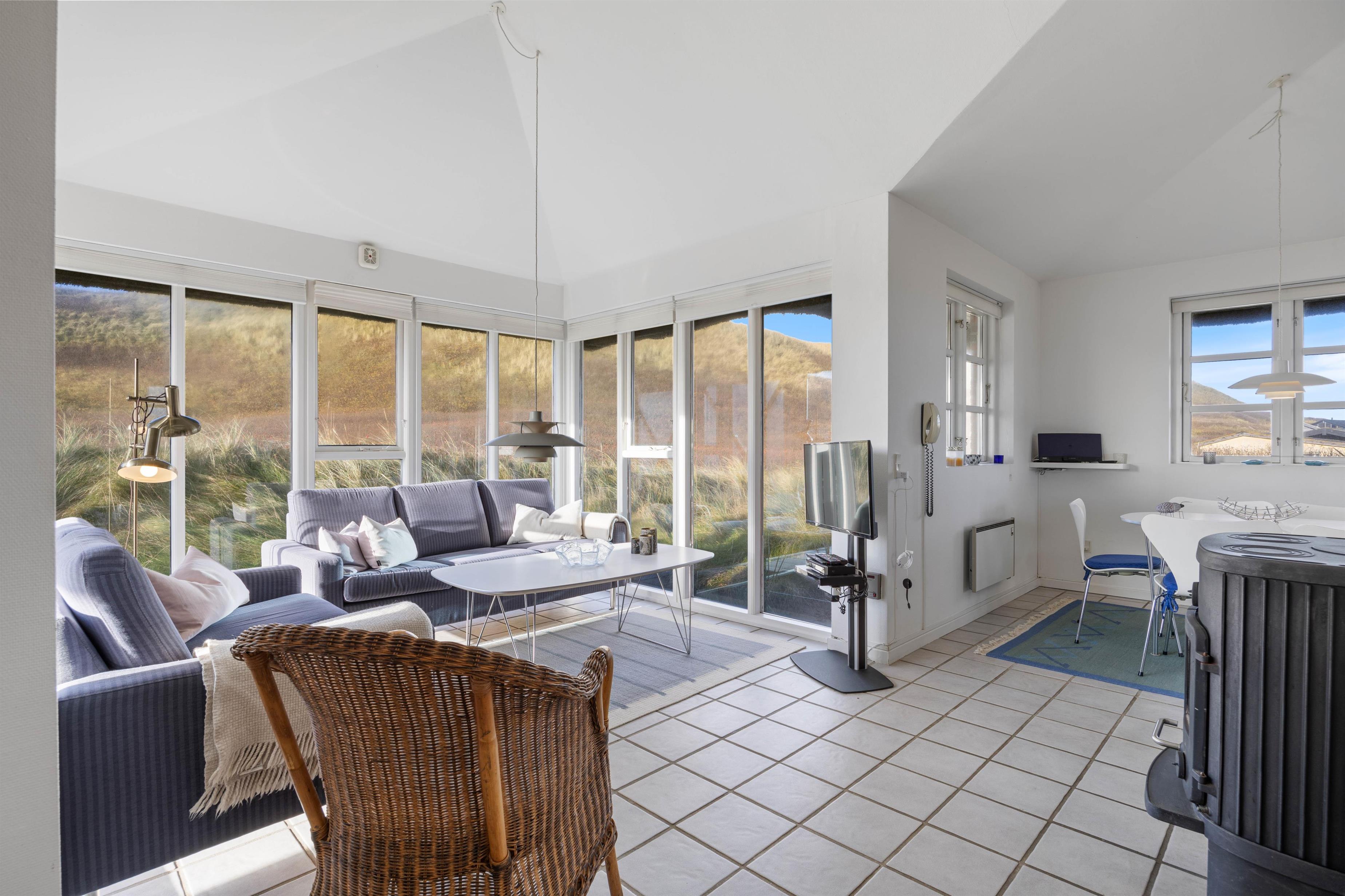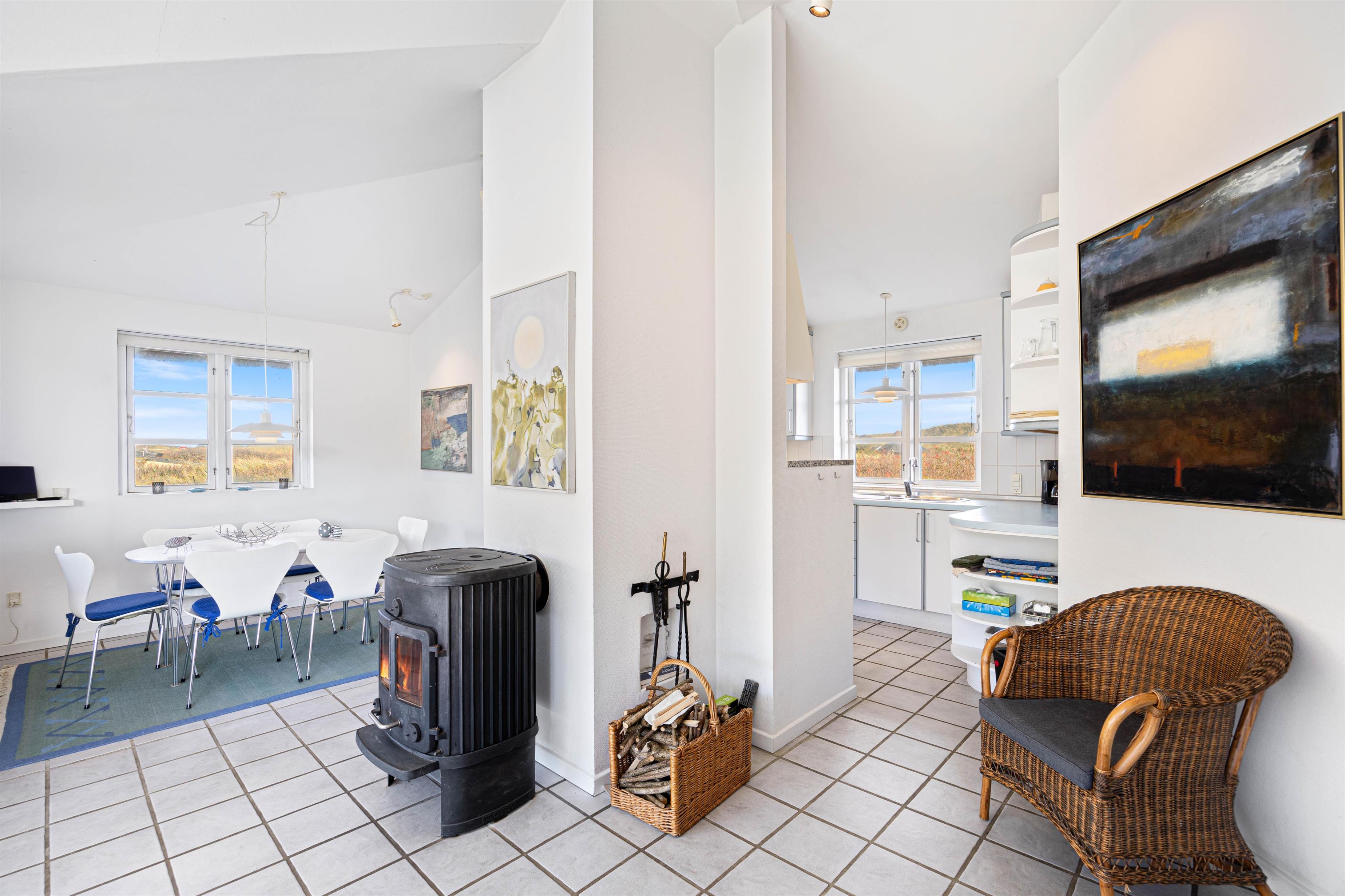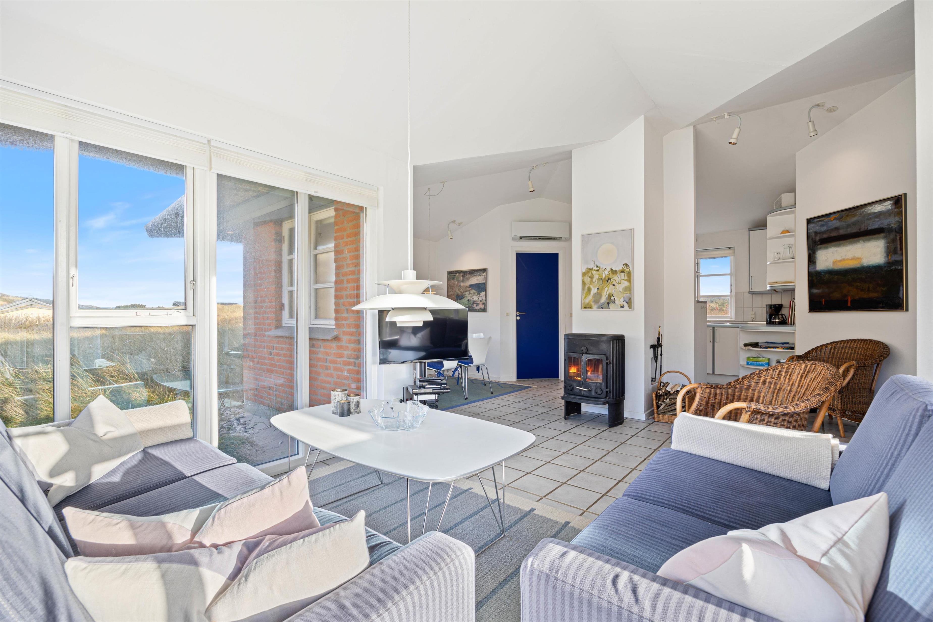 Den hyggelige stue er det perfekte samlingspunkt efter en god dag på stranden. Her kan I tænde op i brændeovnen og nyde varmen, mens I slapper af med en god bog eller film. Der er også en energibesparende luft-til-luft varmepumpe i sommerhuset, som vil sørge for en dejlig temperatur på de køligere dage.