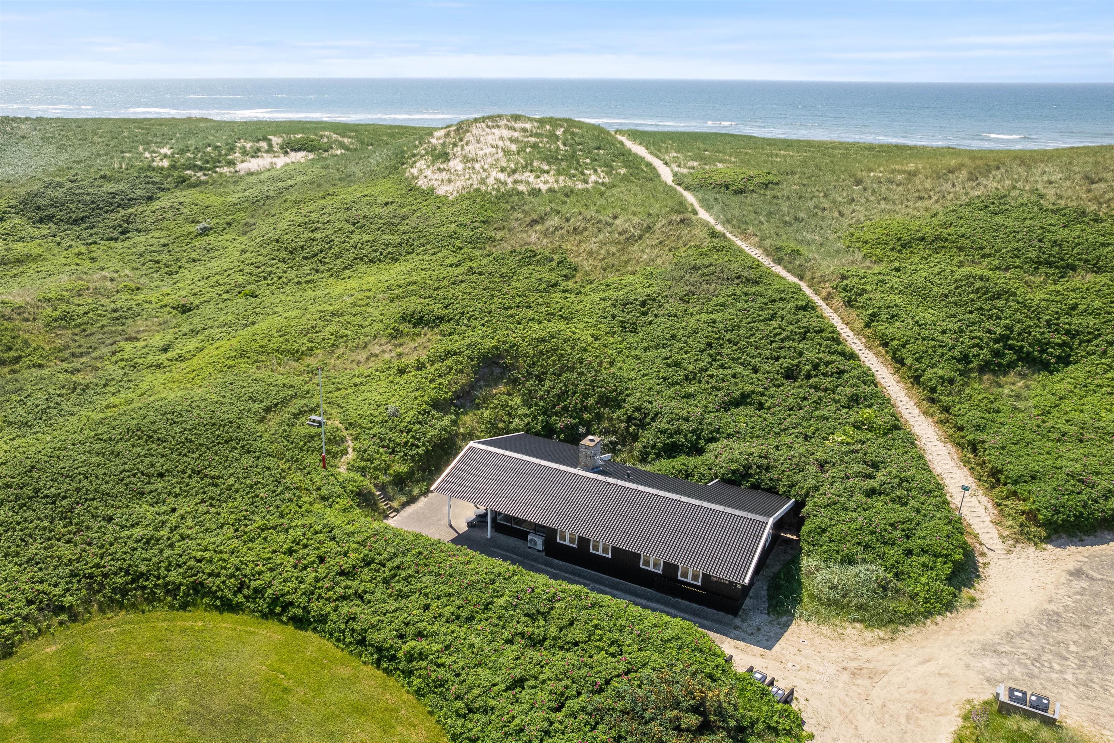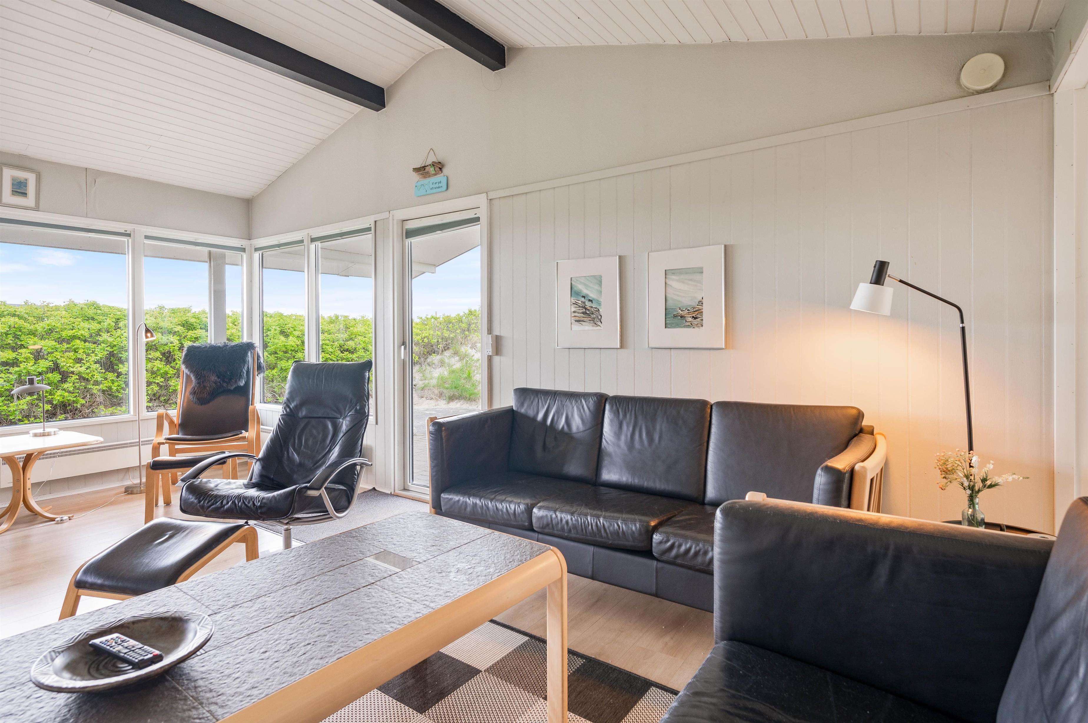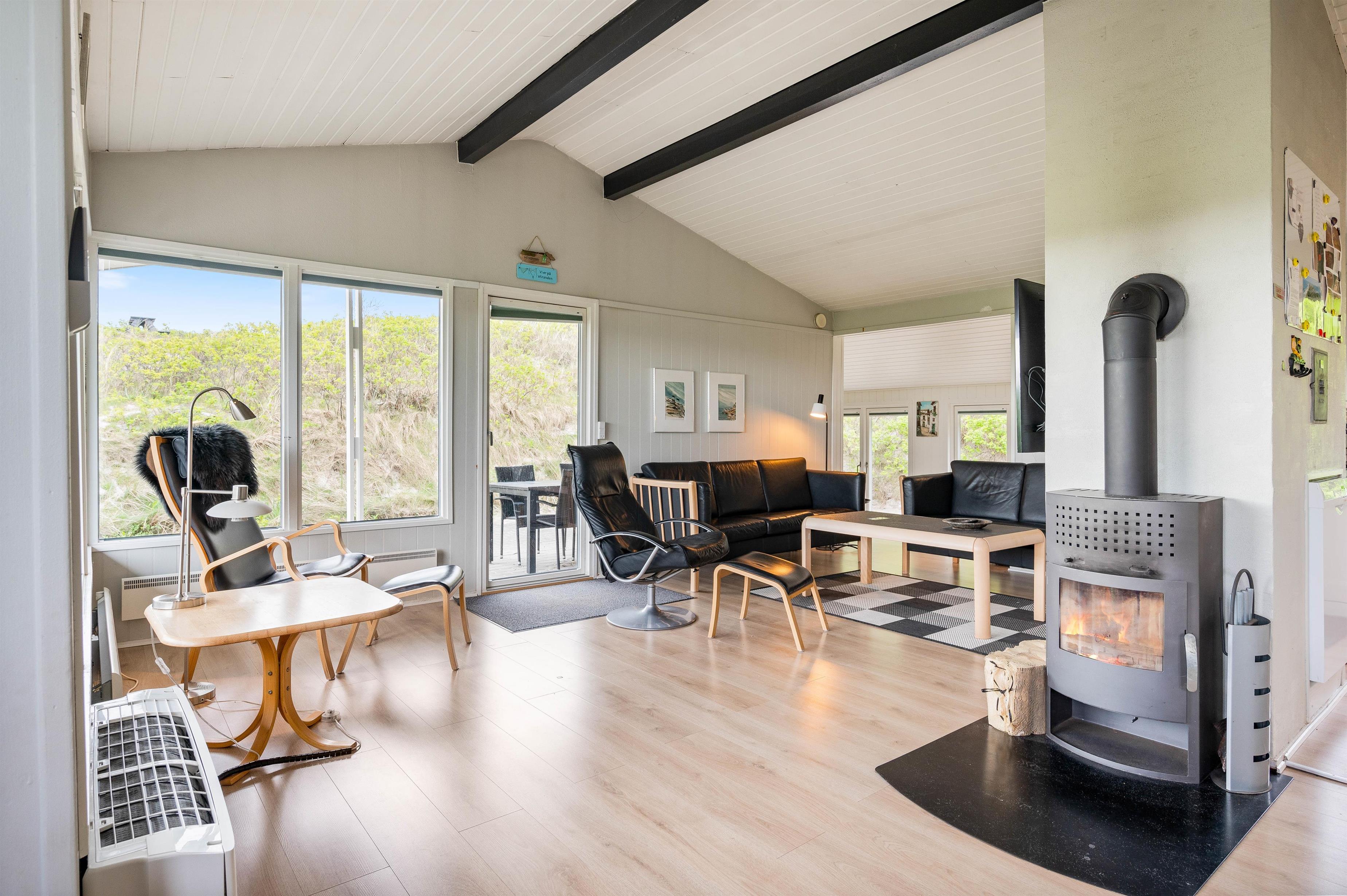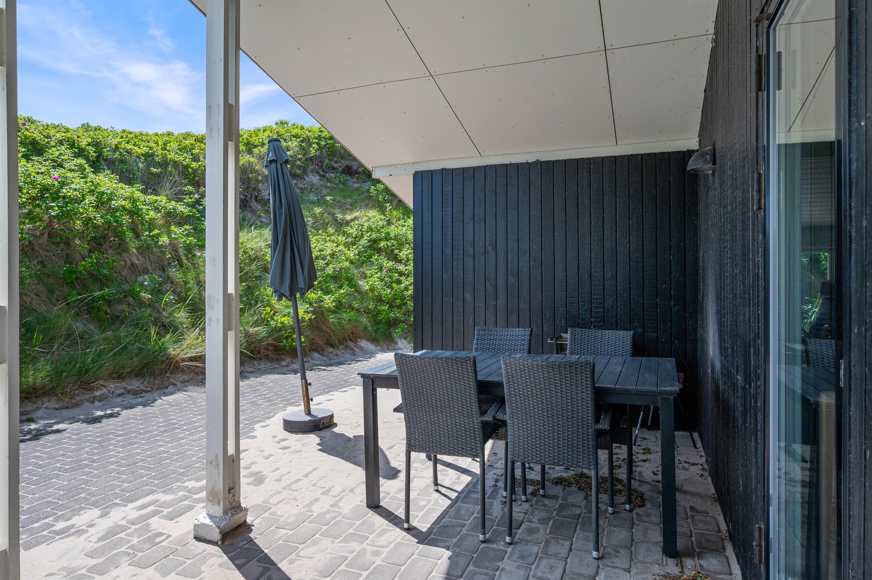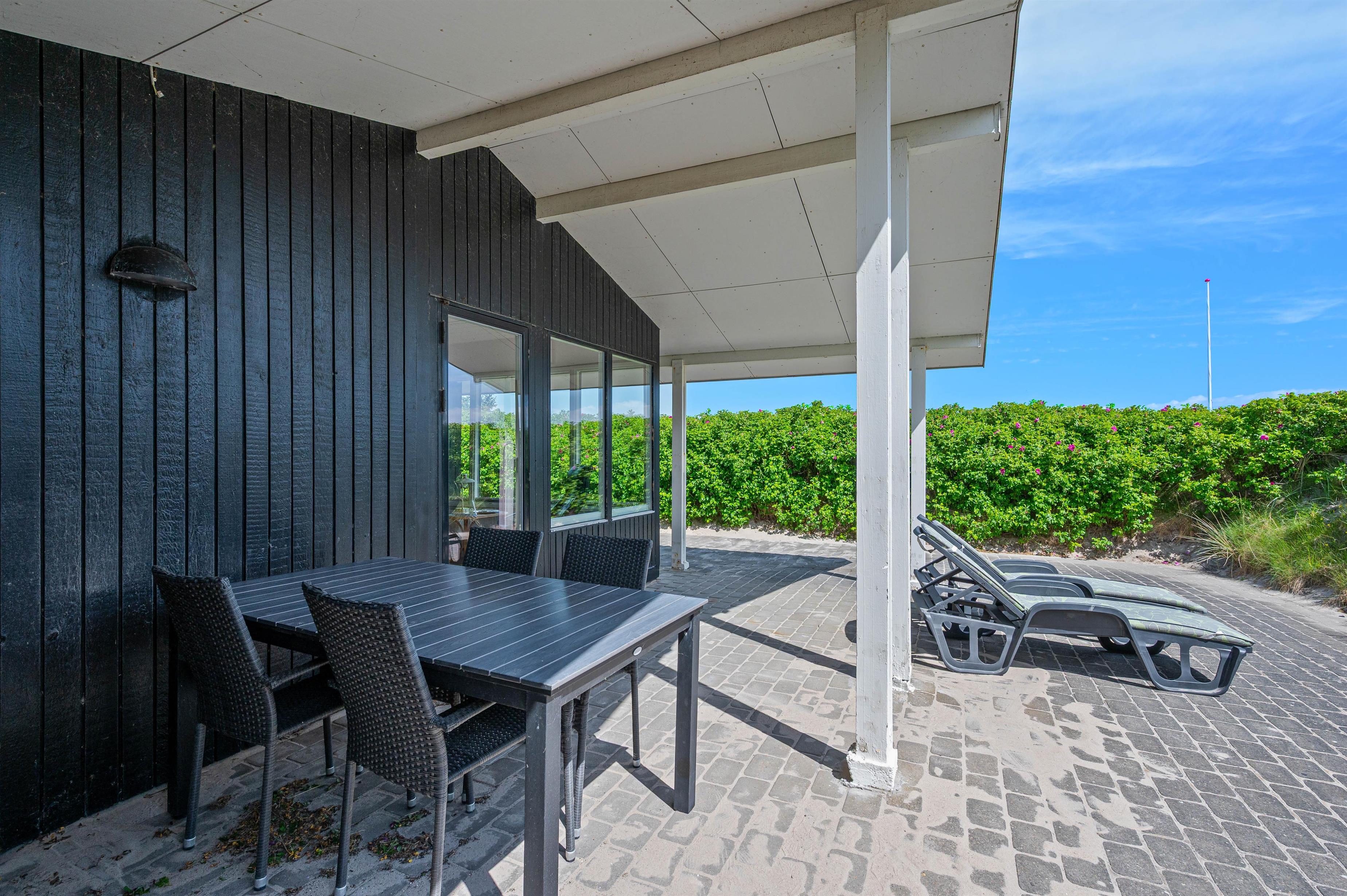 Når vejret byder op til det, kan I sætte jer ud på den afskærmede og delvist overdækkede terrasse, hvor I kan høre lydende fra det brusende Vesterhav, som kun ligger 50 meter væk. På terrassen er der plads til afslapning i de dejlige havemøbler, hvor I kan nyde den skønne panoramaudsigt ud mod Ringkøbing Fjord. Når sulten melder sig, kan I grille en lækker middag på sommerhusets grill.
