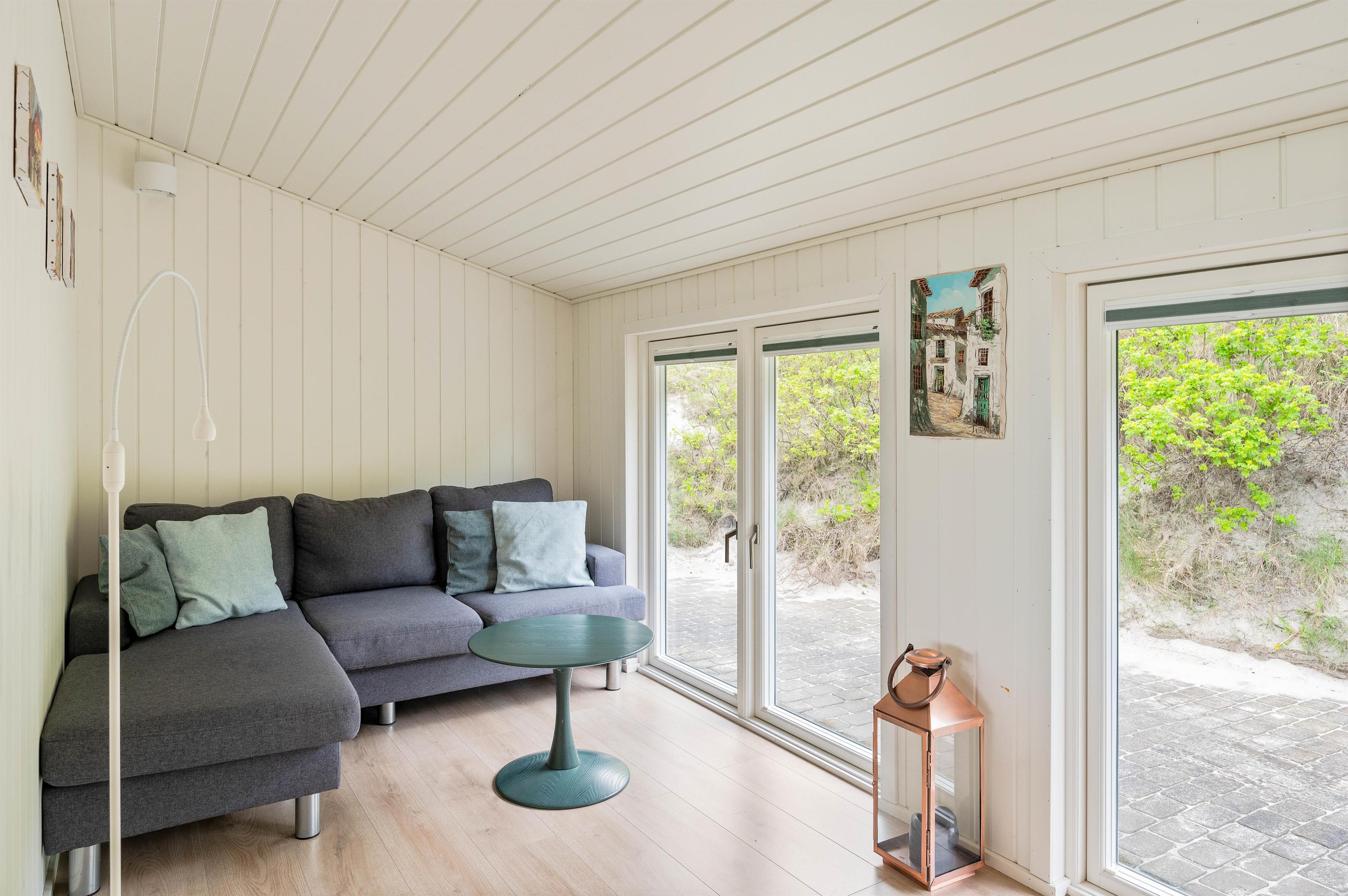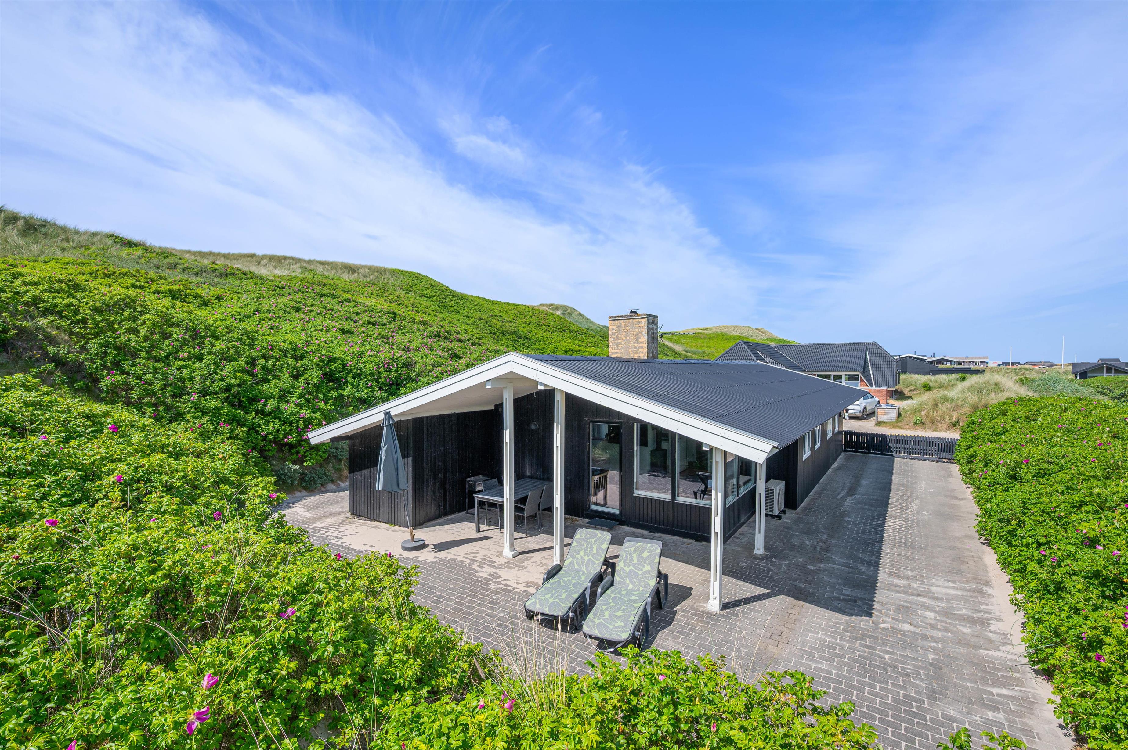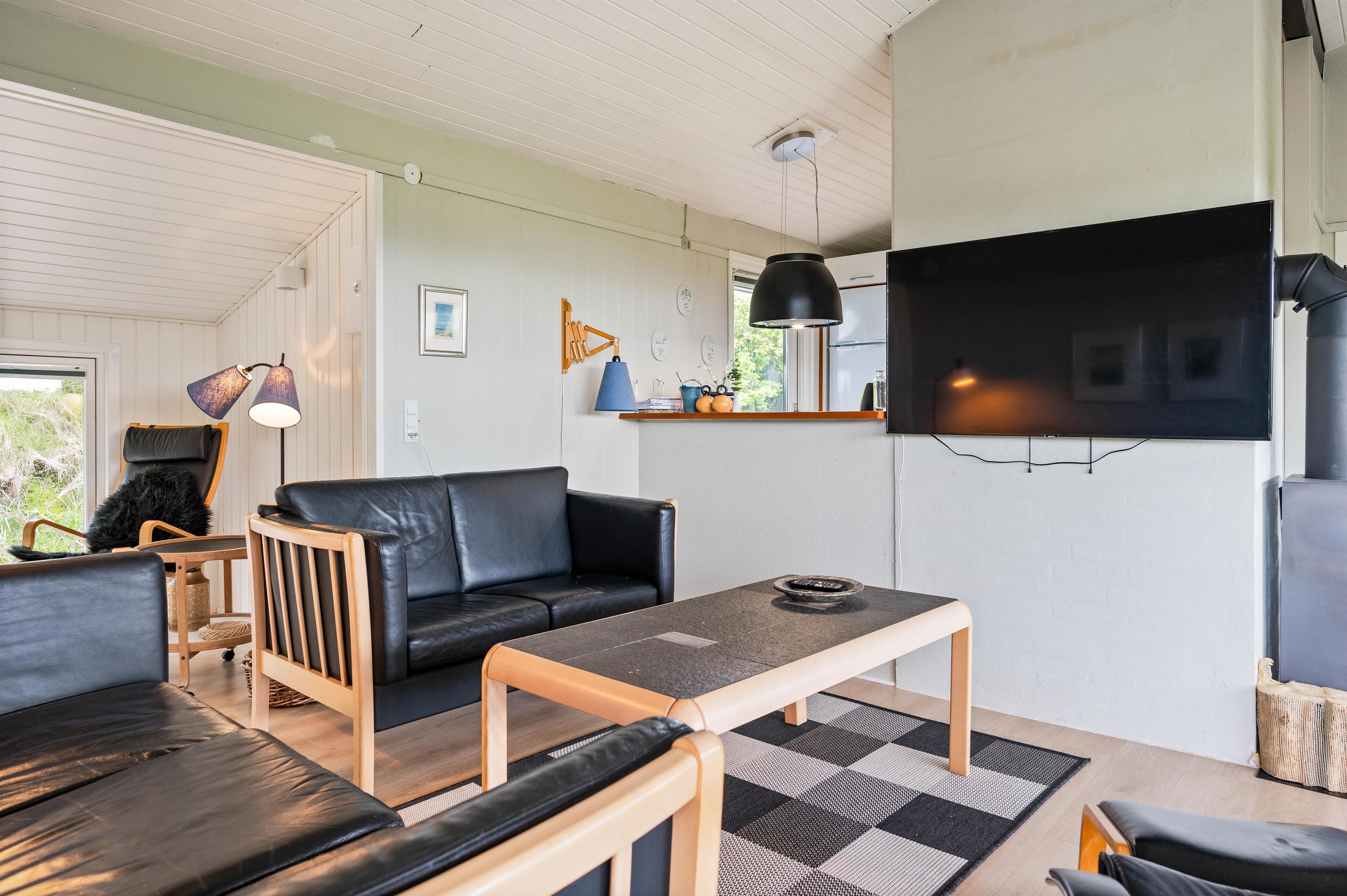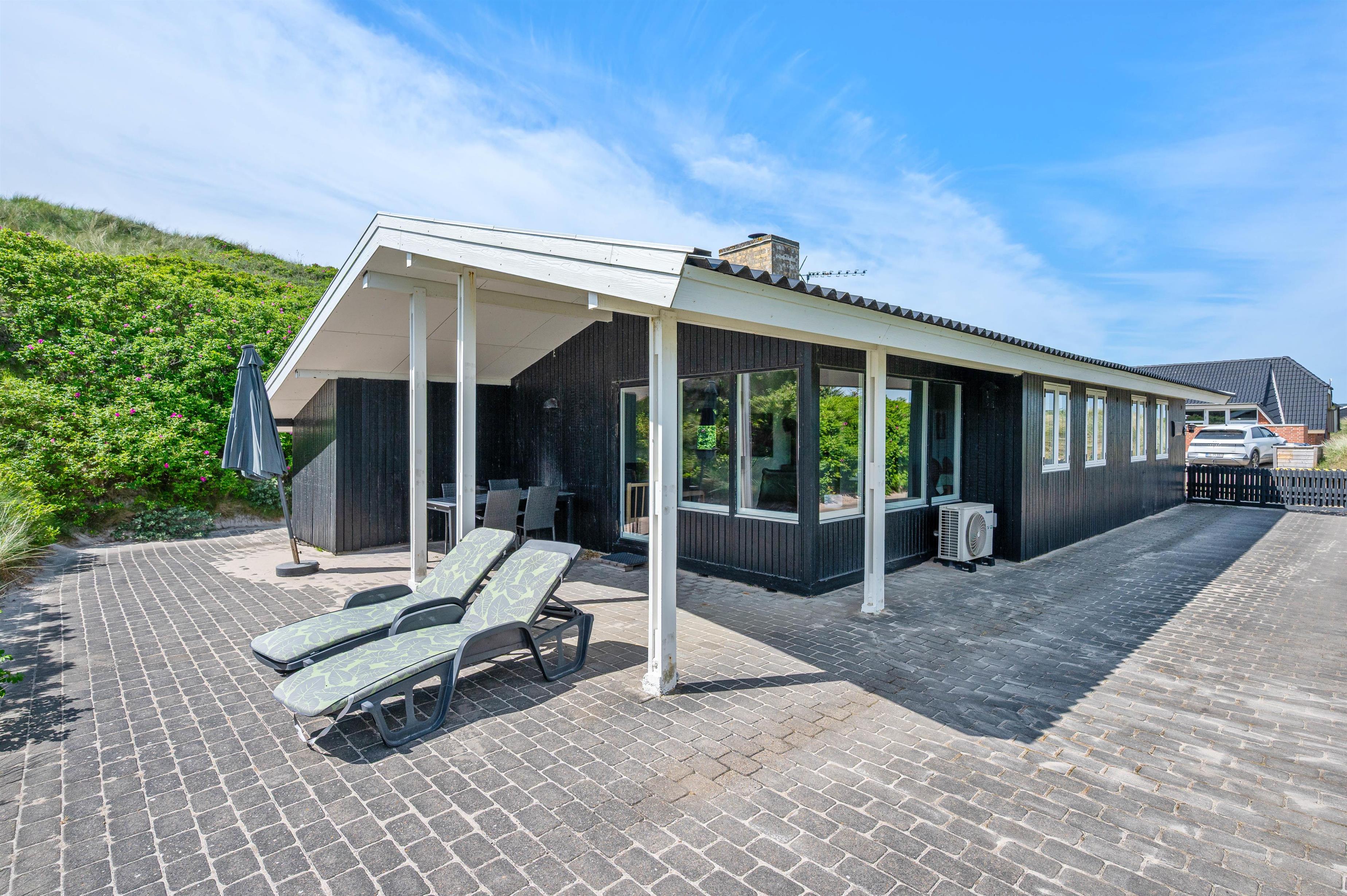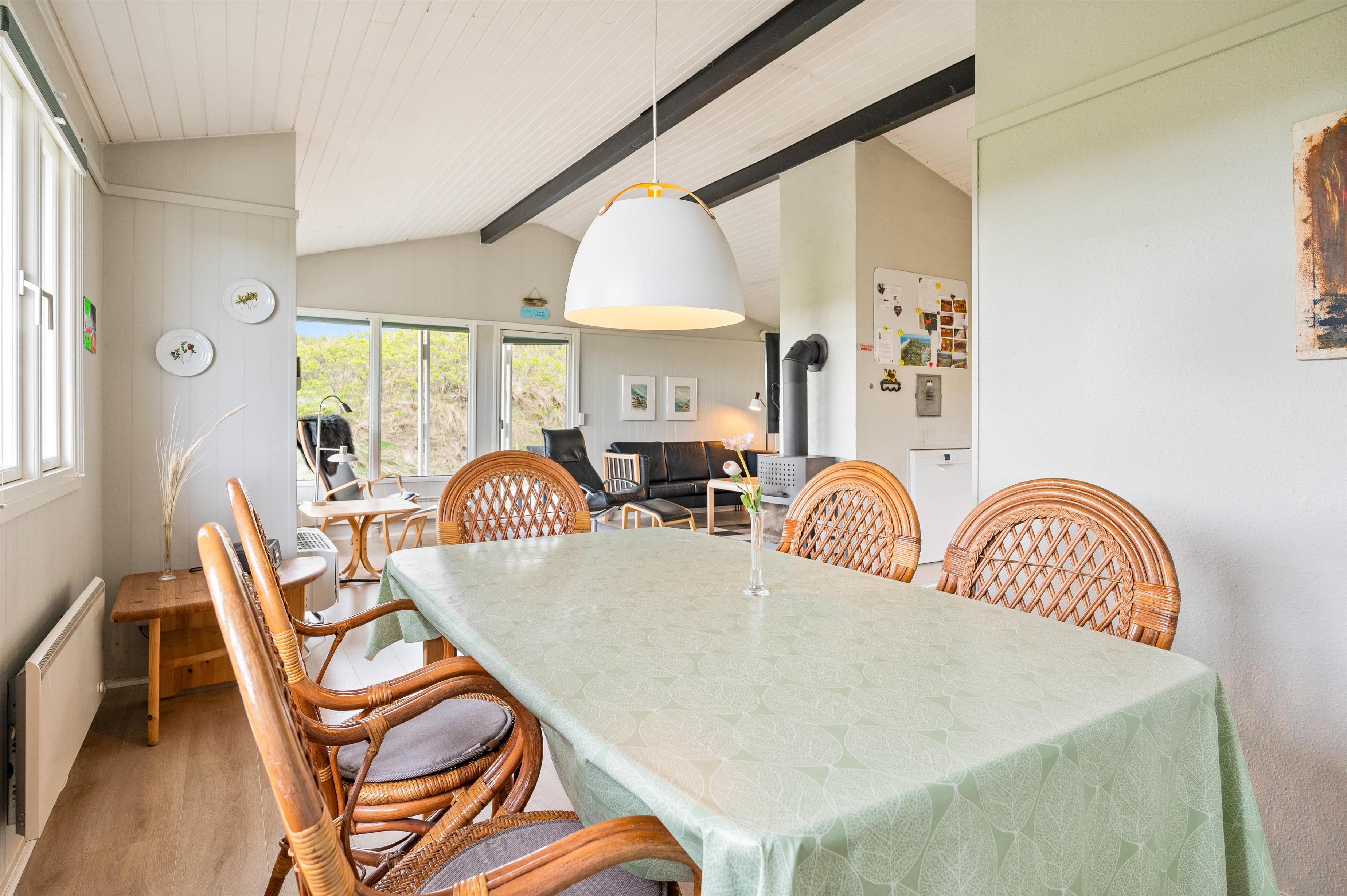 Når vejret byder op til det, kan I sætte jer ud på den afskærmede og delvist overdækkede terrasse, hvor I kan høre lydende fra det brusende Vesterhav, som kun ligger 50 meter væk. På terrassen er der plads til afslapning i de dejlige havemøbler, hvor I kan nyde den skønne panoramaudsigt ud mod Ringkøbing Fjord. Når sulten melder sig, kan I grille en lækker middag på sommerhusets grill.
