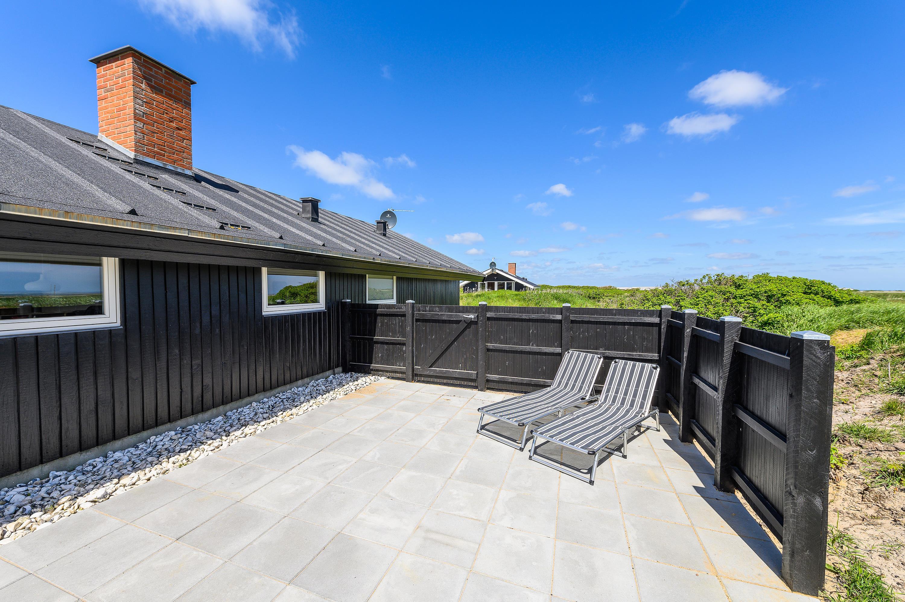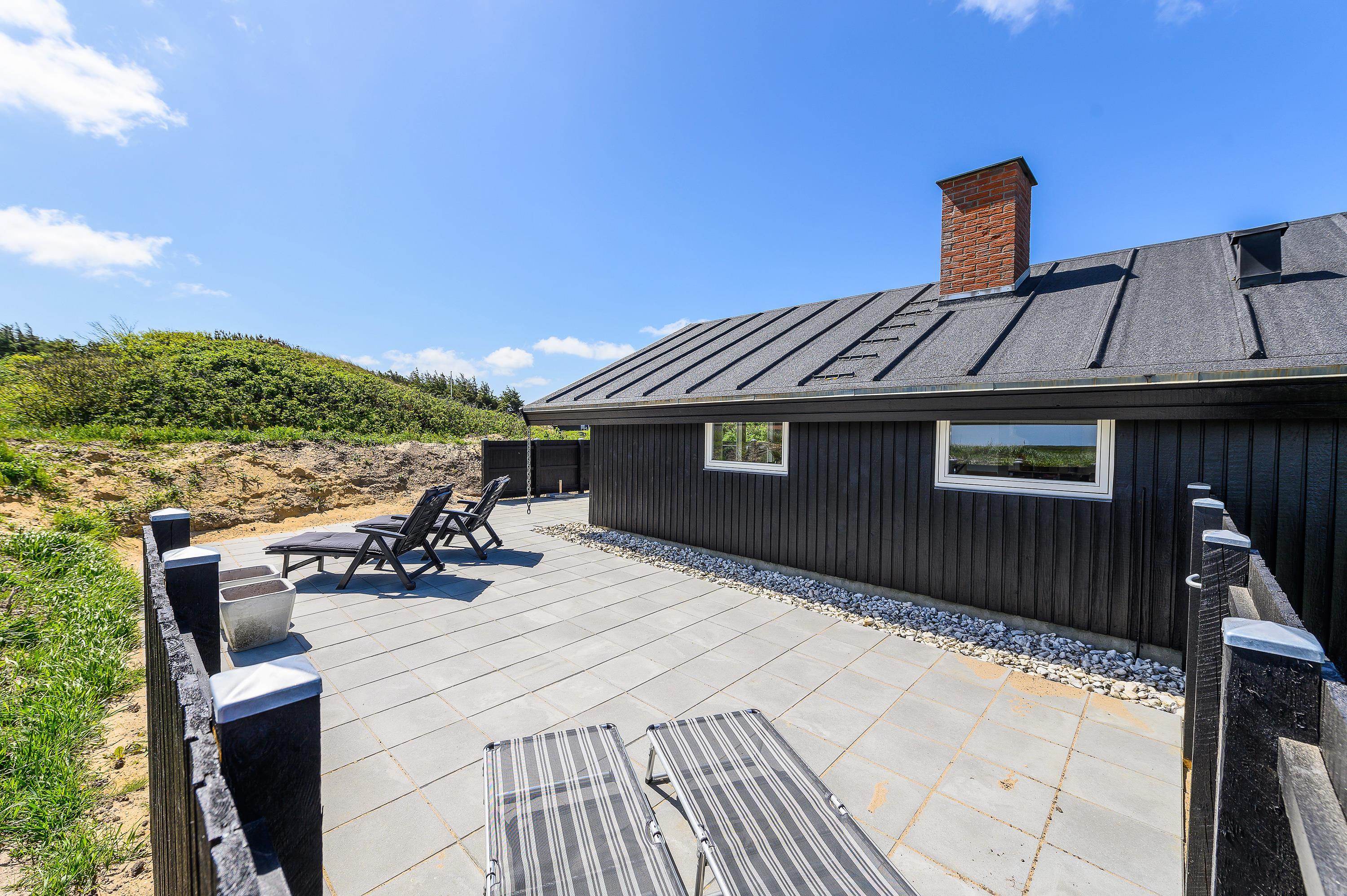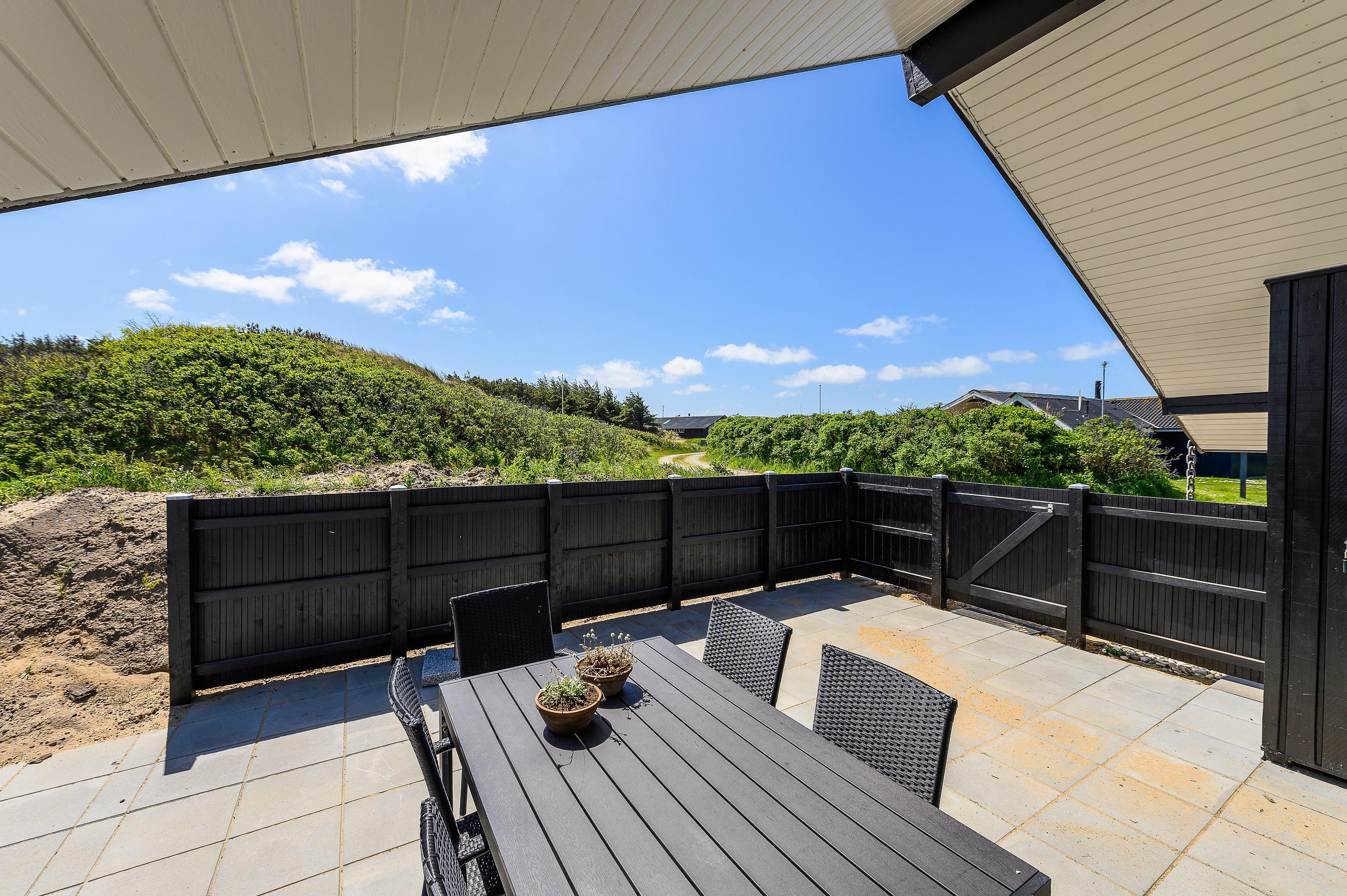 Her på terrassen mod sydvest, kan man her nyde de skønne sommeraftener med lækre grill-middage, solnedgangen og havets brusen i baggrunden. Med kun 300 meter til stranden, er det også oplagt at nyde solnedgangen på stranden. – Det er blot en lille spadseretur over klitterne.