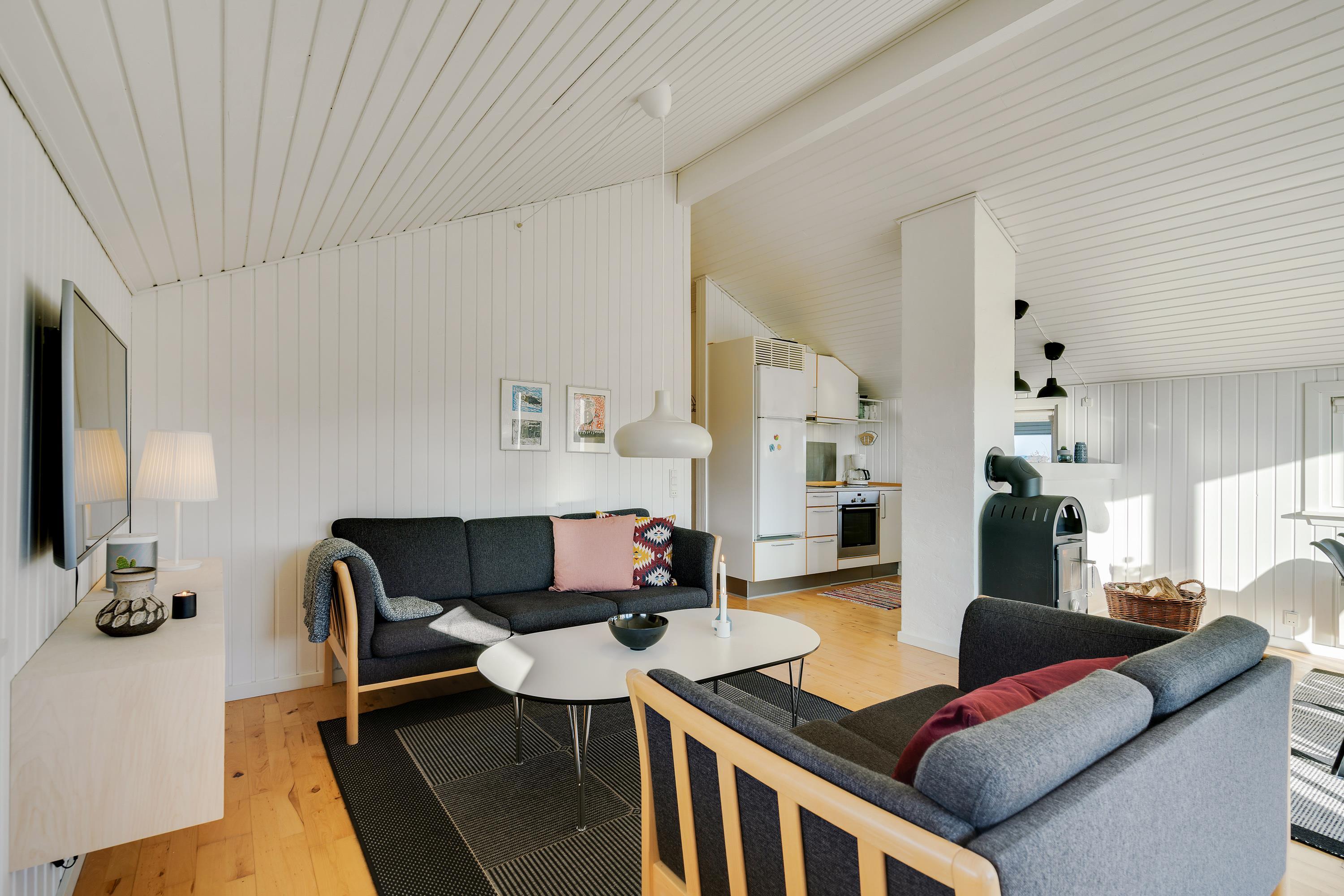 I stuen finder man også en brændeovn, som særligt på de lidt køligere dage, indbyder til en hyggestund i sofaen, måske med en god bog og en kop kaffe.