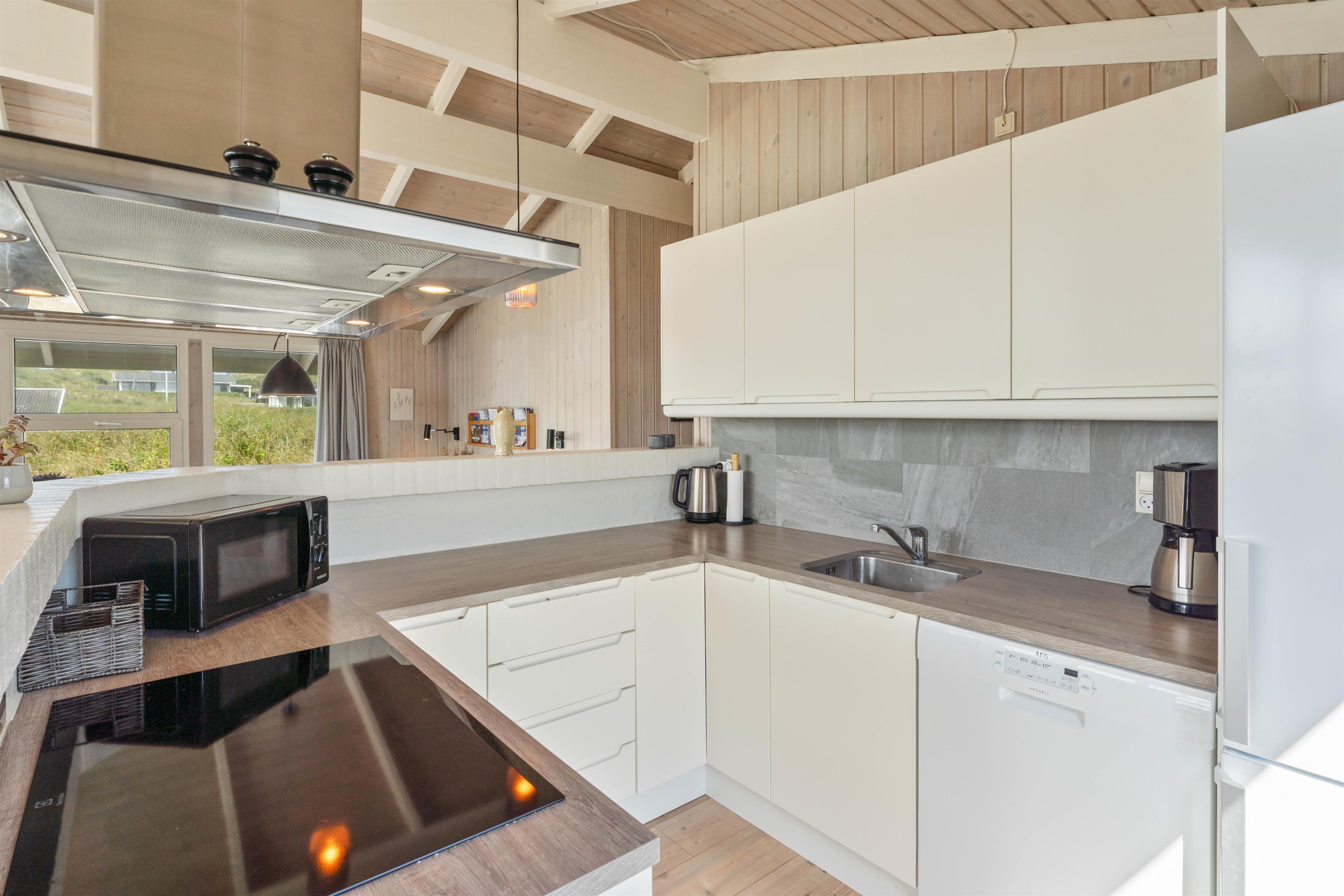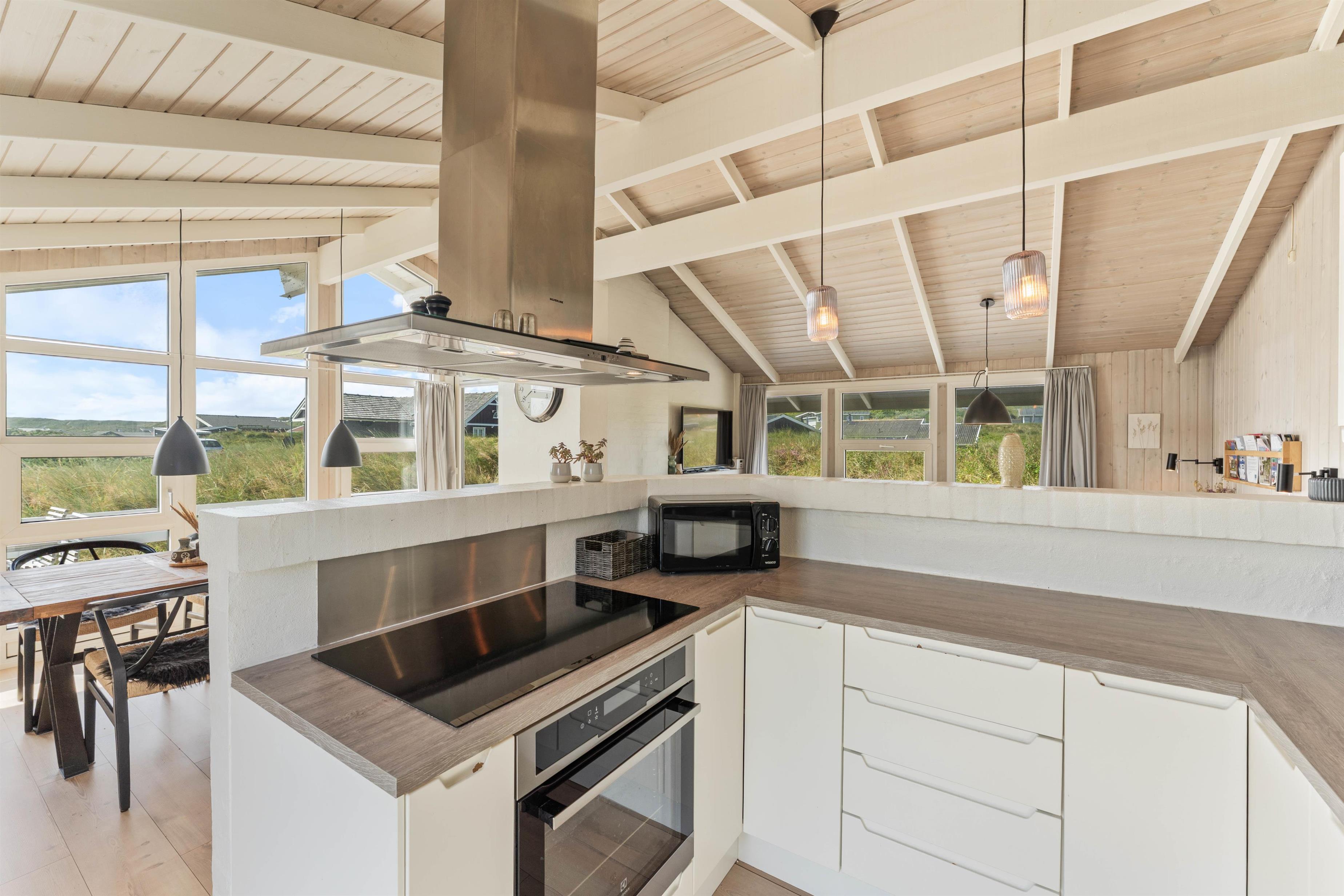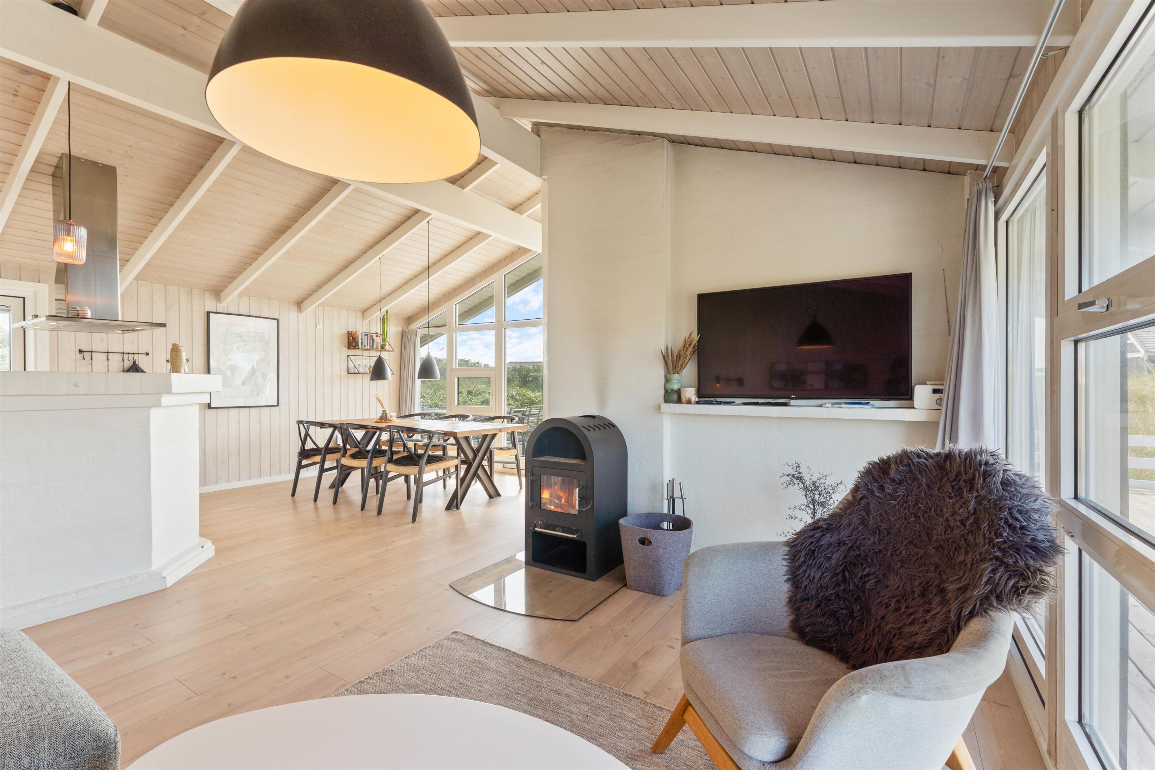 Opholdsrummet med stue og køkkenalrum i ét er feriehusets hjerte, og den klassiske brændeovn sørger for både varme og hyggelig feriestemning med sine knitrende flammer. De store vinduespartier inviterer det smukke klitlandskab indenfor og giver et skønt lysindfald.