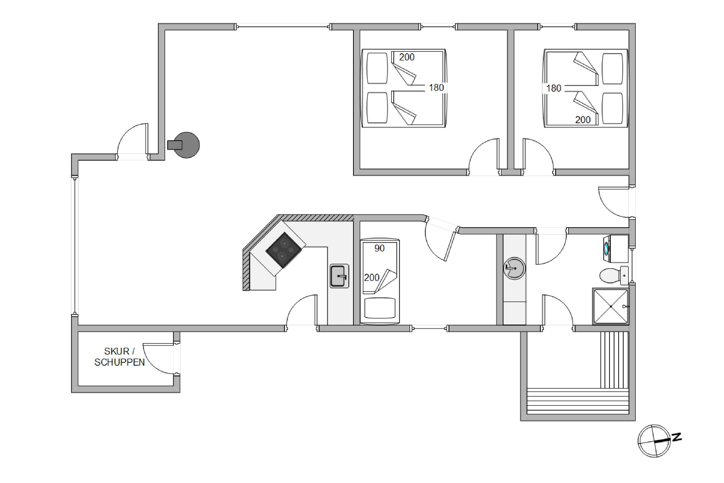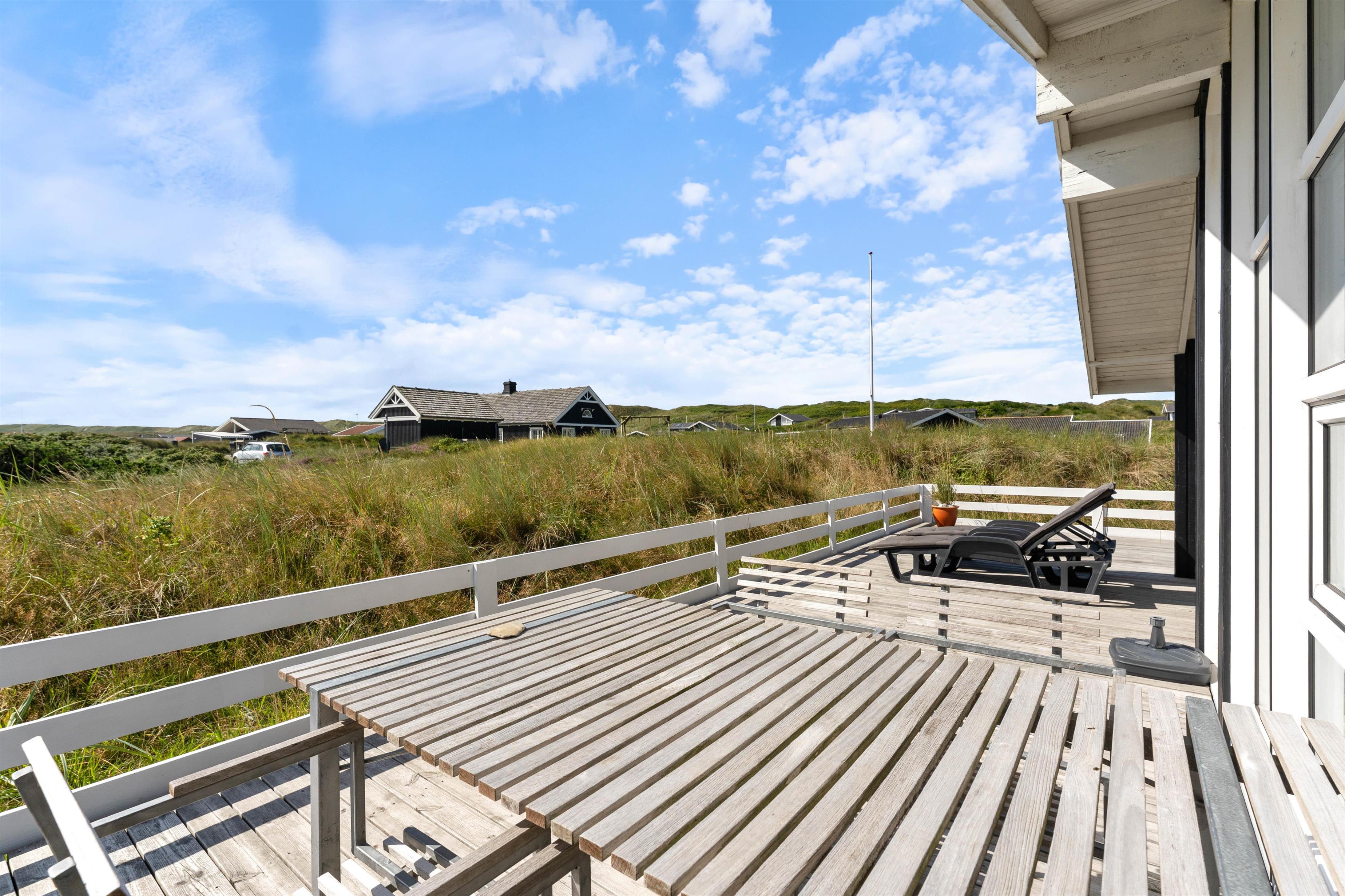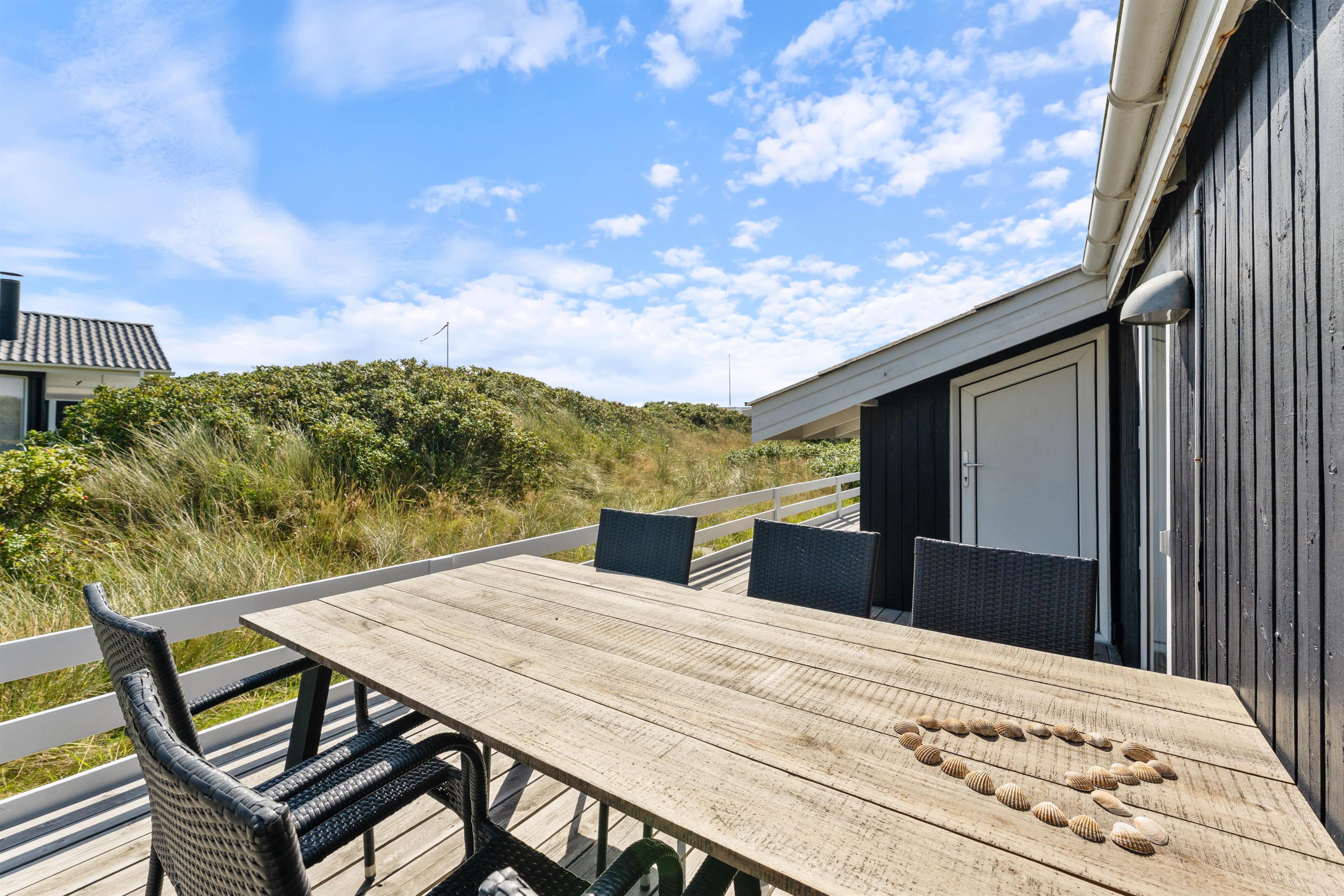 Fra opholdsrummet er der udgang til en stor, dejlig træterrasse, som er blevet lagt i forbindelse med renoveringen i 2019. Her kan I følge solens gang hele dagen og nyde det gode vejr i havemøblerne og liggestolene. Om aftenen kan I tænde op i grillen og spise god mad i aftensolen, mens morgendagens planer bliver lagt.