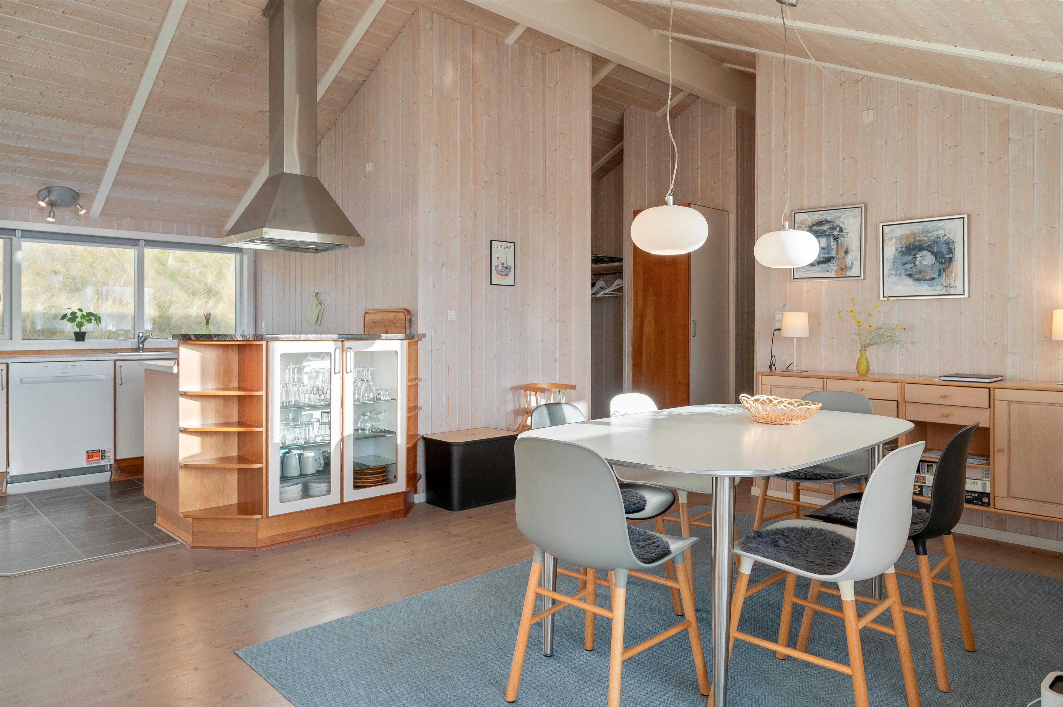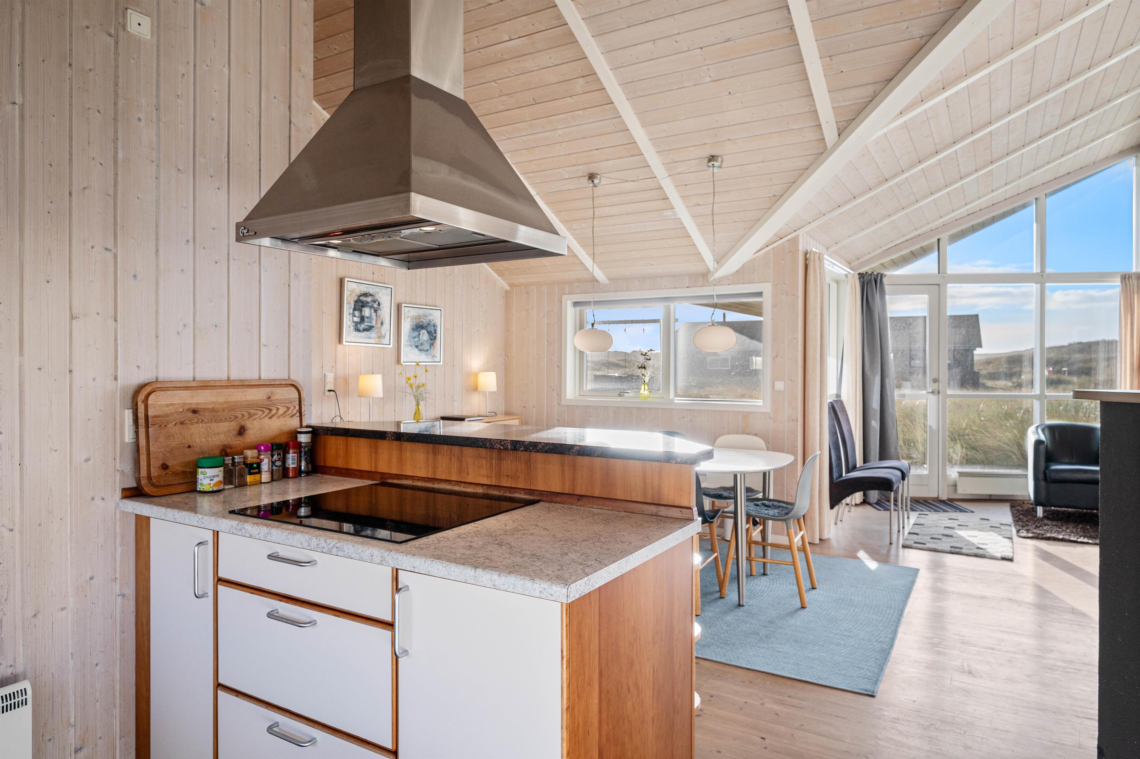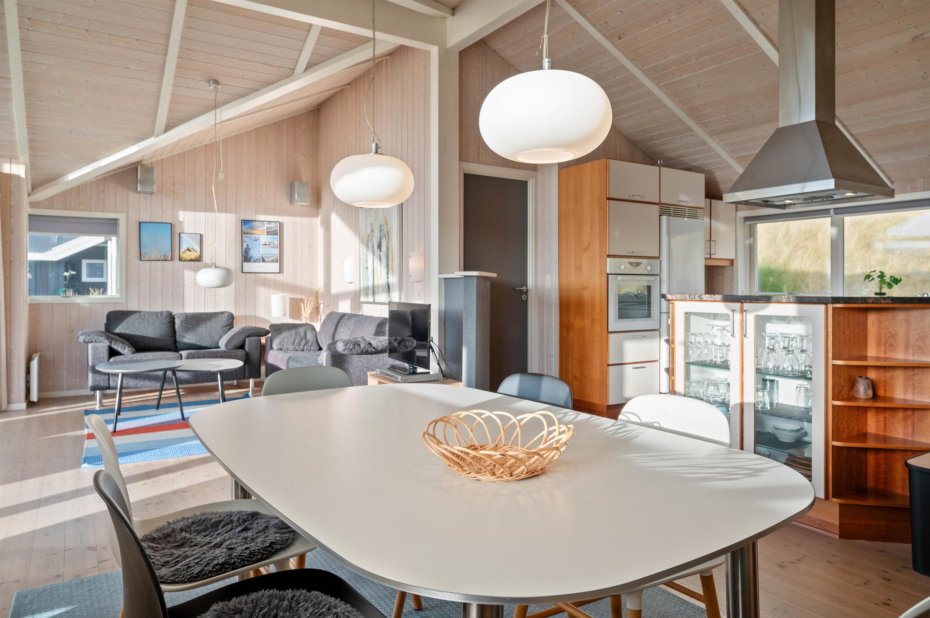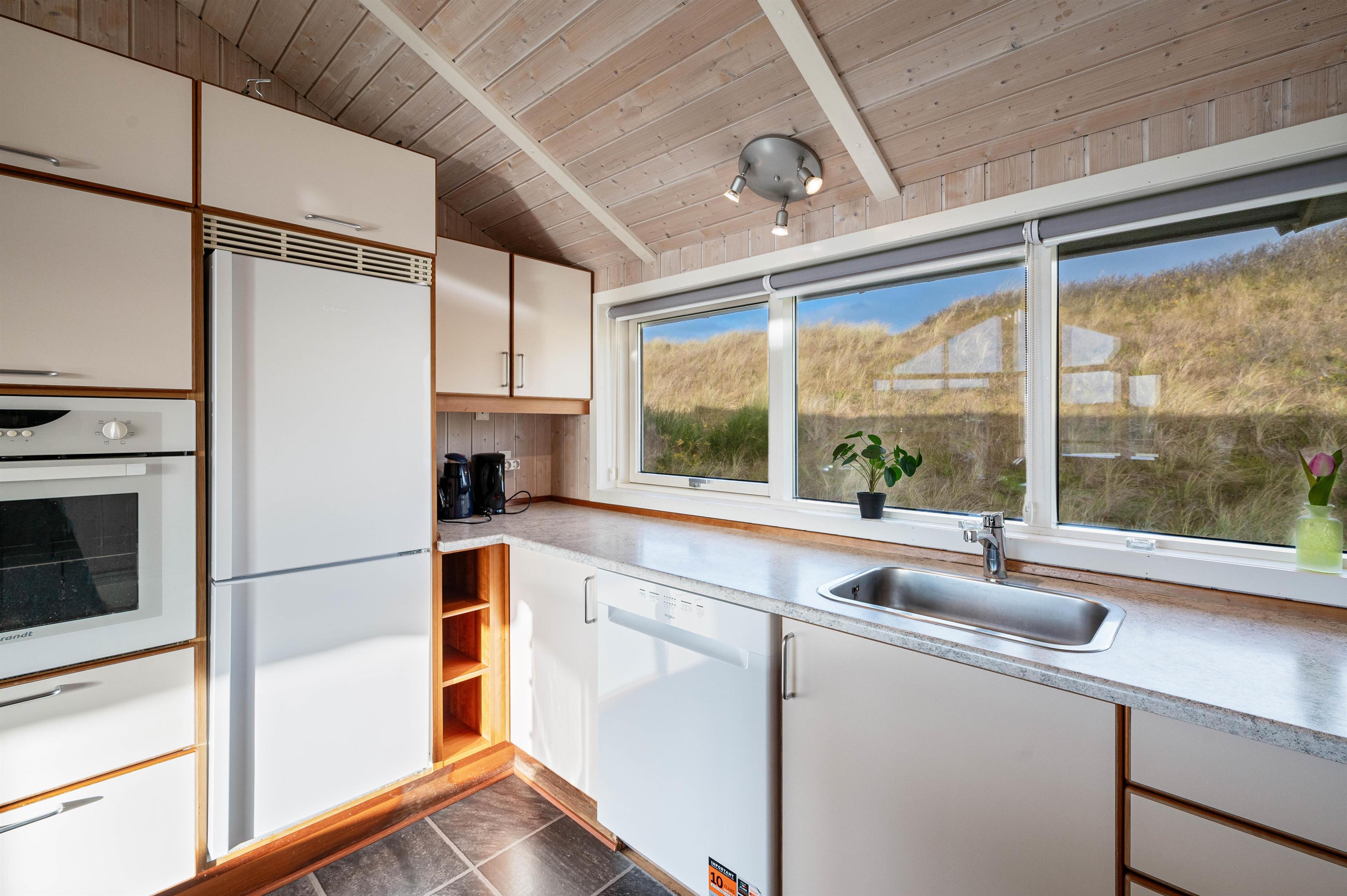 I sommerhuset er der et stort køkkenalrum, som byder til samling af hele familien. Her kan alle være, hvad enten man laver et lækkert måltid, klarer dagens opvask, spiller brætspil ved køkkenbordet eller ser en god film på fjernsynet. Derudover er er der 3 gode og komfortable soveværelser. 2 værelser med dobbeltsenge og et værelse med 2 enkeltsenge.