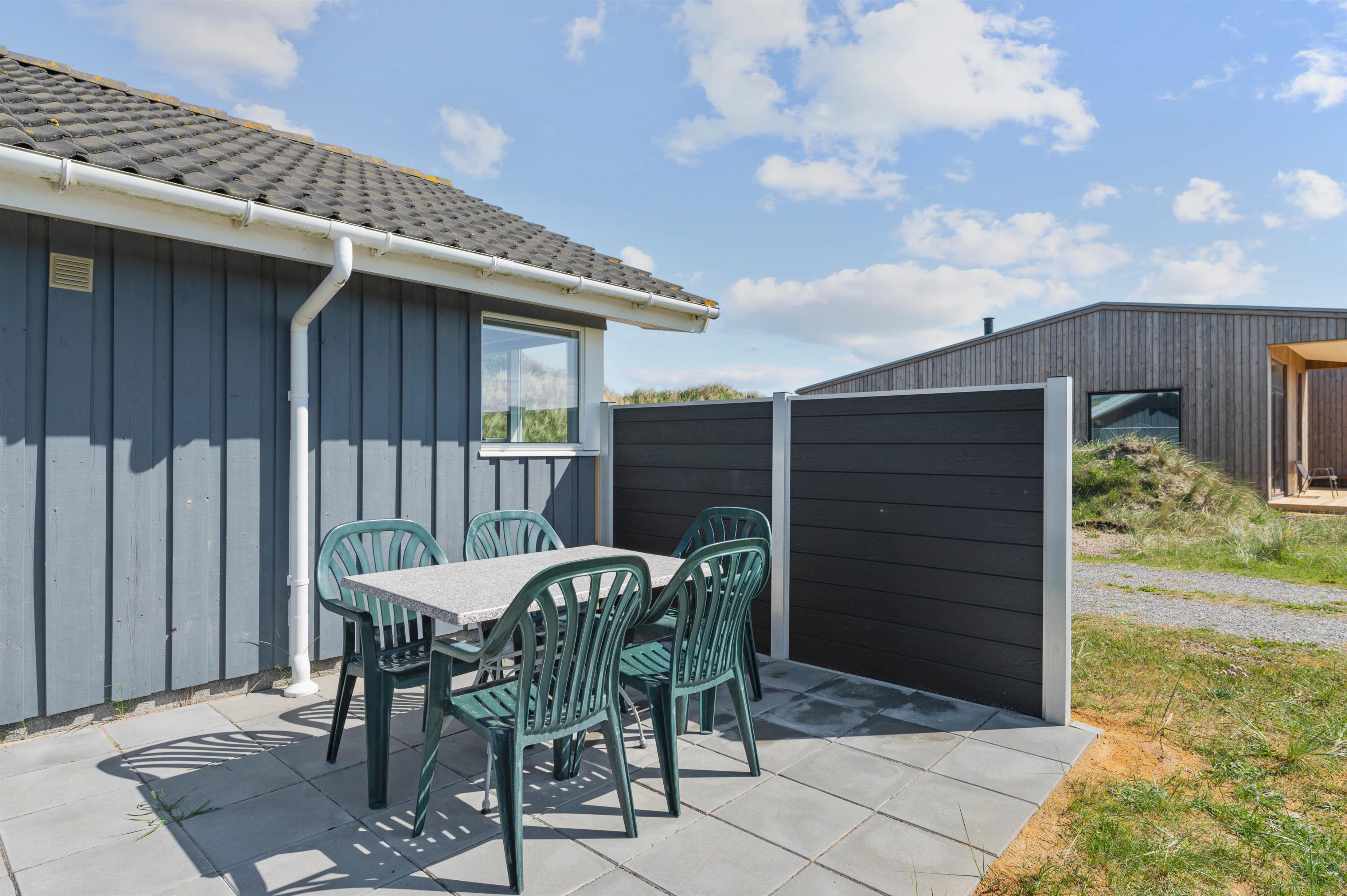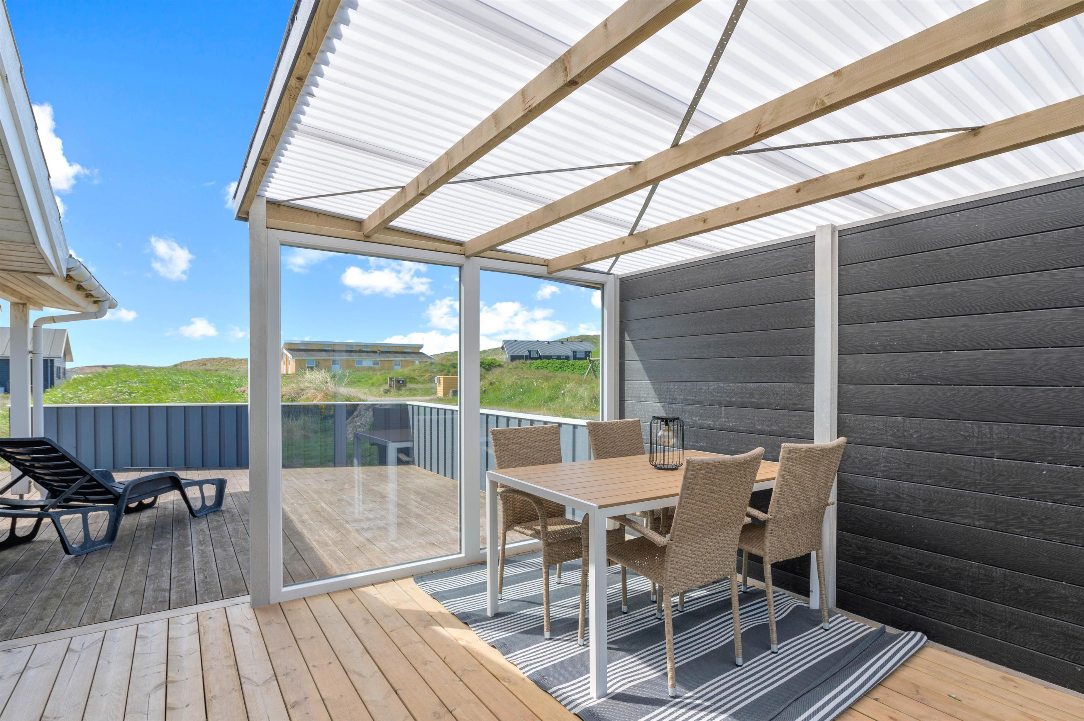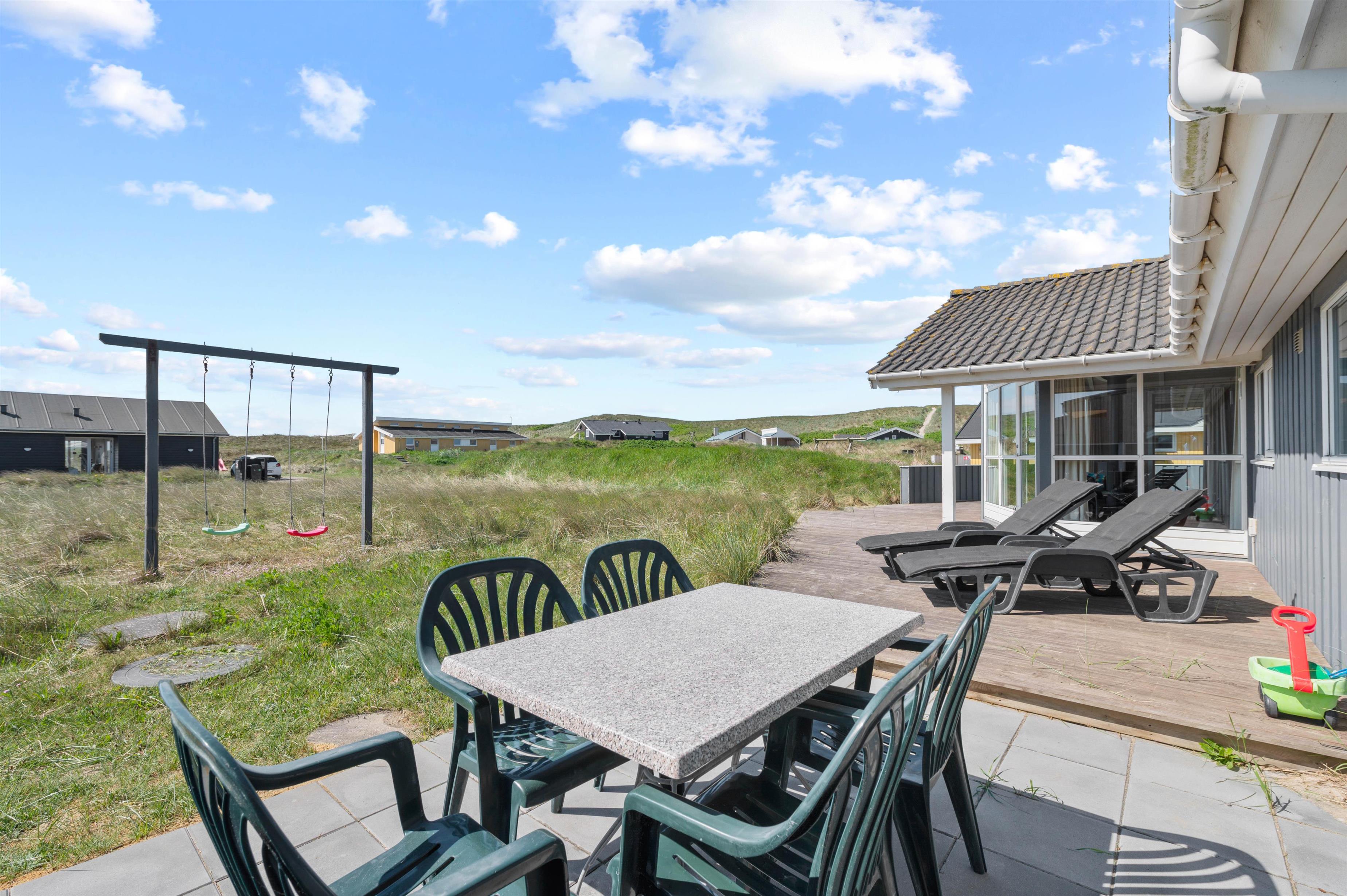 På terrassen er der mulighed for at afholde en hyggelig grillaften med hele familien, som I kan nyde i havemøblerne. Desuden er der også et gyngestativ til at underholde de mindste feriegæster, mens I kan slappe helt af i liggestolene.