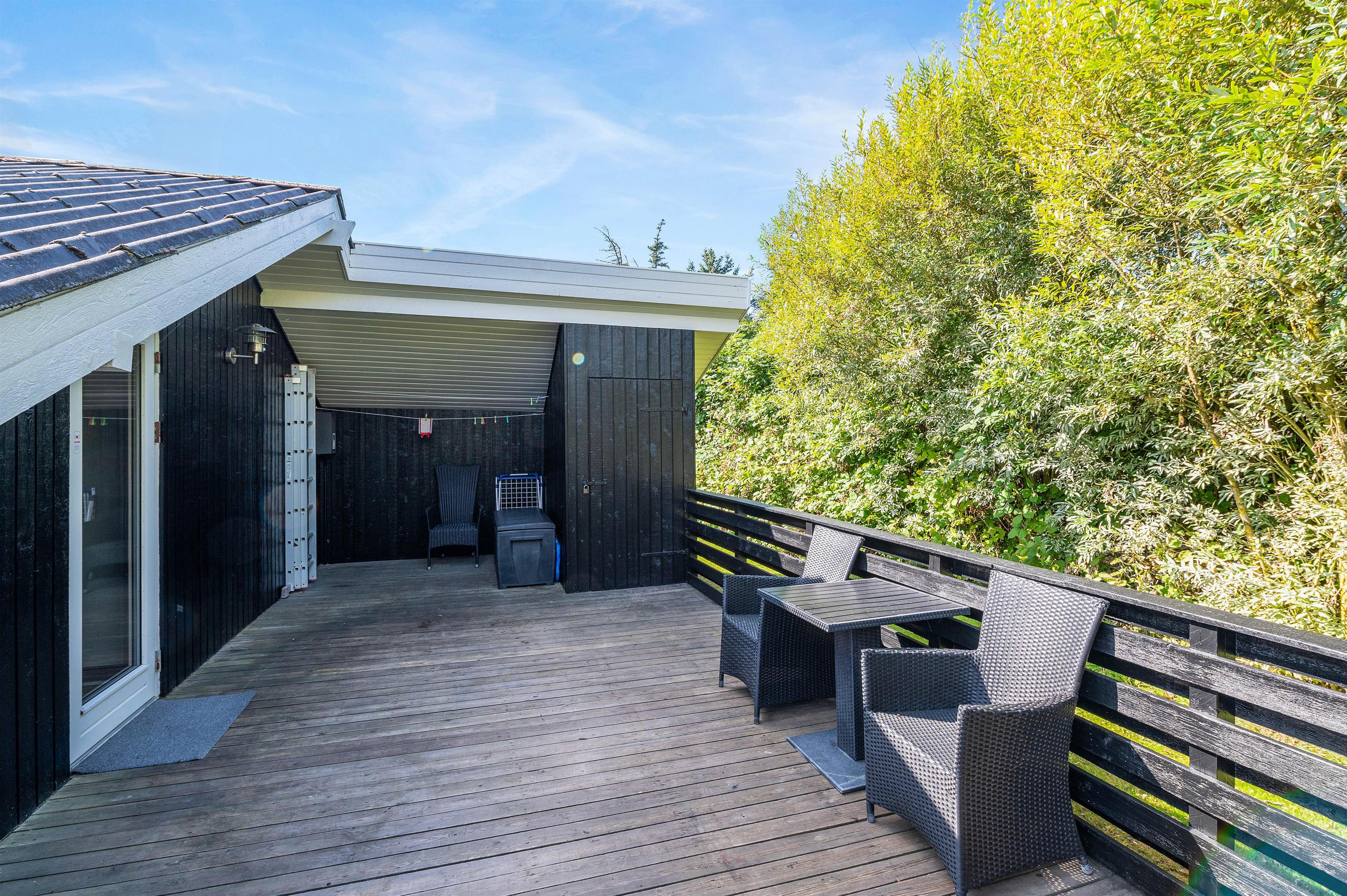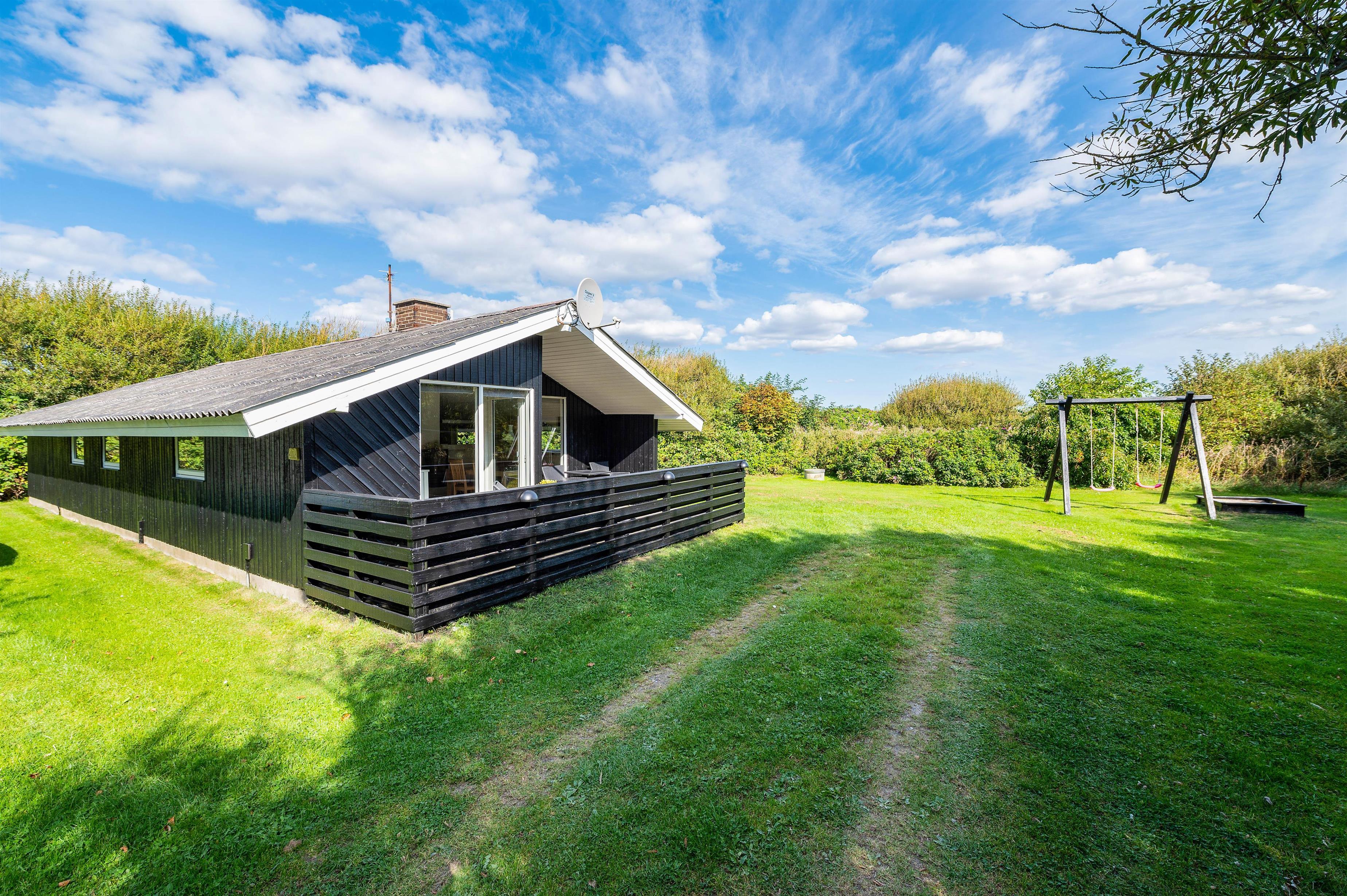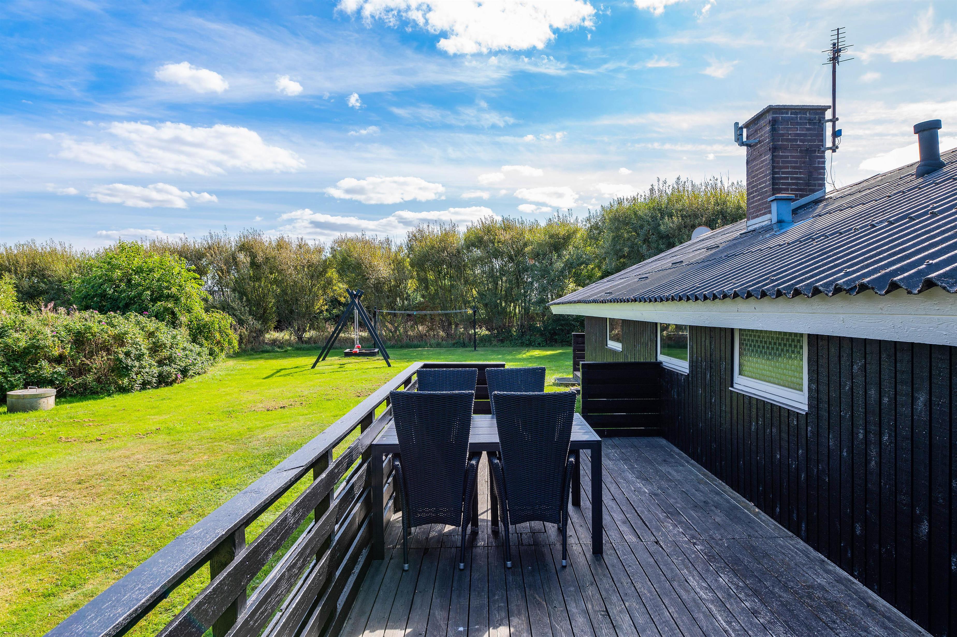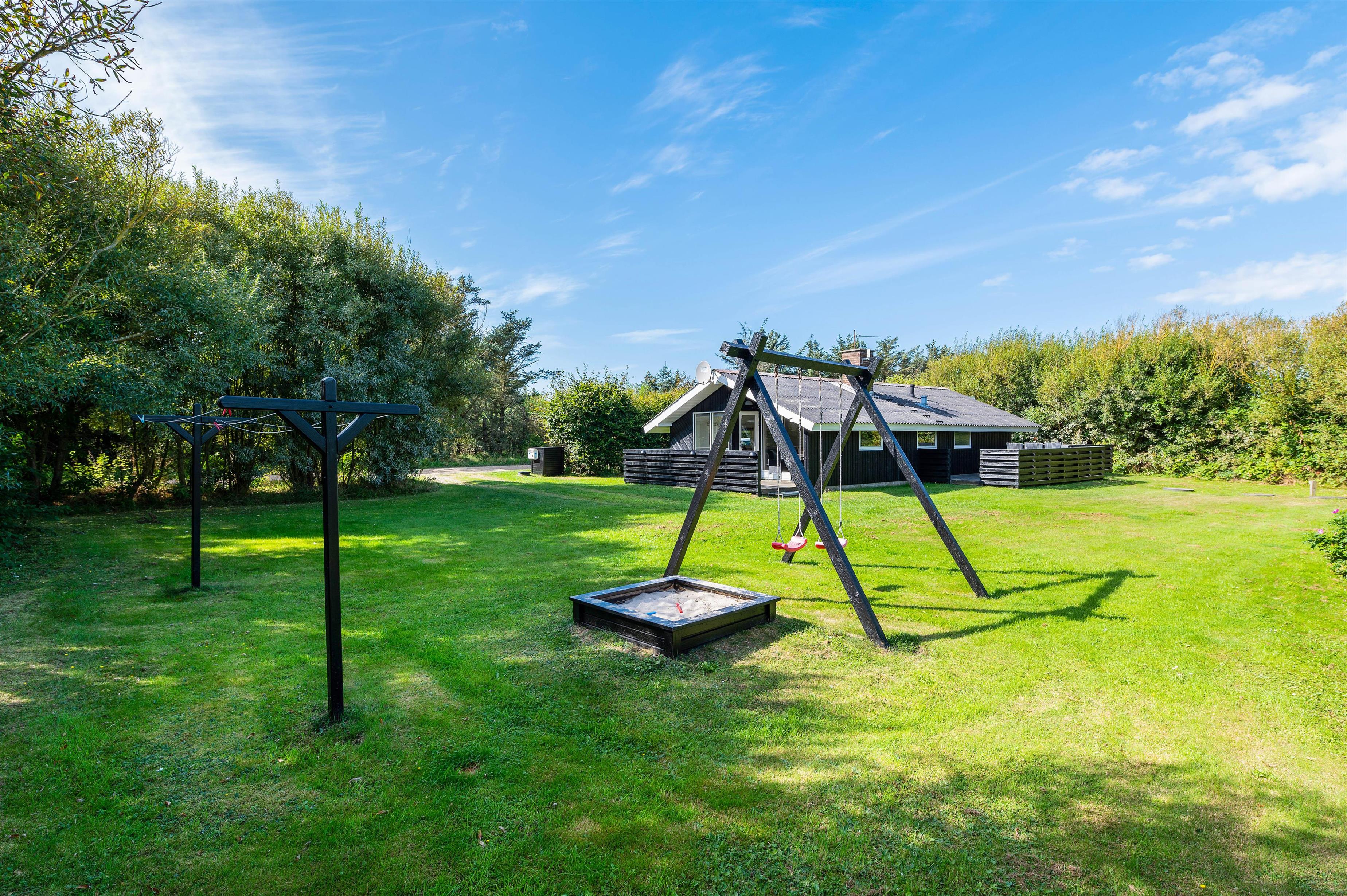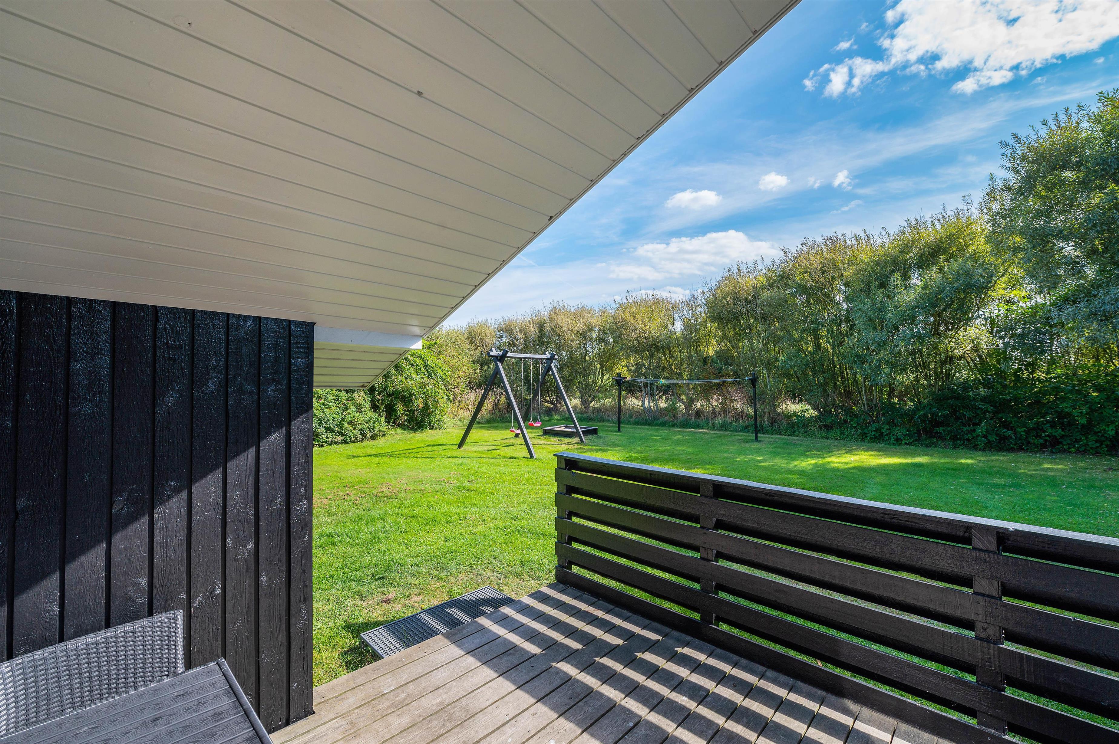 Grunden er godt afskærmet, så du uforstyrret kan sidde på terrasserne, mens børnene leger på den store plænegrund. Her er der også opstillet gynger og en sandkasse. På den lukkede terrasse kan I nyde de varme og solrige dage, og om aftenen kan I tilberede en dejlig middag på husets grill.