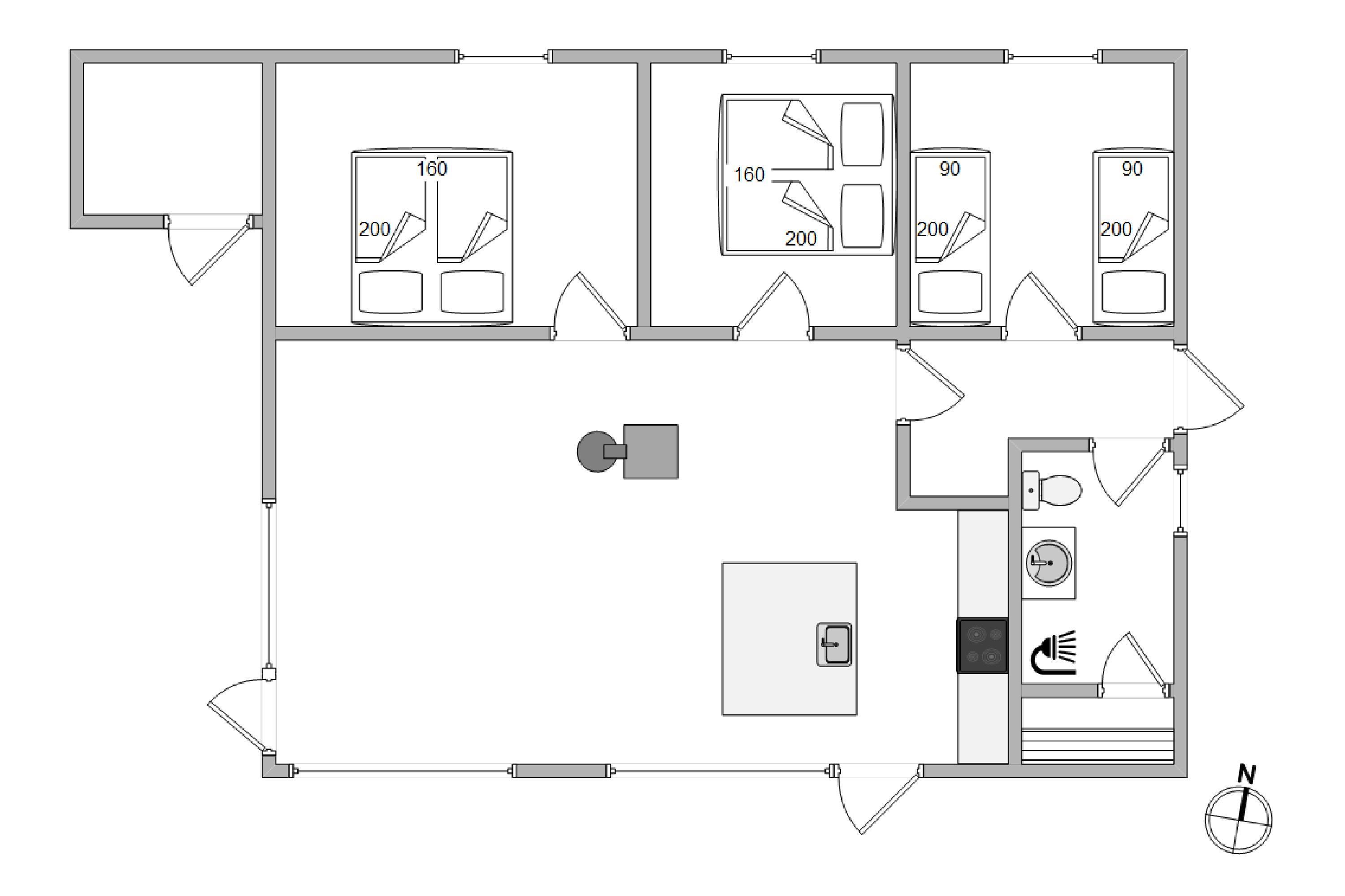 Sommerhuset har et rigtig dejligt fællesrum med åbent køkken, spiseafdeling og en hyggelige stue. Rummet er flot og lyst indrettet, hvilket giver lyst til at samle familien og hygge med fælles madlavning, sjove spil eller måske en god film. De 3 soveværelser er alle udstyret med gode boksmadrasser.