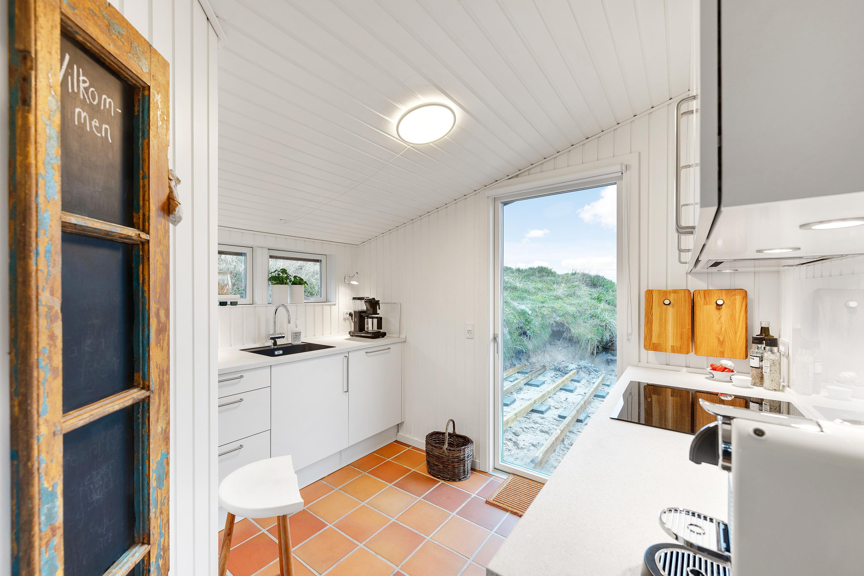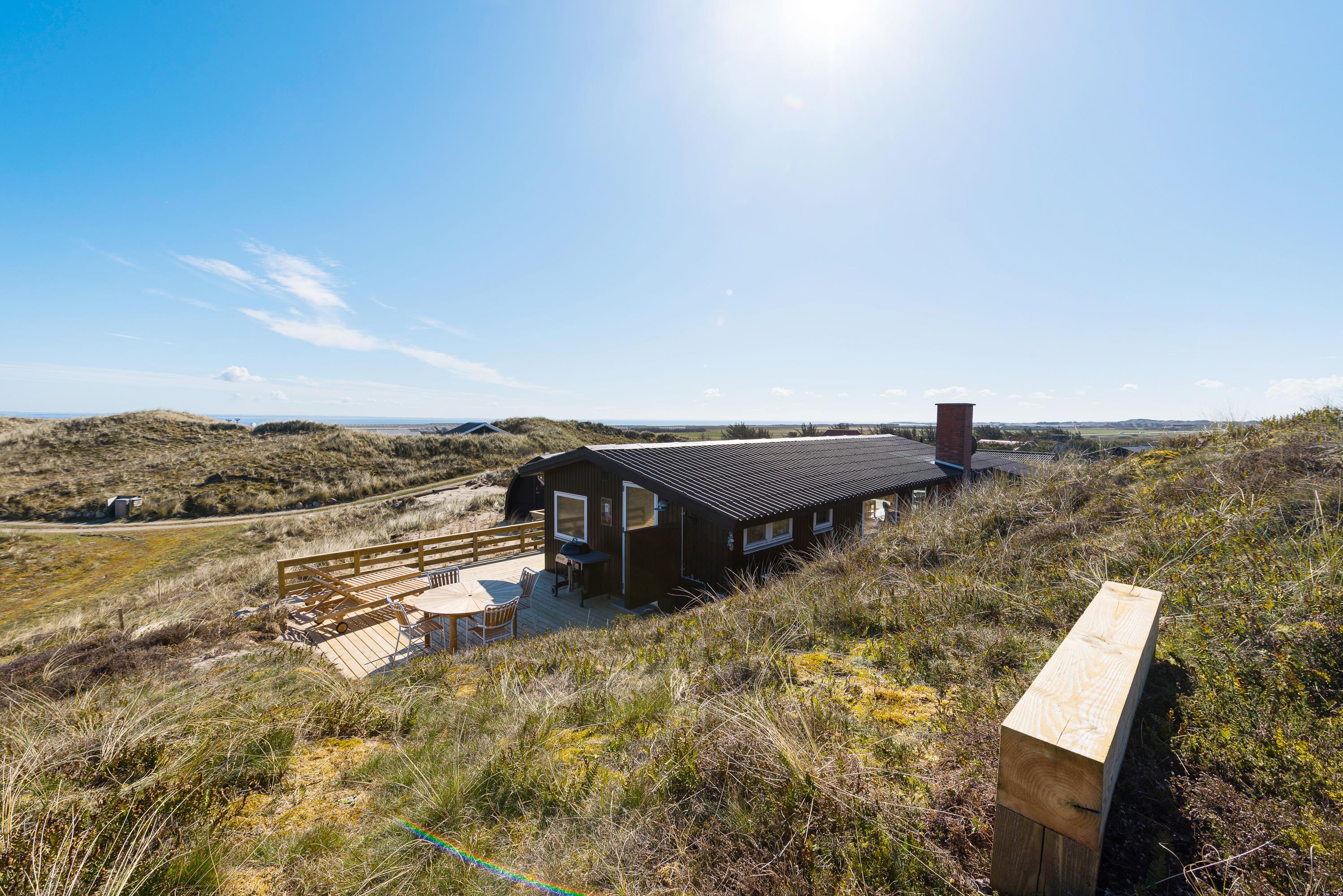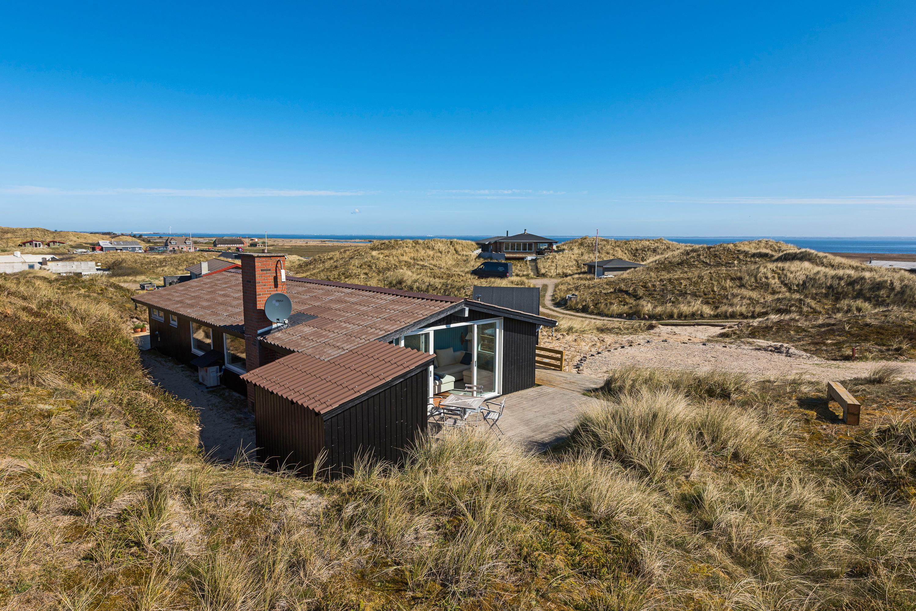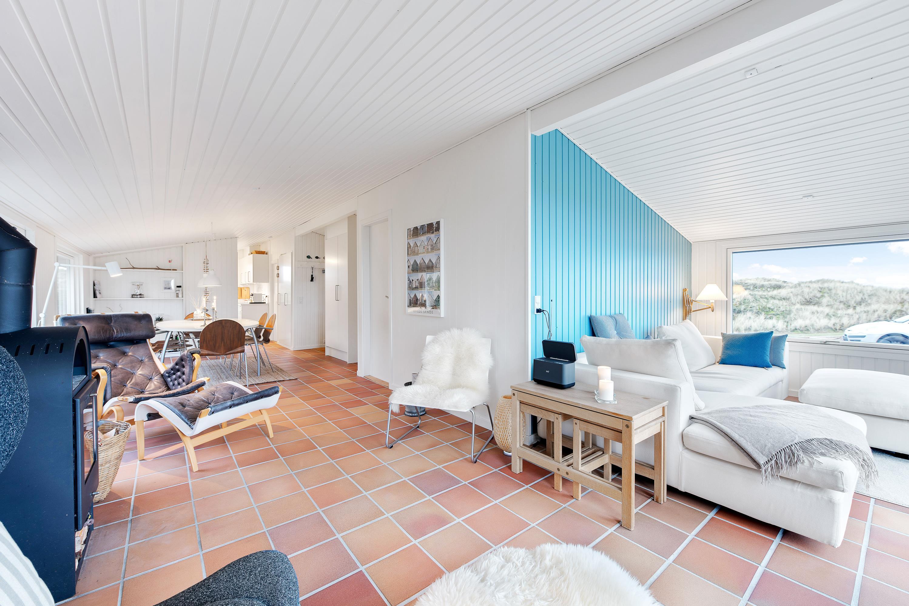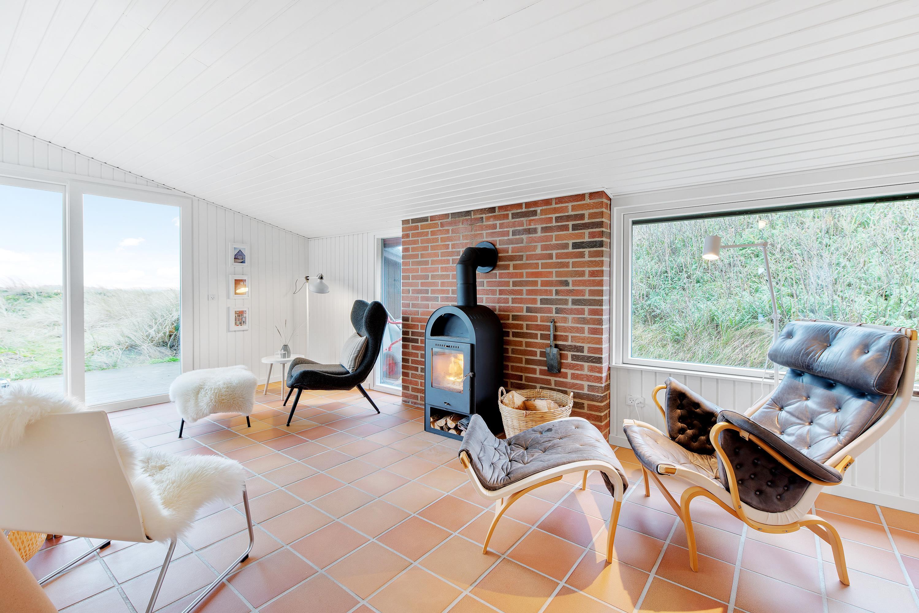Feriehuset er blevet renoveret i 2020. Med nyt køkken, energivenlige varmepumpe og velvalgte lyse farver samt fine detaljer er det supernemt, at komme i feriestemning. Sommerhusets store panoramavinduer giver et dejligt lys og en skøn udsigt ud over klitlandskabet og den vajende marehalm, som hele tiden skifter farve, når vinden leget med det. På mørke aftenen er de bekvemme lænestole ved brændeovnen den perfekte plads til ugens kriminalroman.
