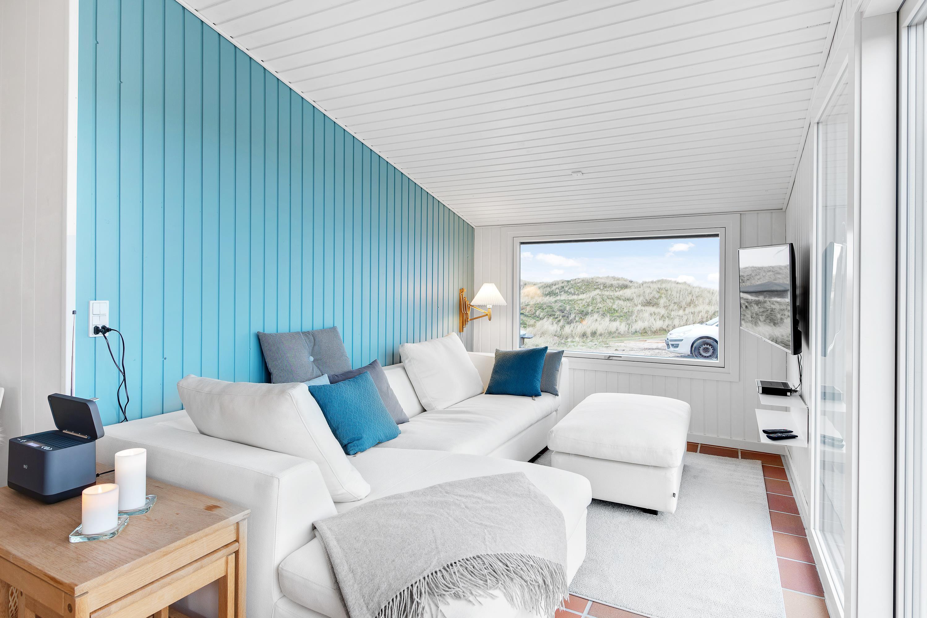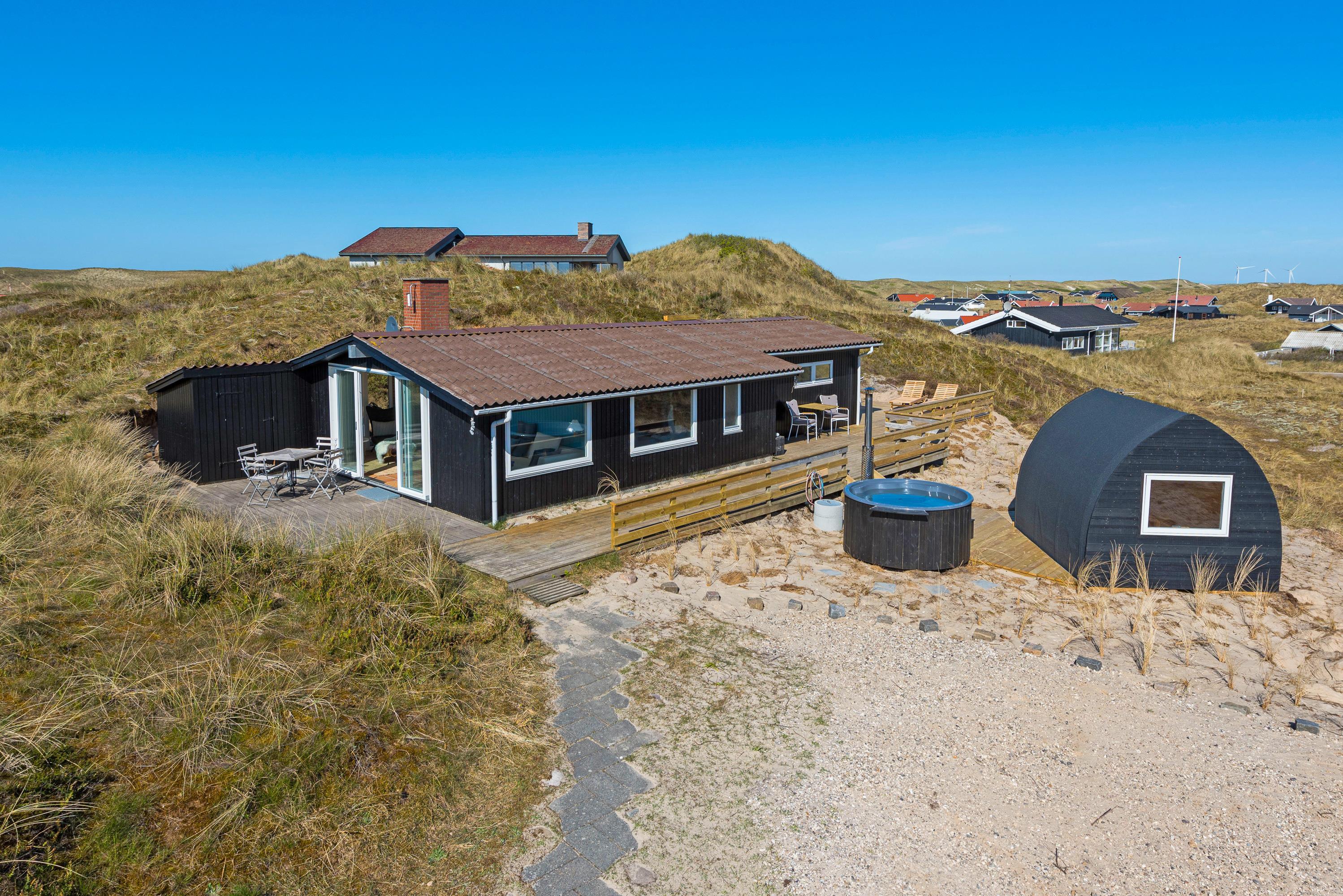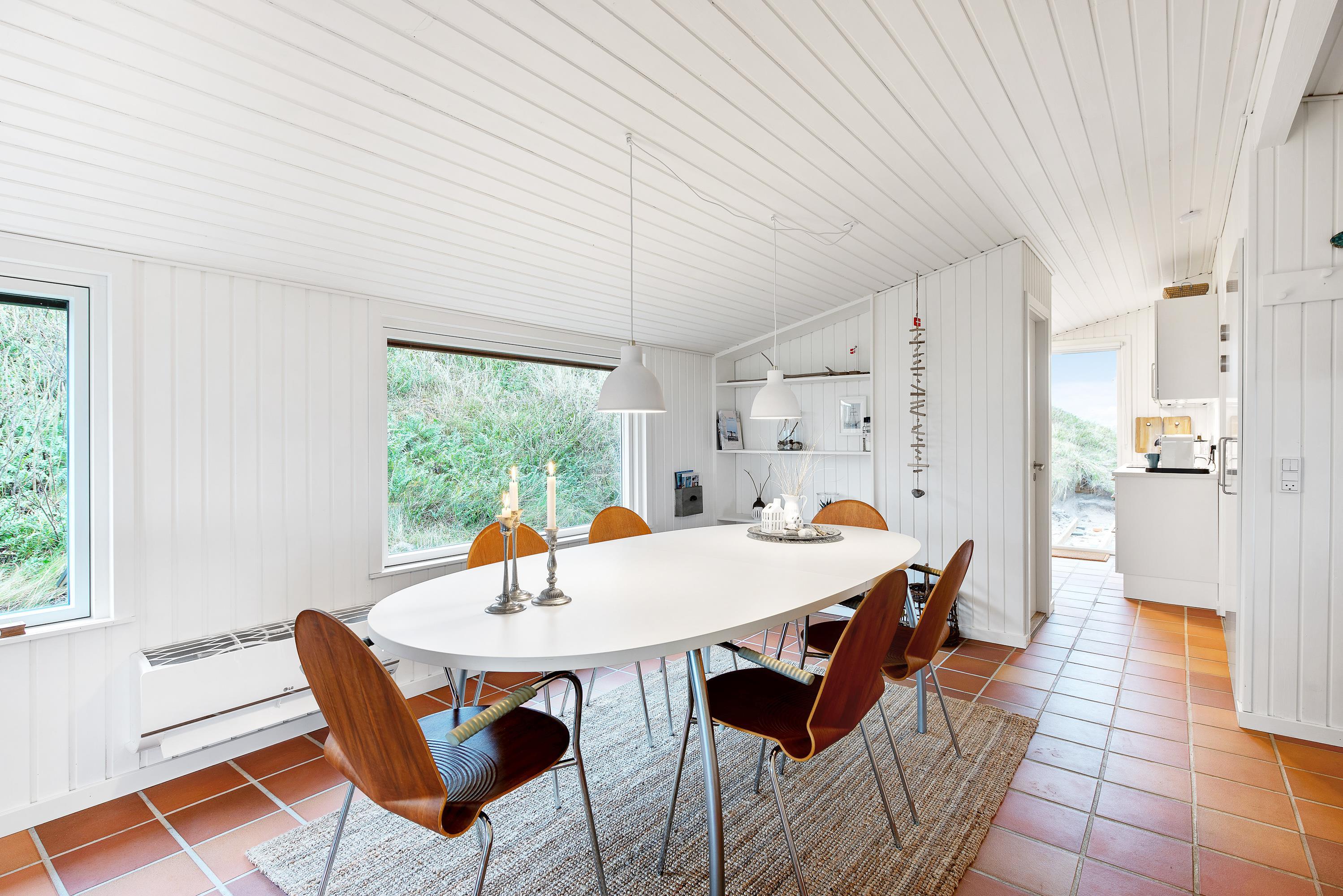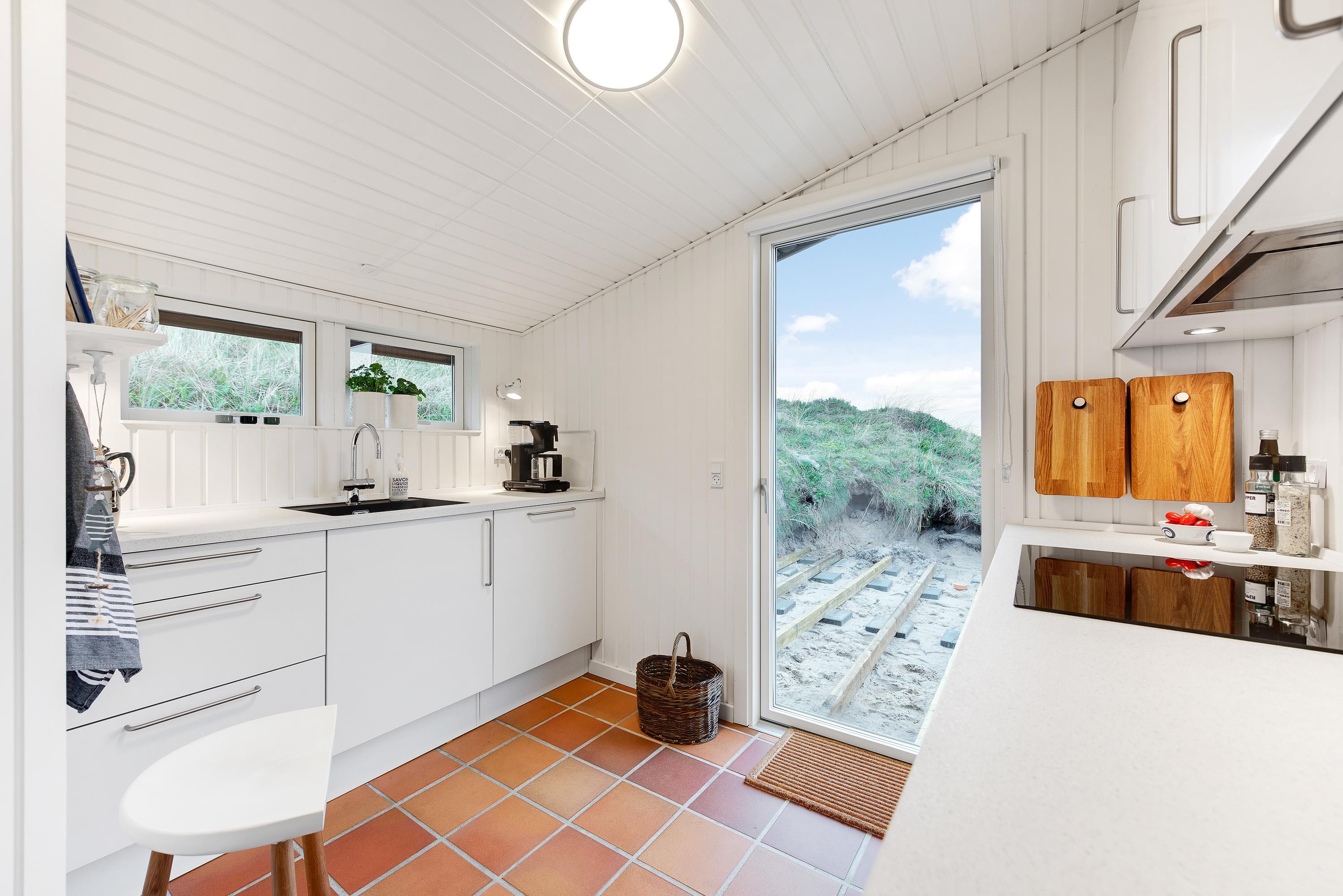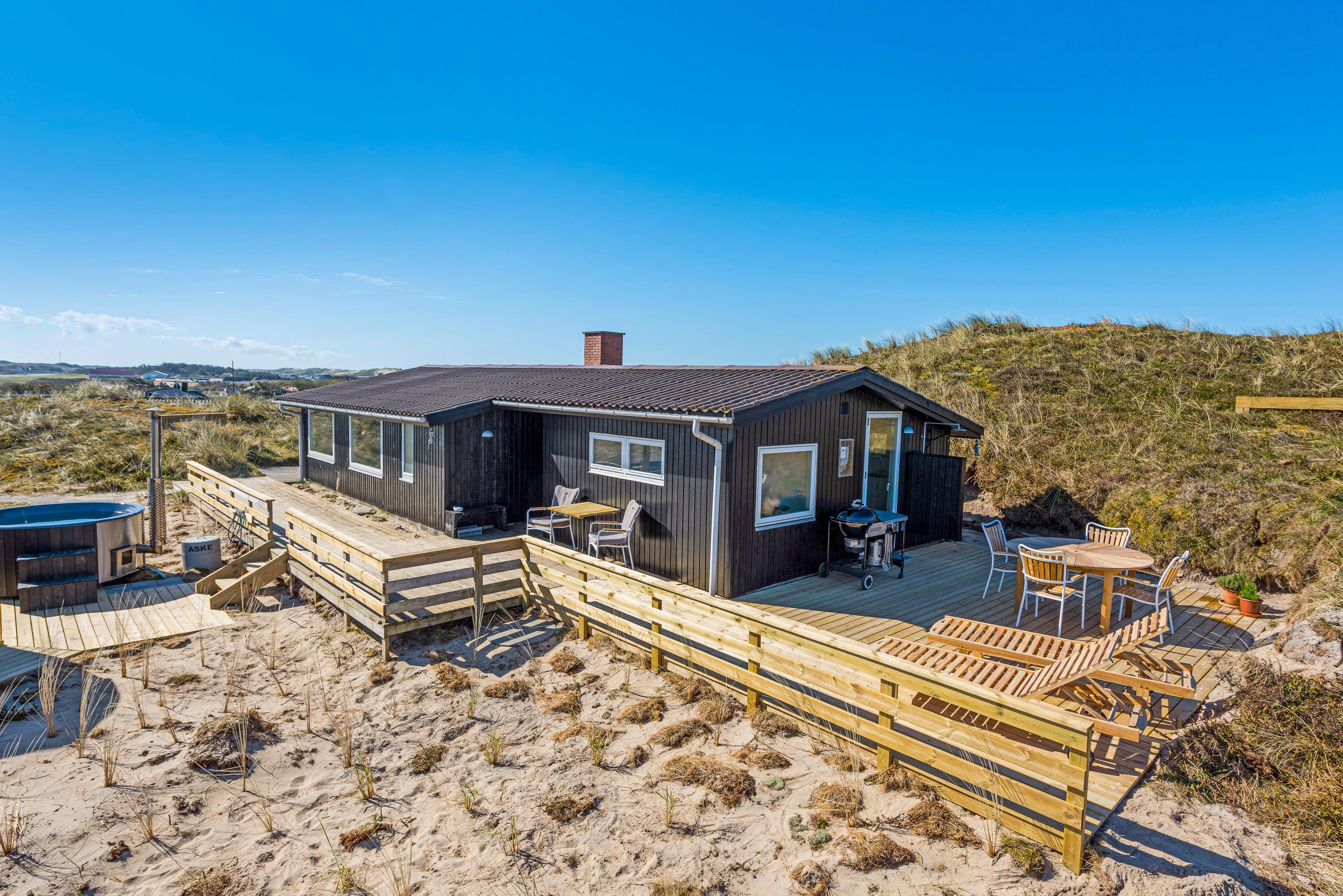 Feriehuset er blevet renoveret i 2020. Med nyt køkken, energivenlige varmepumpe og velvalgte lyse farver samt fine detaljer er det supernemt, at komme i feriestemning. Sommerhusets store panoramavinduer giver et dejligt lys og en skøn udsigt ud over klitlandskabet og den vajende marehalm, som hele tiden skifter farve, når vinden leget med det. På mørke aftenen er de bekvemme lænestole ved brændeovnen den perfekte plads til ugens kriminalroman.