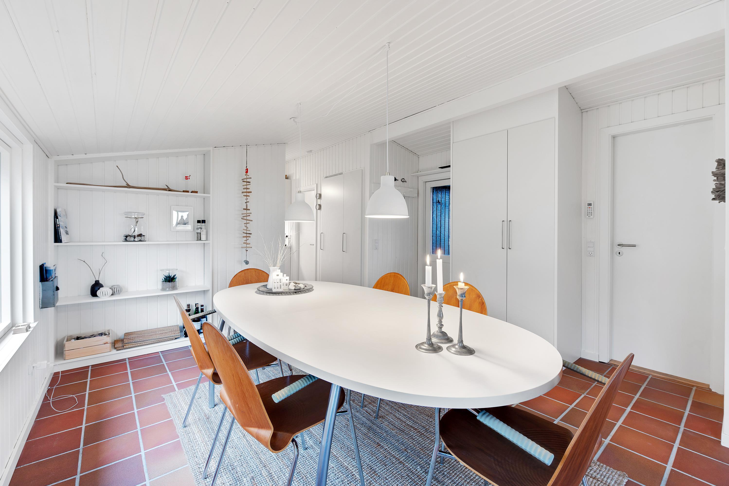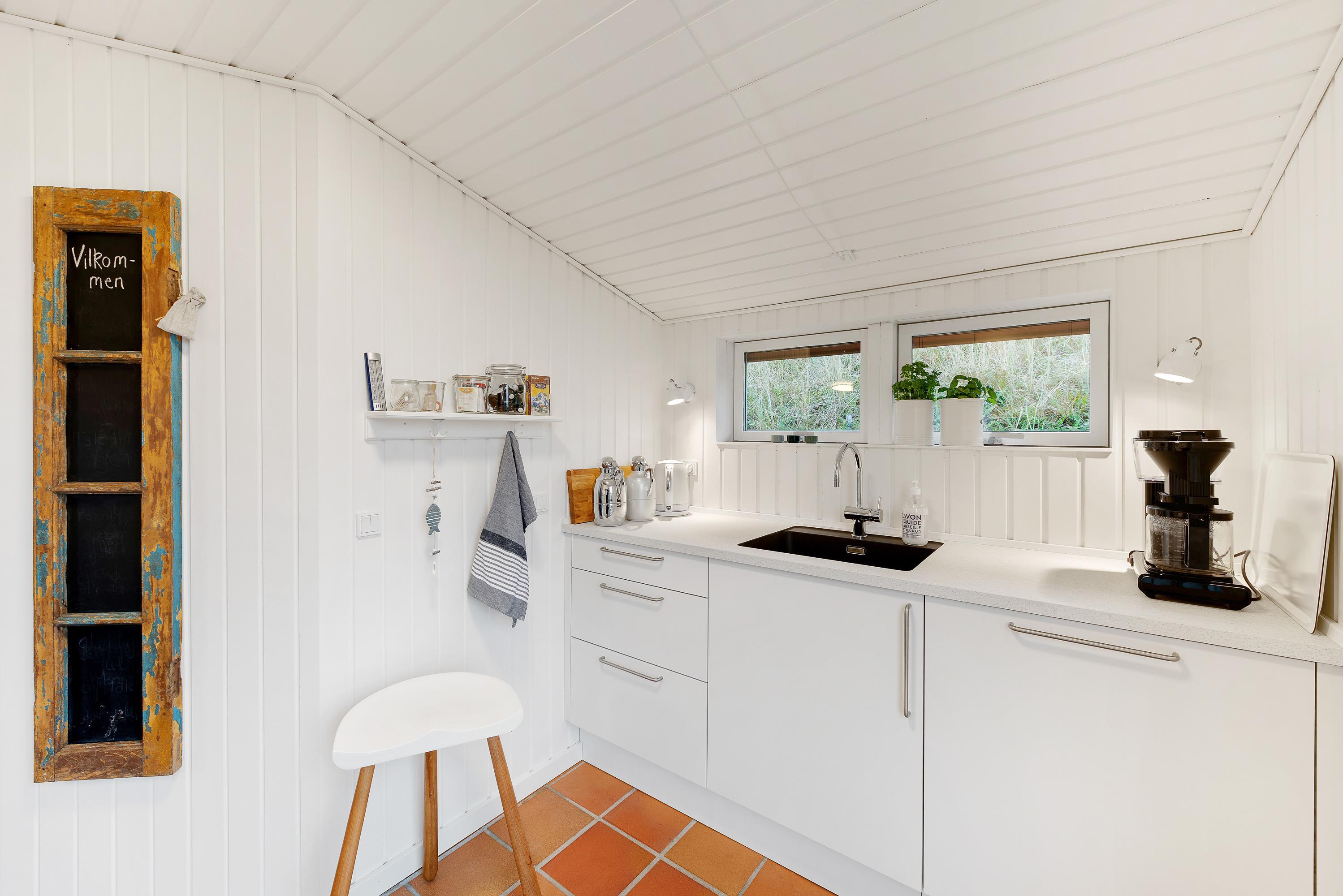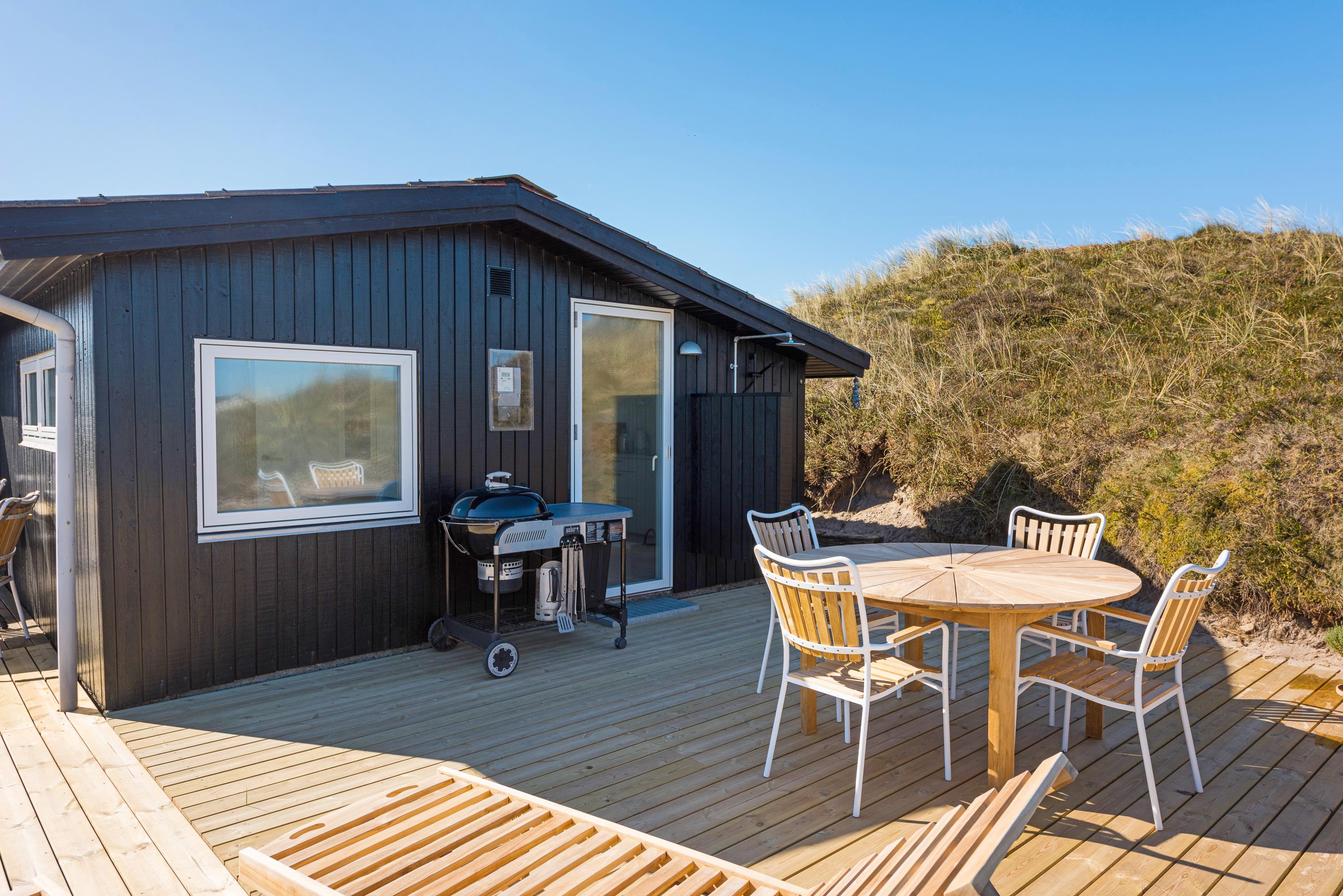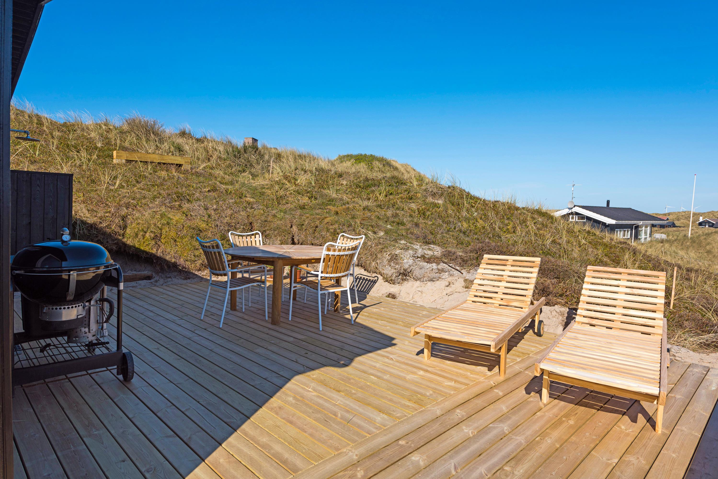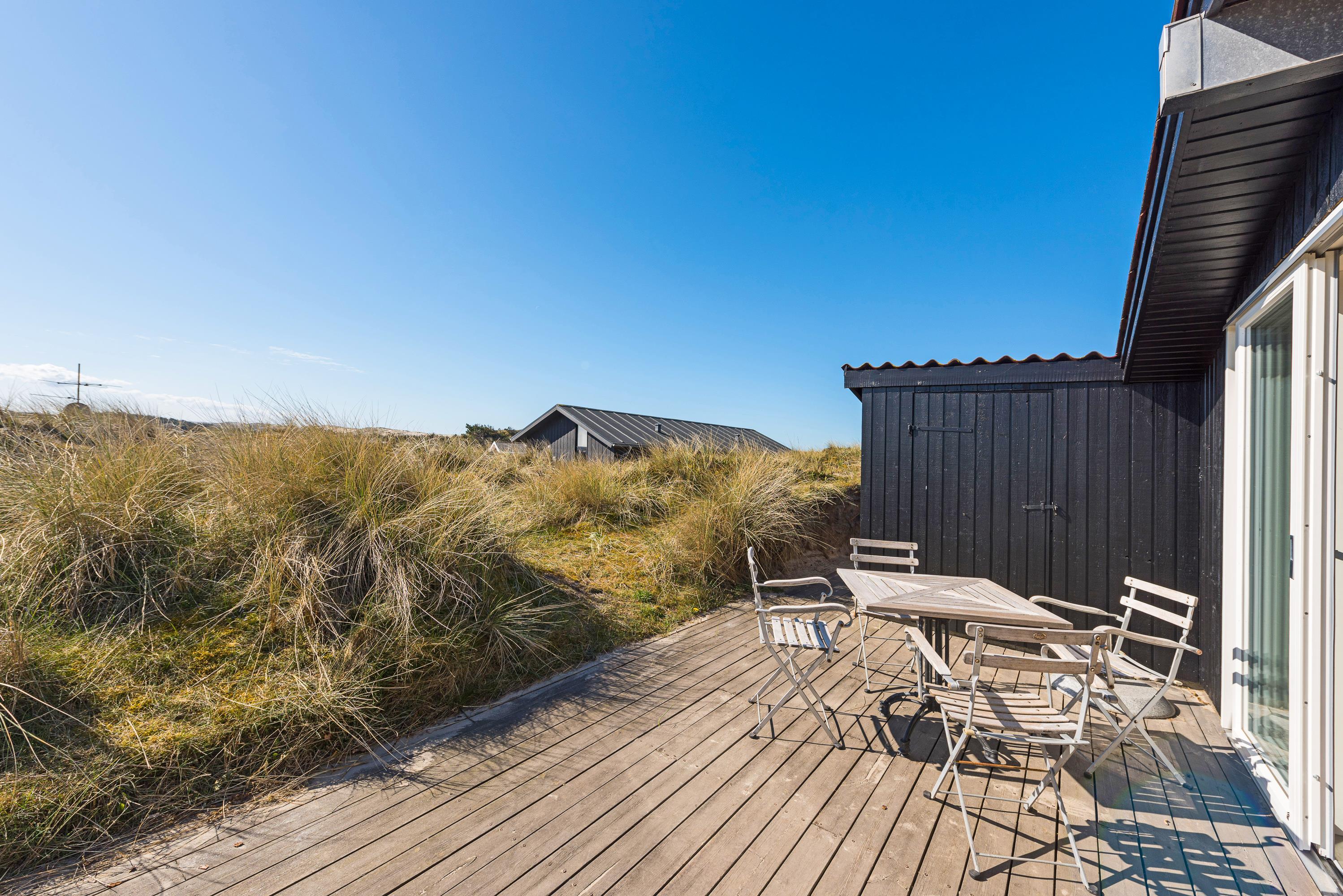 Feriehuset er blevet renoveret i 2020. Med nyt køkken, energivenlige varmepumpe og velvalgte lyse farver samt fine detaljer er det supernemt, at komme i feriestemning. Sommerhusets store panoramavinduer giver et dejligt lys og en skøn udsigt ud over klitlandskabet og den vajende marehalm, som hele tiden skifter farve, når vinden leget med det. På mørke aftenen er de bekvemme lænestole ved brændeovnen den perfekte plads til ugens kriminalroman.