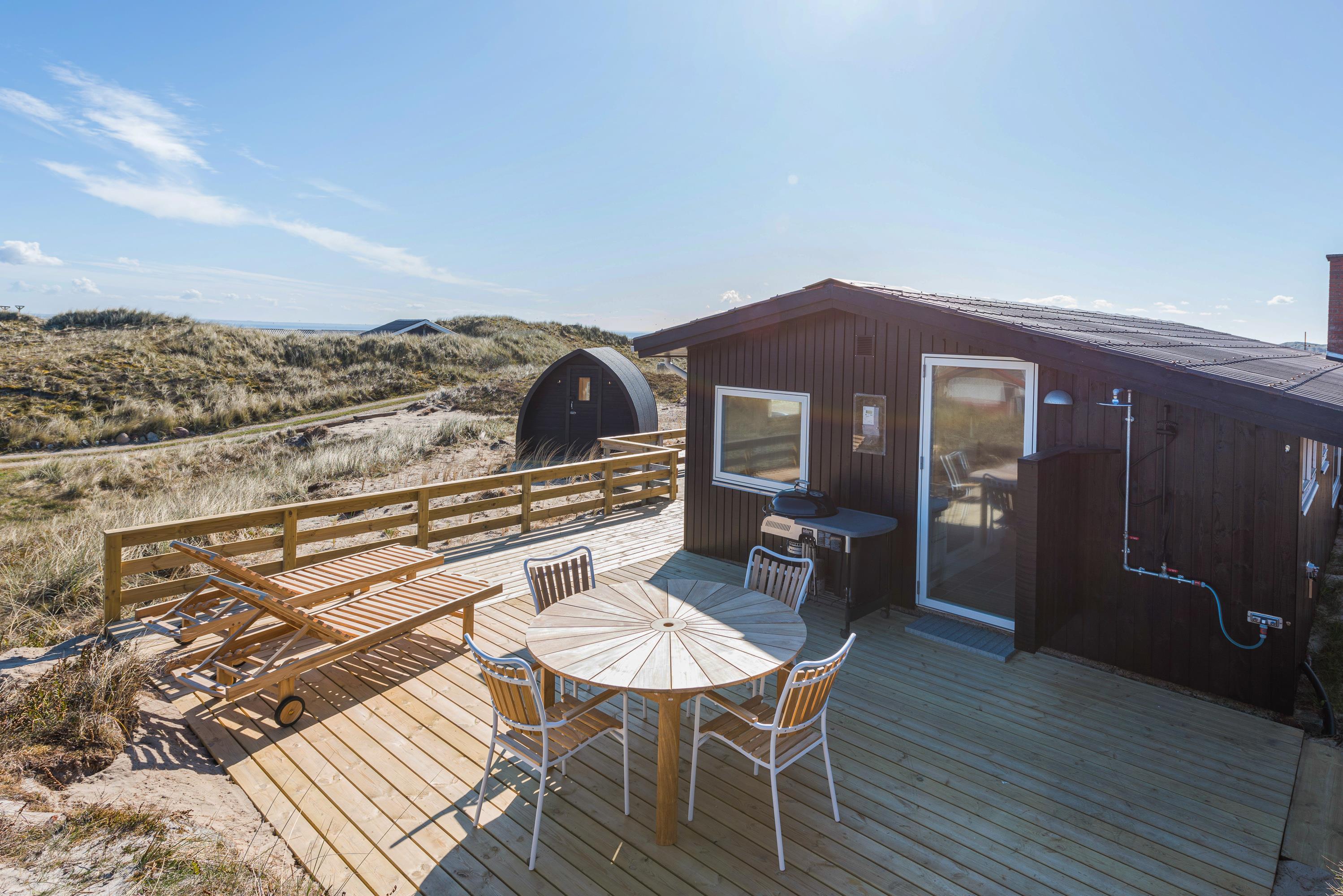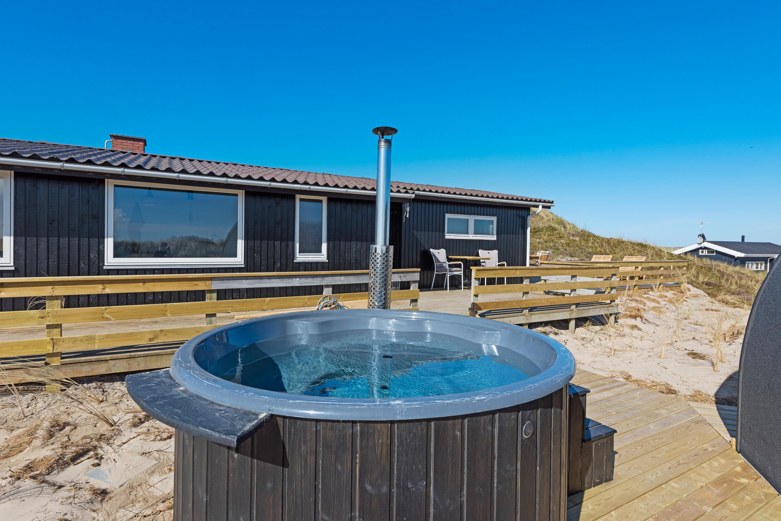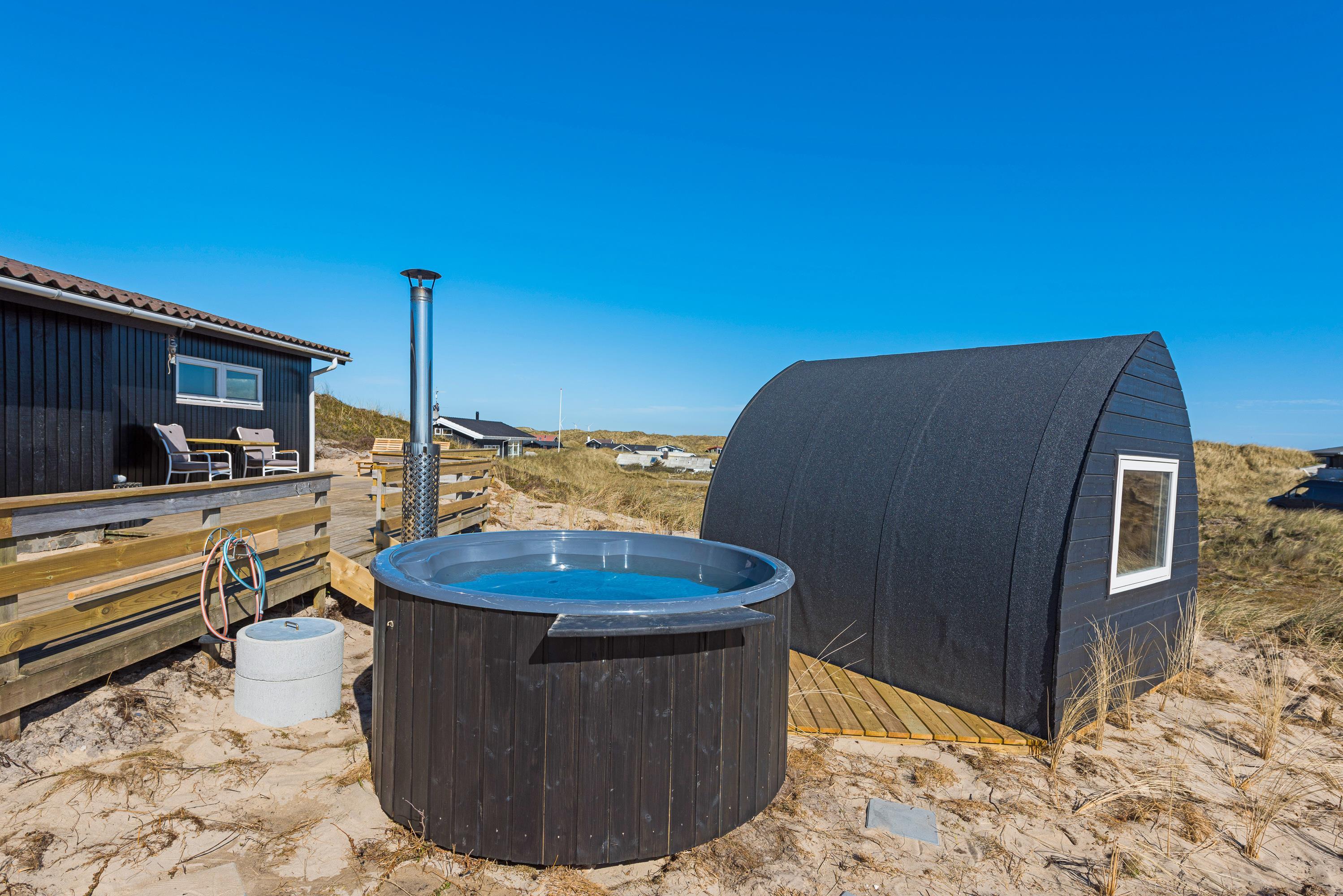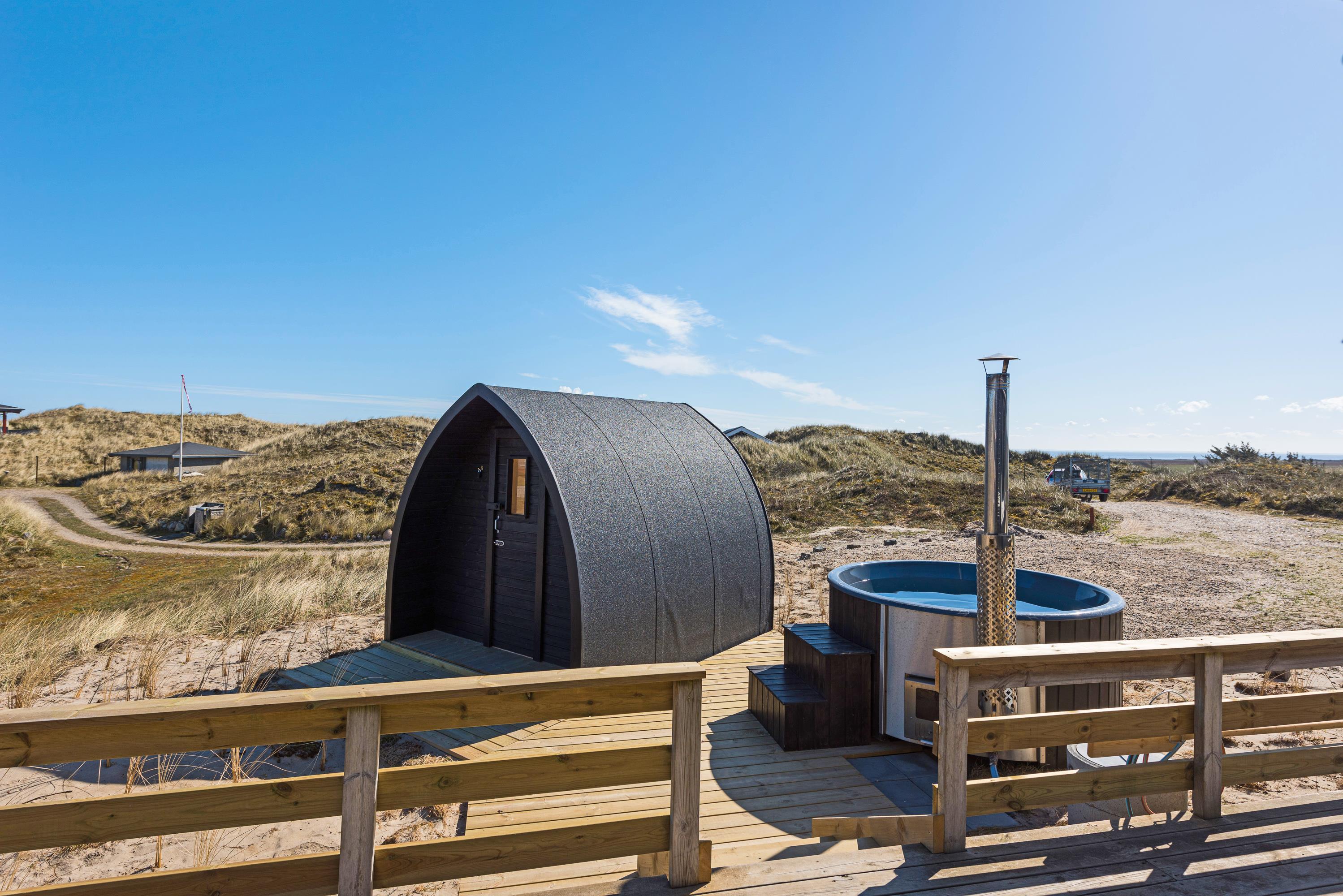 Lige meget vejret – det er altid en hyggelig og sjov oplevelse at tænde op under vildmarksbadet eller den udendørs sauna. Er du superfrisk, så kan du først smutte de 300 meter ned for at dyppe dig i Vesterhavet og efterfølgende nyde badekarrets varme vand eller sætte dig i saunaen og nyde både varmen og stilheden. Det er ren luksus og balsam for sjælen.