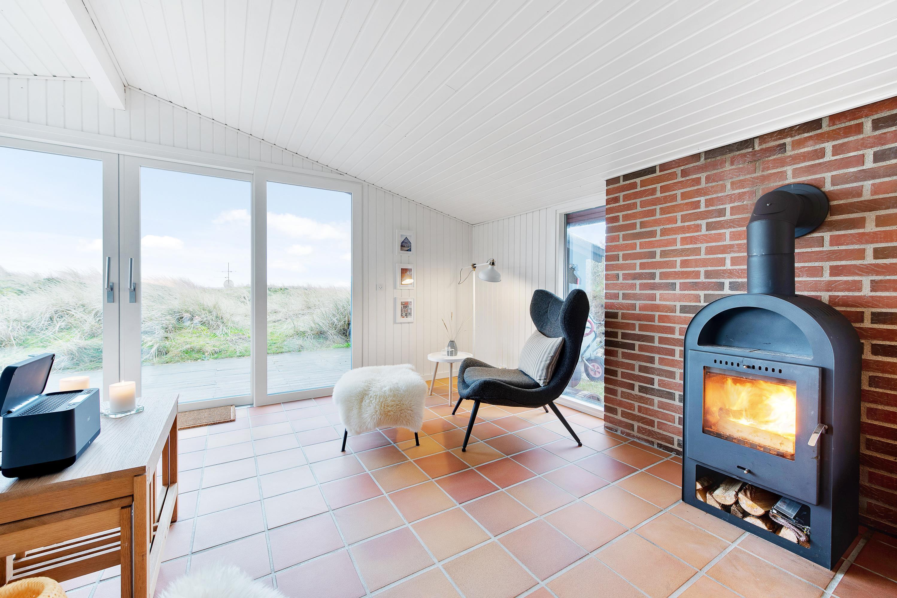 Feriehusstemning med udsigt og hyggeskabende brændeovn