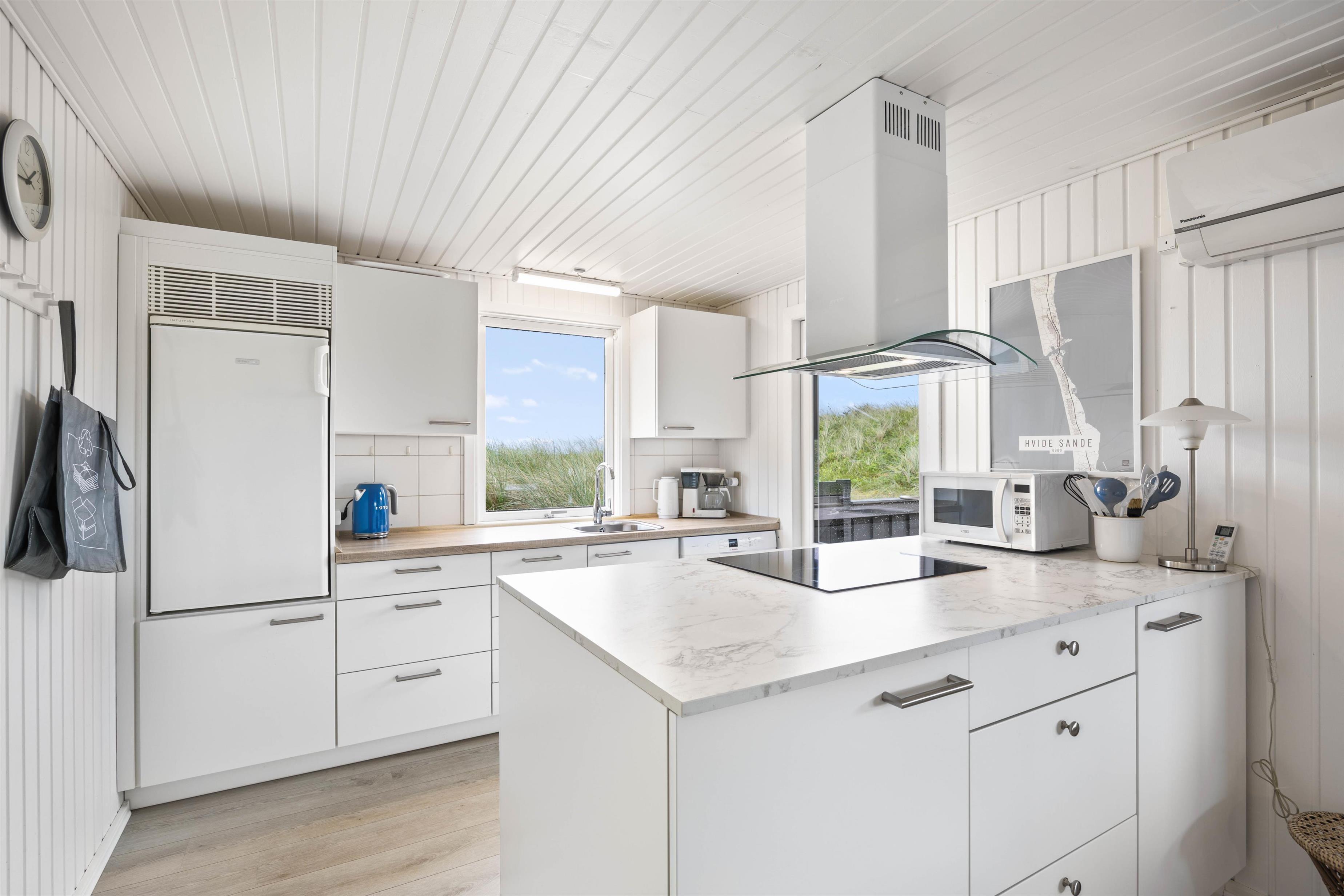 Du kan føle dig hjemme i dette lyse og venlige sommerhus på Granvej 17 i Årgab. En lille entré fører direkte ind i den åbne opholdsstue med spiseplads og åbent køkken. På den komfortable sofa kan I slappe af med fælles filmaften og nyde varmen fra brændeovnen, eller I kan arrangere en fælles madlavningsaften. I det renoverede køkken finder du blandt andet opvaskemaskine, mikroovn og køleskab med fryser, hvor I sammen kan lave dagens måltider.