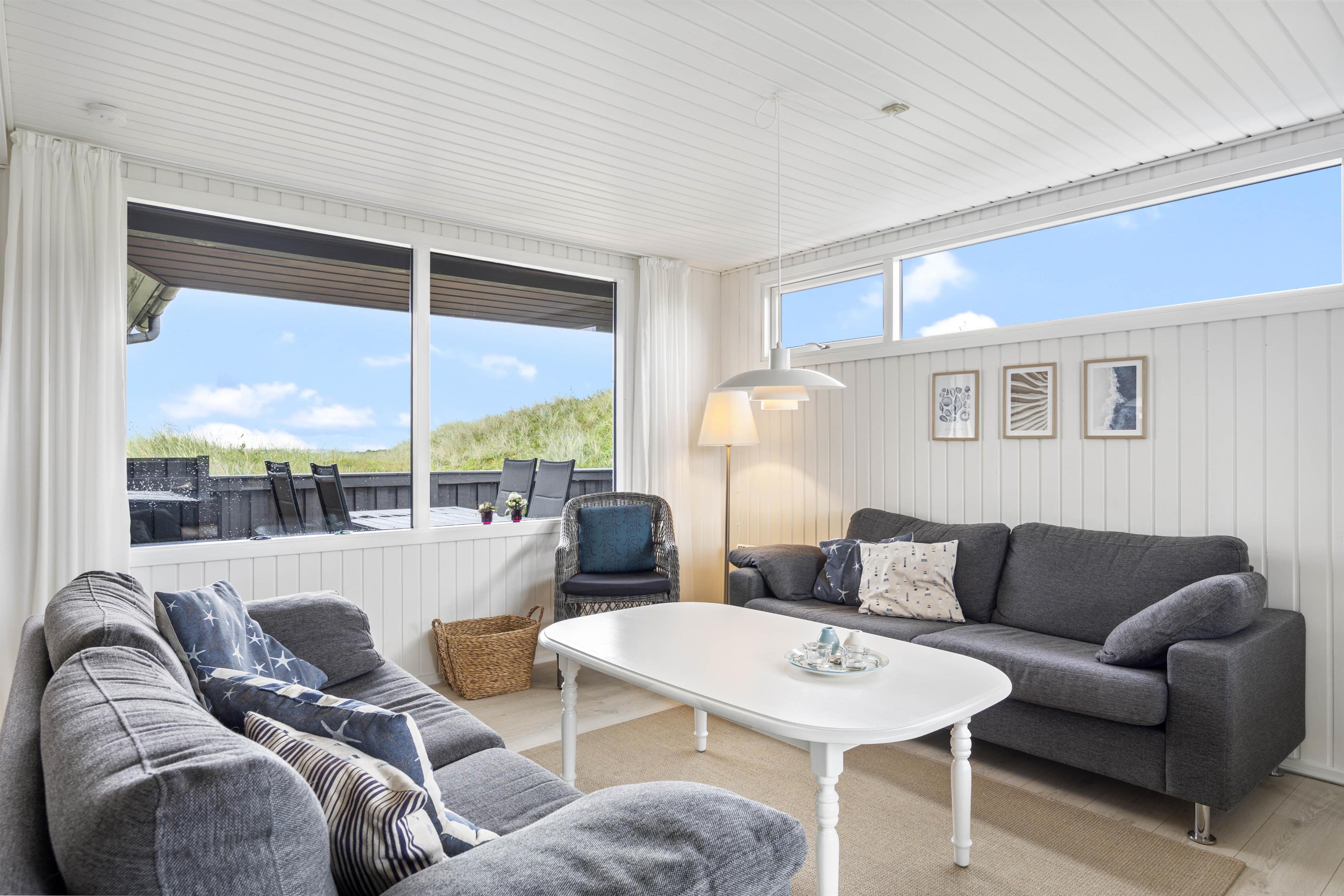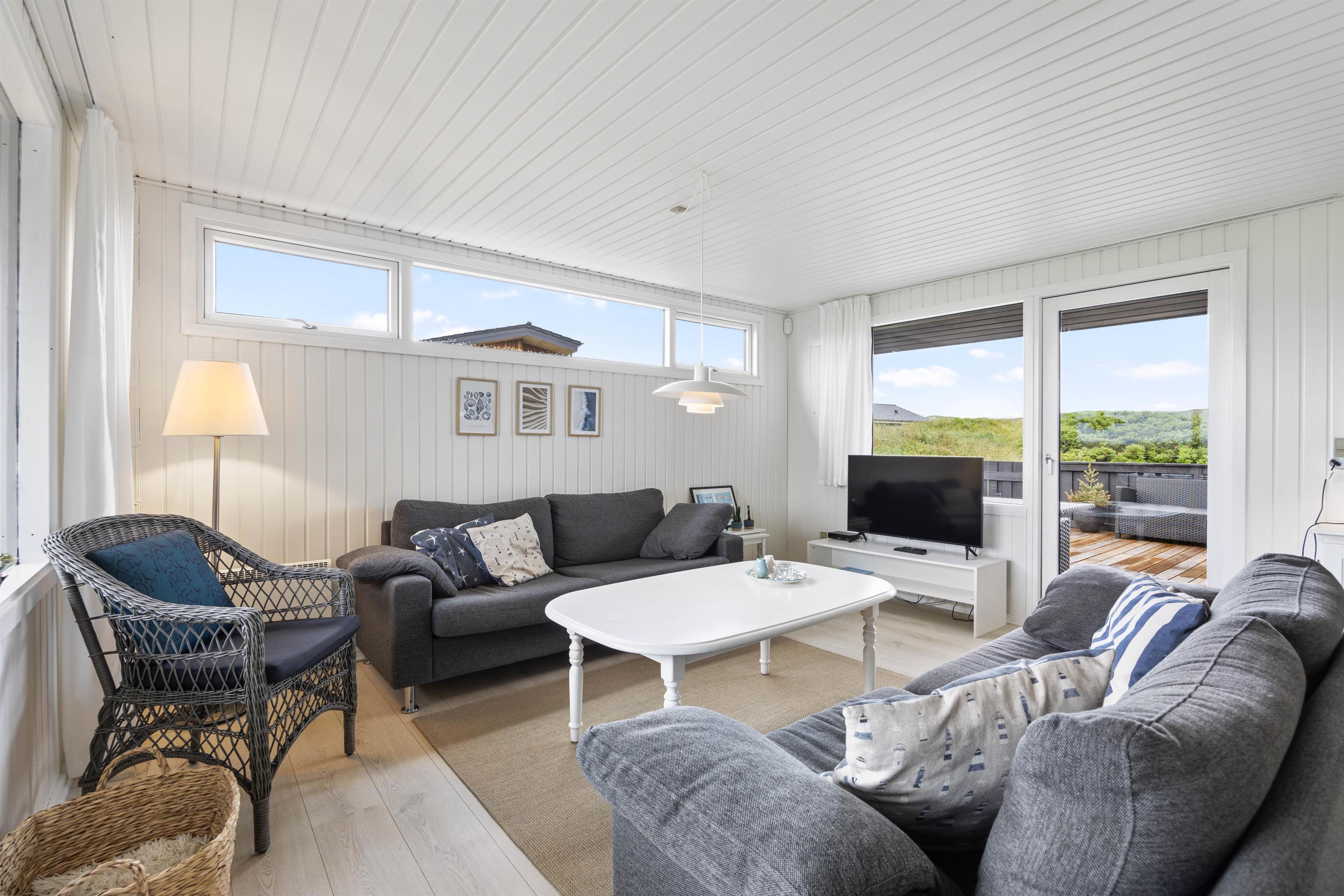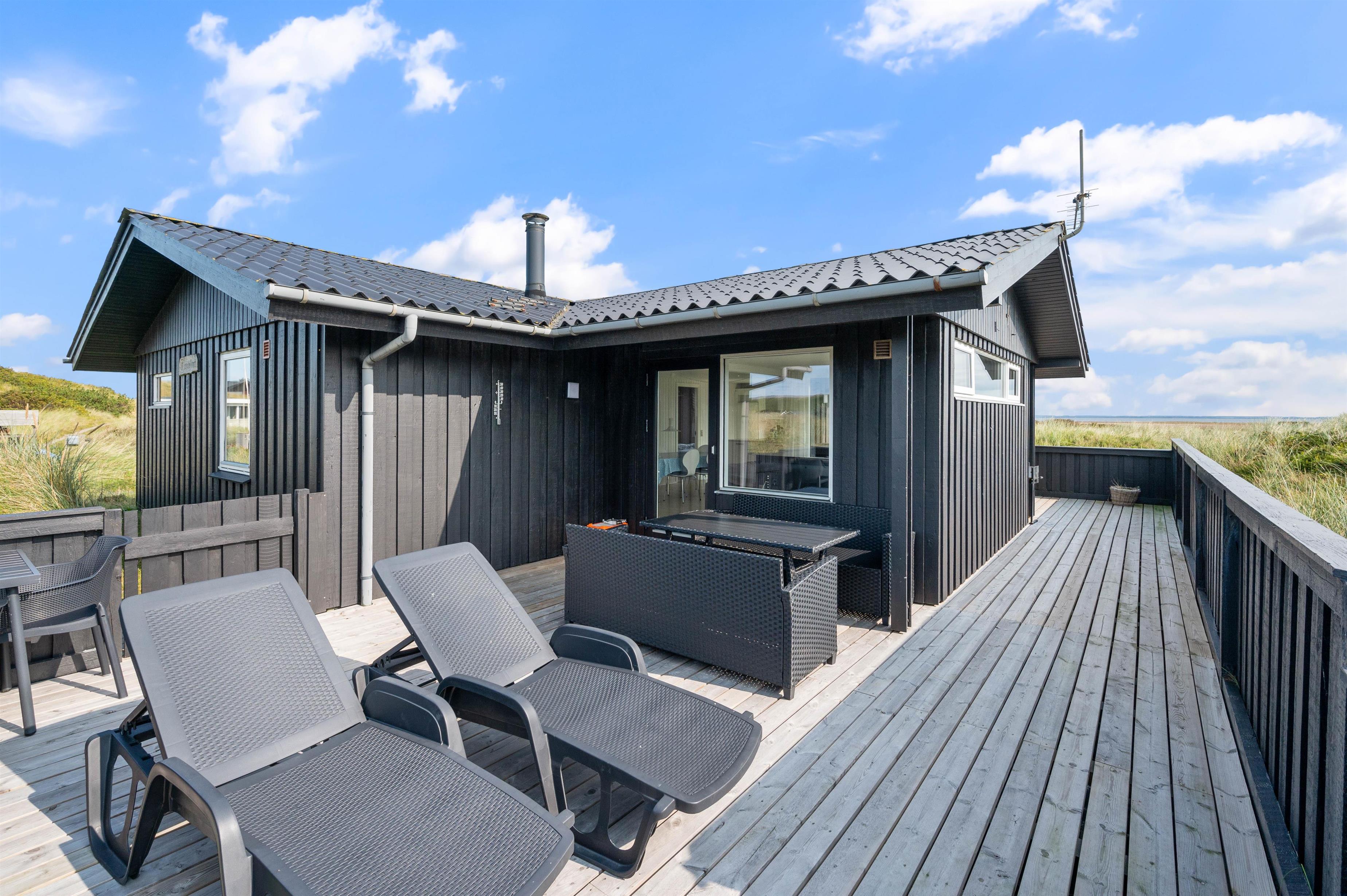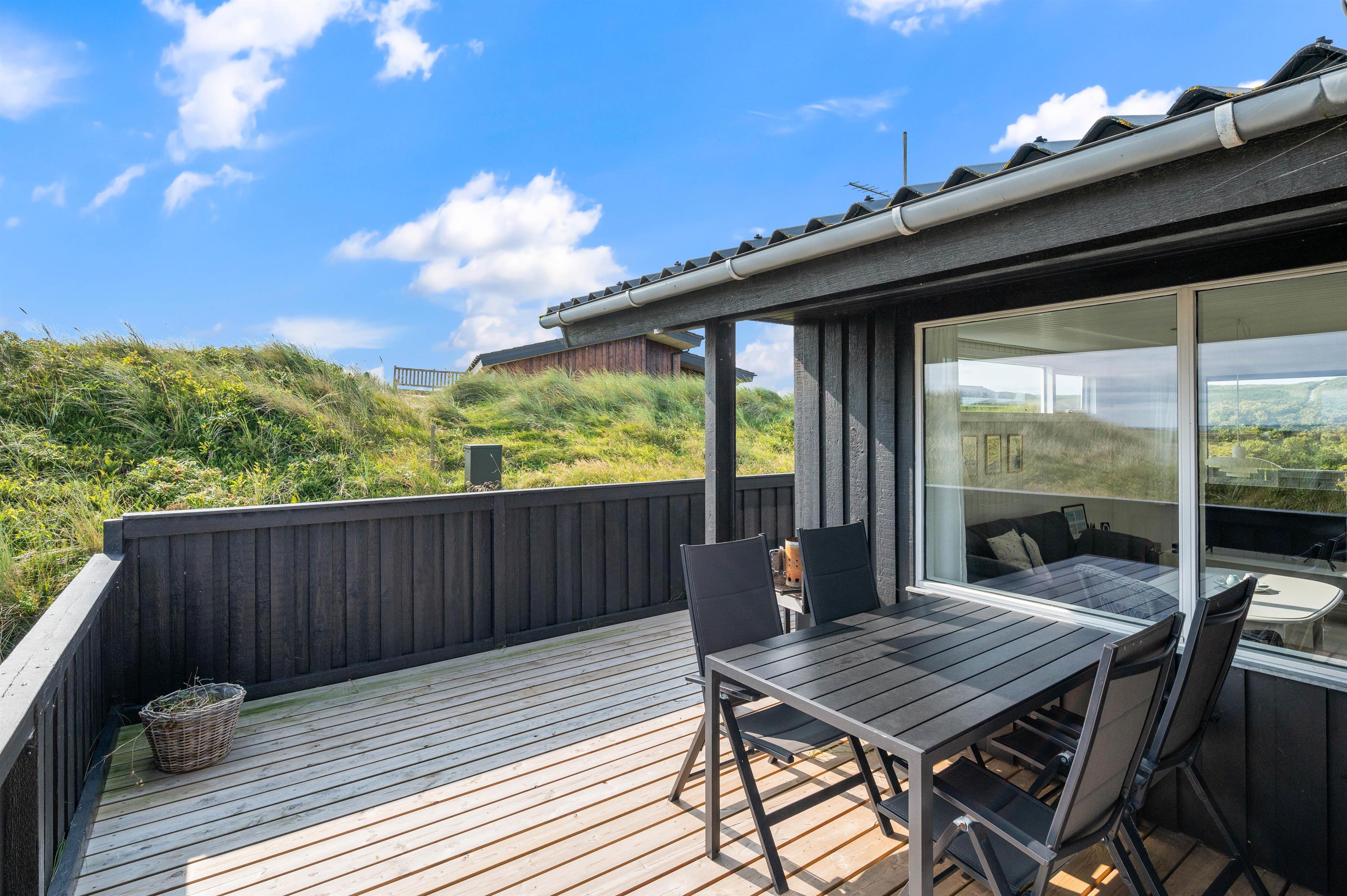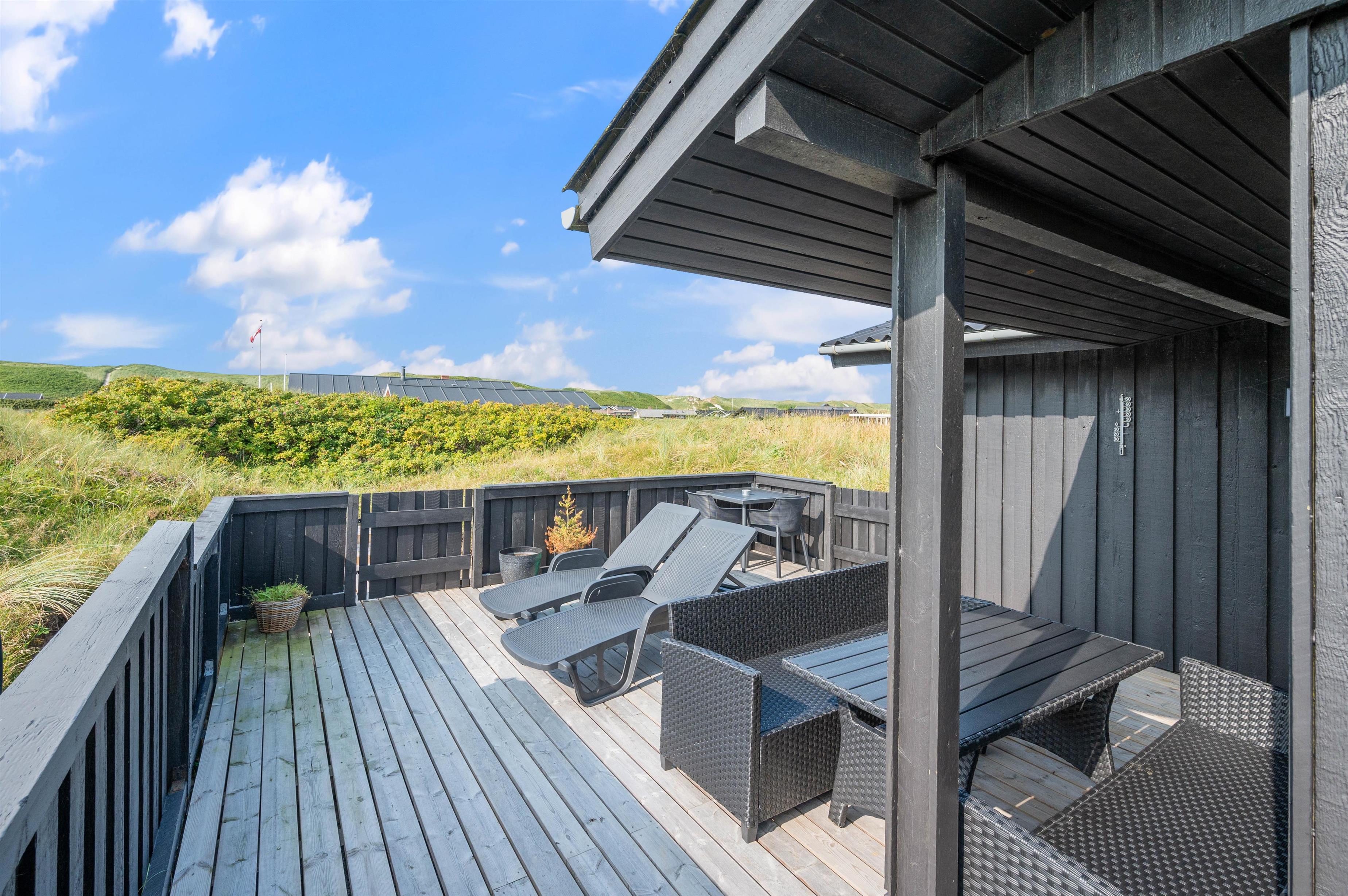 Fra den hyggelige stue er der udgang til en rummelig, lukket terrasse. Dette er især nyttigt for familier med små børn eller hundeejere. På grund af terrassens delvise overdækning kan du altid finde et lunt sted, hvor du kan slappe af i havemøblerne. Nyd udsigten over den smukke naturgrund med Ringkøbing Fjord i baggrunden.