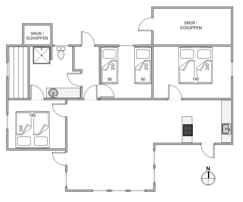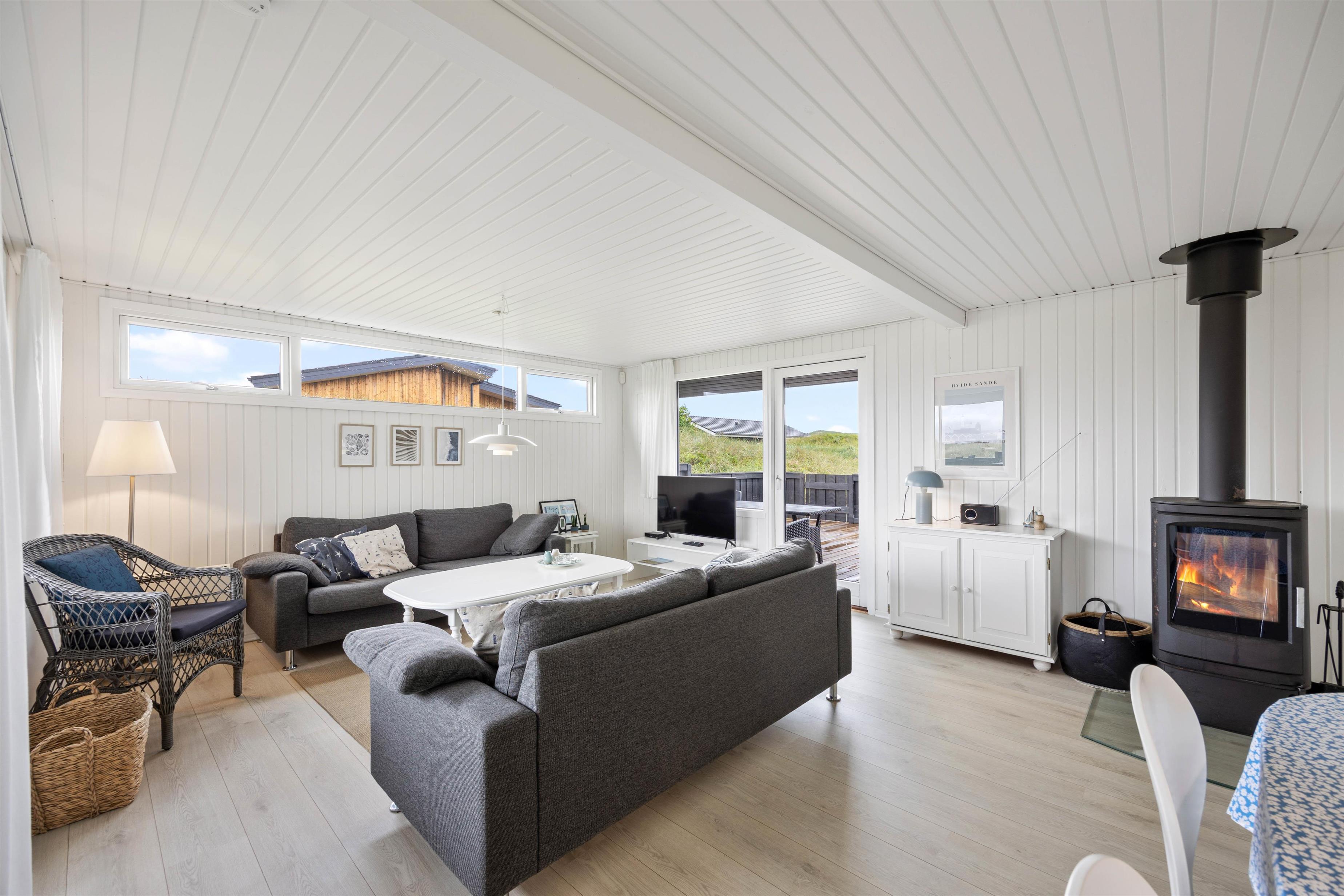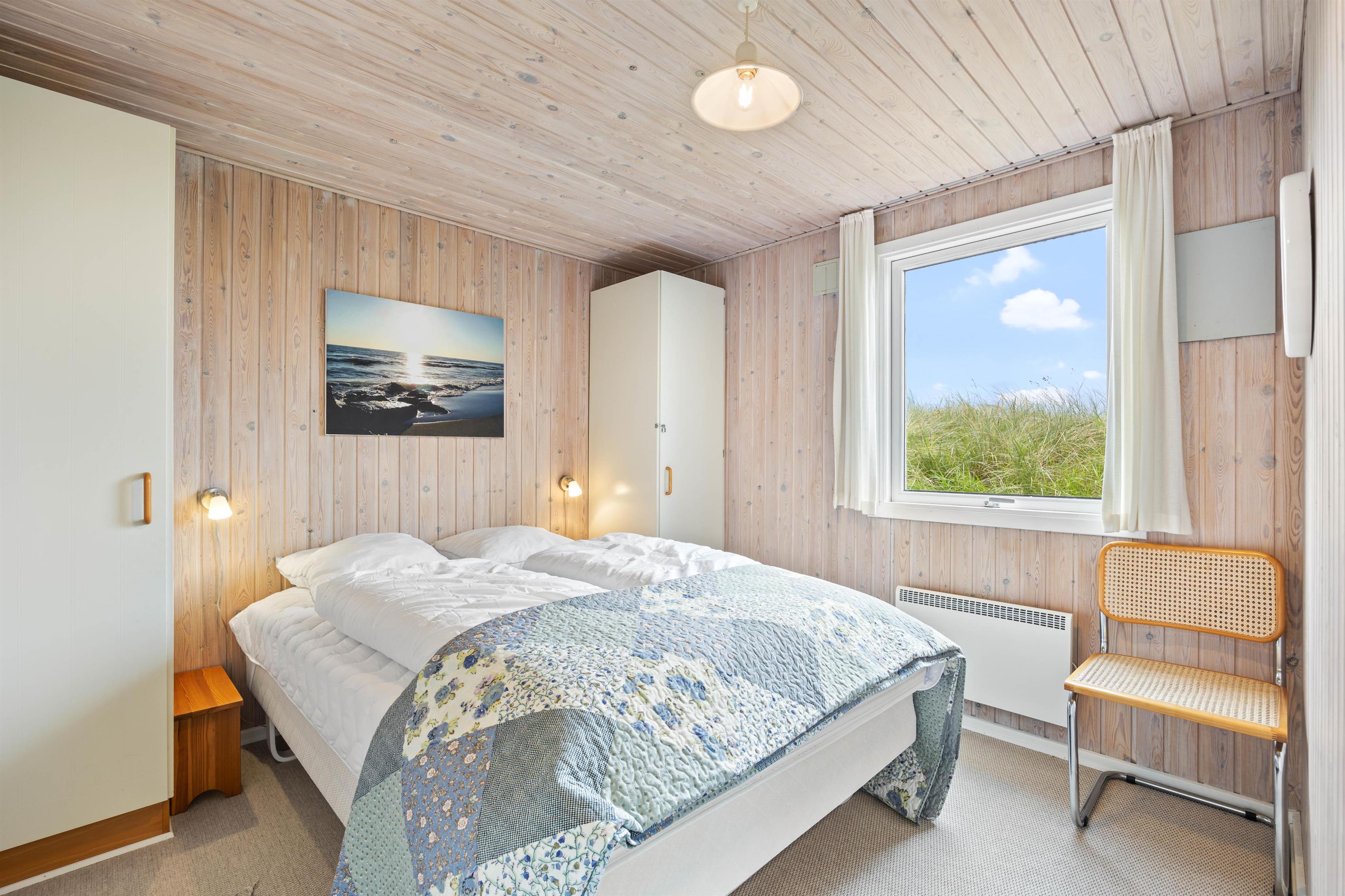 Det velholdte badeværelse er tilgængeligt fra et af soveværelserne samt fra entréen. I saunaen kan du blive gennemvarm efter en lang gåtur ved Vesterhavet. Der er 2 komfortable soveværelser med dobbeltsenge og et soveværelse med 2 enkeltsenge i sommerhuset. Her kan du hvile ud i den friske vesterhavsluft.