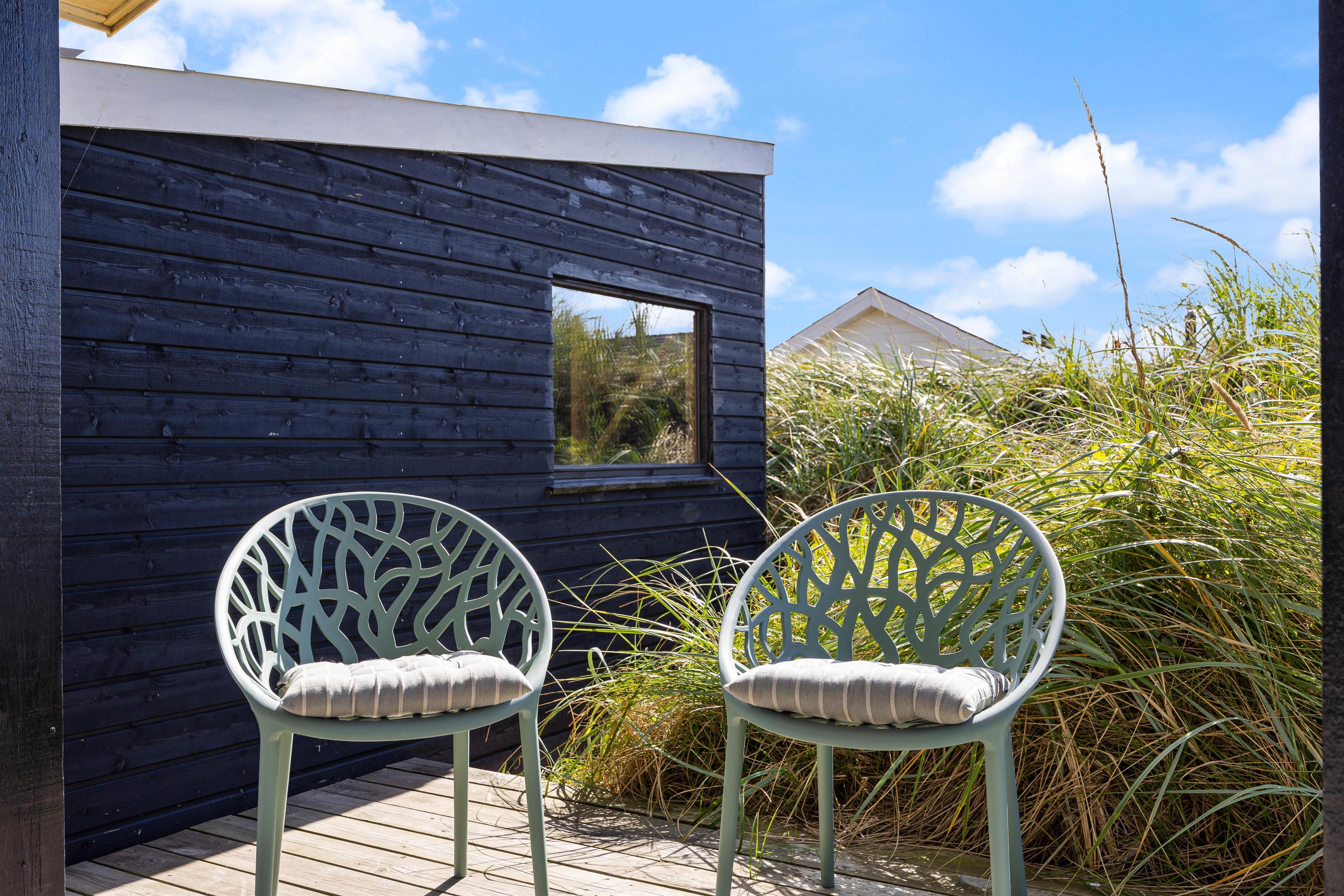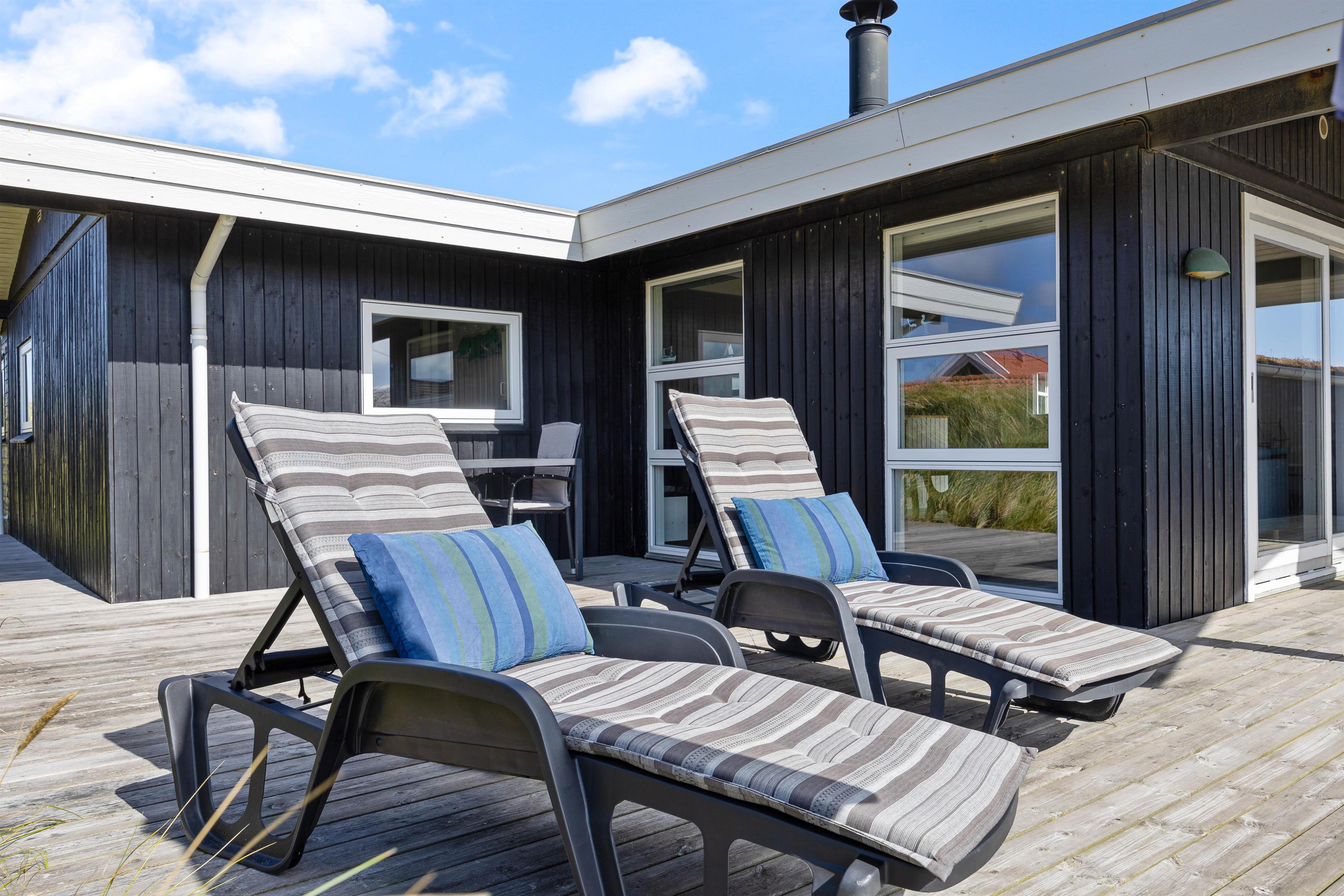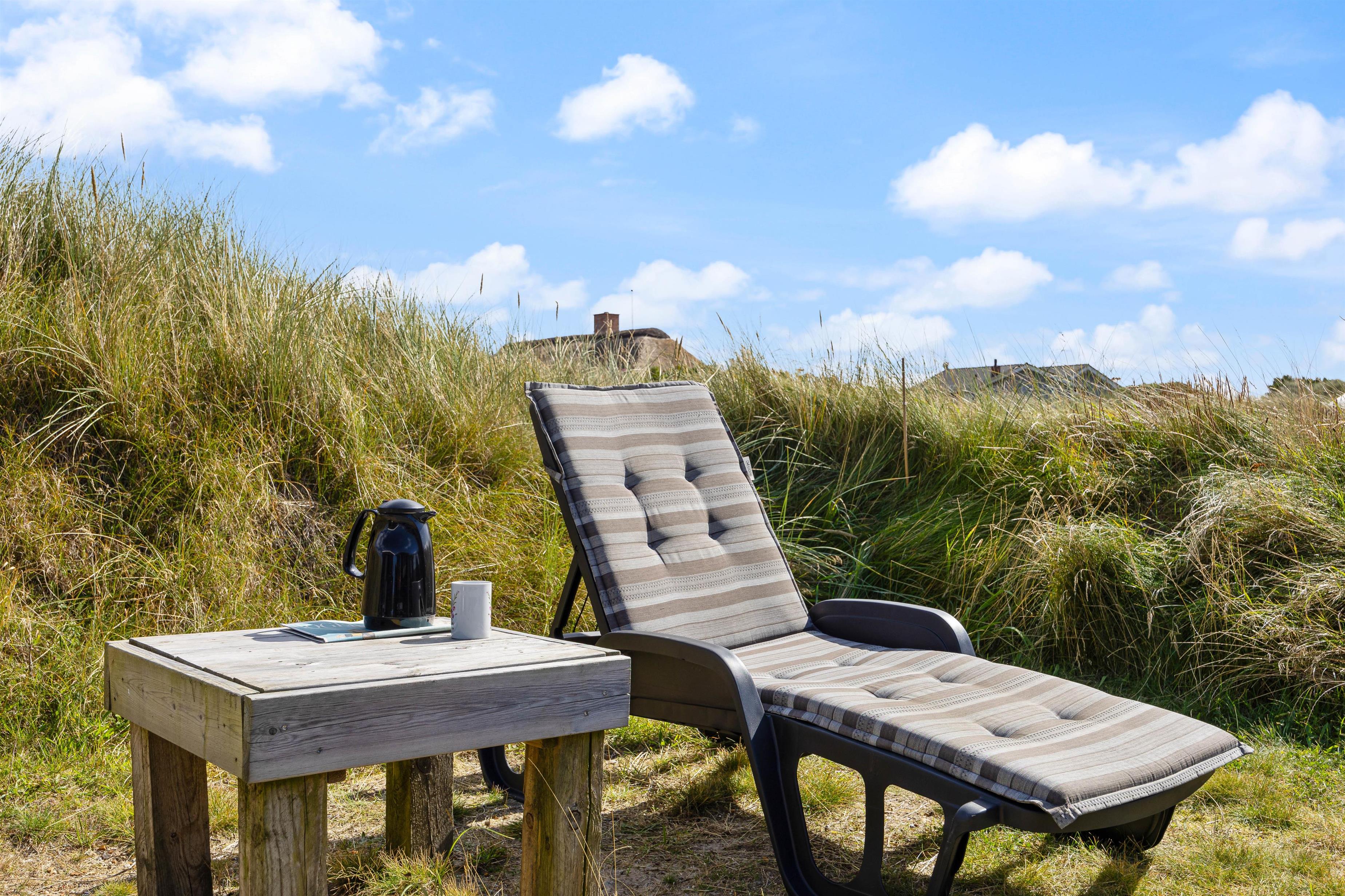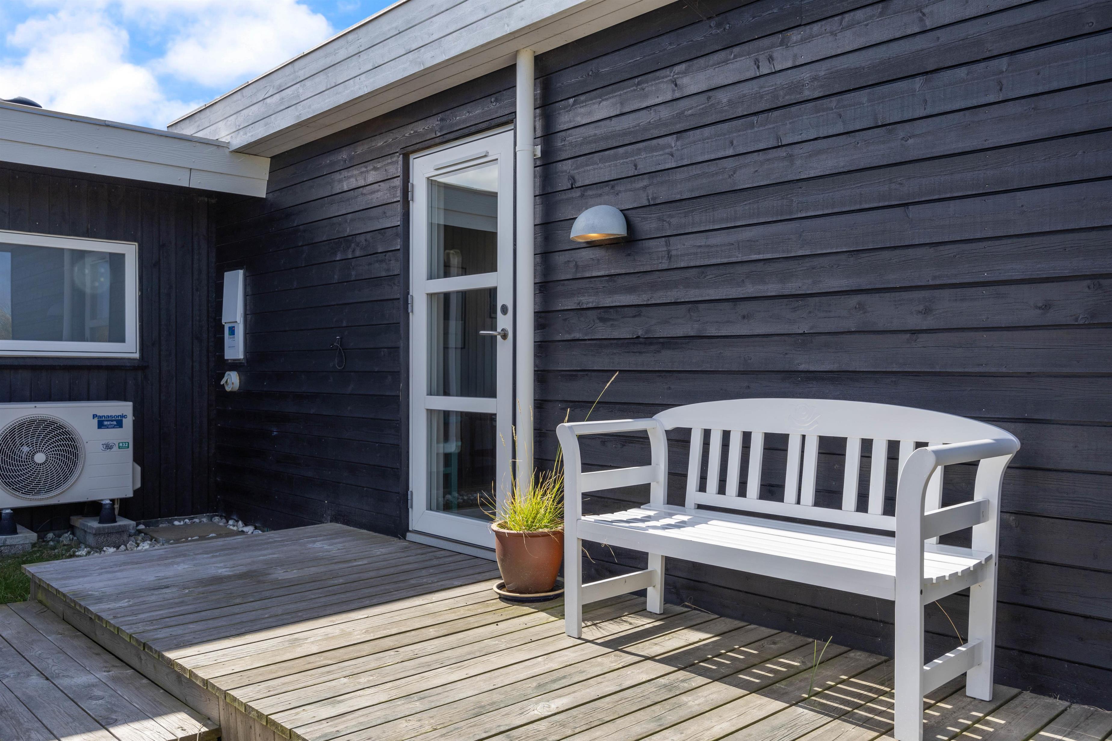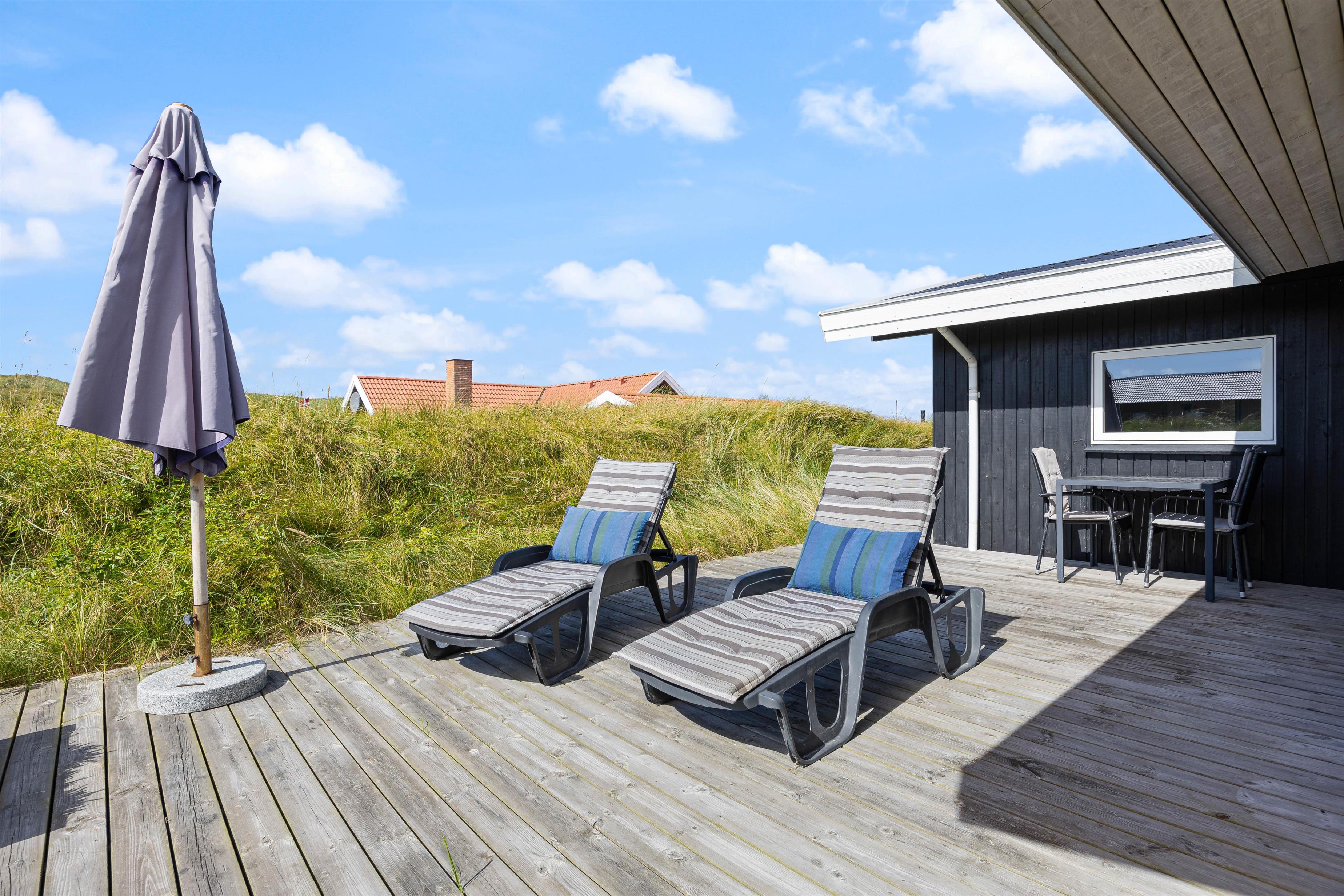 Udenfor finder I flere skønne kroge, hvor I kan slappe af og nyde ferien. På den store terrasse har I flere muligheder for at sidde i læ og nyde en dejlig varm kop kaffe. Det er også muligt at sidde ude under sommerhusets parasol og nyde en appetitlig aftensmad lavet på sommerhusets grill. Rundt om sommerhuset finder I også 2 delviste overdækket terrasser, hvor I kan sidde I læ for vinden.